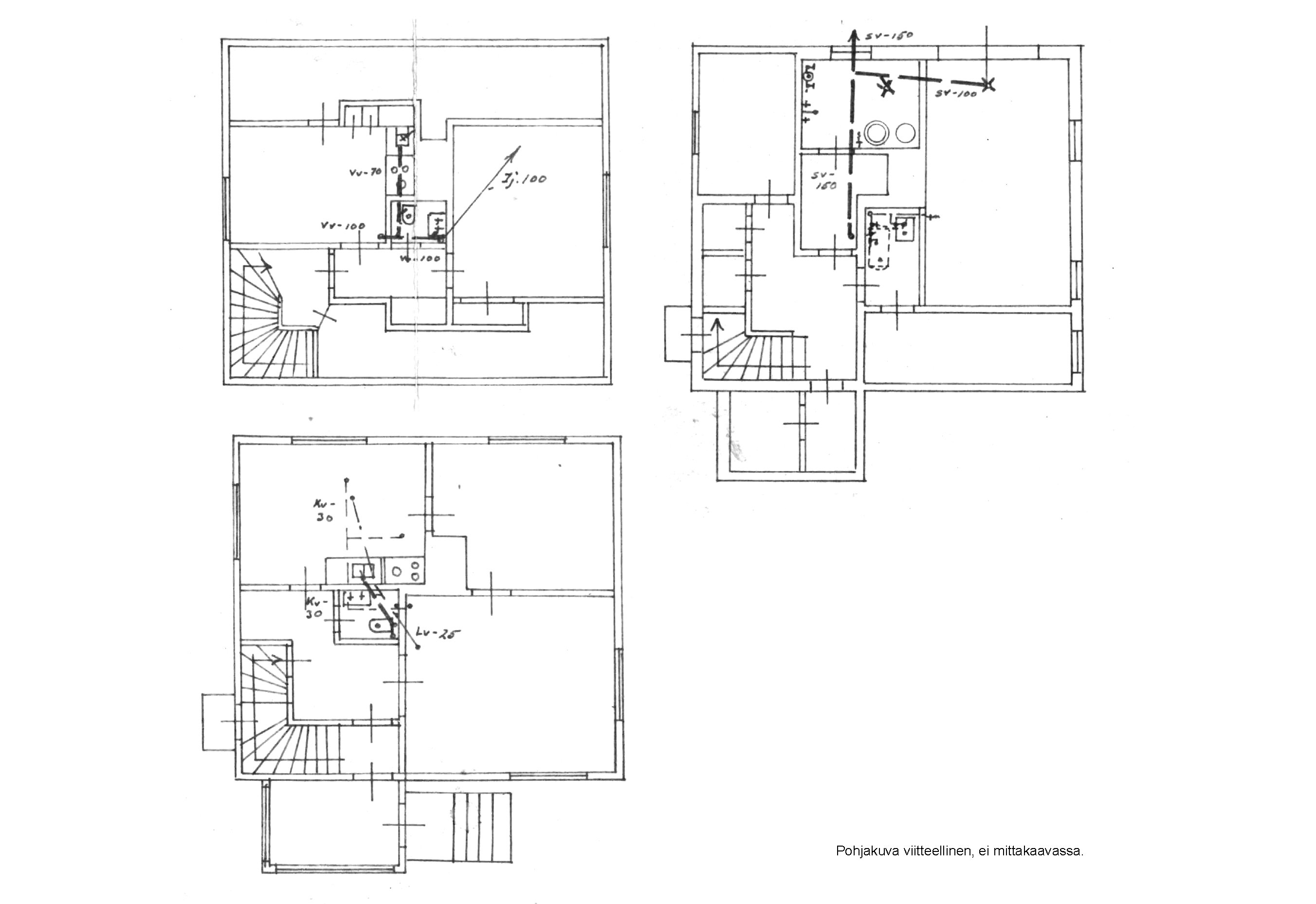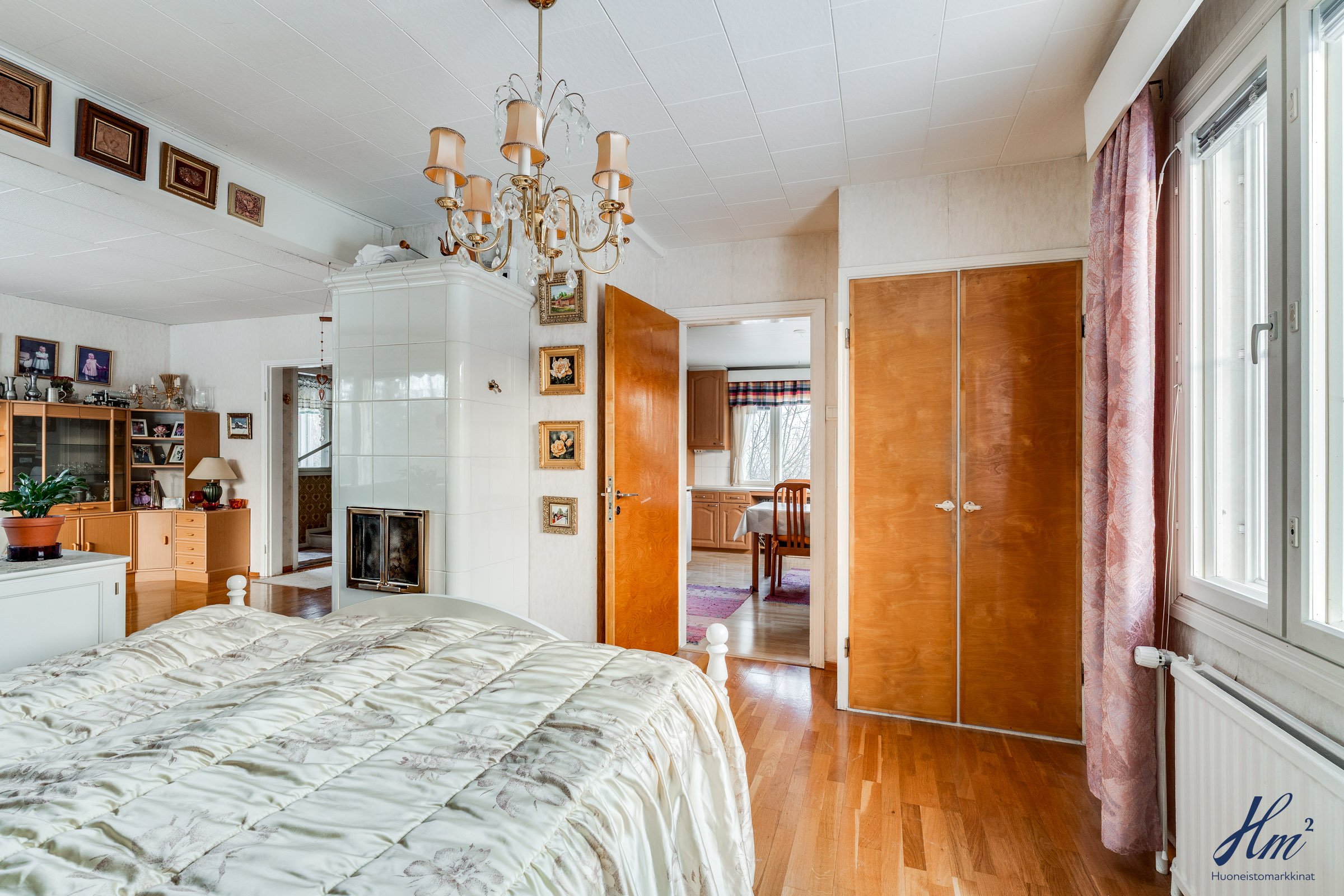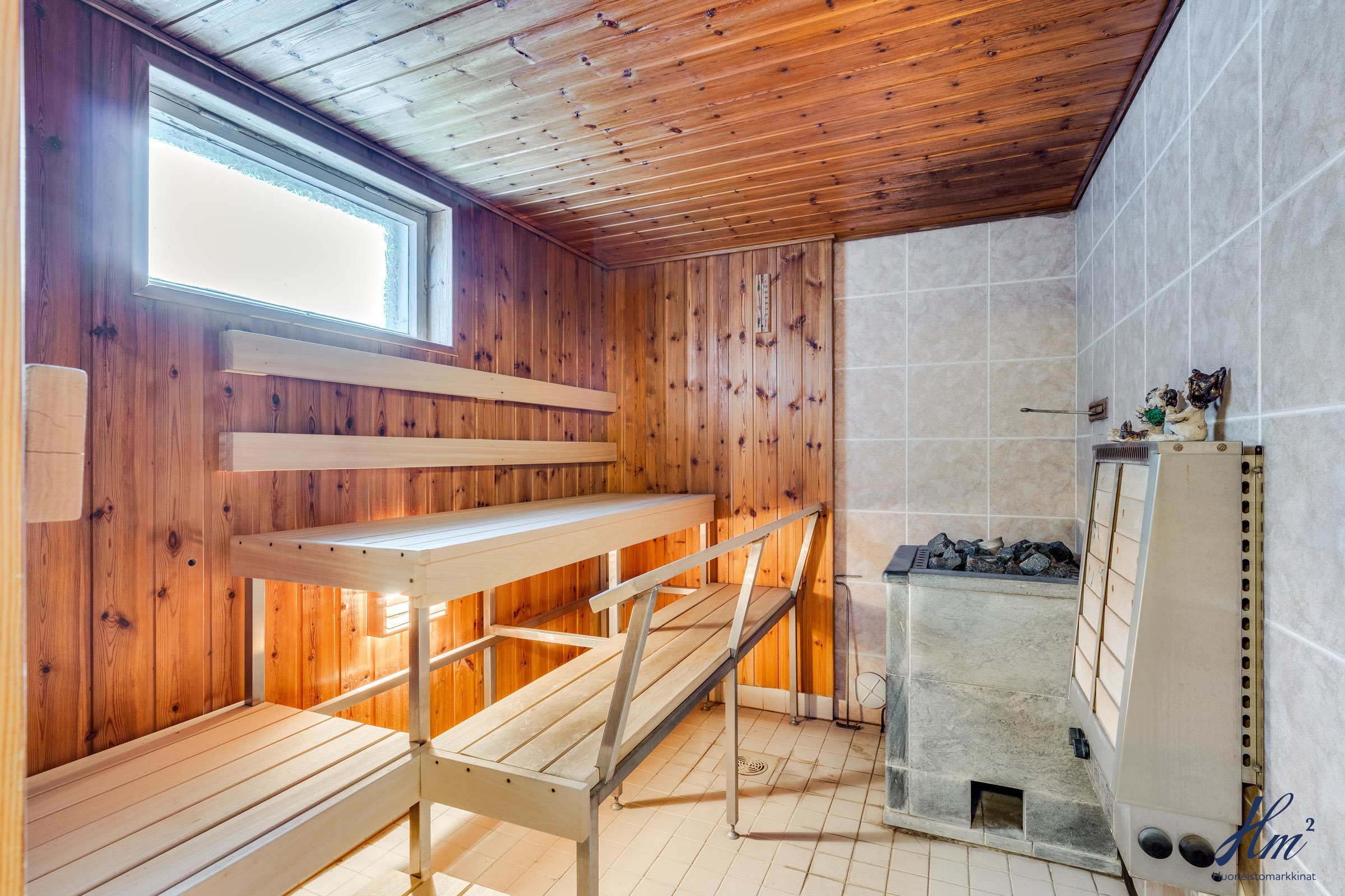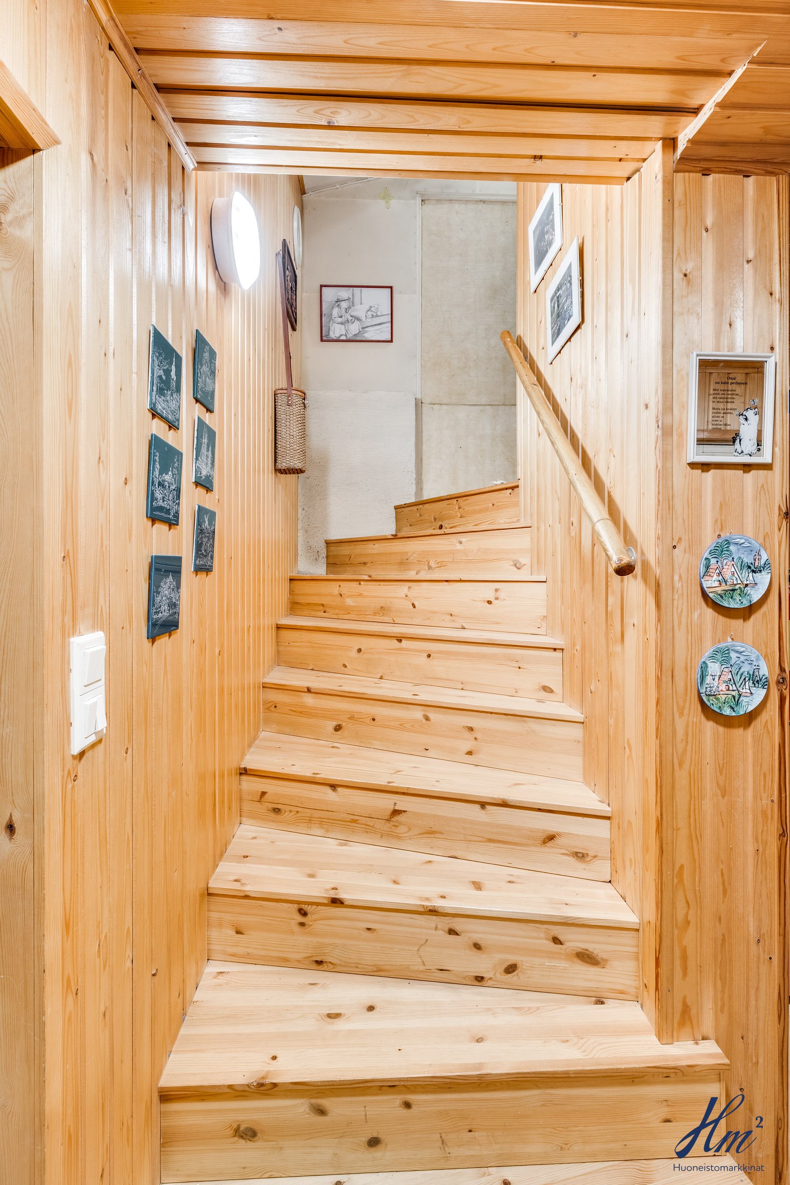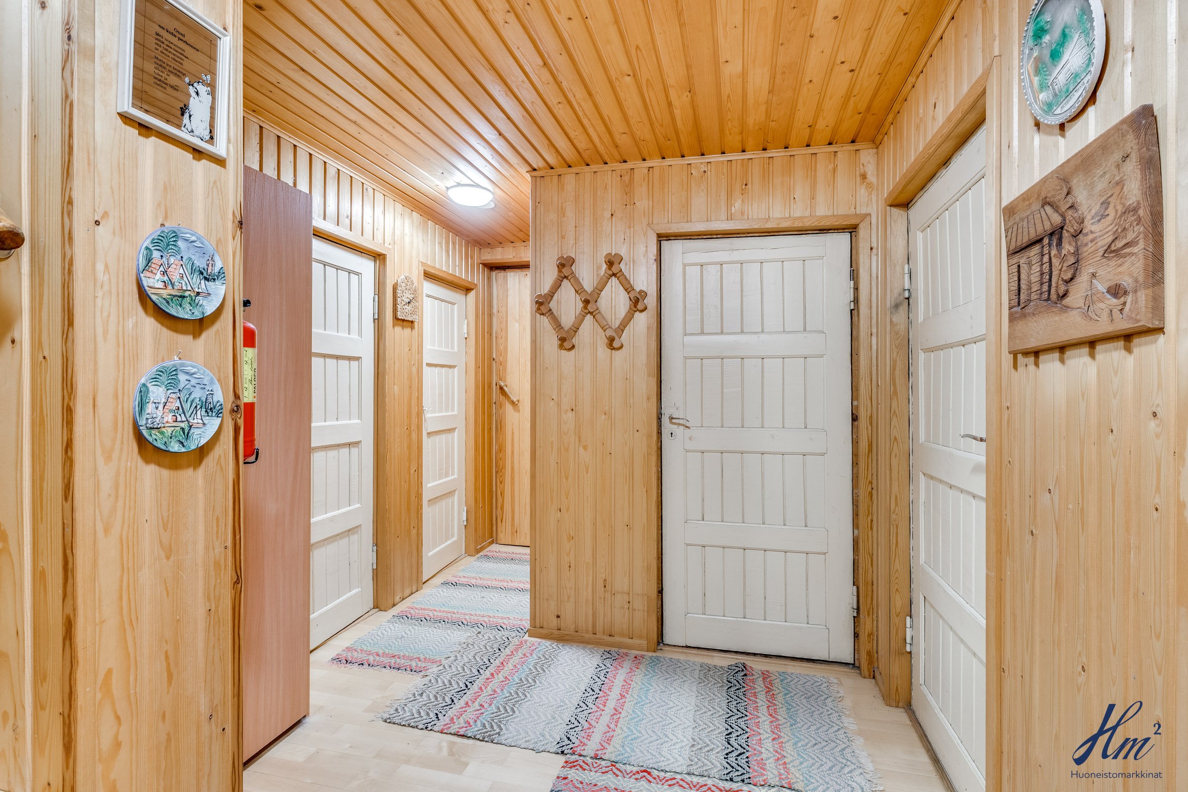 Asuinrakennuksen keskikerroksessa sijaitsevat kodin yhteiset tilat: valoisa olohuone, erillinen ruokahuone, käytännöllinen keittiö sekä wc. Yläkerrassa on kaksi makuuhuonetta, wc ja runsaasti säilytystilaa, osin matalaa tilaa hyödyntäen. Kellarikerroksessa on hyvänkokoinen pesuhuone ja sauna sekä erillinen kodinhoitotila. Lisäksi alakerrassa on lämmin autotalli, joka toimii tällä hetkellä varasto- tai verstastilana.