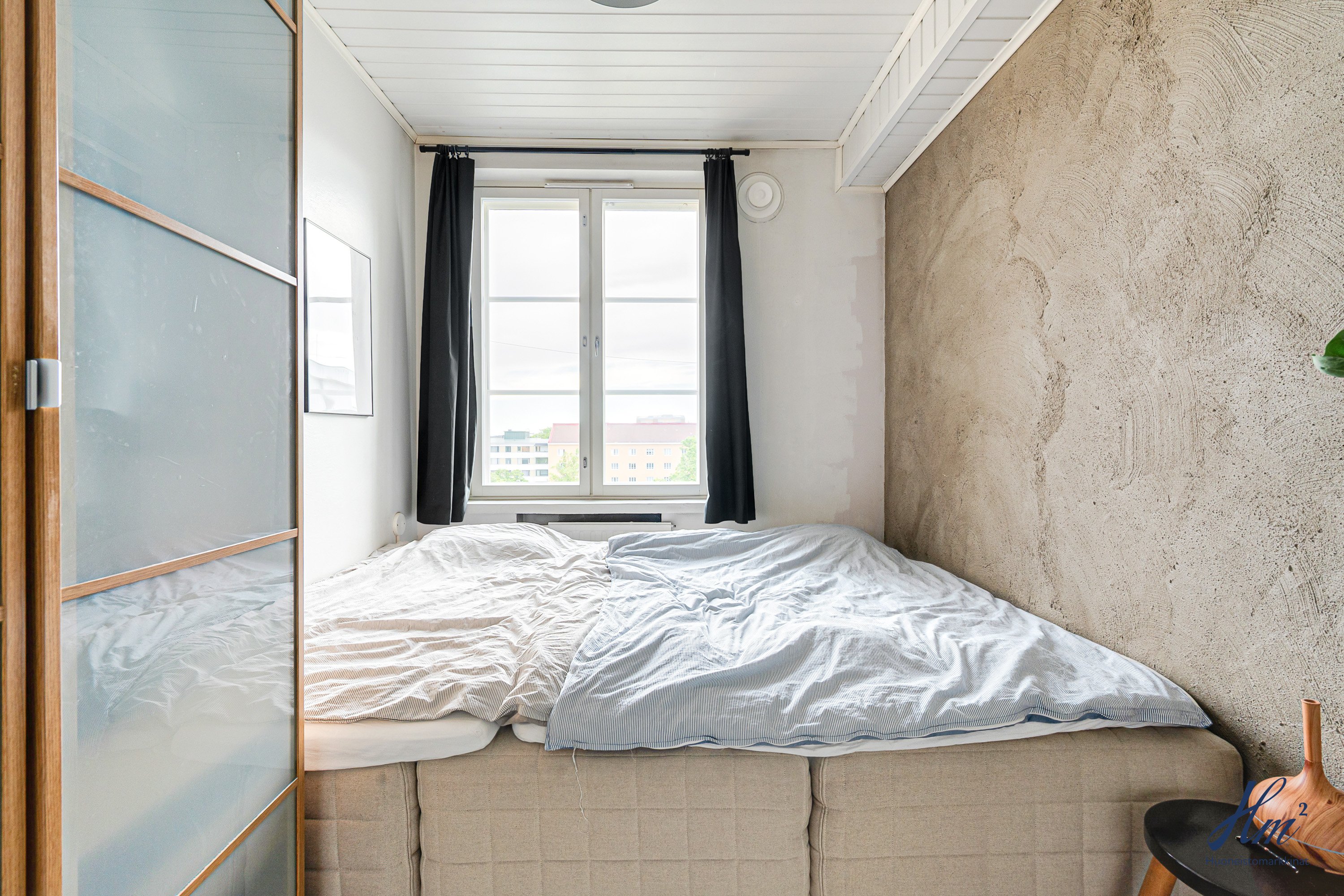 Korkea huonekorkeus, toimiva pohjaratkaisu ja upeat näkymät tekevät kodista poikkeuksellisen viihtyisän: olohuoneesta avautuu maisema vehreän kaupunkikorttelin kattojen yli aina Mikaelinkirkolle asti, kun taas makuuhuoneen ikkunoista näet rauhallisen sisäpihan.