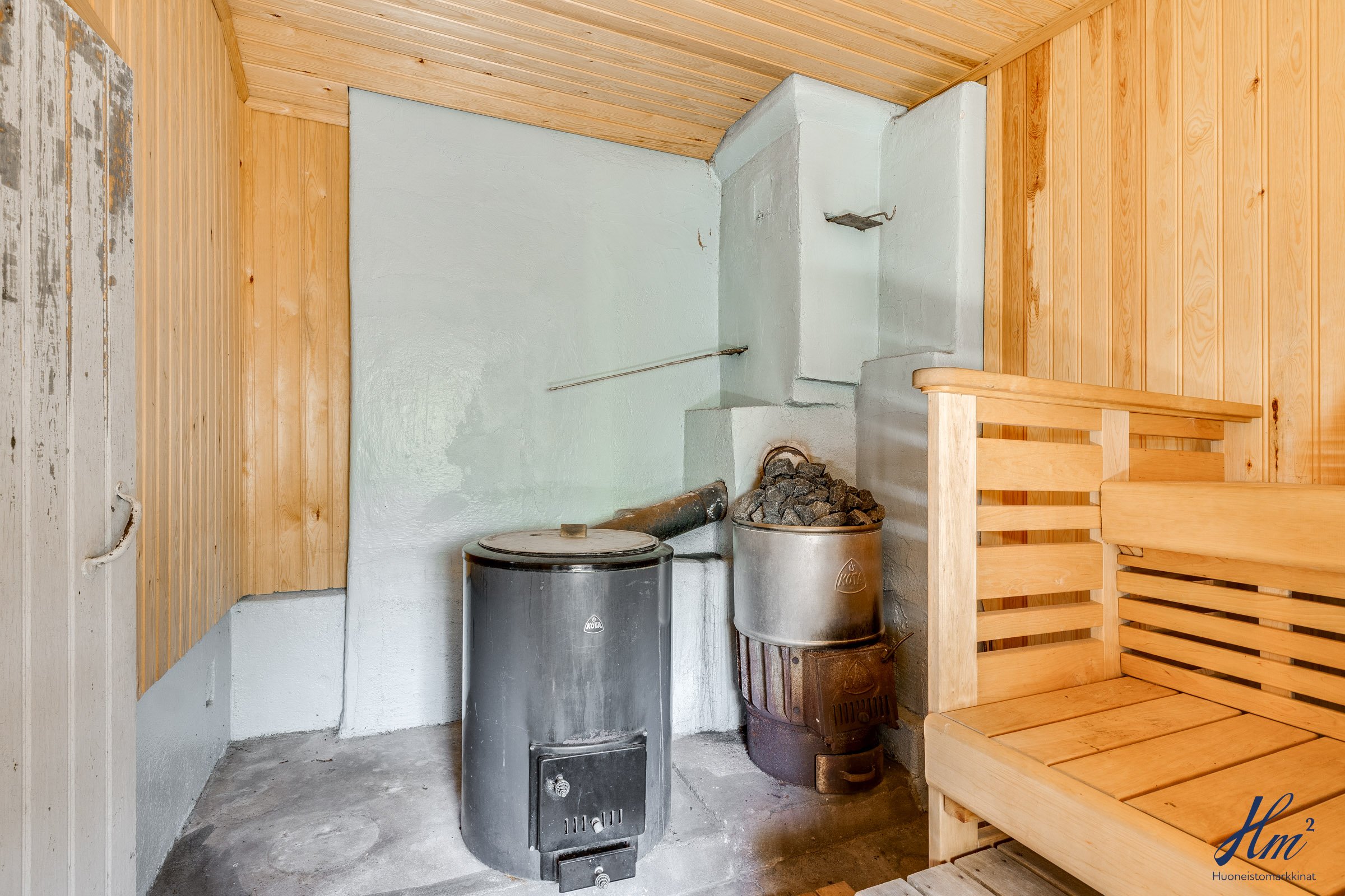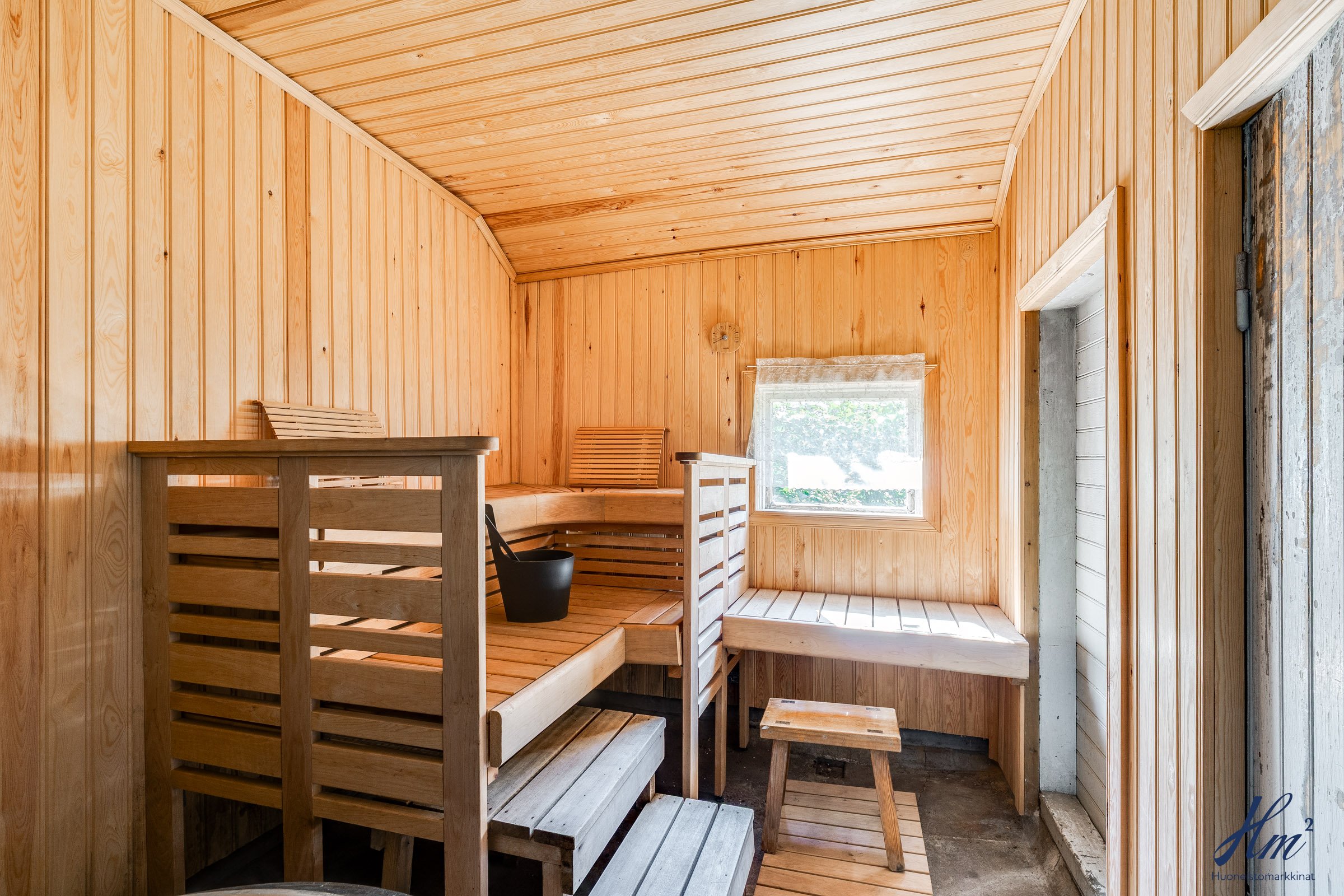Pihasauna. Puukiuas, pukuhuonetila. Pihasaunaa on kunnostettu vuosien varrella, tarkempaa tietoa ei ole saatavilla.