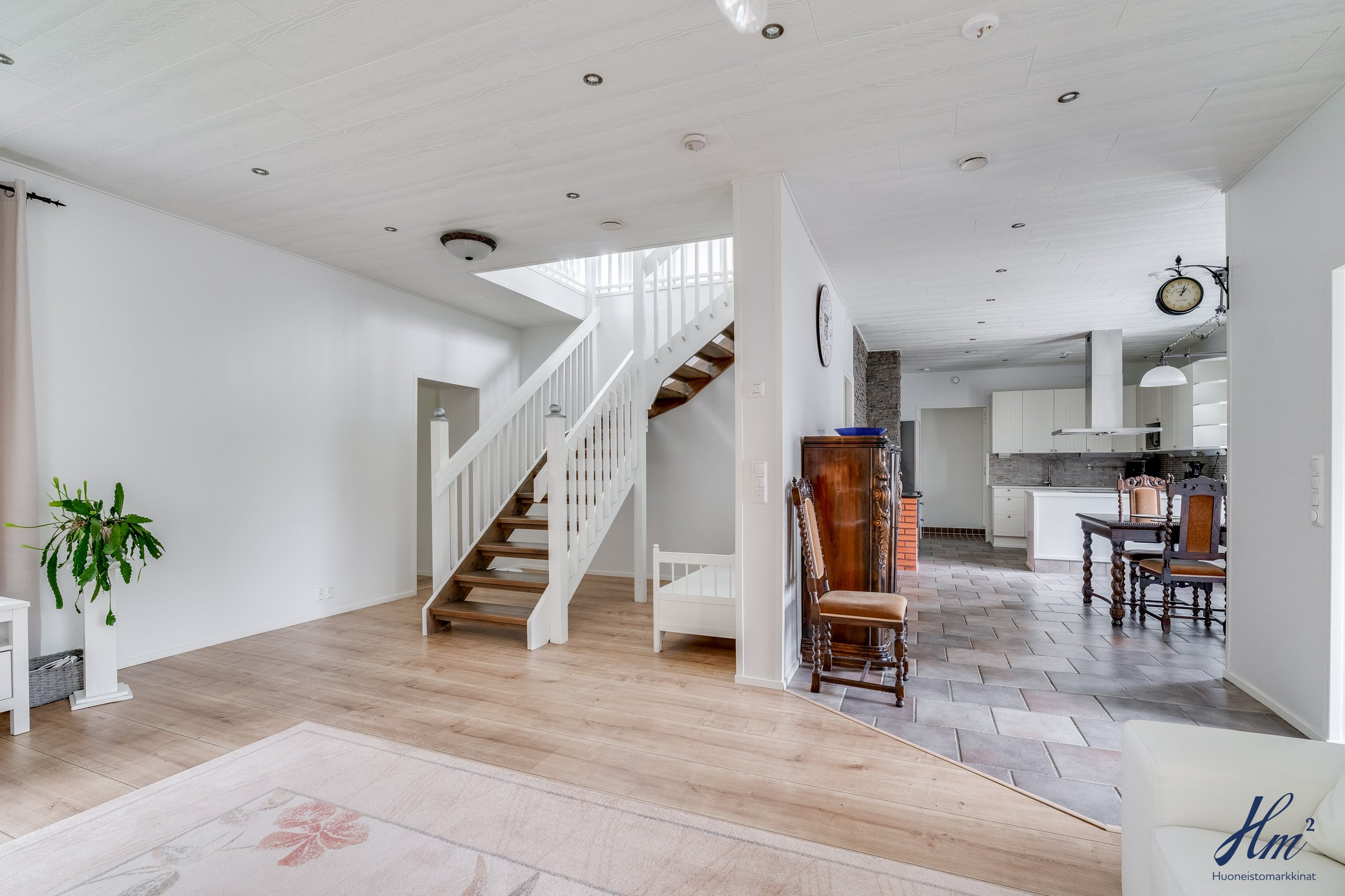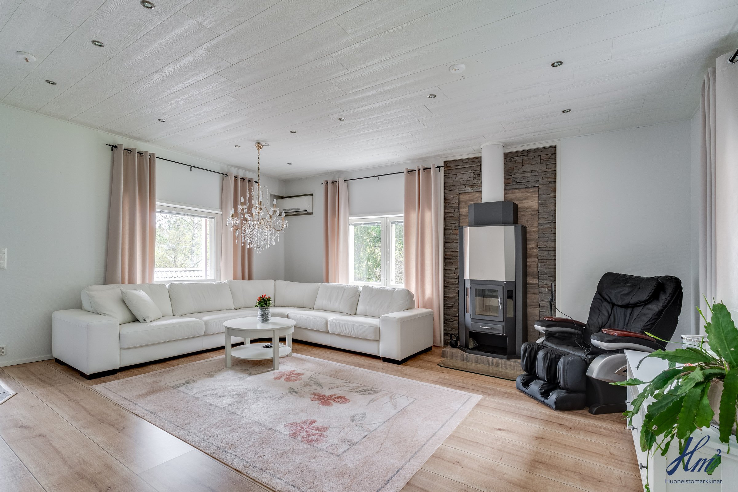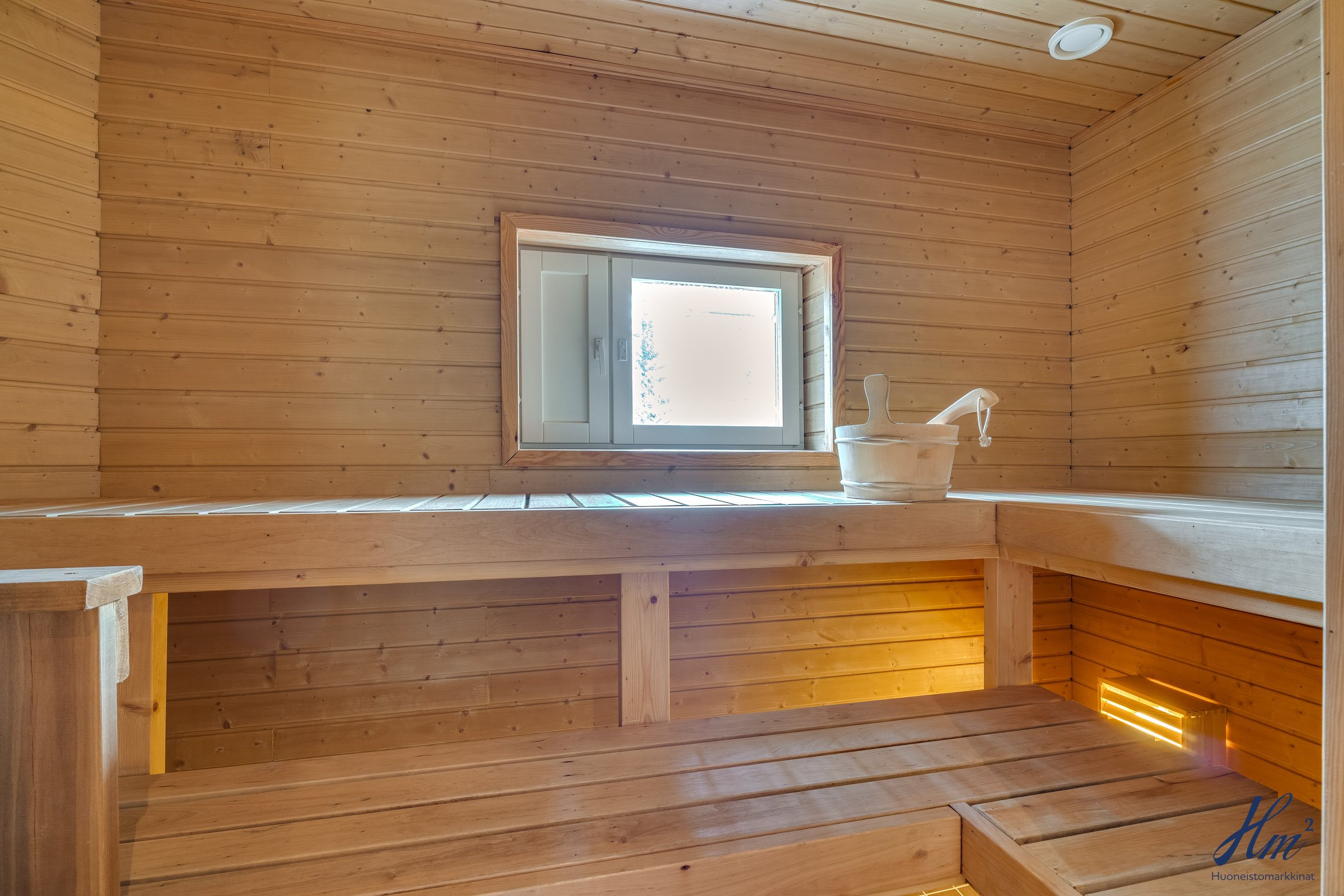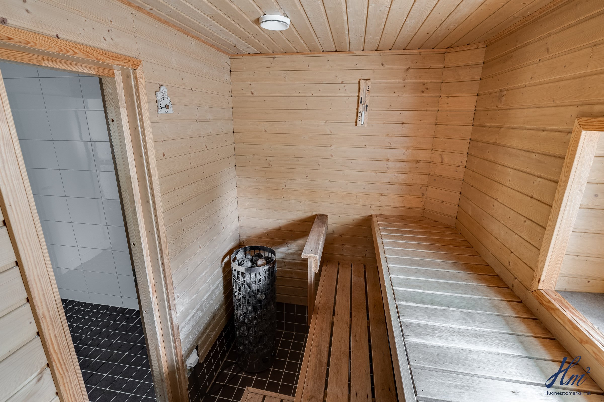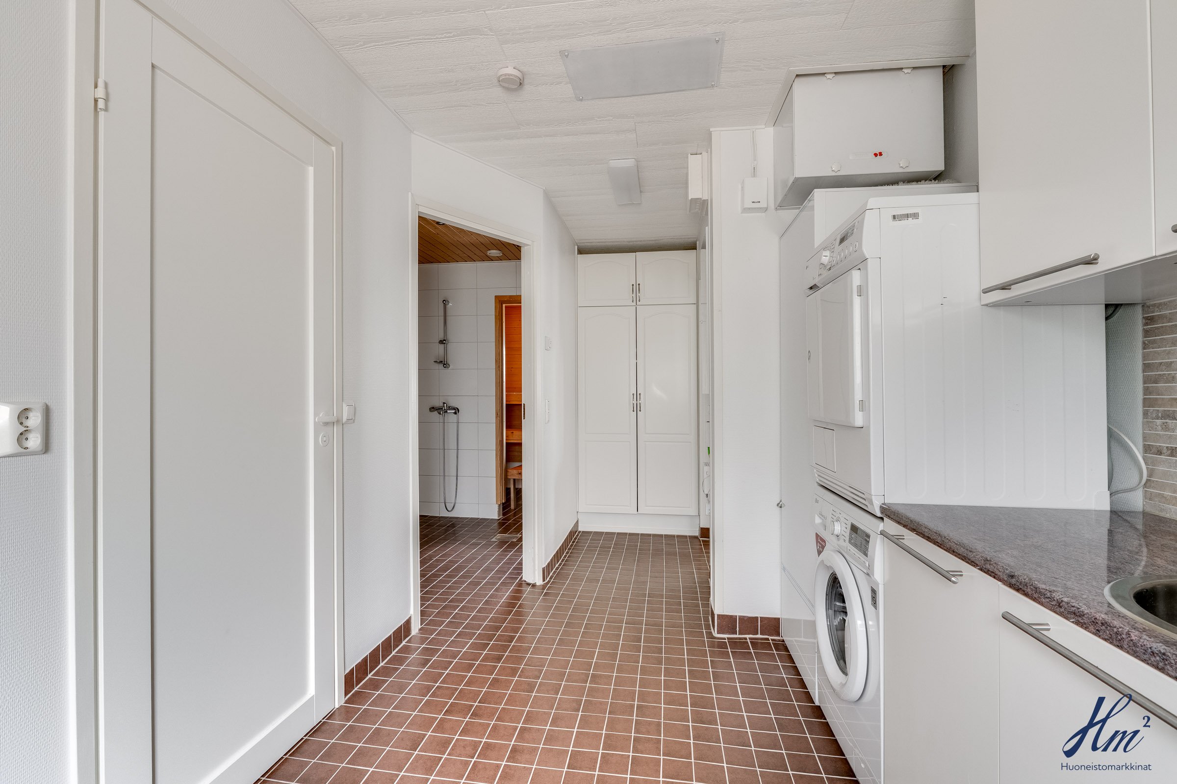 Alakerrassa on avara ja valoisa olohuone, jossa on takka. Keittiö on hyvin varusteltu, ja sen kruunaa puuhella. Neljä makuuhuonetta tarjoavat runsaasti tilaa perheelle tai vieraille, ja sauna kutsuu rentoutumaan kiireisen päivän jälkeen. Kodinhoitohuone helpottaa arjen sujuvuutta omalla uloskäynnillä.