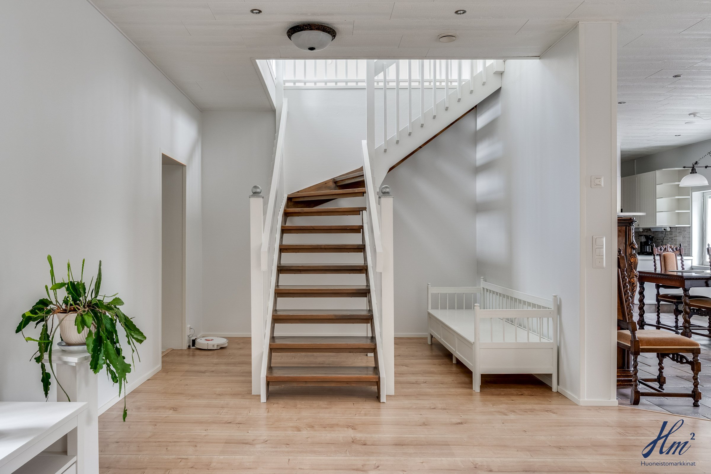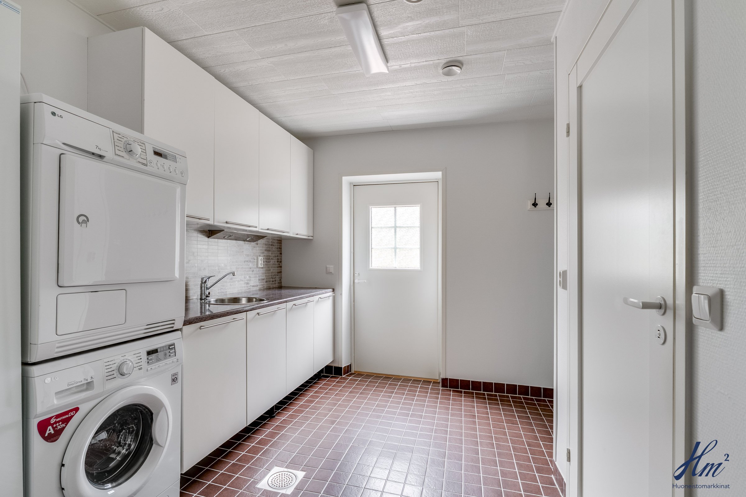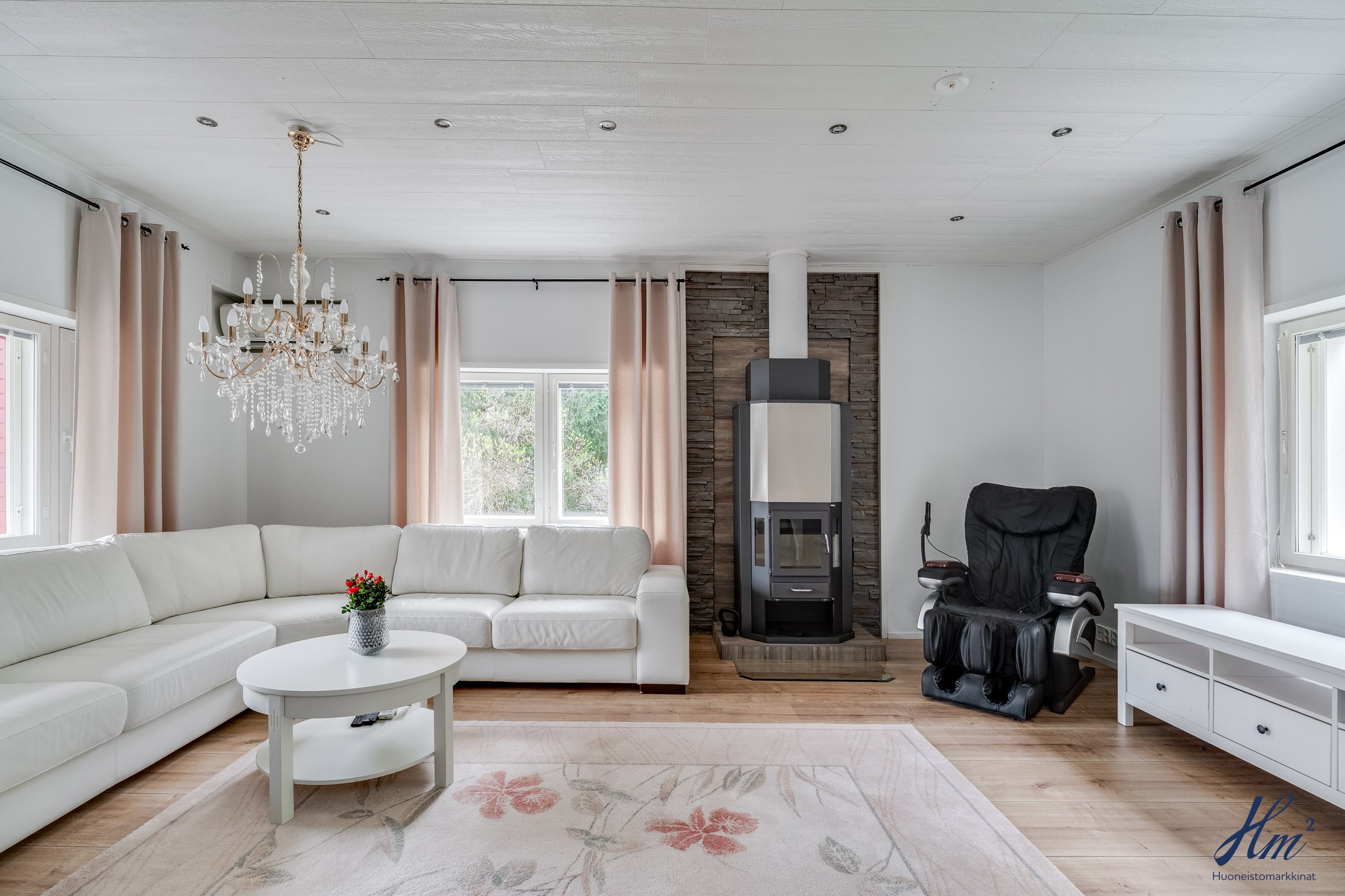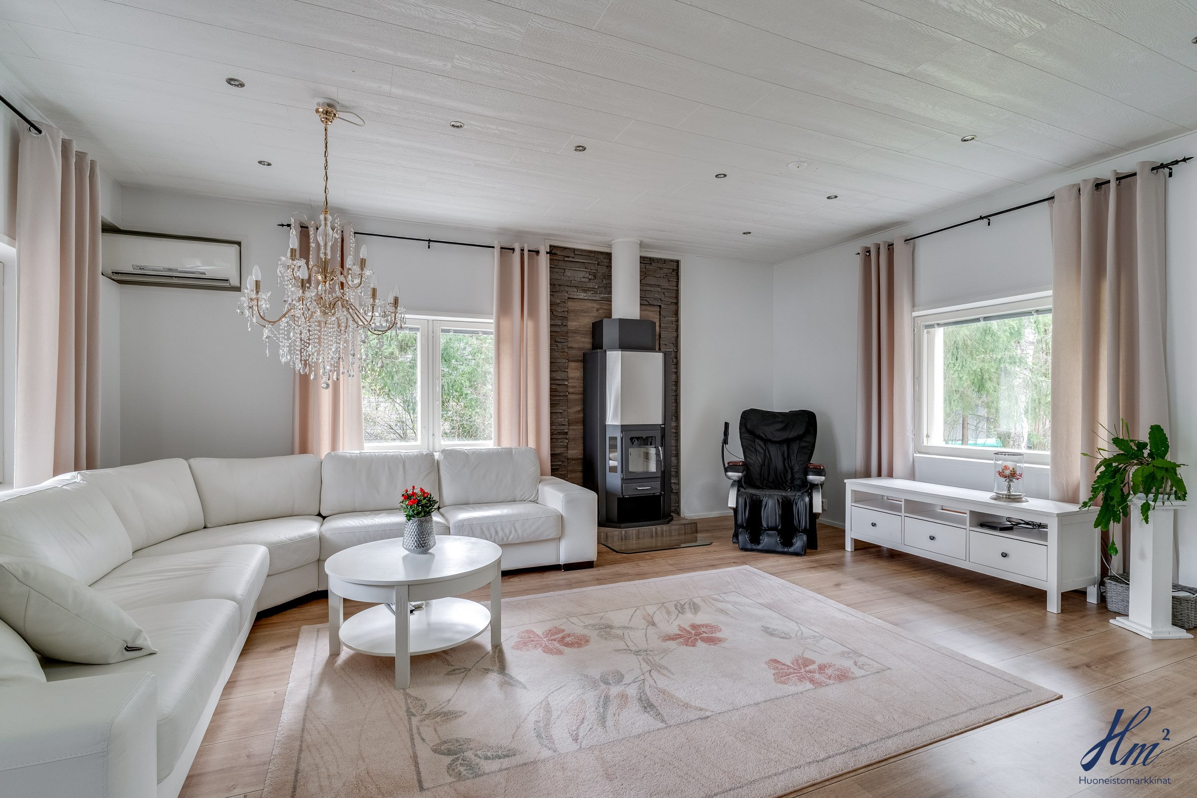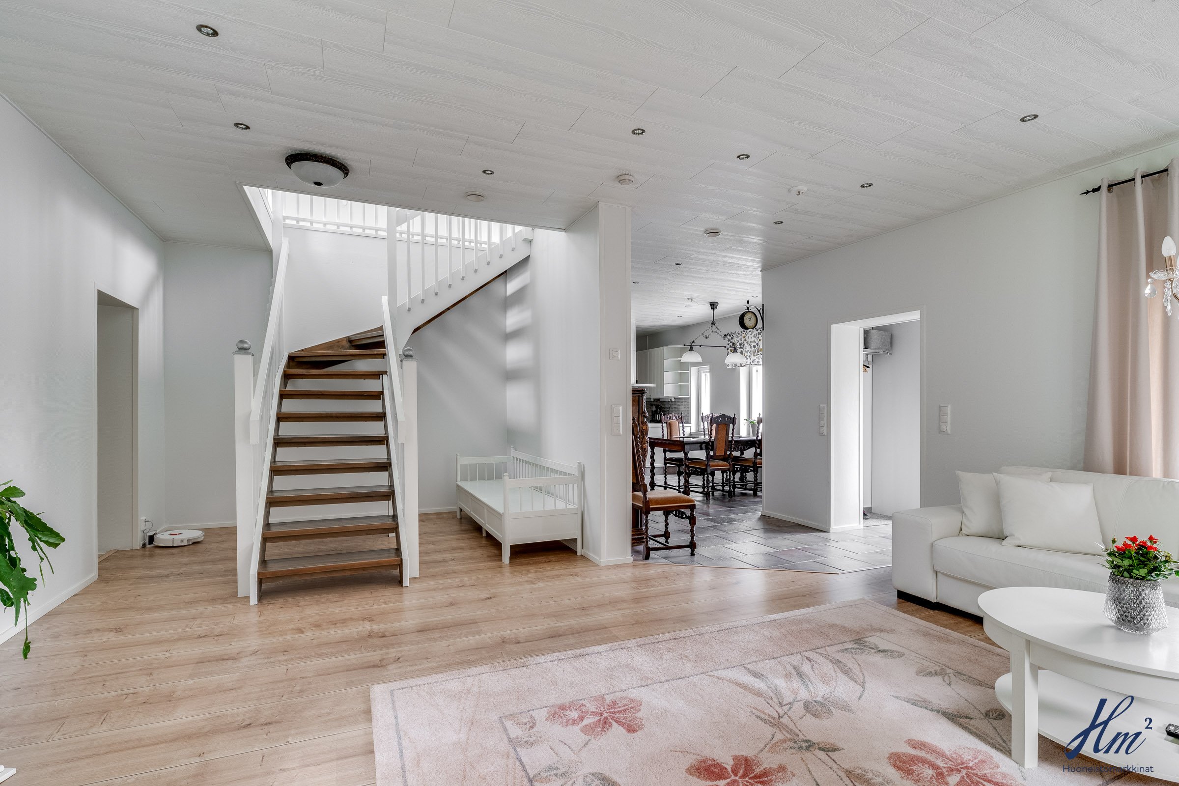 Alakerrassa on avara ja valoisa olohuone, jossa on takka. Keittiö on hyvin varusteltu, ja sen kruunaa puuhella. Neljä makuuhuonetta tarjoavat runsaasti tilaa perheelle tai vieraille, ja sauna kutsuu rentoutumaan kiireisen päivän jälkeen. Kodinhoitohuone helpottaa arjen sujuvuutta omalla uloskäynnillä.