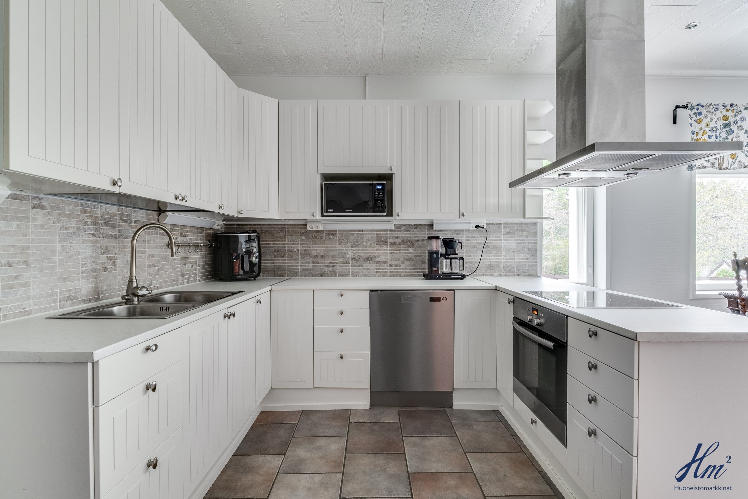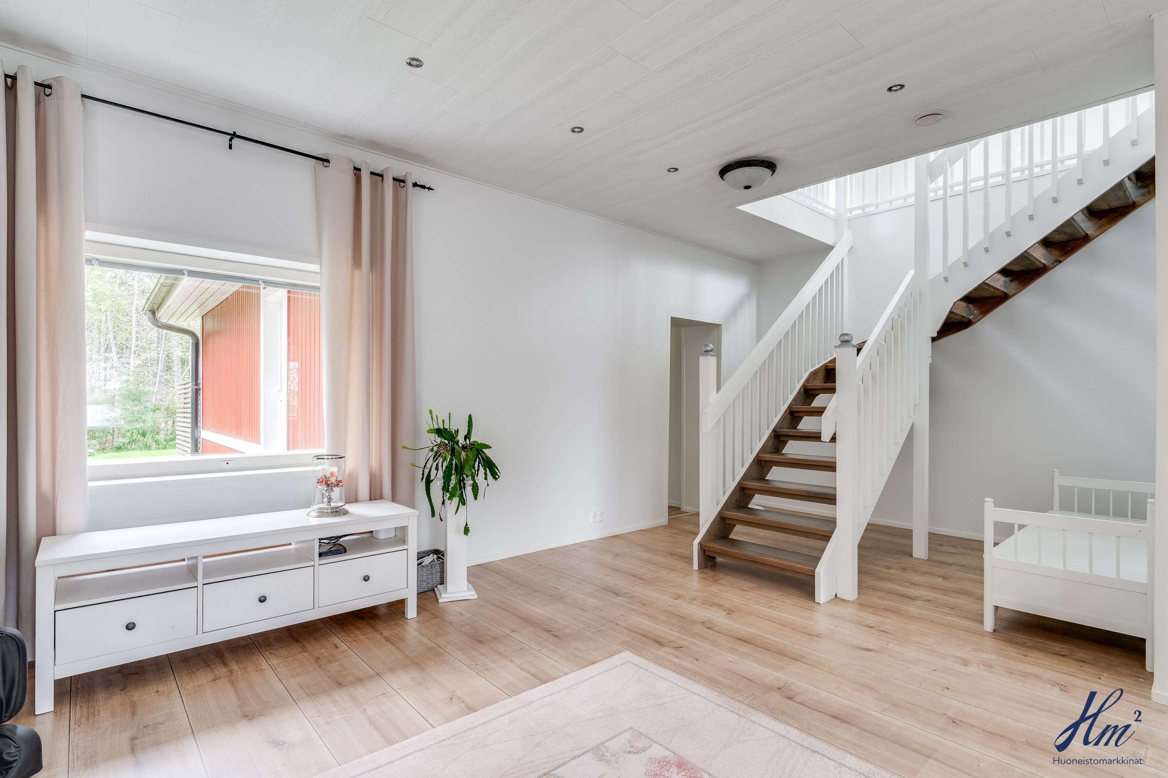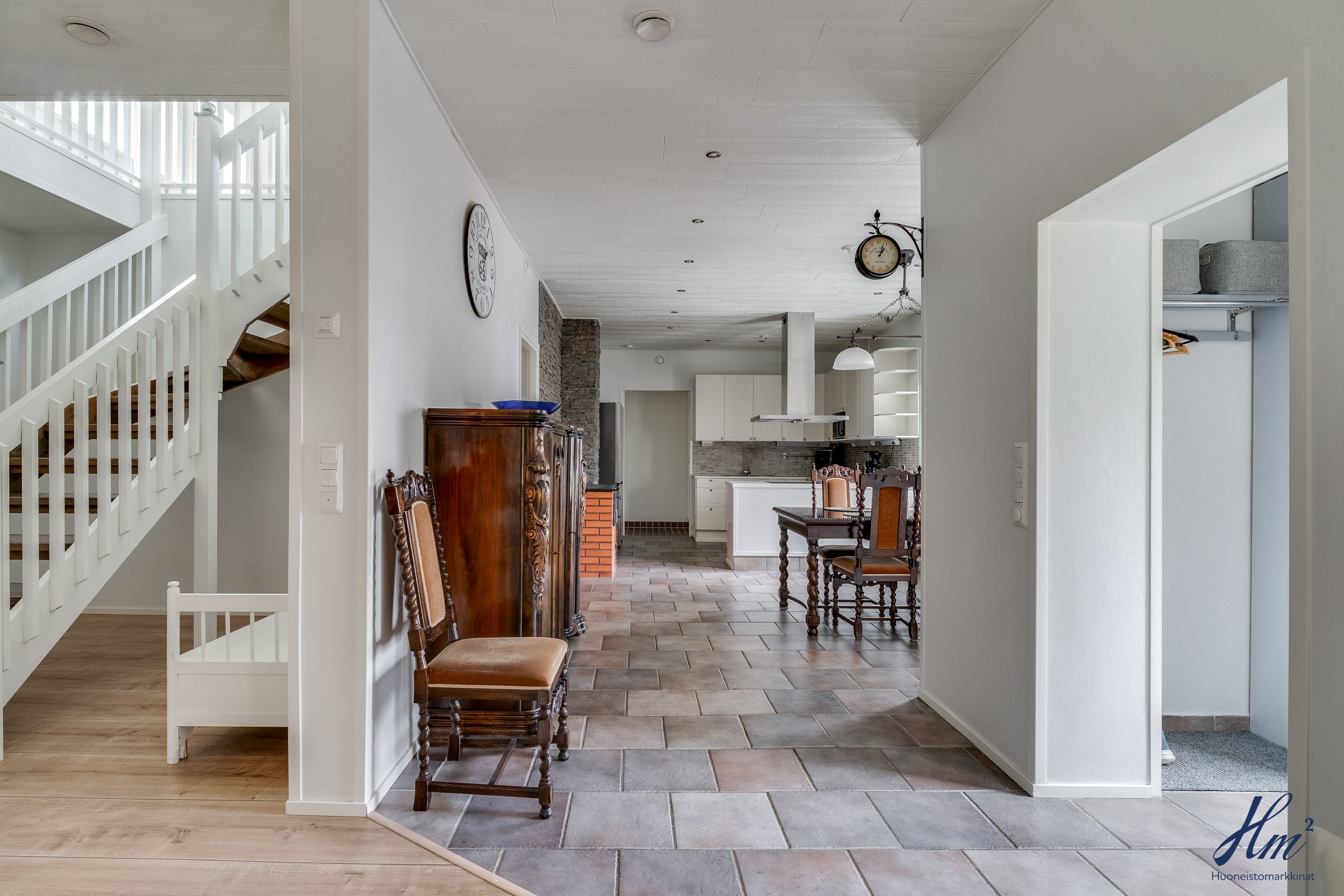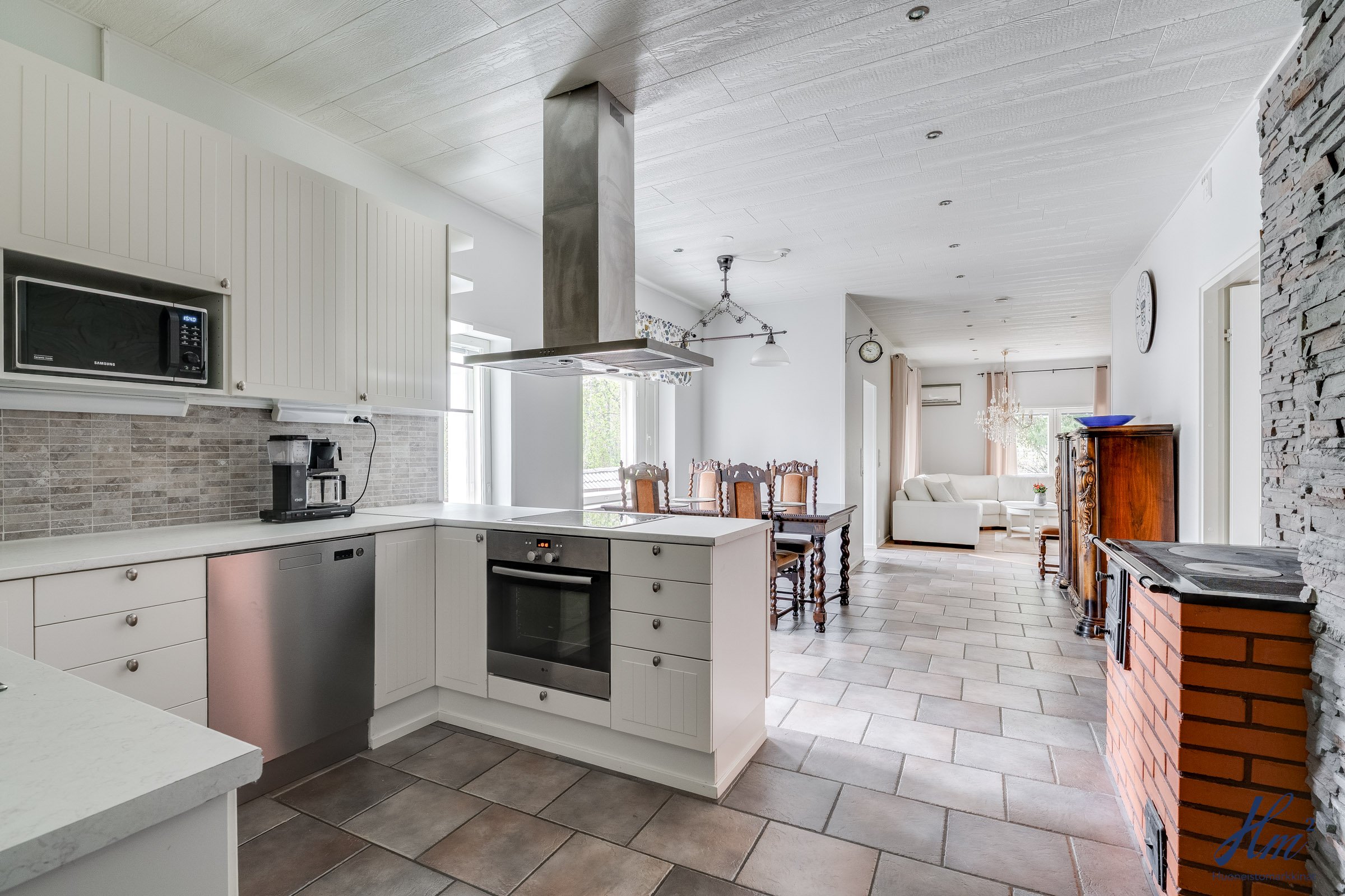 Alakerrassa on avara ja valoisa olohuone, jossa on takka. Keittiö on hyvin varusteltu, ja sen kruunaa puuhella. Neljä makuuhuonetta tarjoavat runsaasti tilaa perheelle tai vieraille, ja sauna kutsuu rentoutumaan kiireisen päivän jälkeen. Kodinhoitohuone helpottaa arjen sujuvuutta omalla uloskäynnillä.