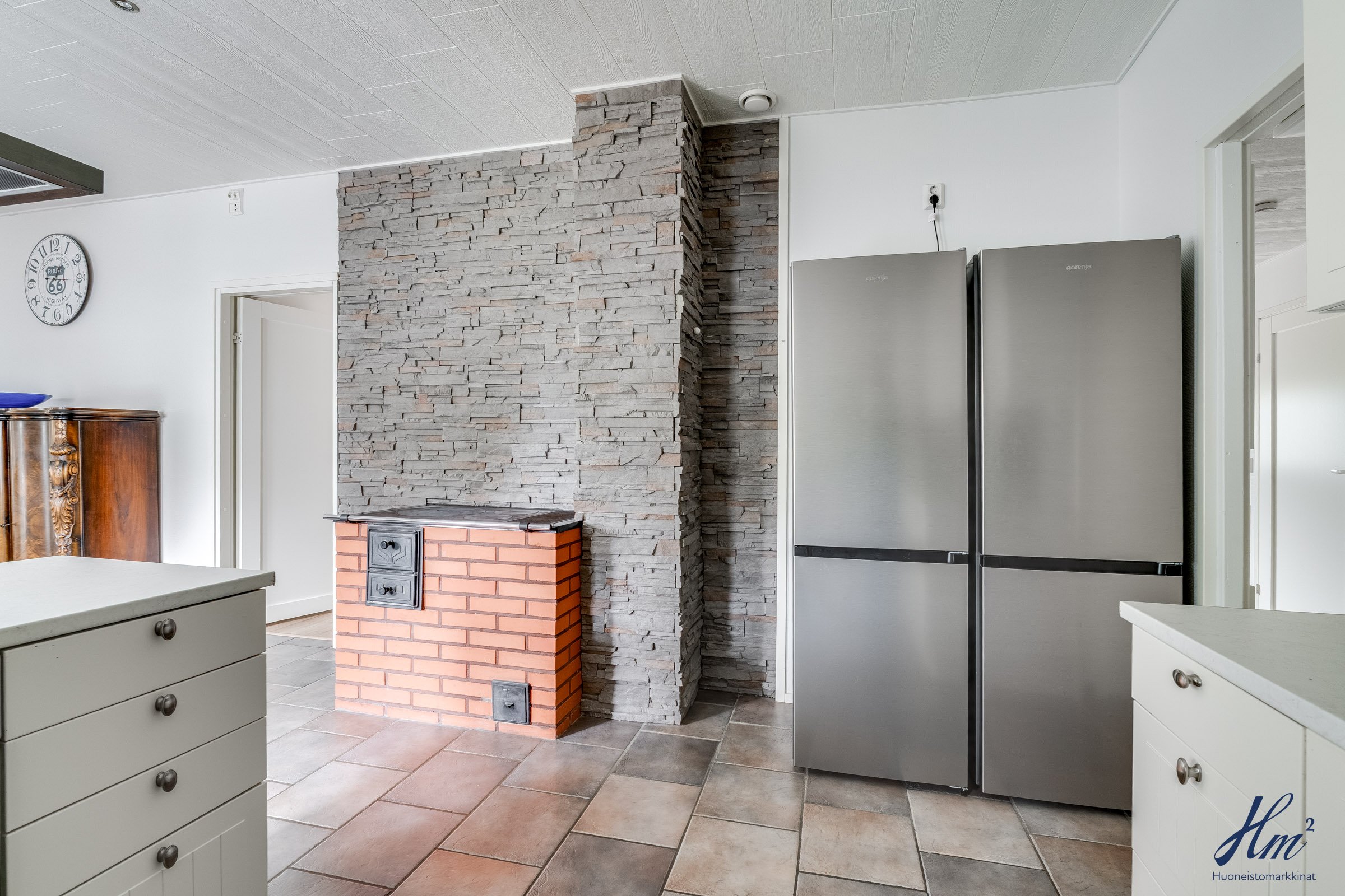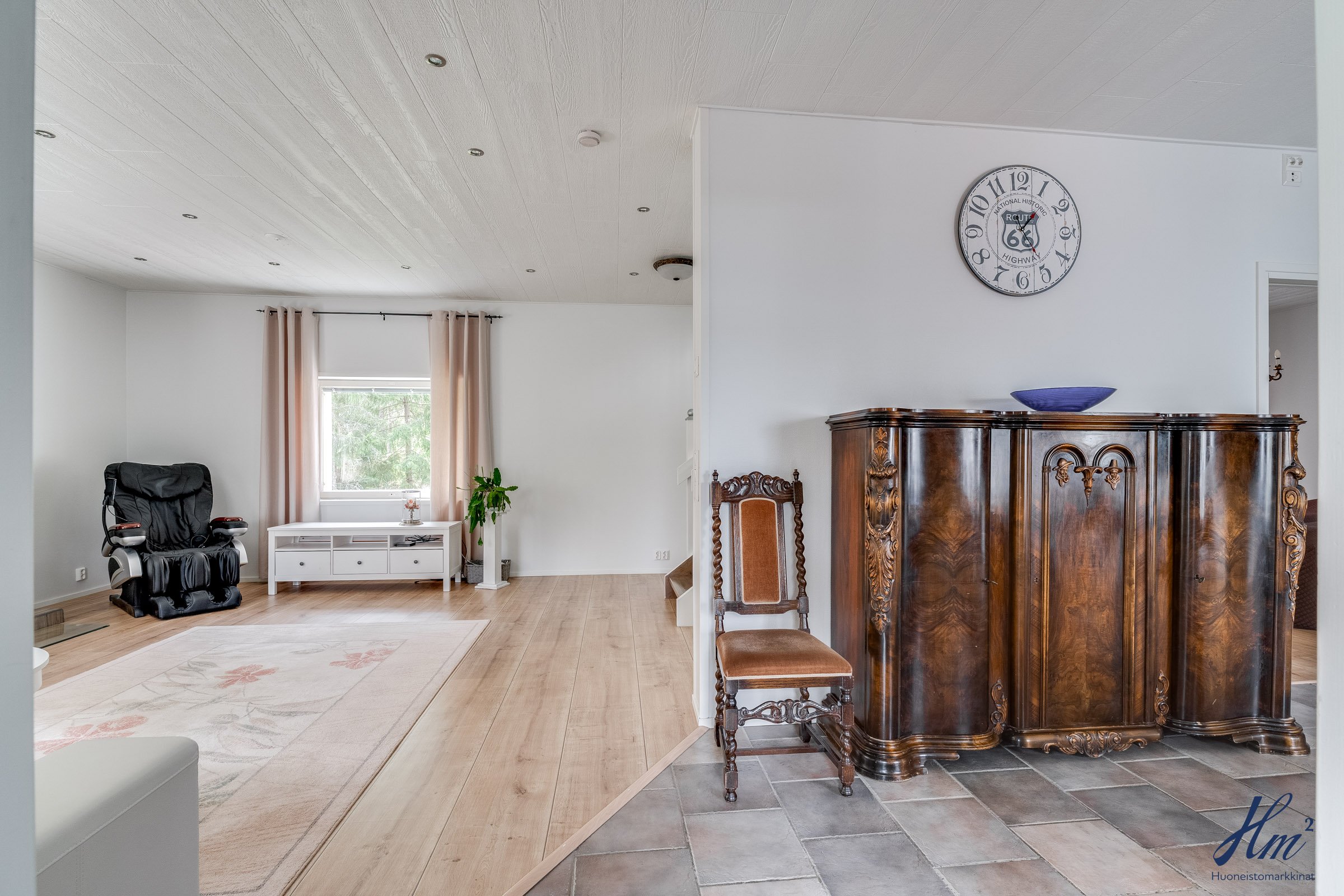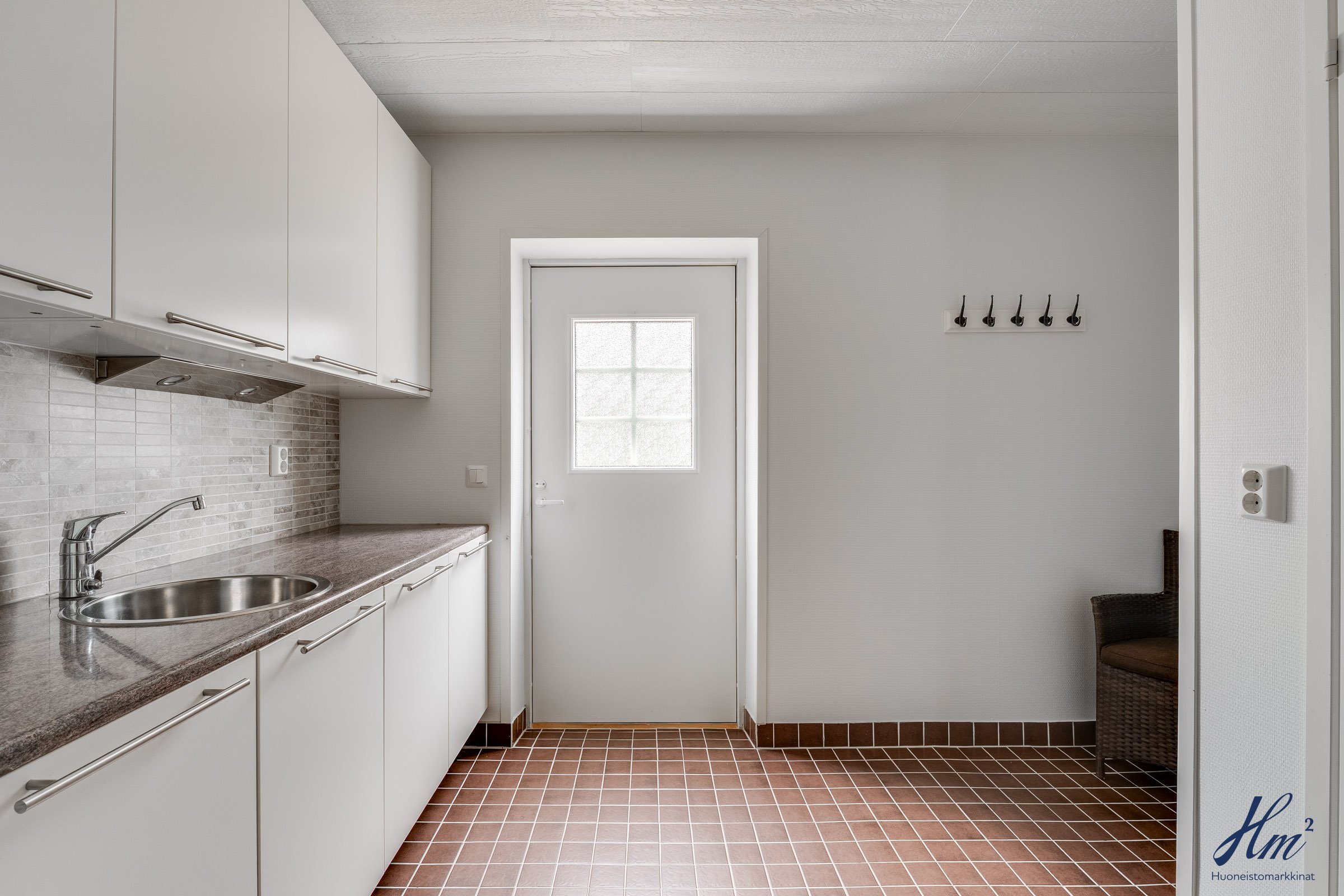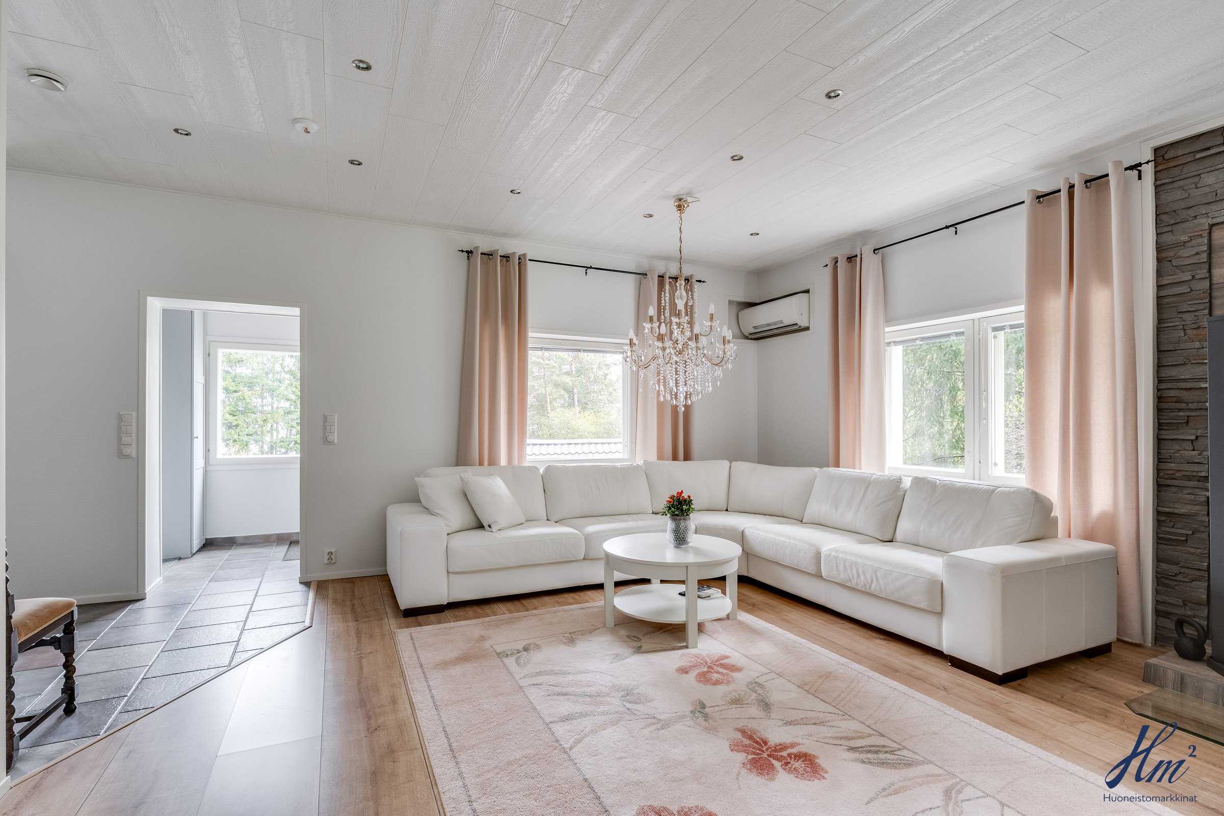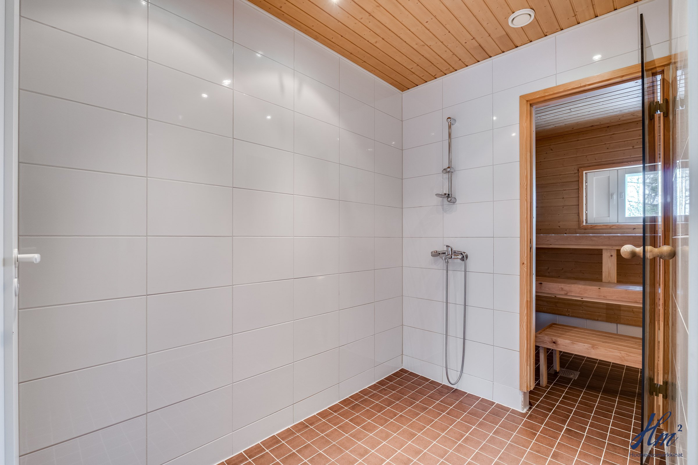 Alakerrassa on avara ja valoisa olohuone, jossa on takka. Keittiö on hyvin varusteltu, ja sen kruunaa puuhella. Neljä makuuhuonetta tarjoavat runsaasti tilaa perheelle tai vieraille, ja sauna kutsuu rentoutumaan kiireisen päivän jälkeen. Kodinhoitohuone helpottaa arjen sujuvuutta omalla uloskäynnillä.