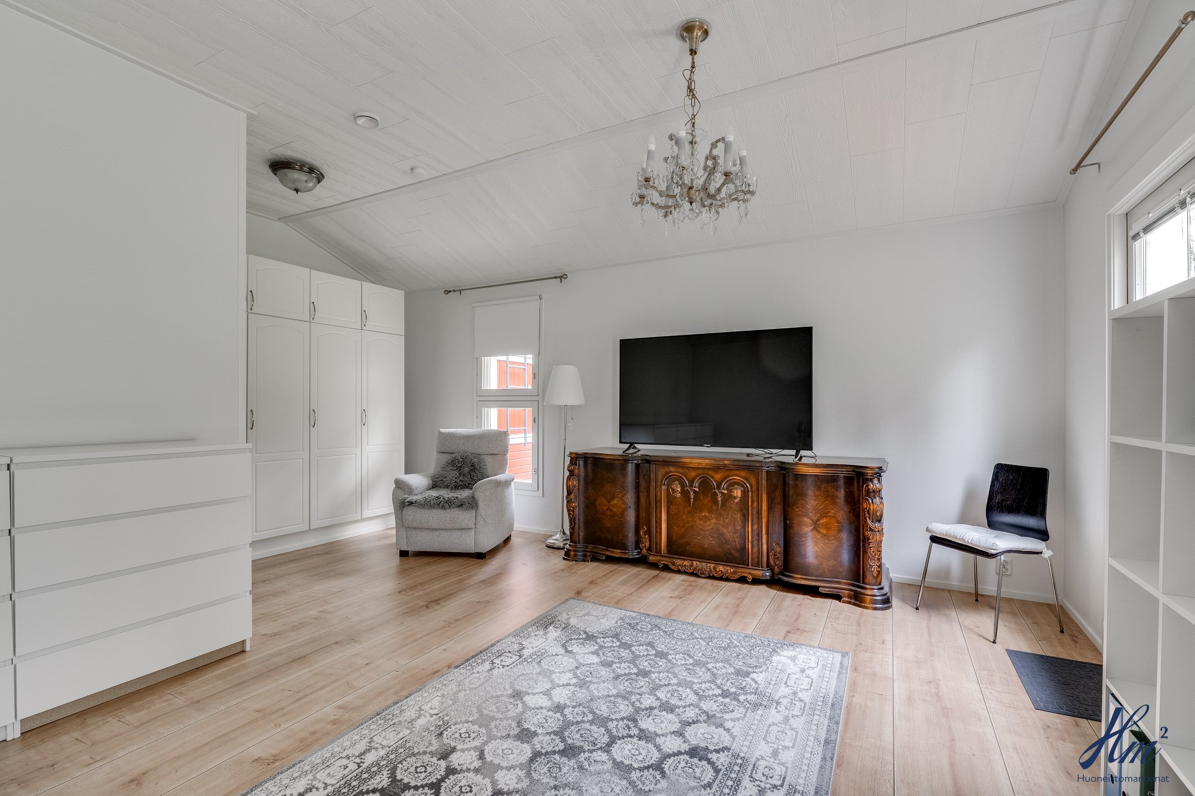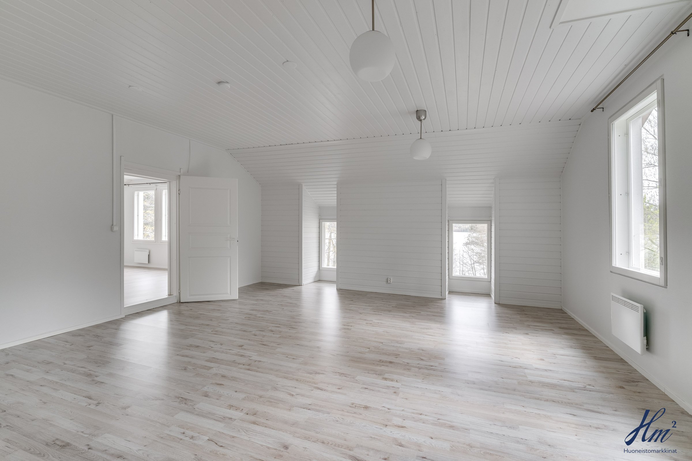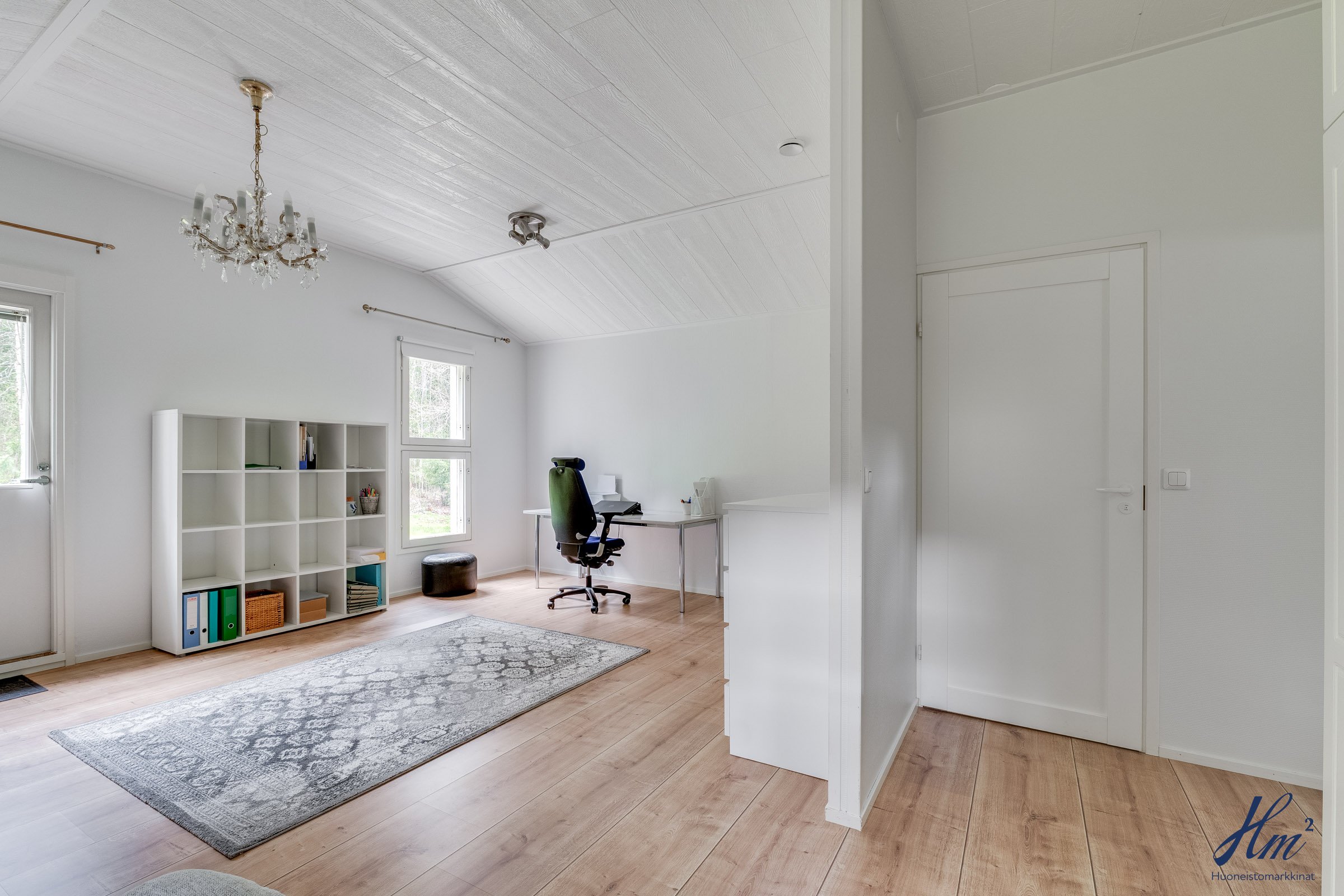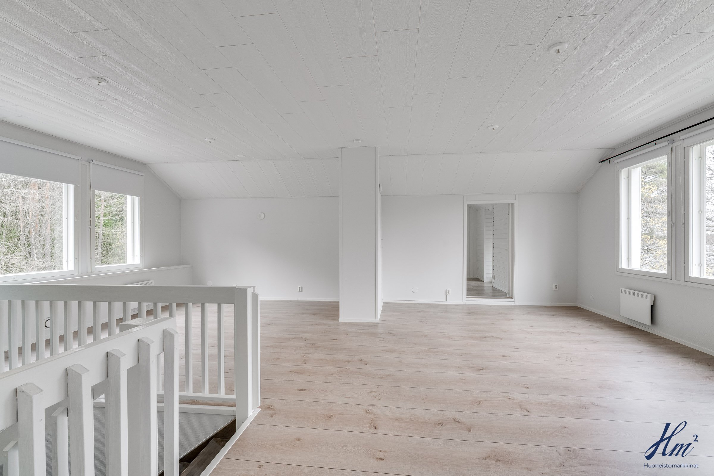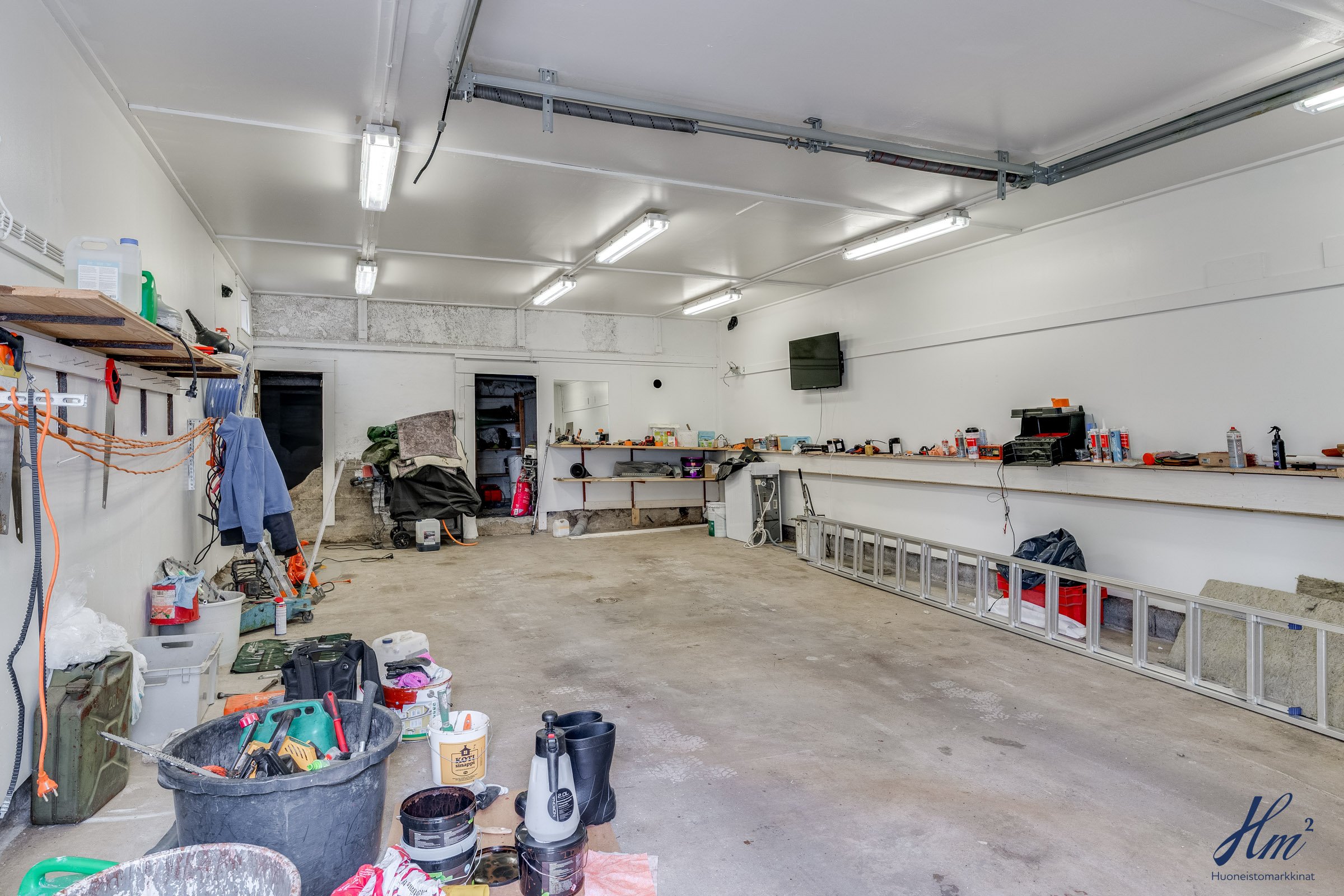 Yläkerrasta löytyy lisää oleskelutilaa sekä kaksi makuuhuoneista. Talon alakerrasta löytyy runsaasti varastotilaa sekä tilava autotalli noin 60 m².