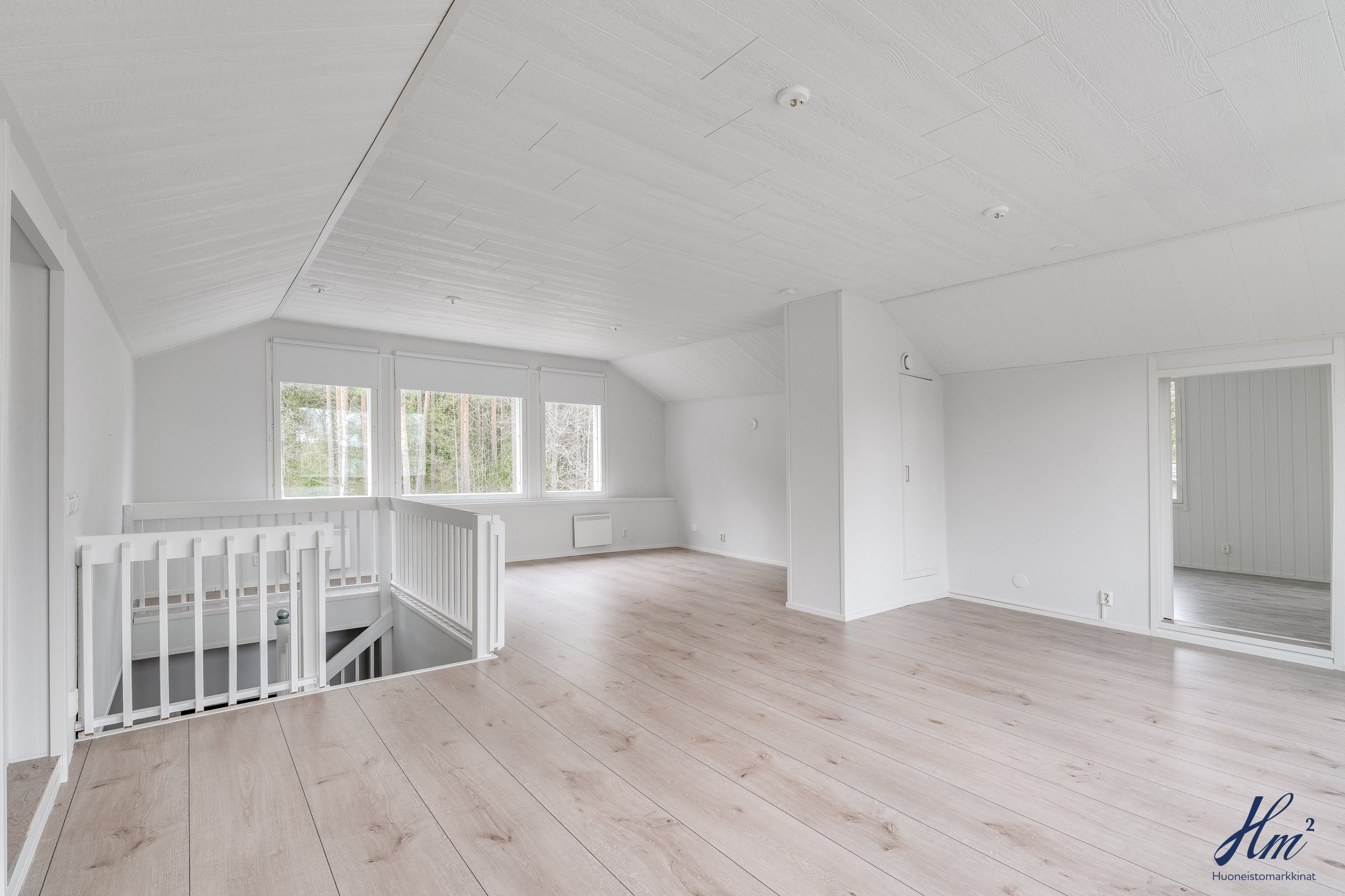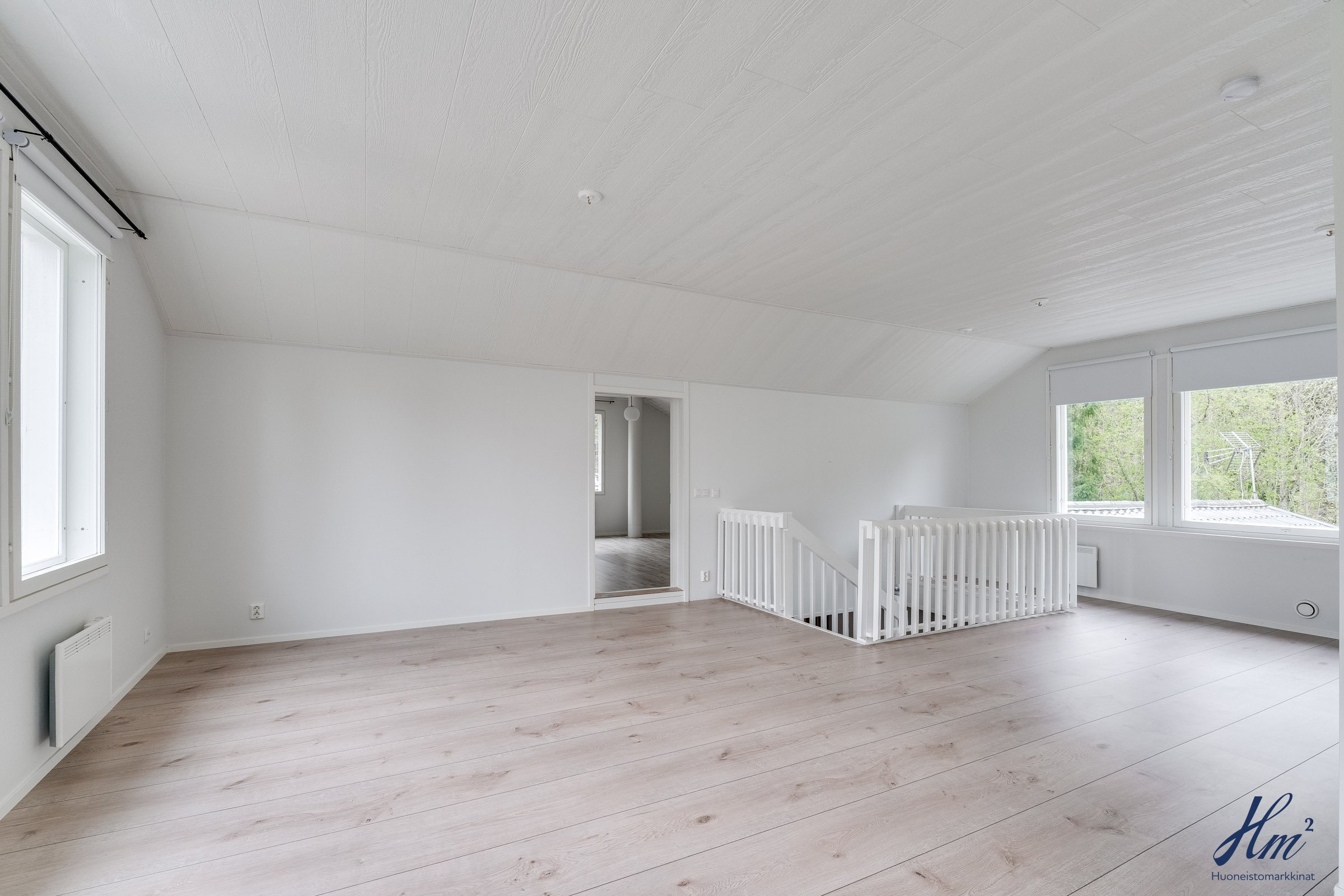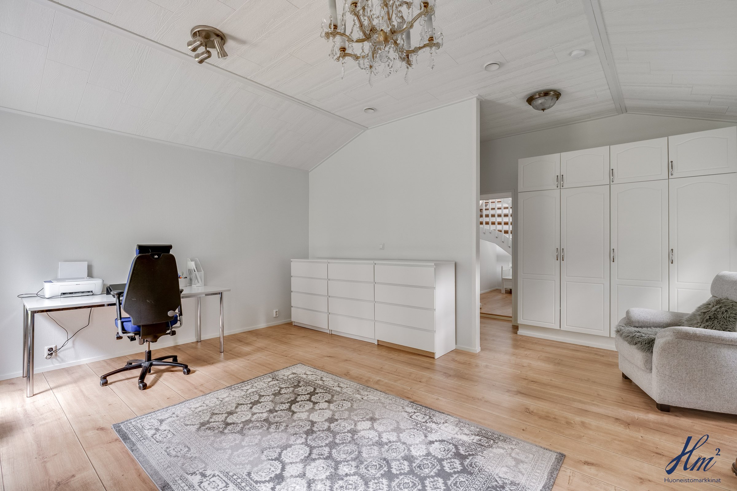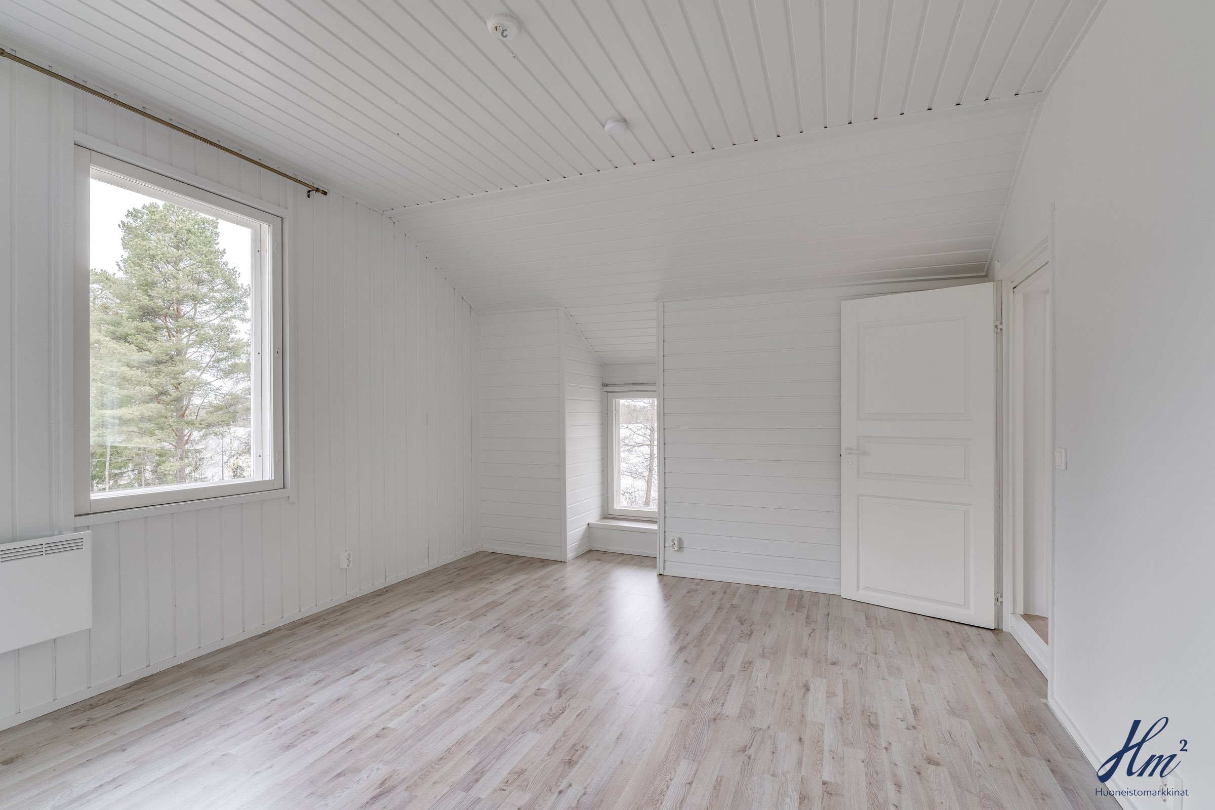 Yläkerrasta löytyy lisää oleskelutilaa sekä kaksi makuuhuoneista. Talon alakerrasta löytyy runsaasti varastotilaa sekä tilava autotalli noin 60 m².