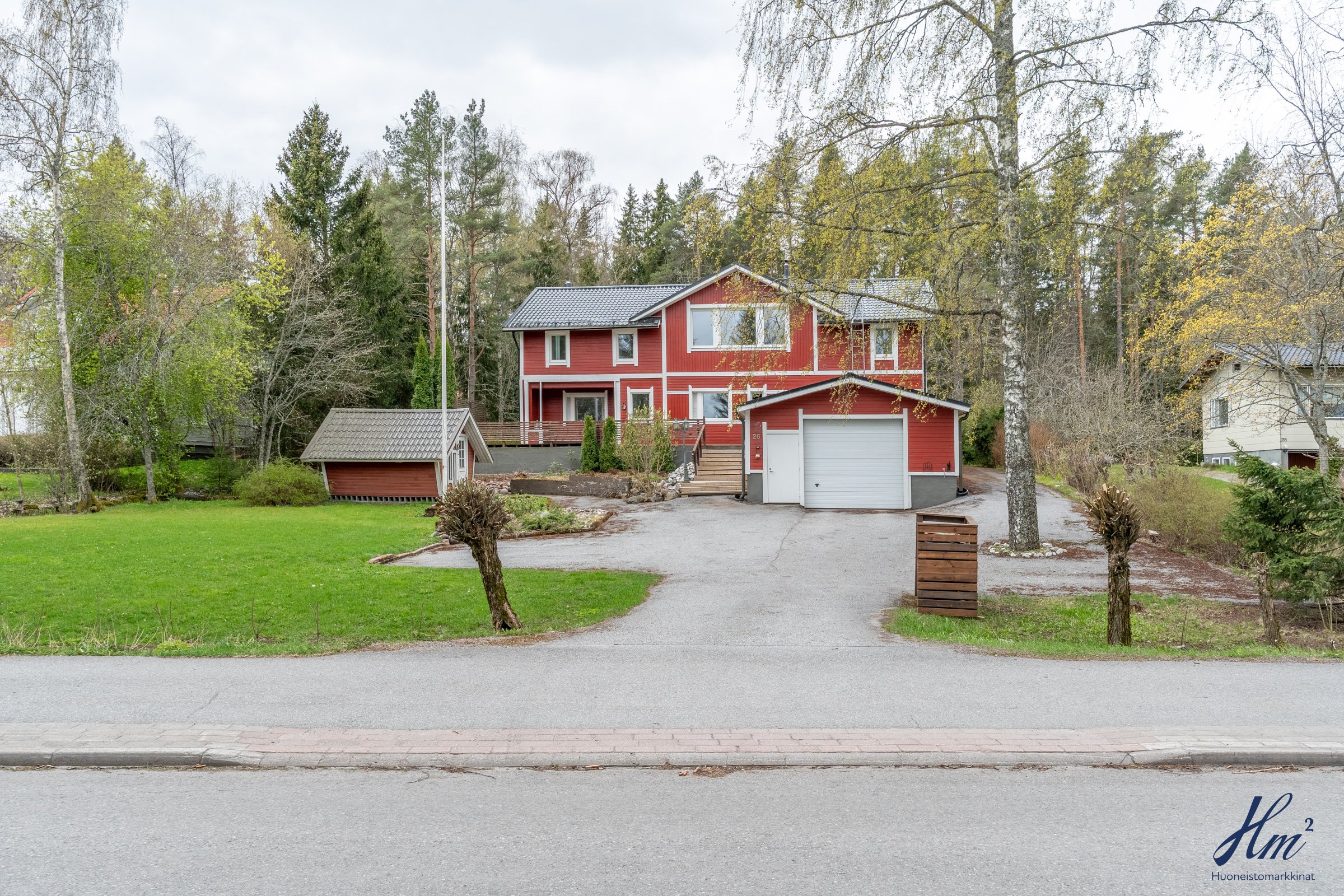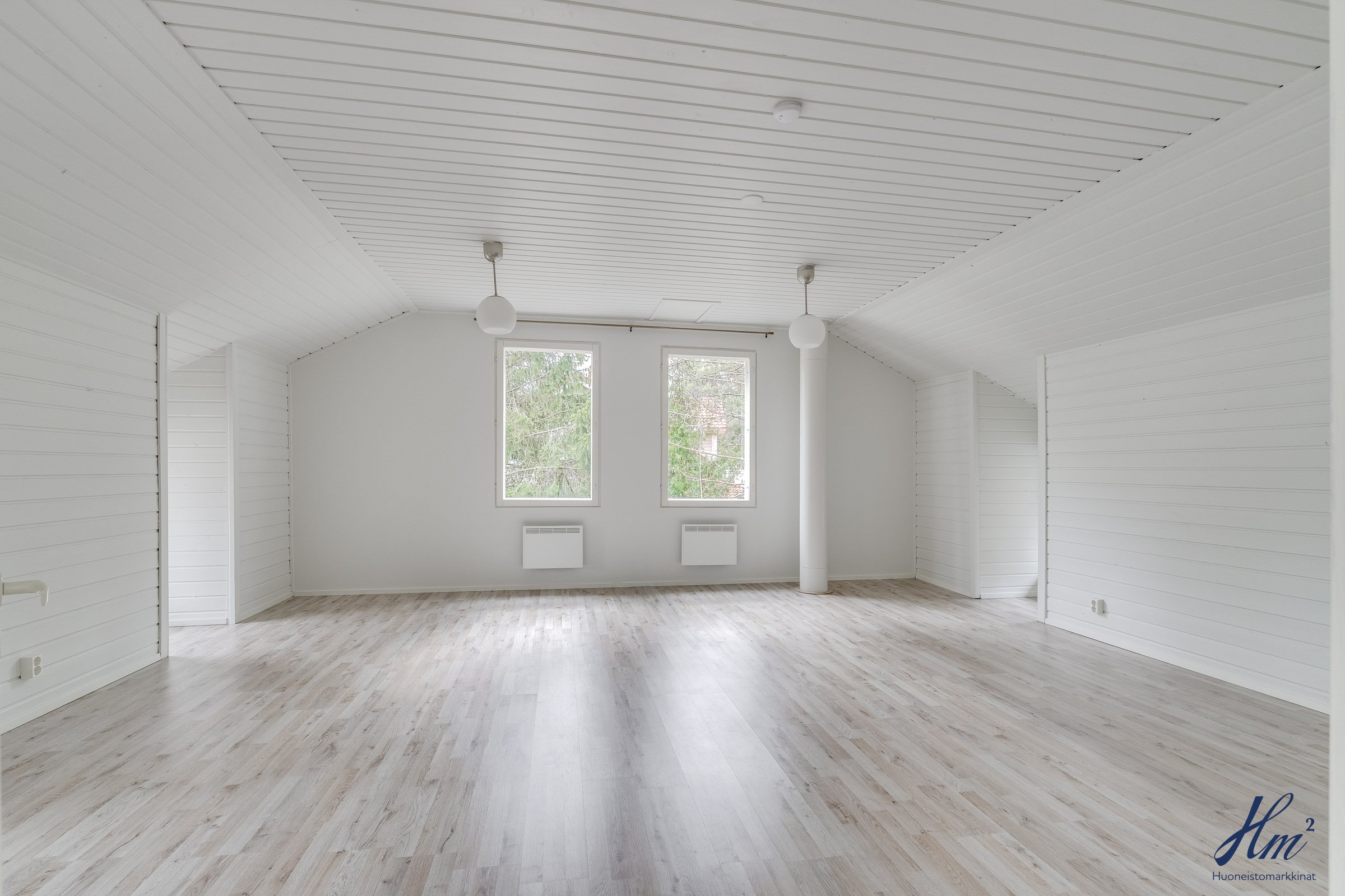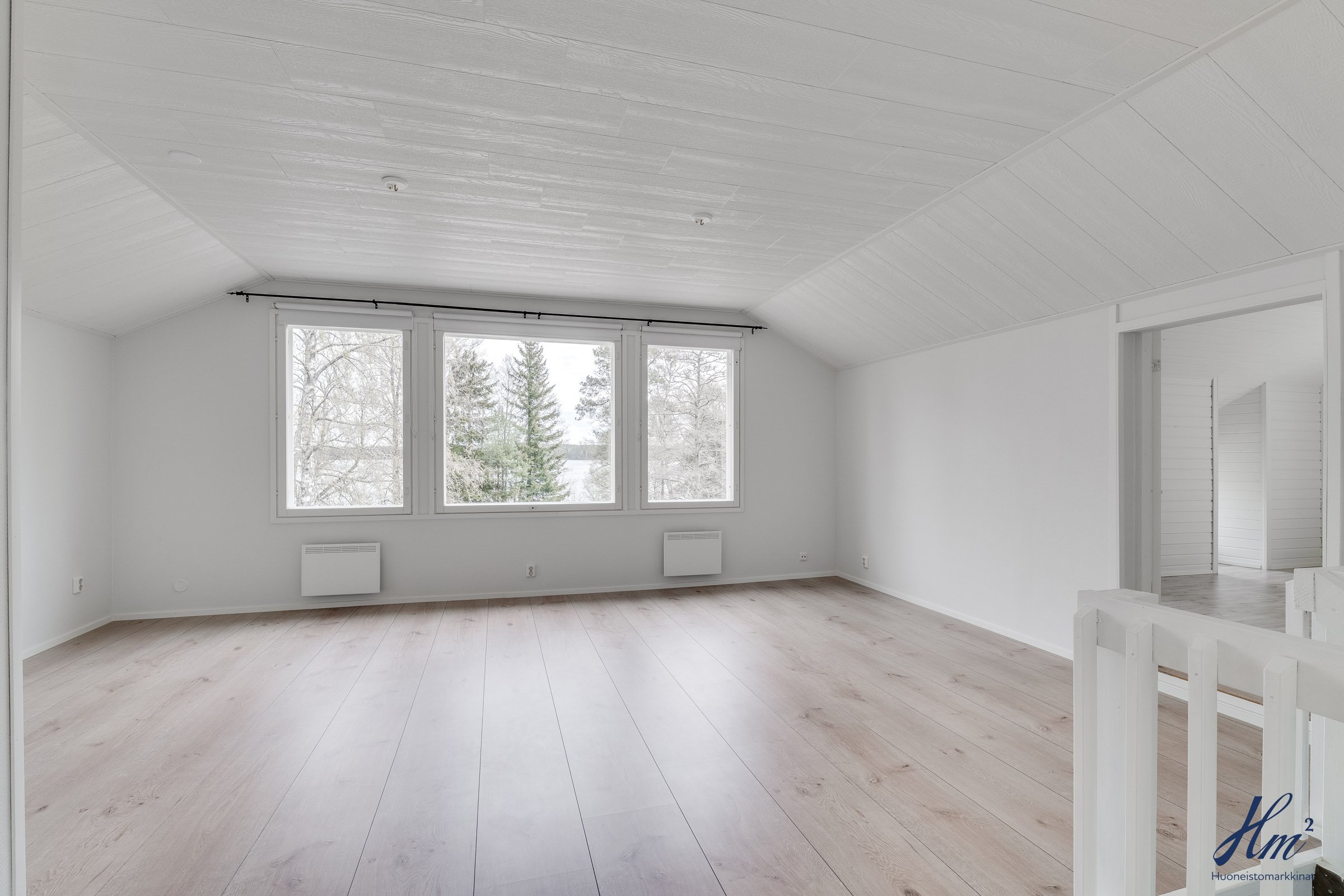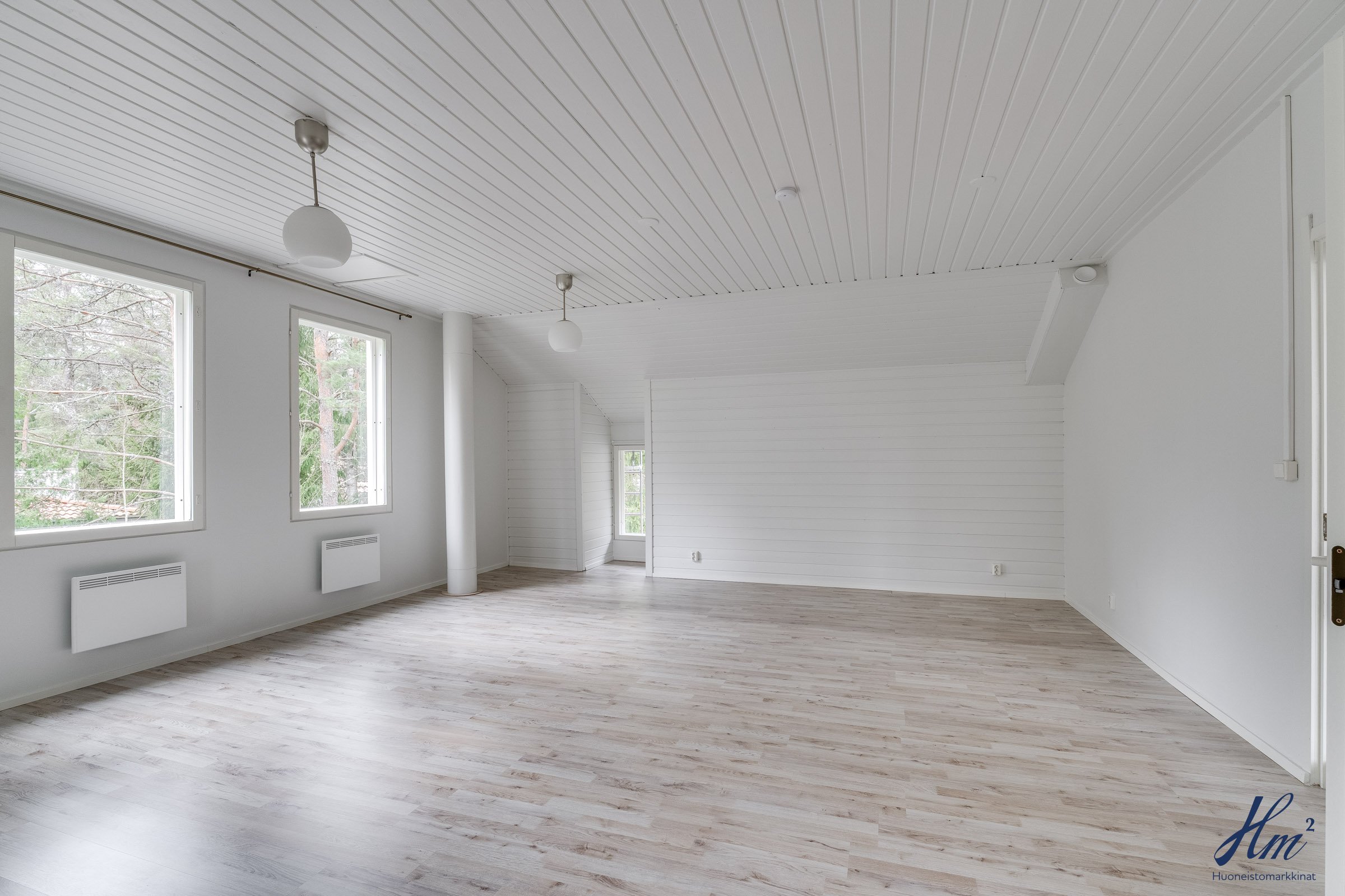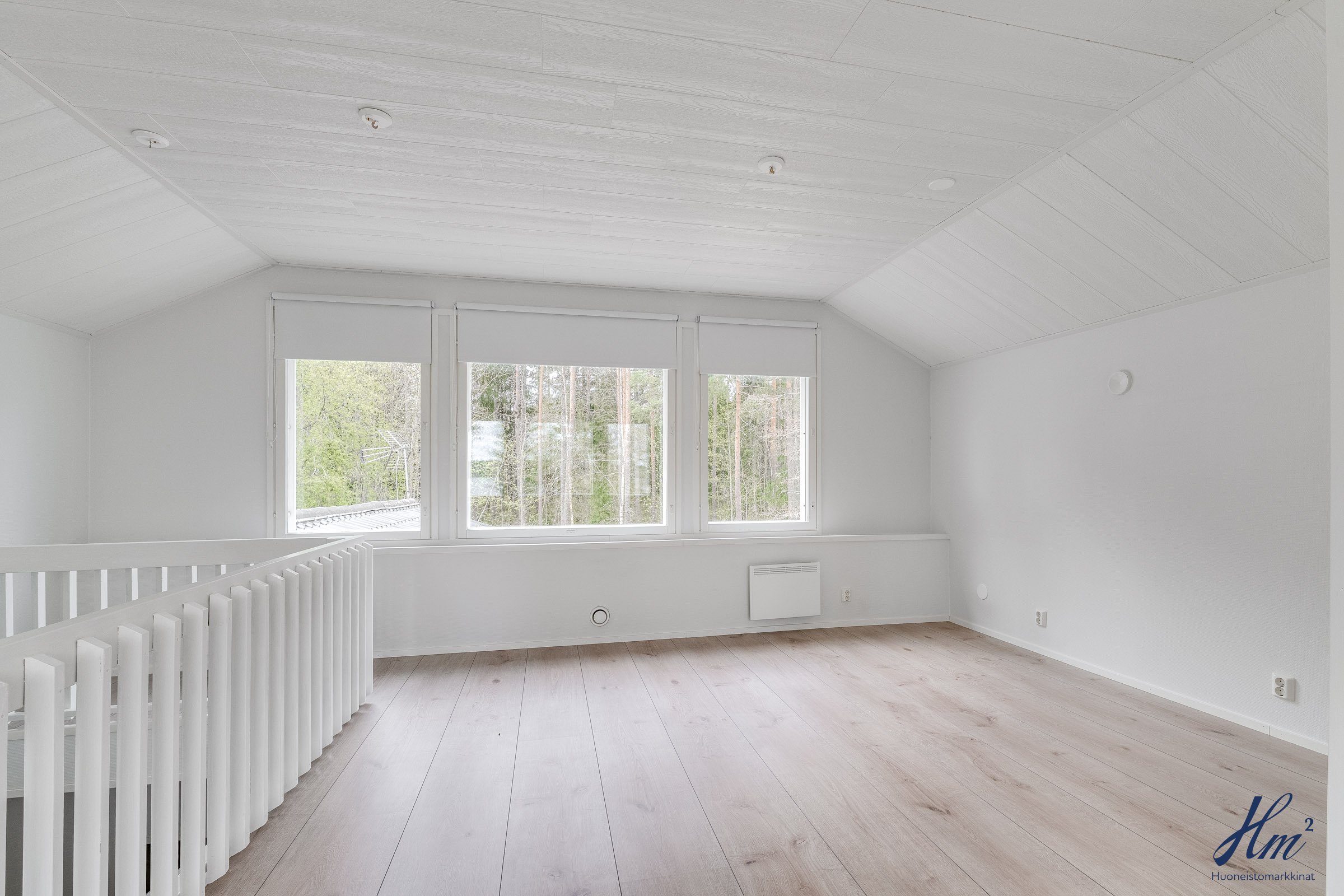 Yläkerrasta löytyy lisää oleskelutilaa sekä kaksi makuuhuoneista. Talon alakerrasta löytyy runsaasti varastotilaa sekä tilava autotalli noin 60 m².