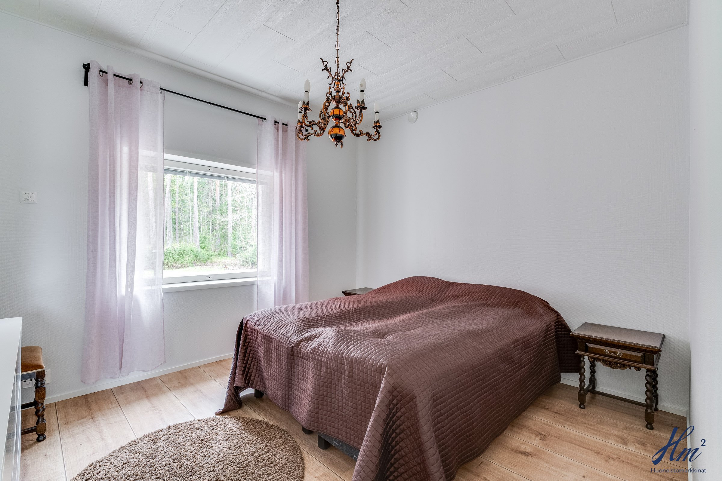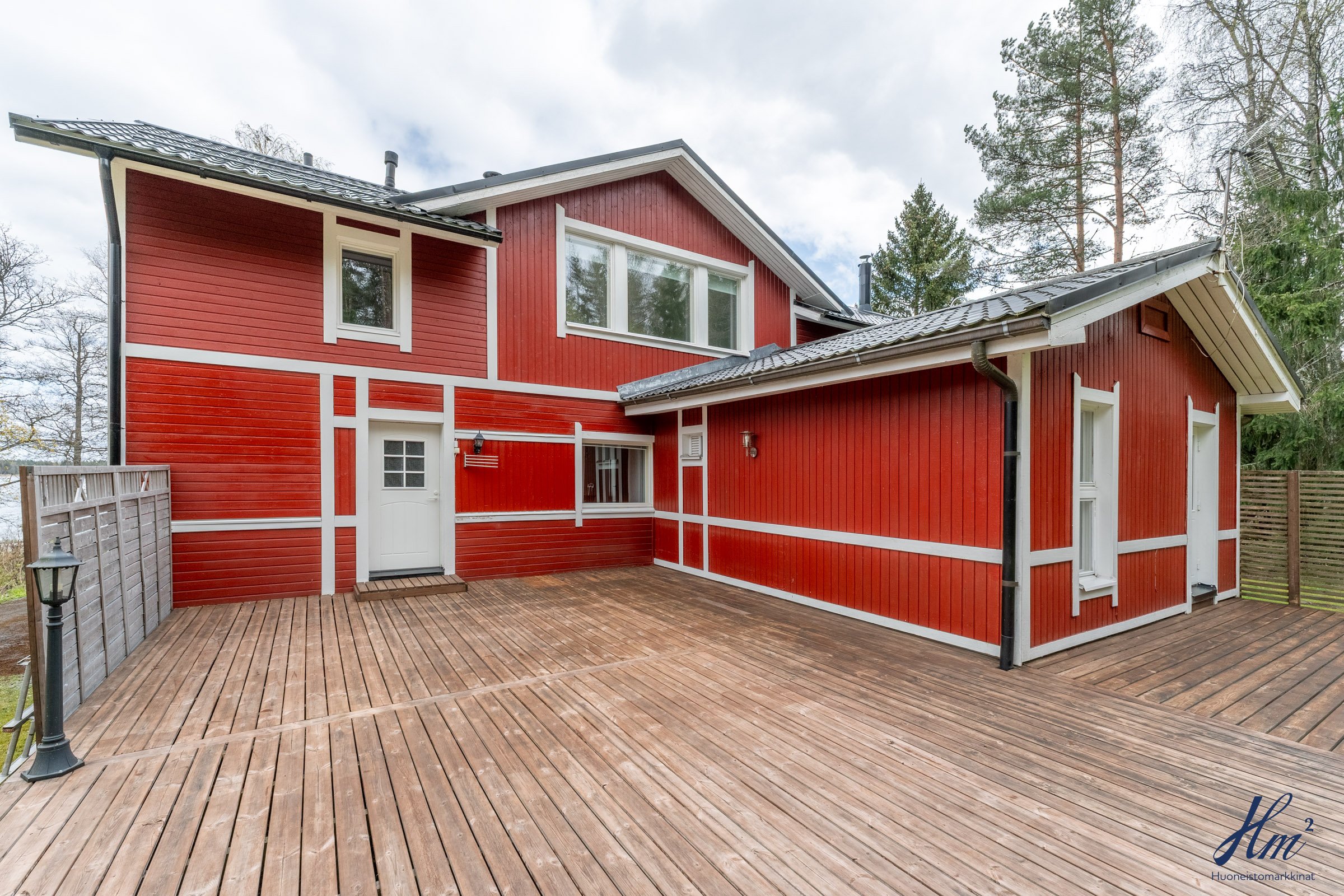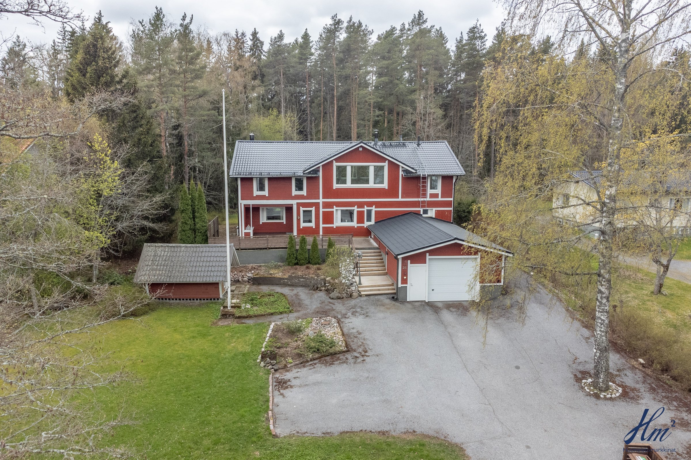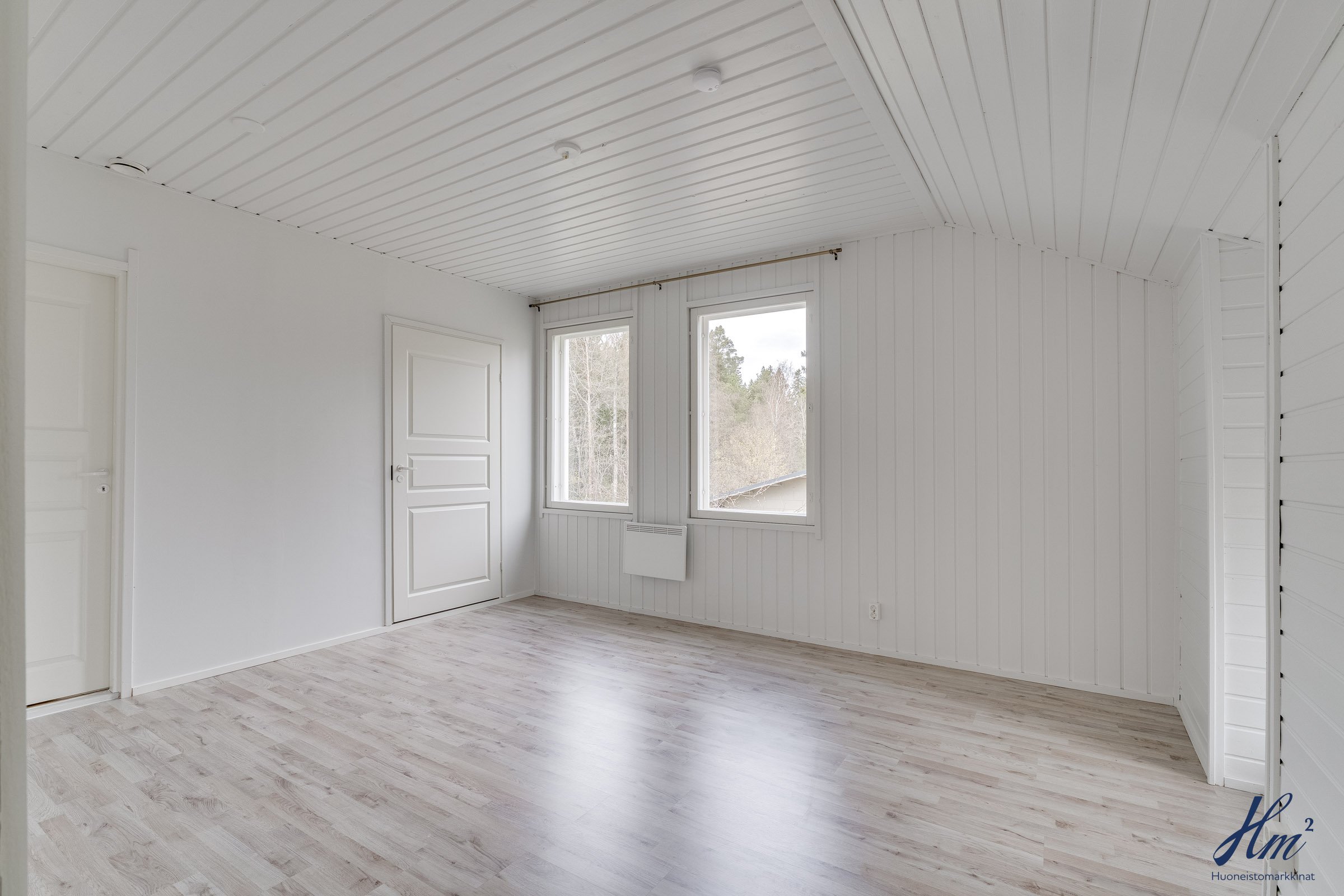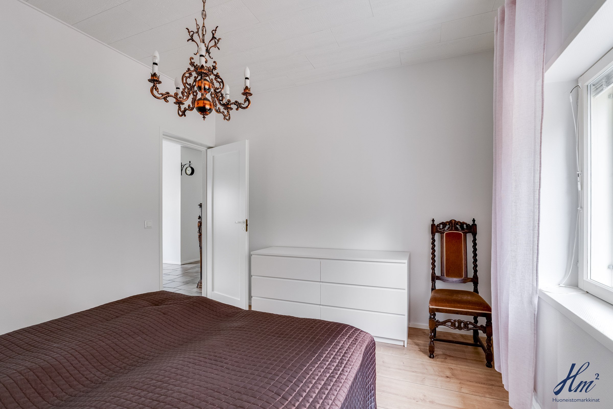 Yläkerrasta löytyy lisää oleskelutilaa sekä kaksi makuuhuoneista. Talon alakerrasta löytyy runsaasti varastotilaa sekä tilava autotalli noin 60 m².