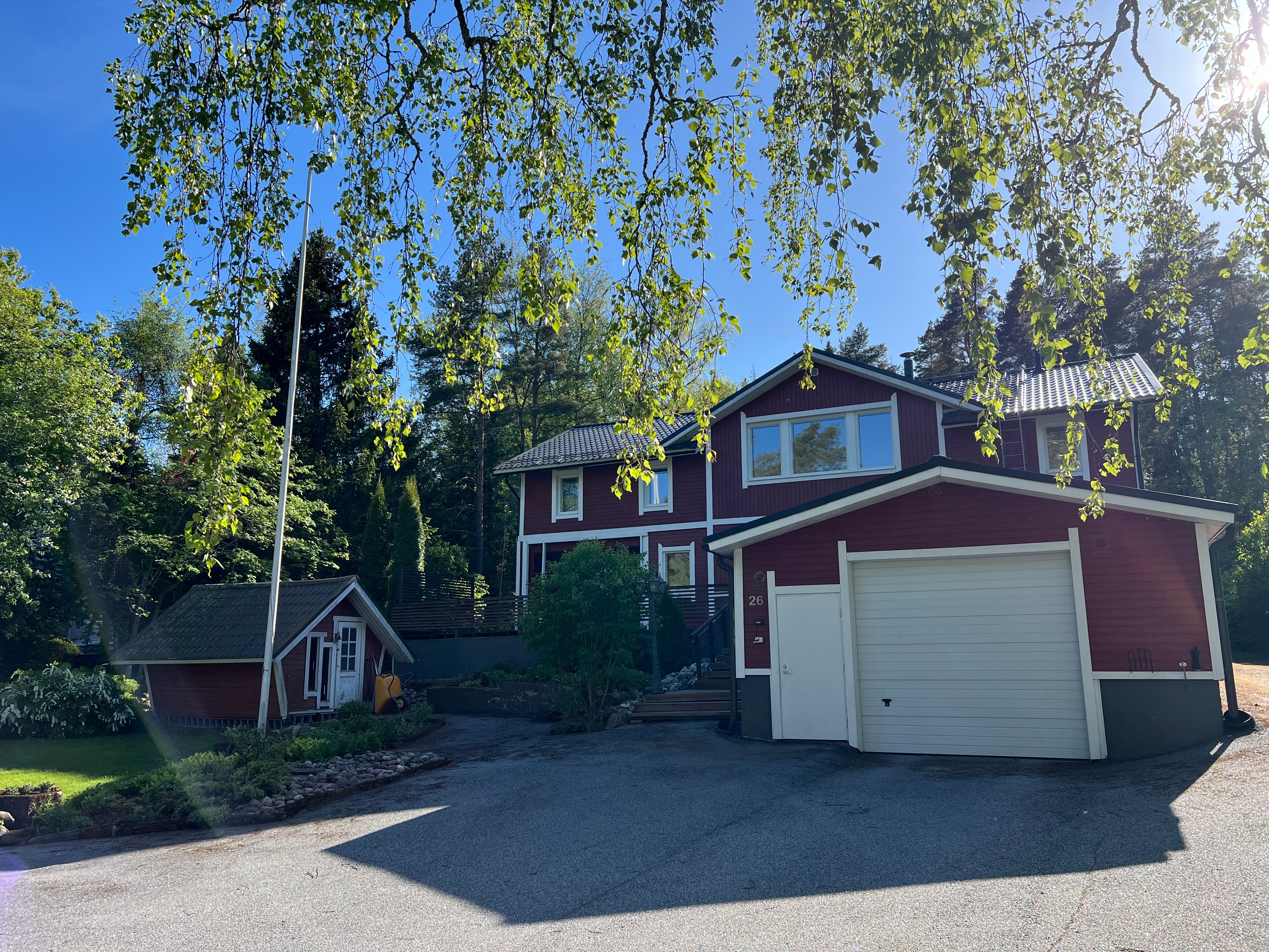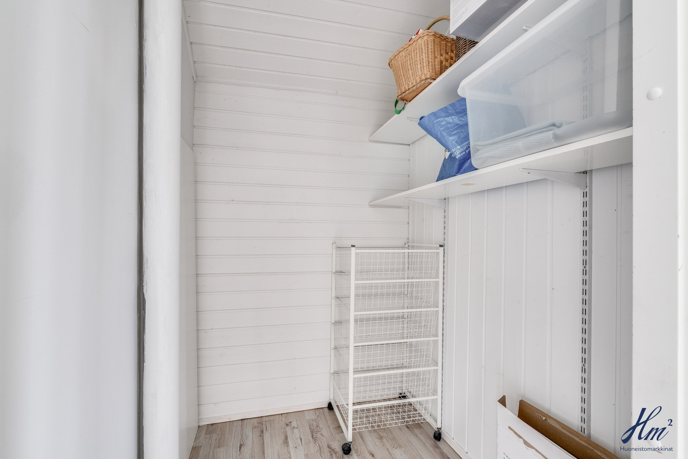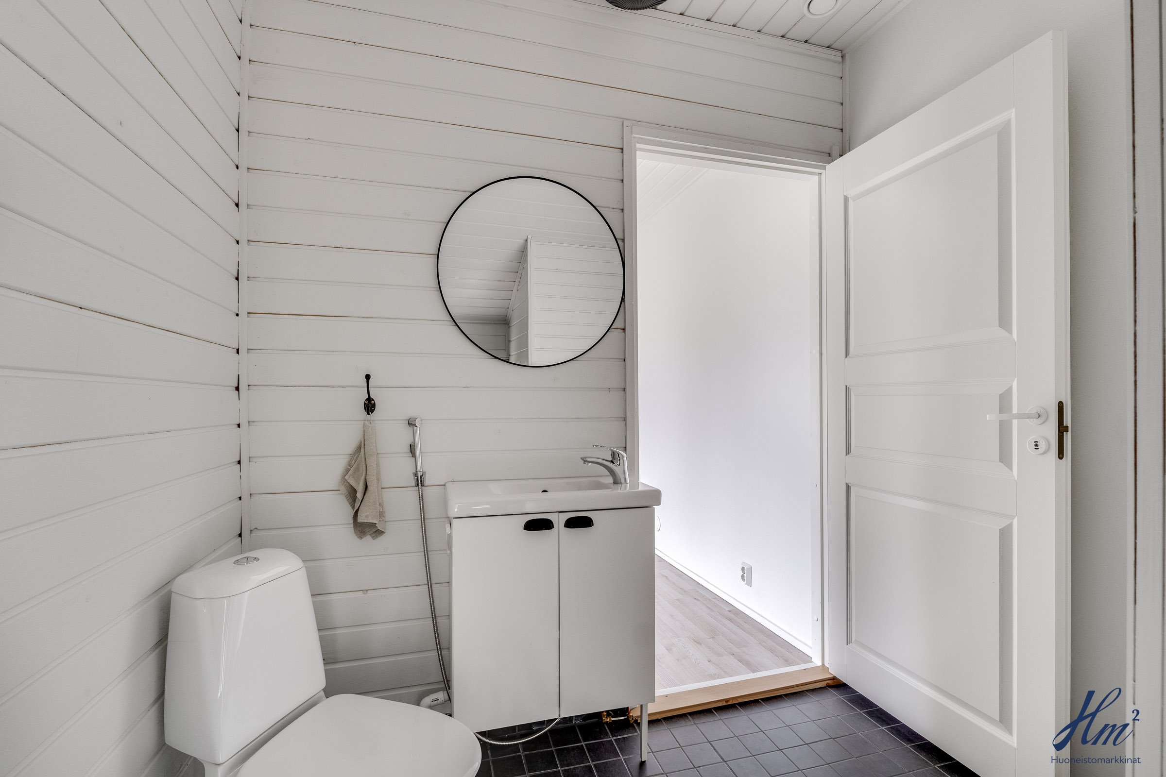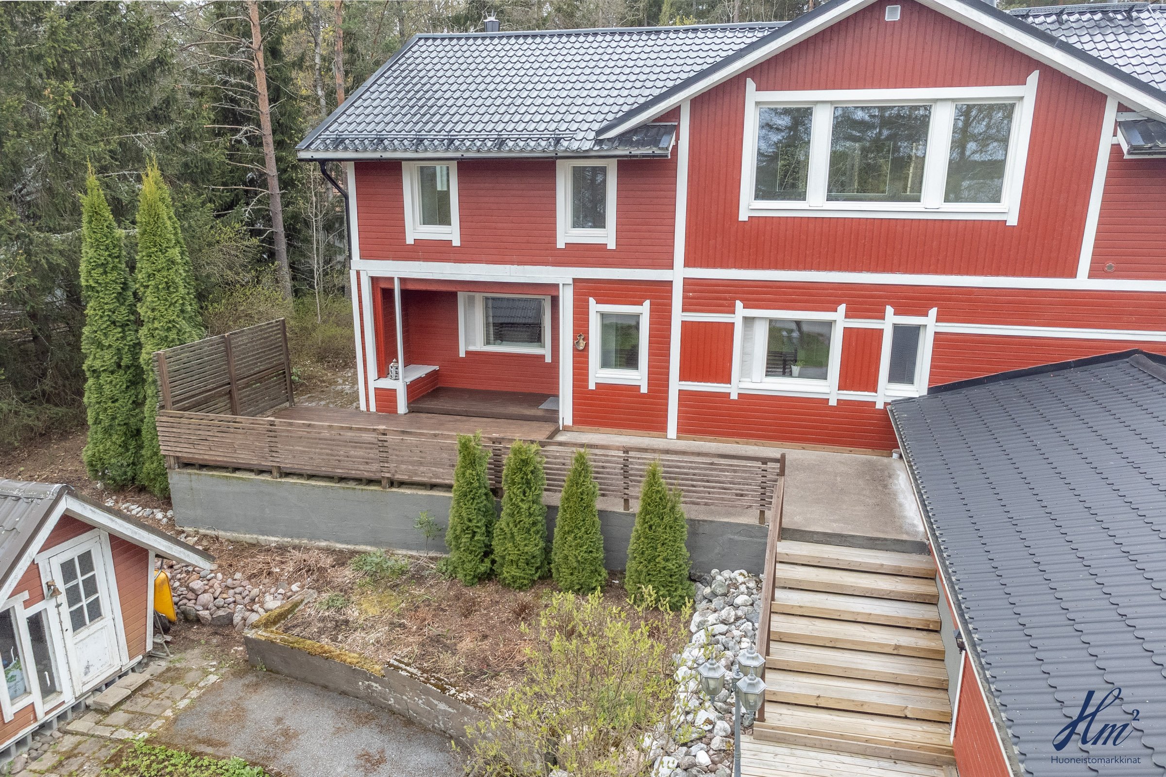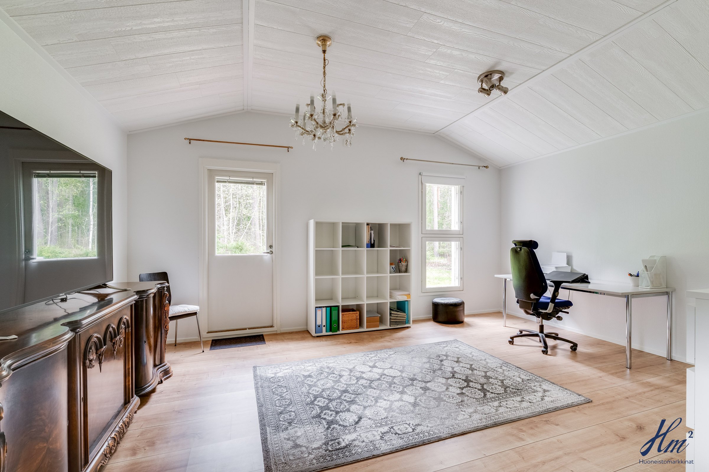 Yläkerrasta löytyy lisää oleskelutilaa sekä kaksi makuuhuoneista. Talon alakerrasta löytyy runsaasti varastotilaa sekä tilava autotalli noin 60 m².