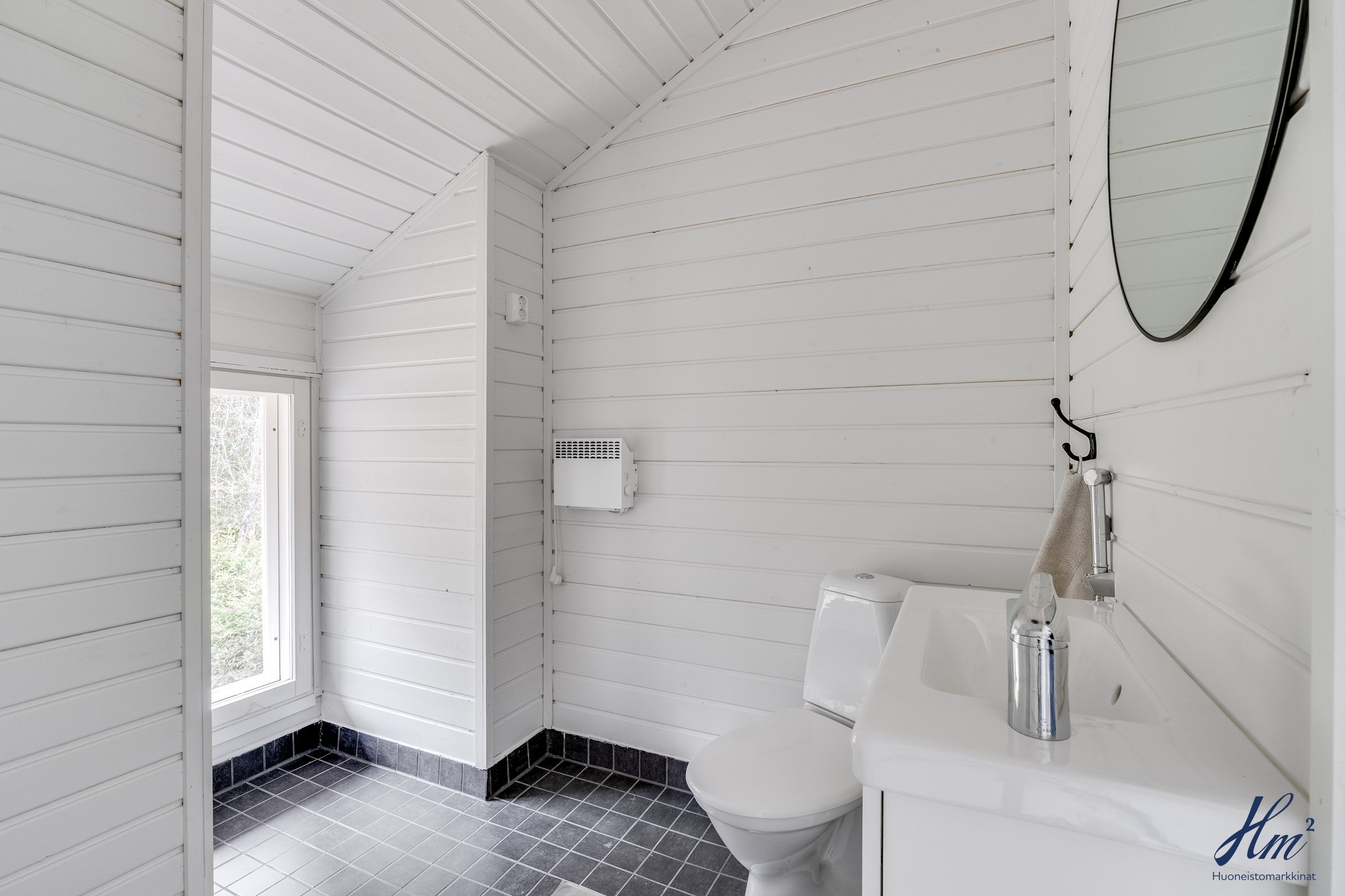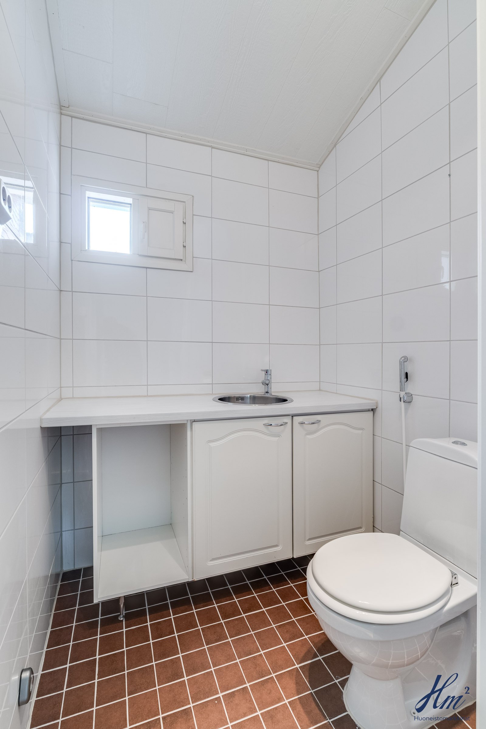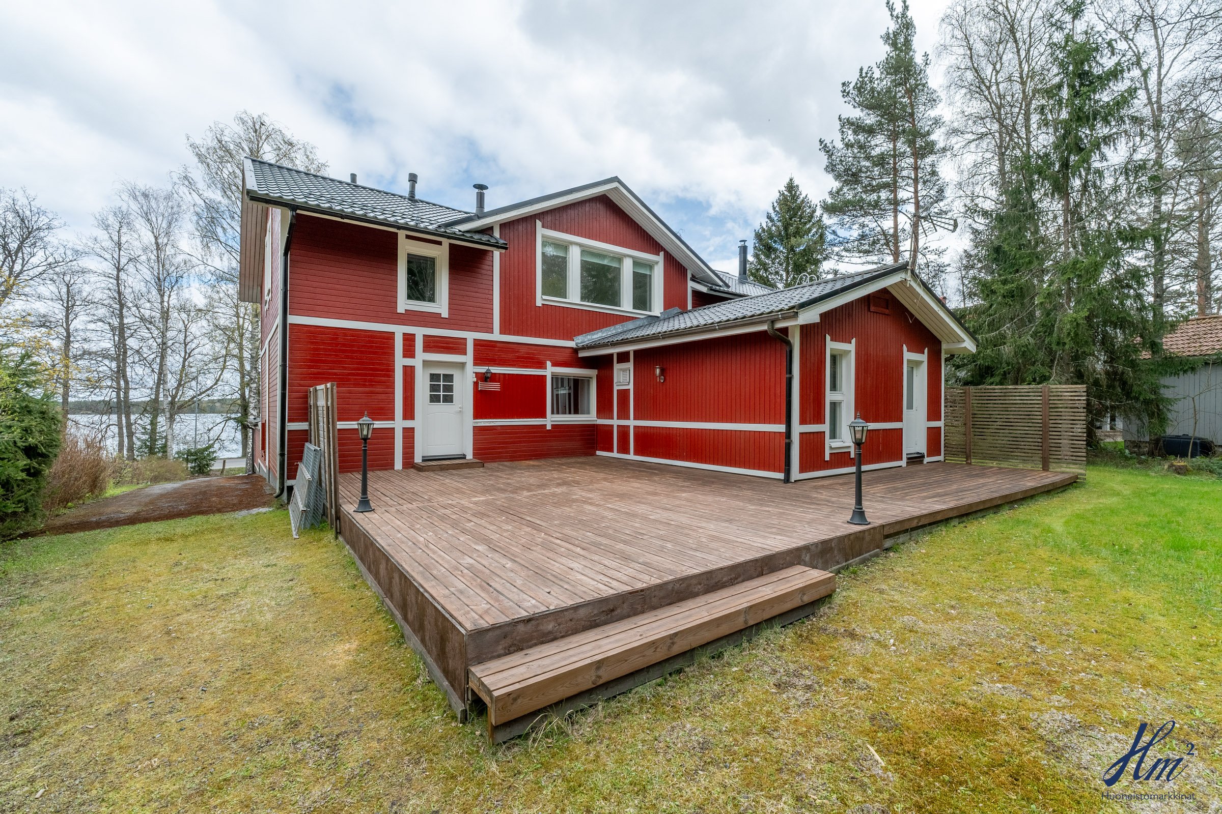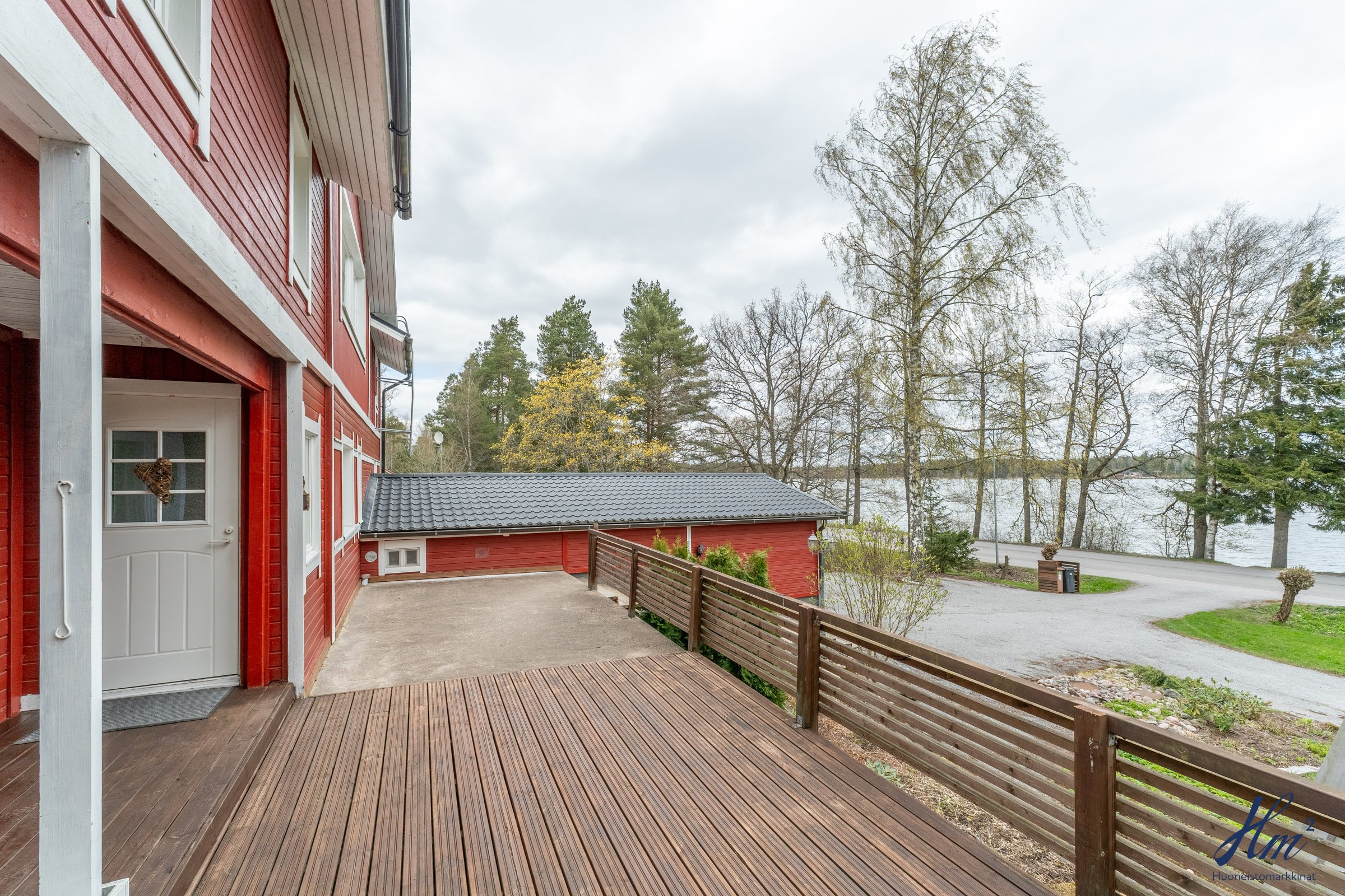 Yläkerrasta löytyy lisää oleskelutilaa sekä kaksi makuuhuoneista. Talon alakerrasta löytyy runsaasti varastotilaa sekä tilava autotalli noin 60 m².
