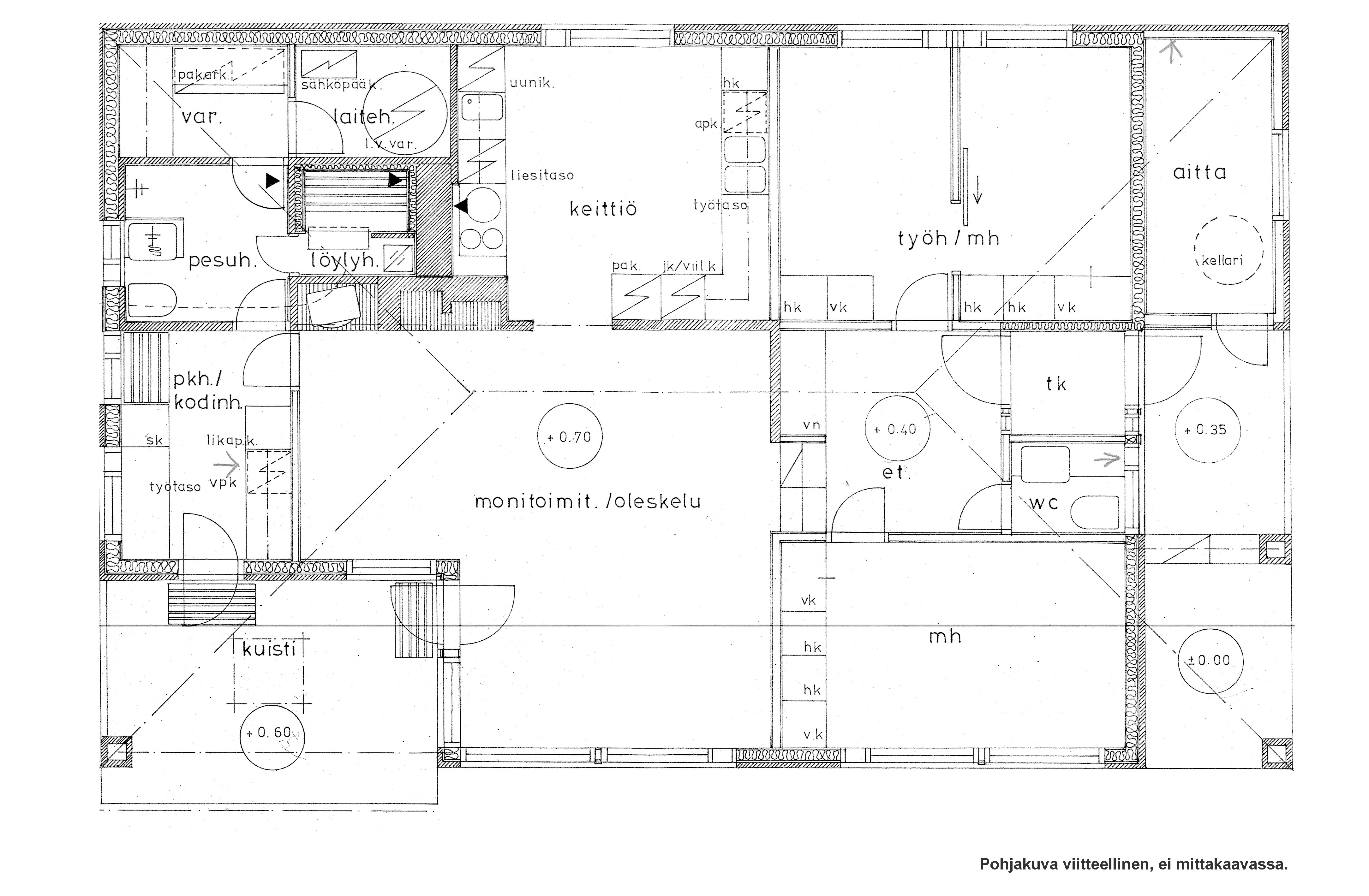 Talon tilaratkaisut ovat kompaktit ja muuntuvat monenlaiseen tarpeeseen. Kahden varsinaisen makuuhuoneen lisäksi löytyy esimerkiksi työhuone, tilava olohuone, kodinhoitohuone, kylpyhuone, sauna, erillinen wc, eteinen sekä useita varastotiloja. Lisäksi käytössä on kahden auton autotalli ja tekninen tila.