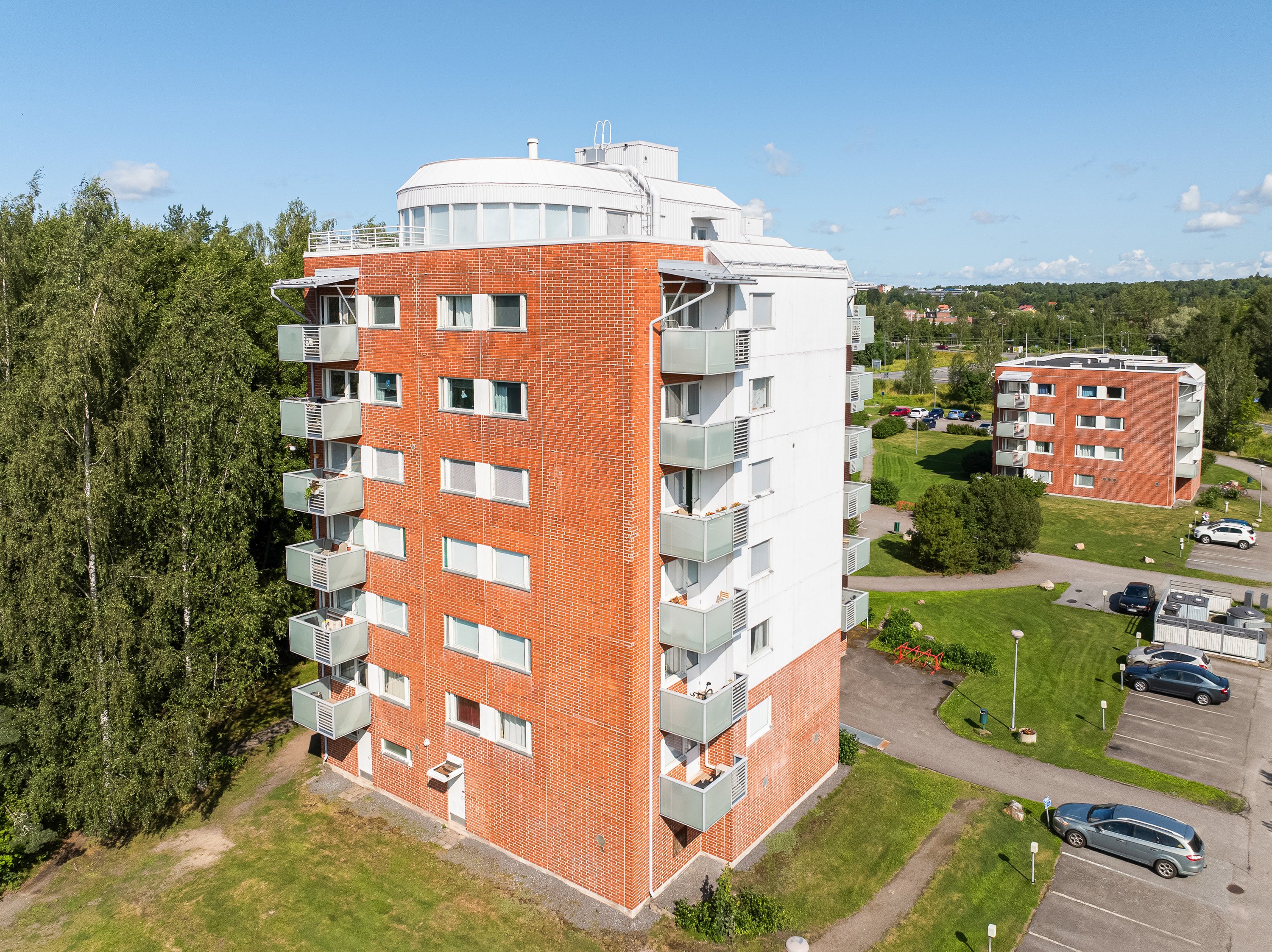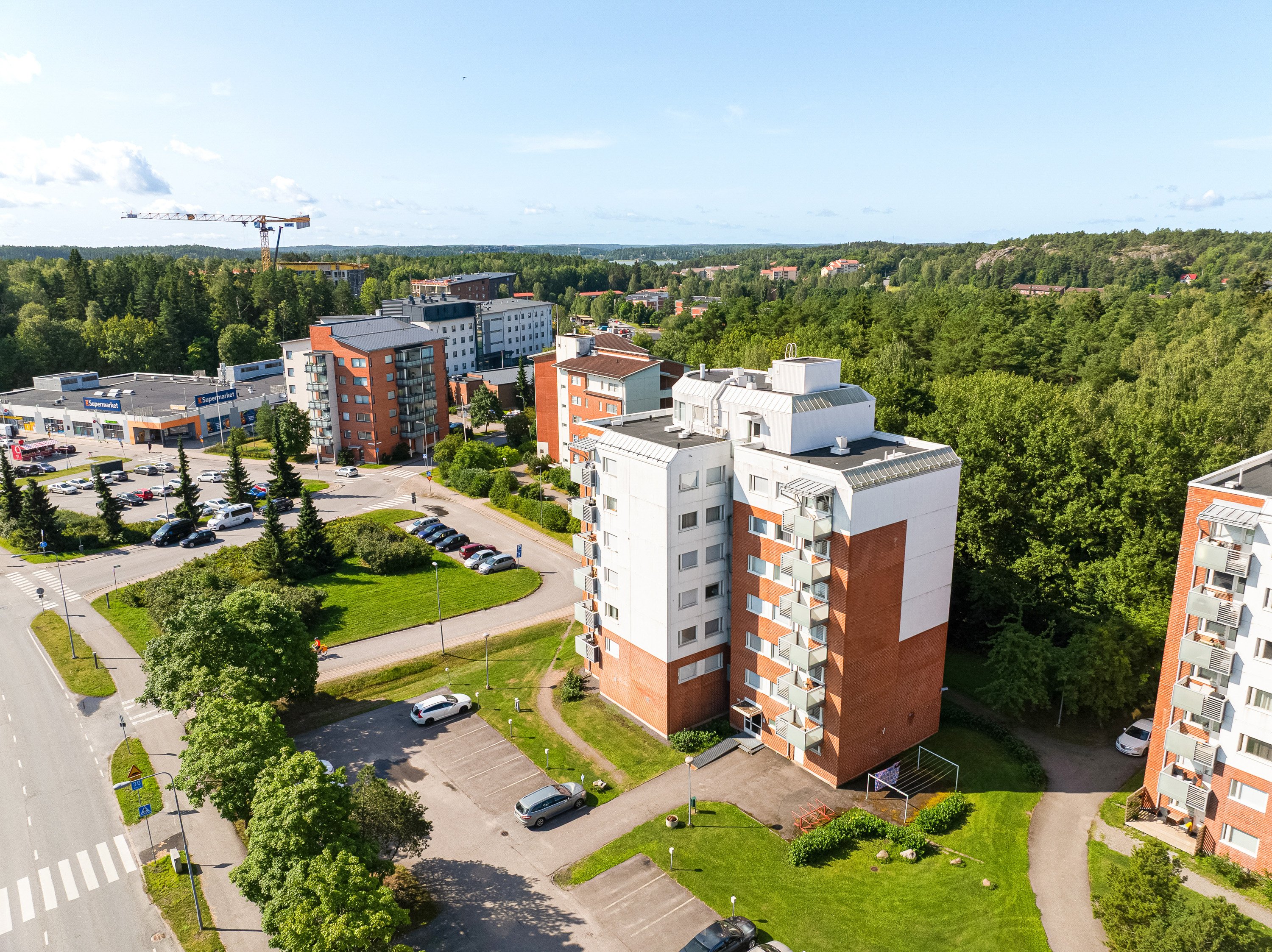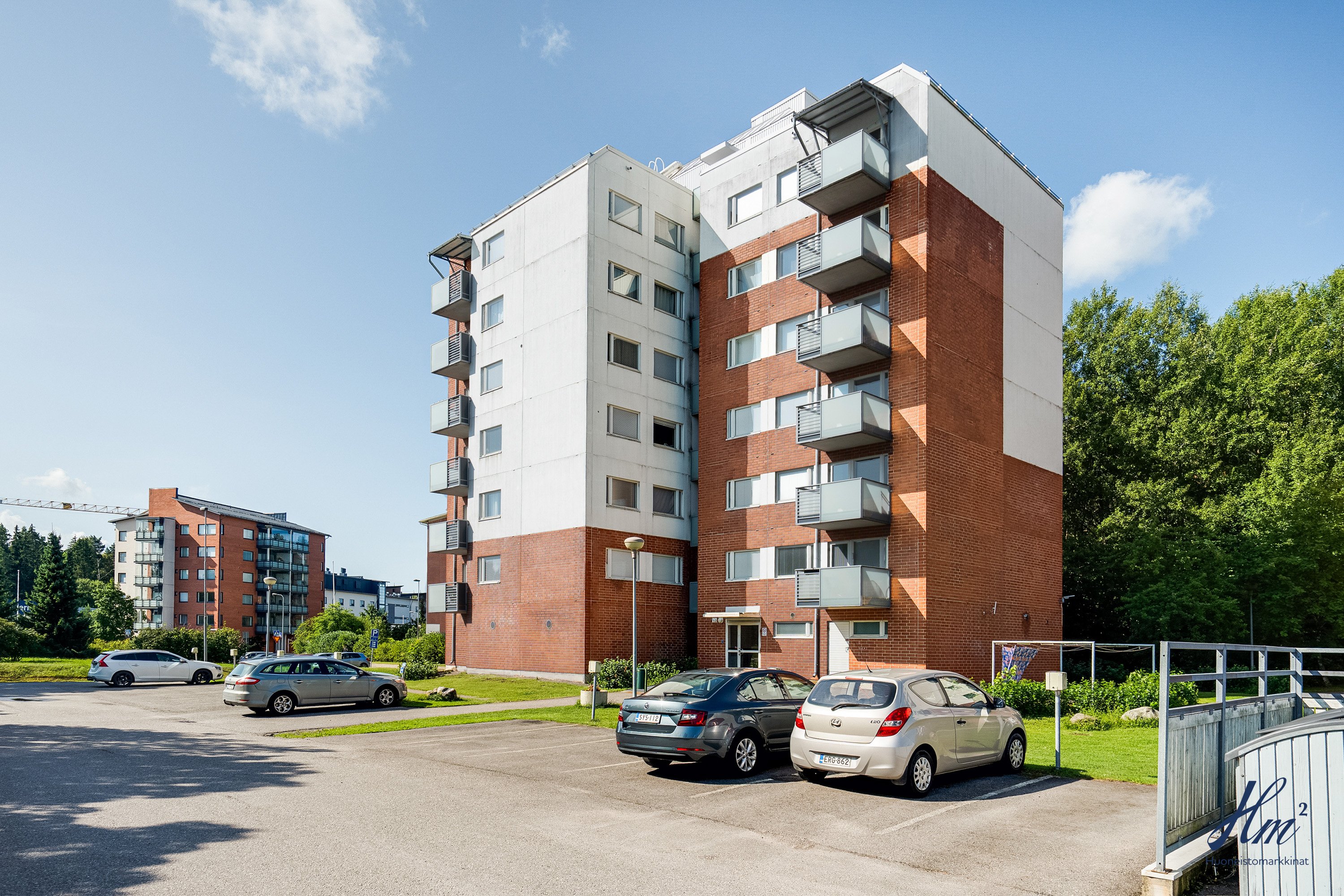 Tämä kerrostaloasunto sijaitsee rauhallisella alueella, jossa arki sujuu vaivattomasti. Lähin kauppa löytyy aivan tien toiselta puolelta, ja myös sujuvat julkiset yhteydet löytyvät läheltä.