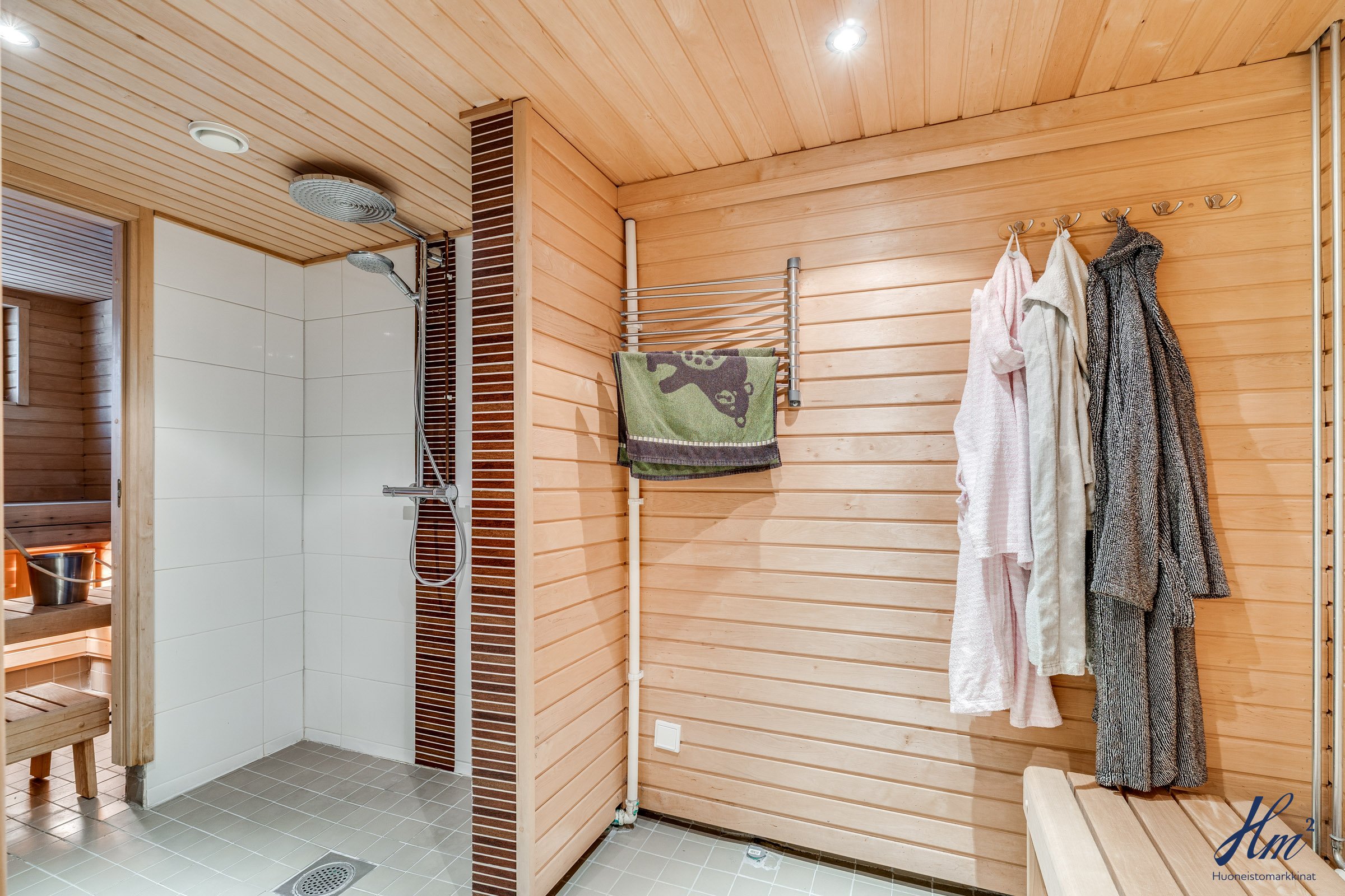 Itse talossa on selkeä ja toimiva kolmen kerroksen pohjaratkaisu. Yläkerrassa sijaitsee kolme makuuhuonetta, kaksi vaatehuonetta sekä wc/kylpyhuone, jotka tarjoavat sujuvat puitteet perheen arkeen. Keskikerros on kodin sydän, jossa ruokailutila, keittiö ja tunnelmallinen olohuone takkoineen muodostavat viihtyisän kokonaisuuden. Lisäksi kerroksessa on wc, eteinen ja kuisti. Alakerrasta löytyvät kylpyhuone ja sauna, askartelutila, tekninen tila, wc sekä runsaasti varastotilaa.