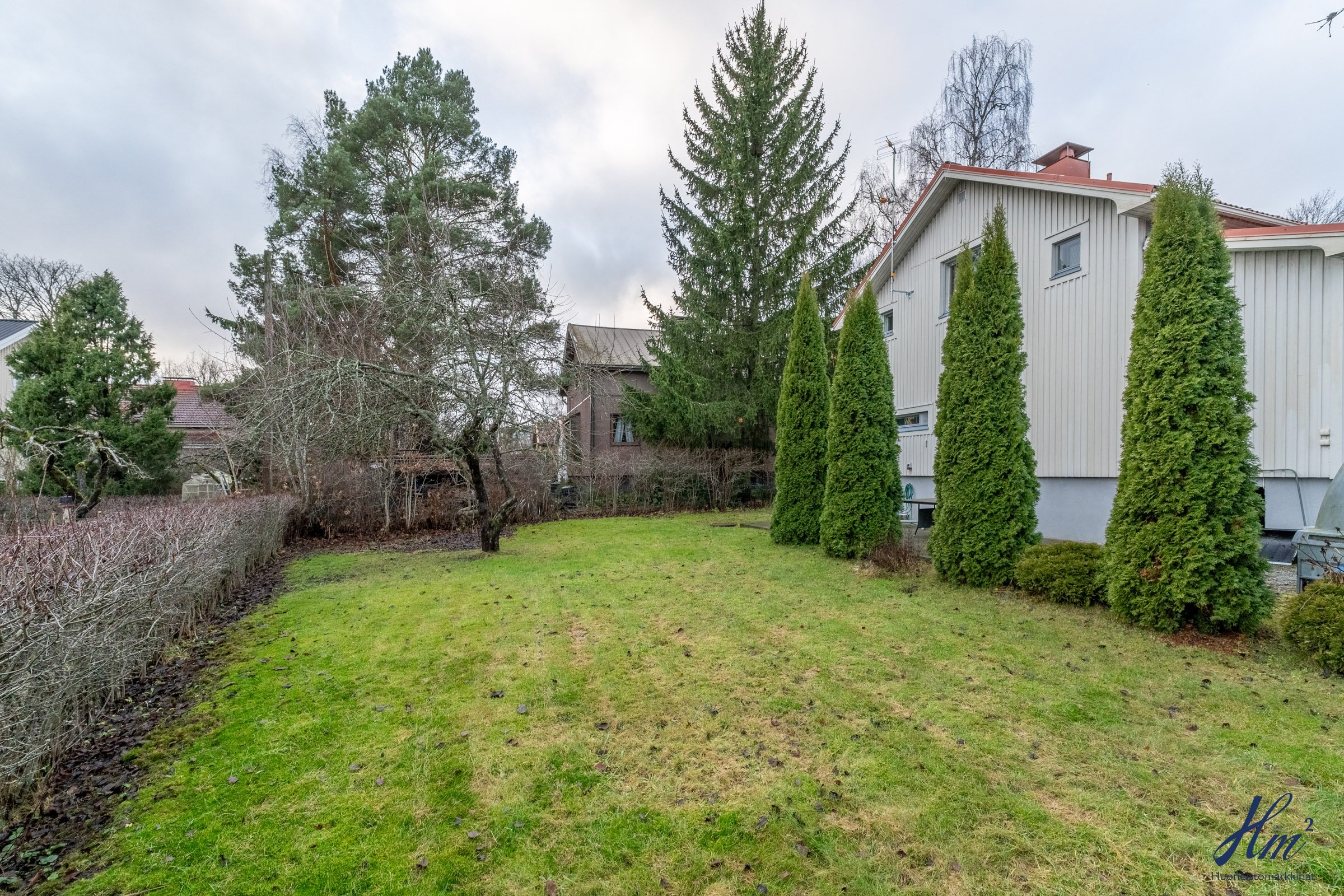 Piha tarjoaa tilaa niin oleskeluun kuin leikkiin – tänne mahtuu vaikka oma pelikenttä. Lisäksi pihalla on kolme runsaasti satoa tuottavaa vanhaa omenapuuta. Autoja pihaan mahtuu myös vähintään kaksi, mikä on alueen tonteilla harvinaista.