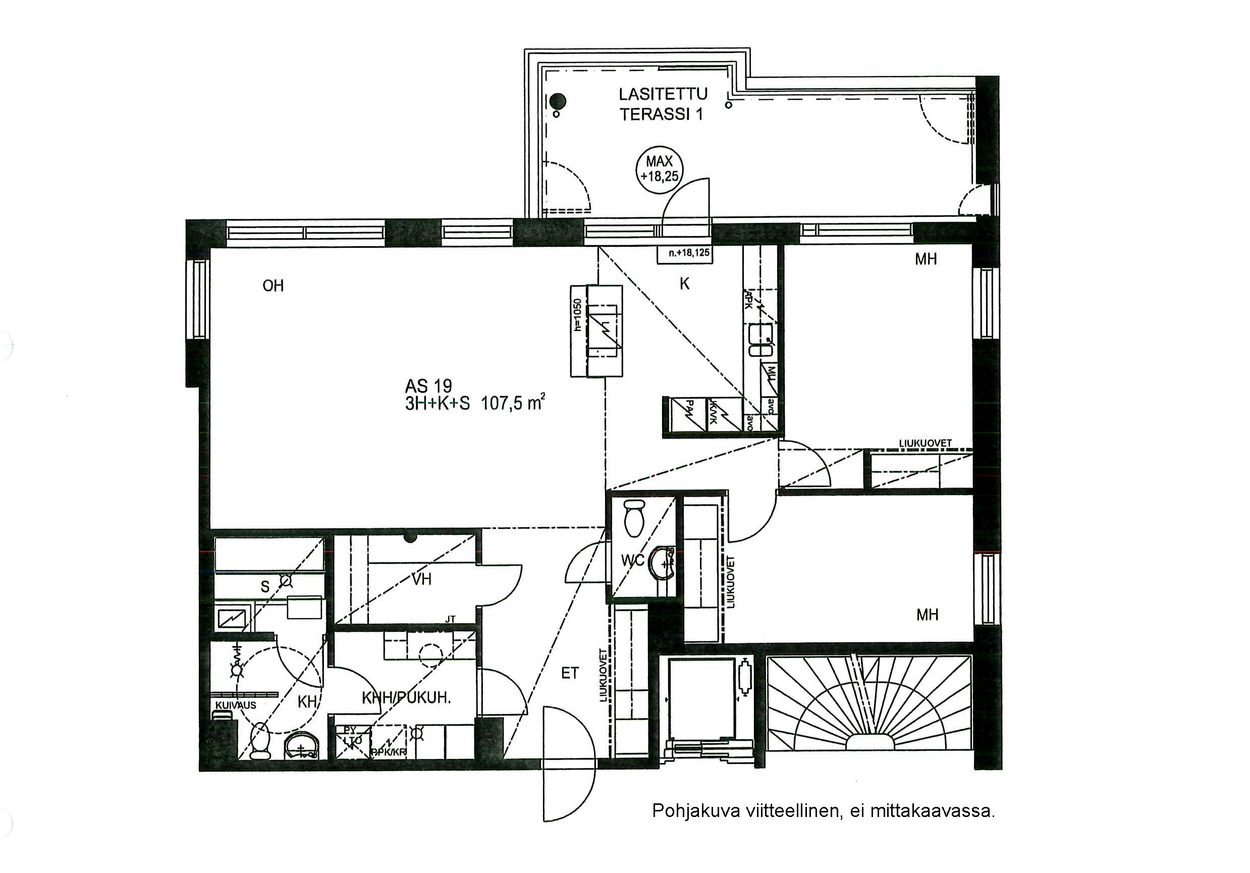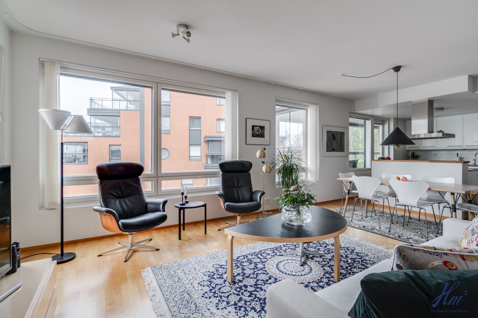 Sisätiloissa korostuu avaruus ja valoisuus. Huoneiston viilennysjärjestelmä huolehtii asunnon viileydestä myös hellepäivinä. Olohuoneen ja keittiön muodostama avoin tila luo yhteisöllisen tunnelman, joka on ihanteellinen niin arjen askareisiin kuin viihdyttämiseenkin. Kodin kruunaa oma sauna, jossa voit rentoutua päivän päätteeksi. Lisäksi huoneistossa on kodinhoitohuone, joka helpottaa arjen pyörittämistä sekä erillinen wc.