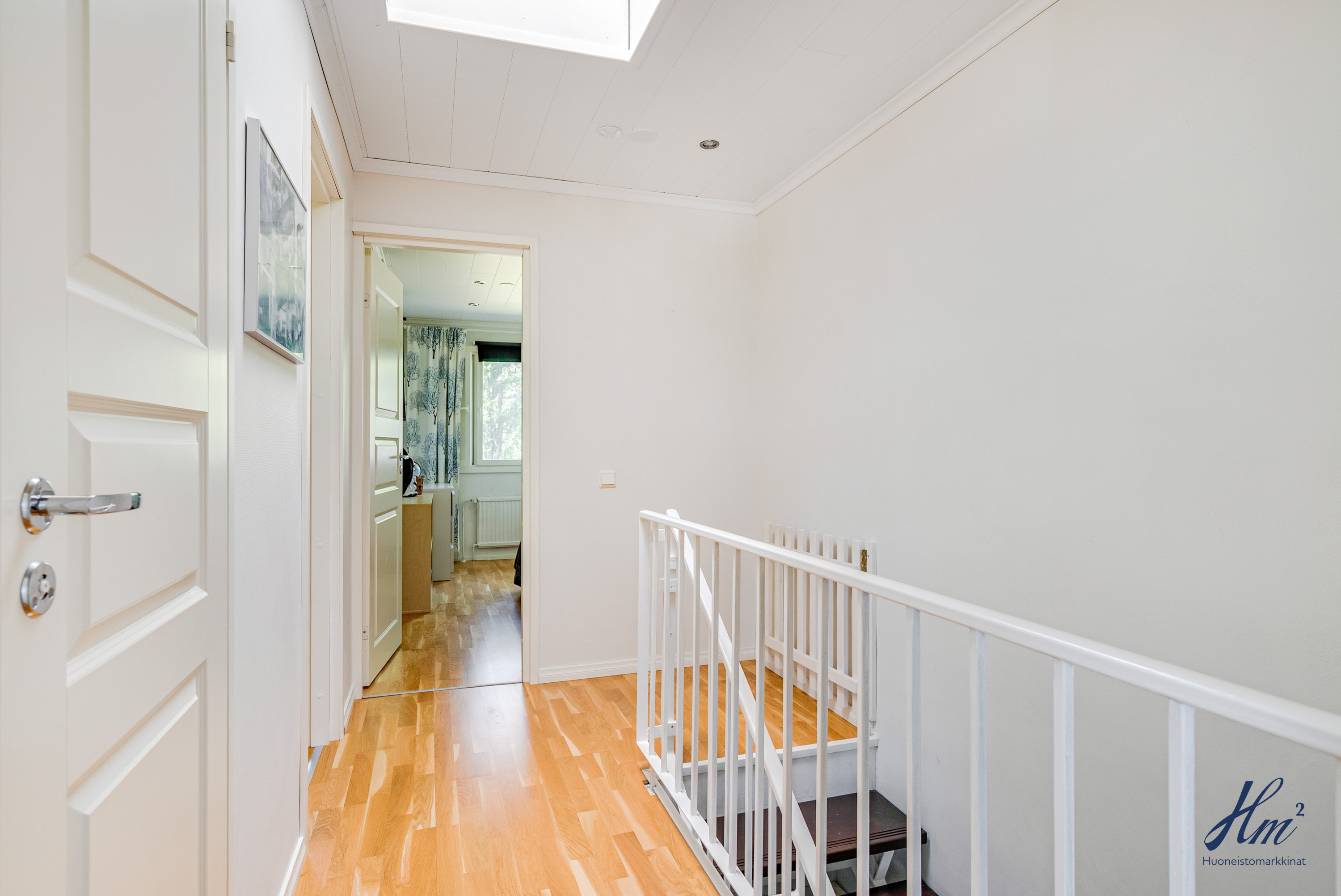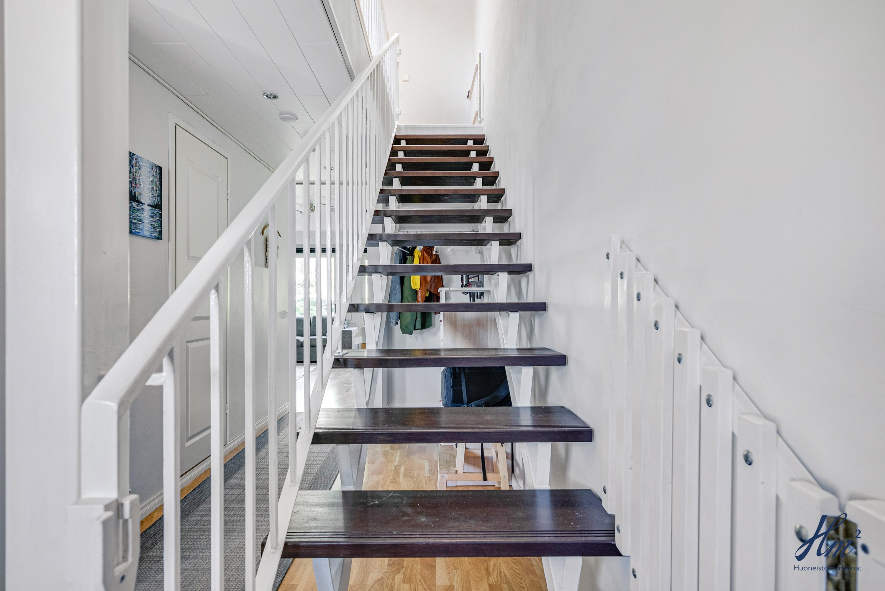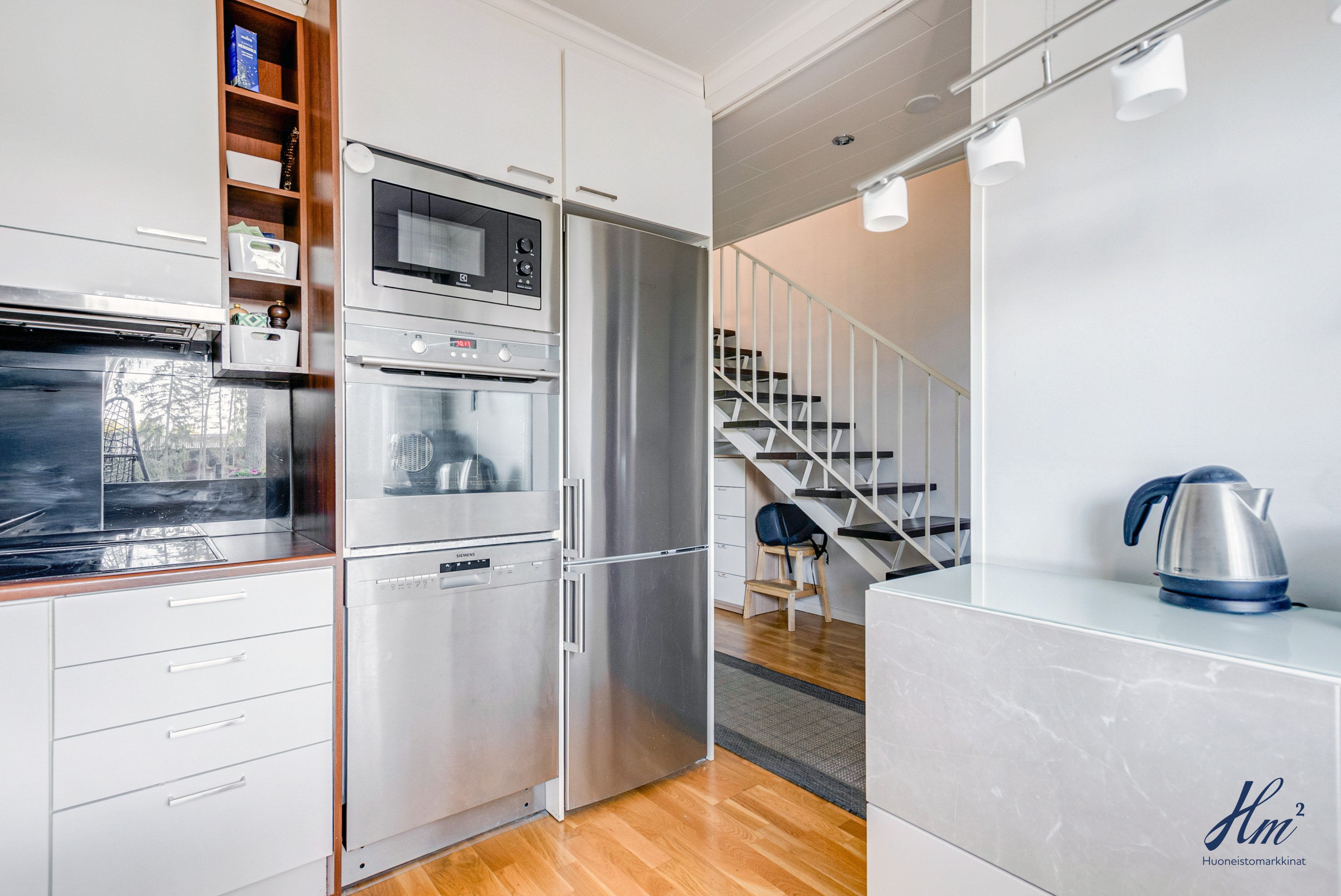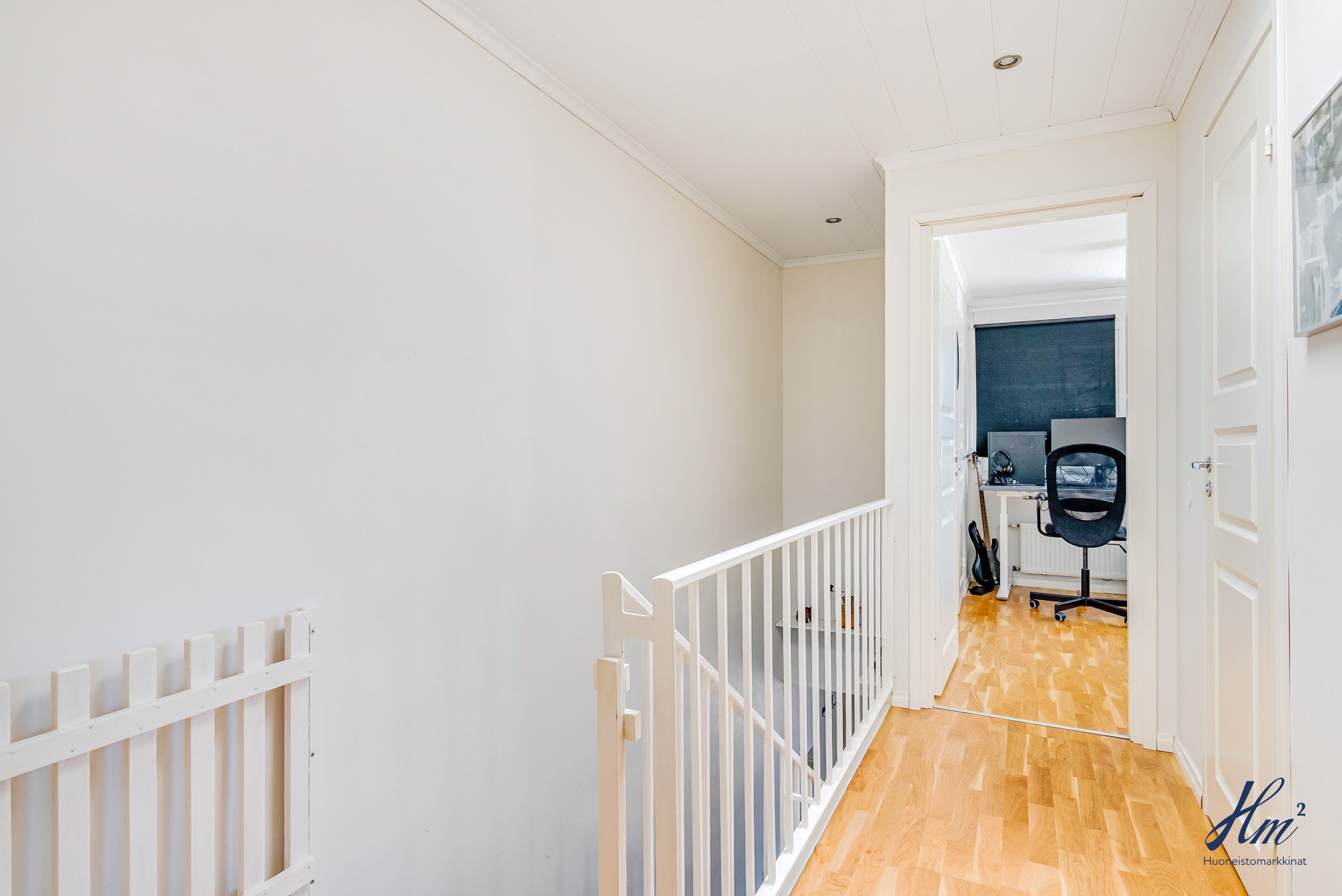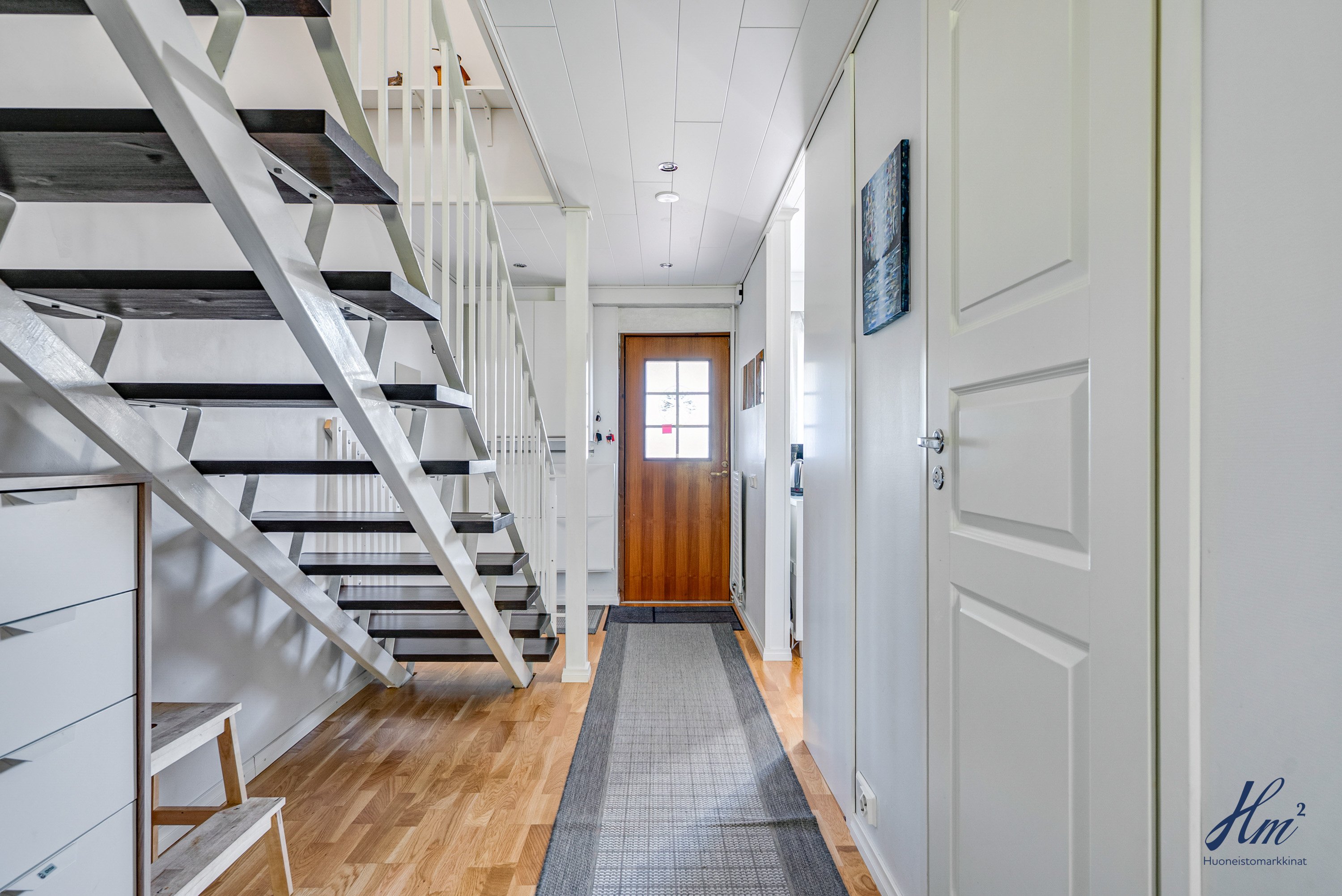 Alakerrasta löytyvät keittiö, kylpyhuone, wc ja sauna sekä viihtyisä olohuone, josta on käynti suojaisalle takapihan terassille. Yläkerrassa sijaitsevat kolme makuuhuonetta, toinen wc sekä runsaasti säilytystilaa käytännöllisissä vaatehuoneissa.
