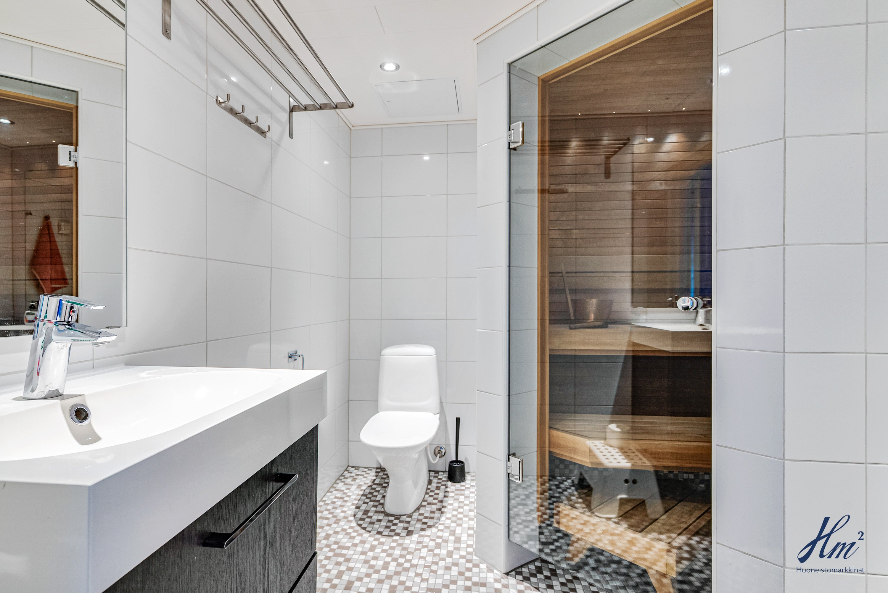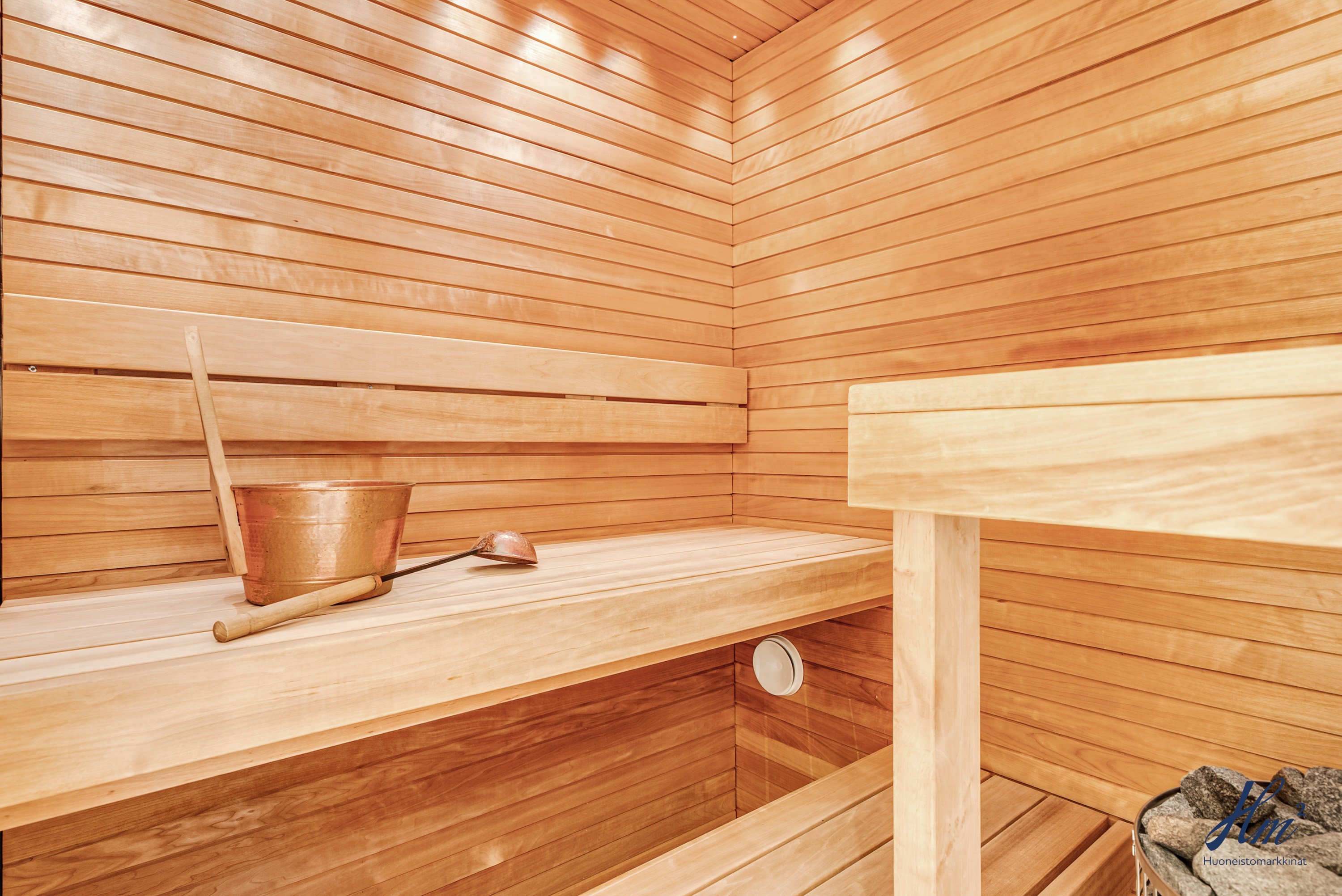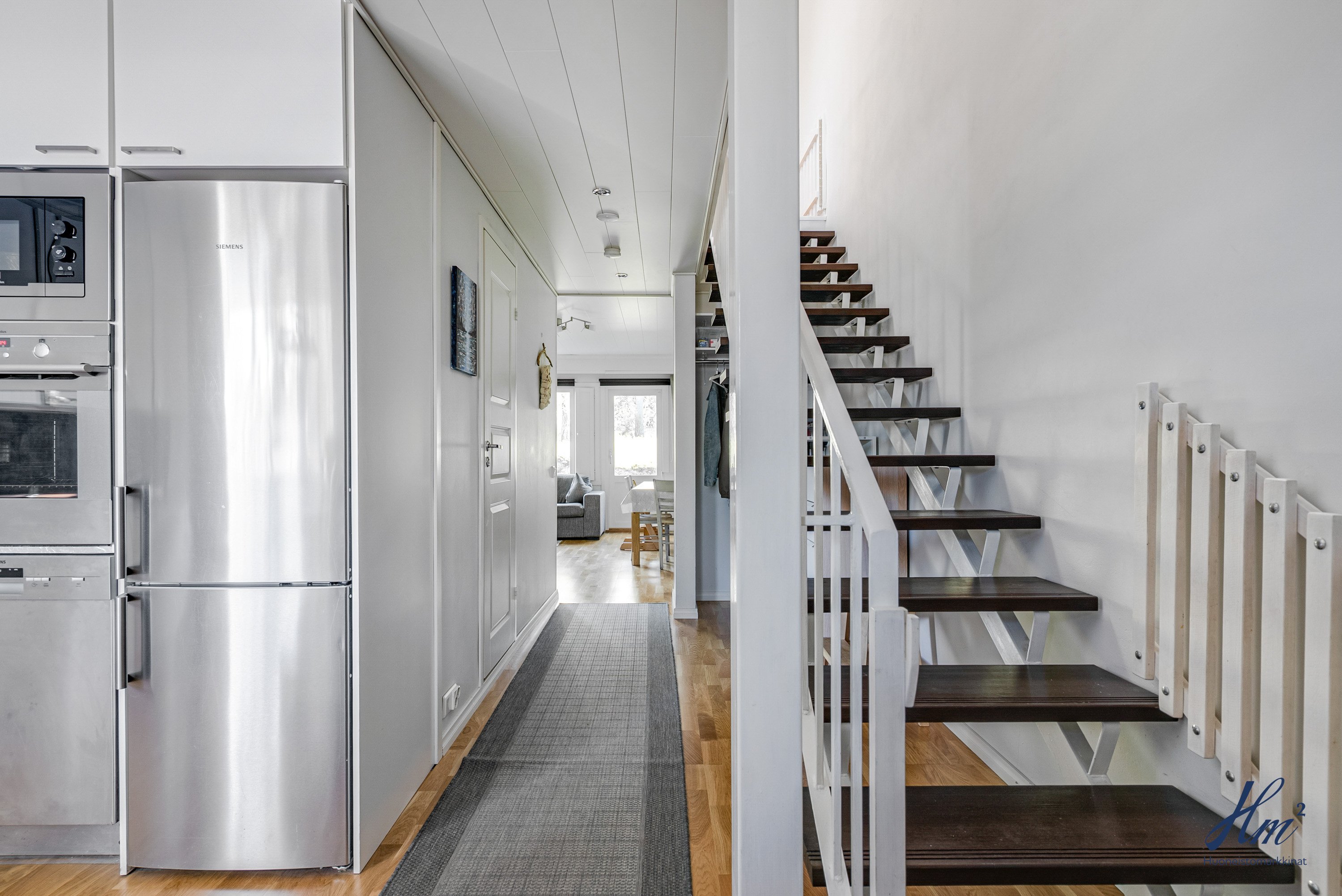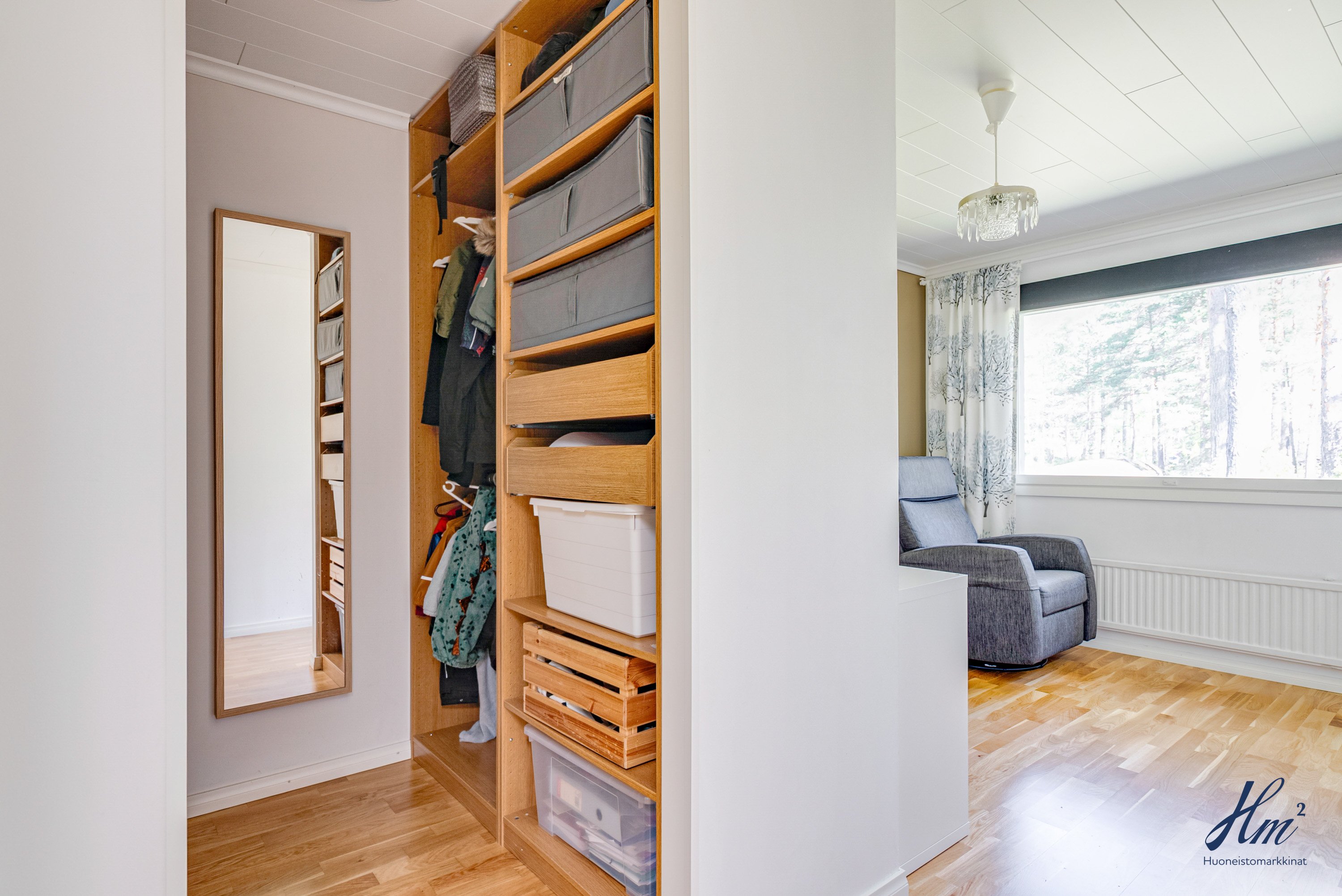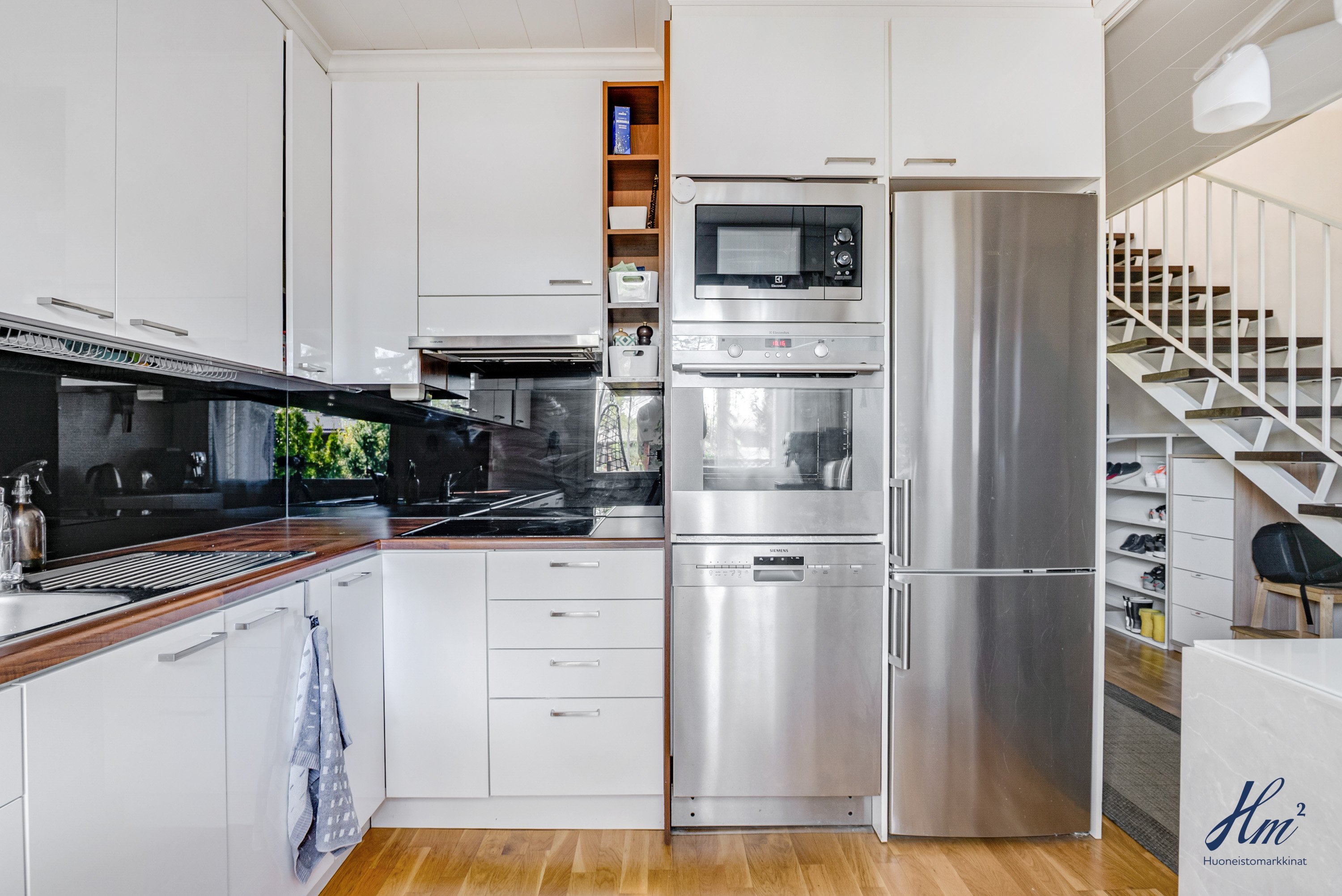 Alakerrasta löytyvät keittiö, kylpyhuone, wc ja sauna sekä viihtyisä olohuone, josta on käynti suojaisalle takapihan terassille. Yläkerrassa sijaitsevat kolme makuuhuonetta, toinen wc sekä runsaasti säilytystilaa käytännöllisissä vaatehuoneissa.