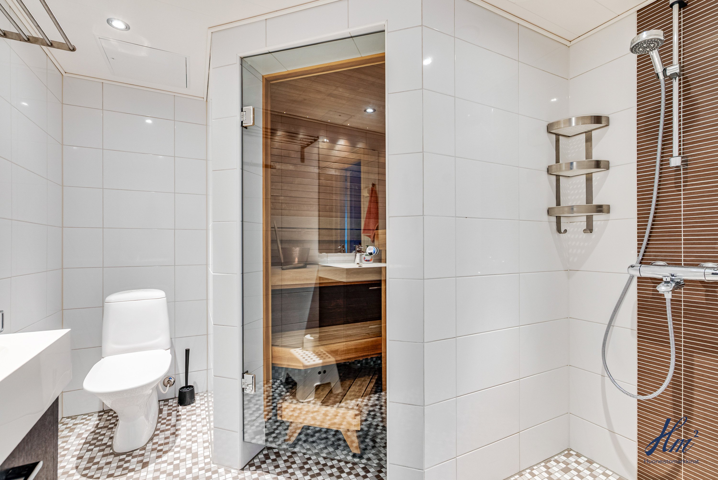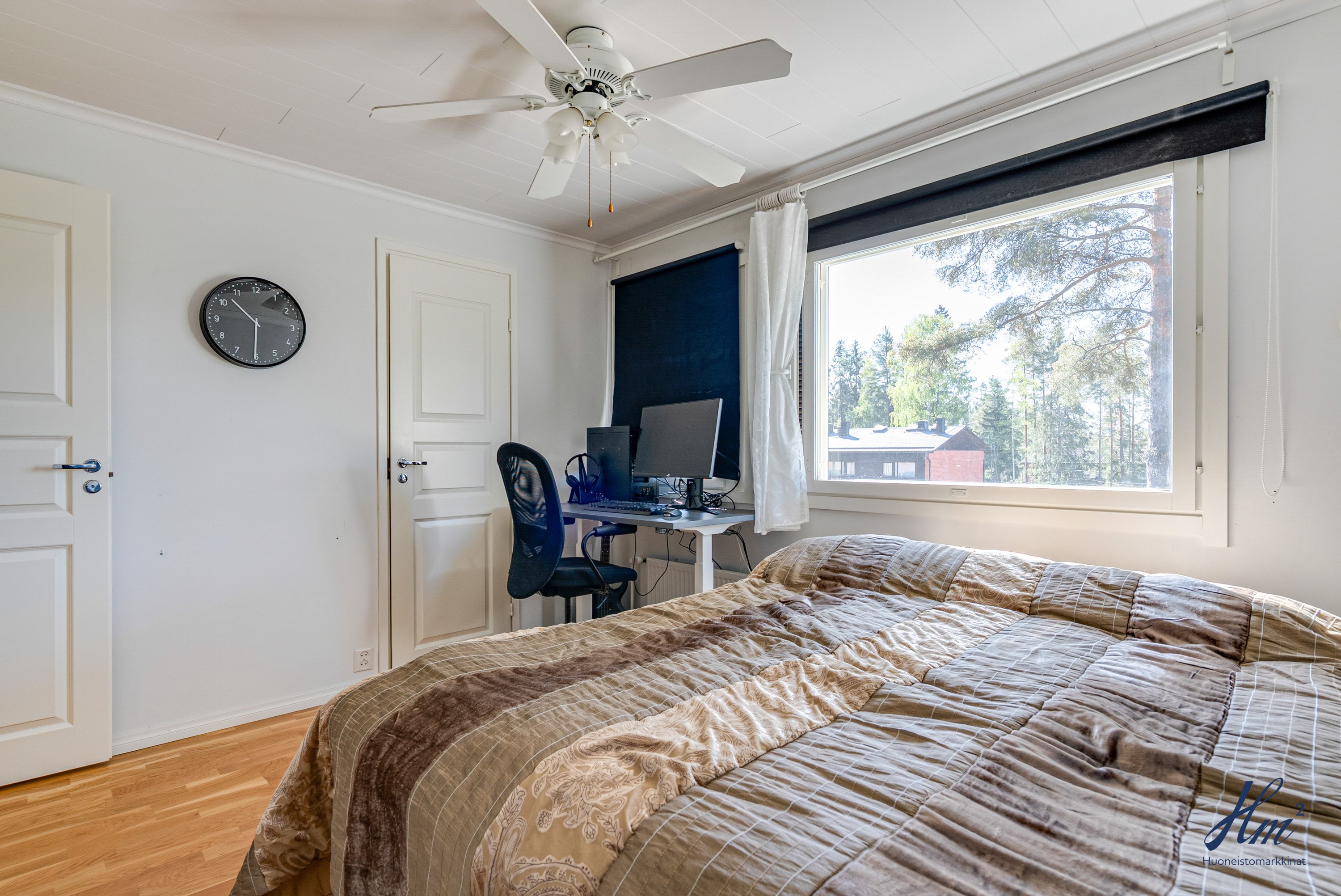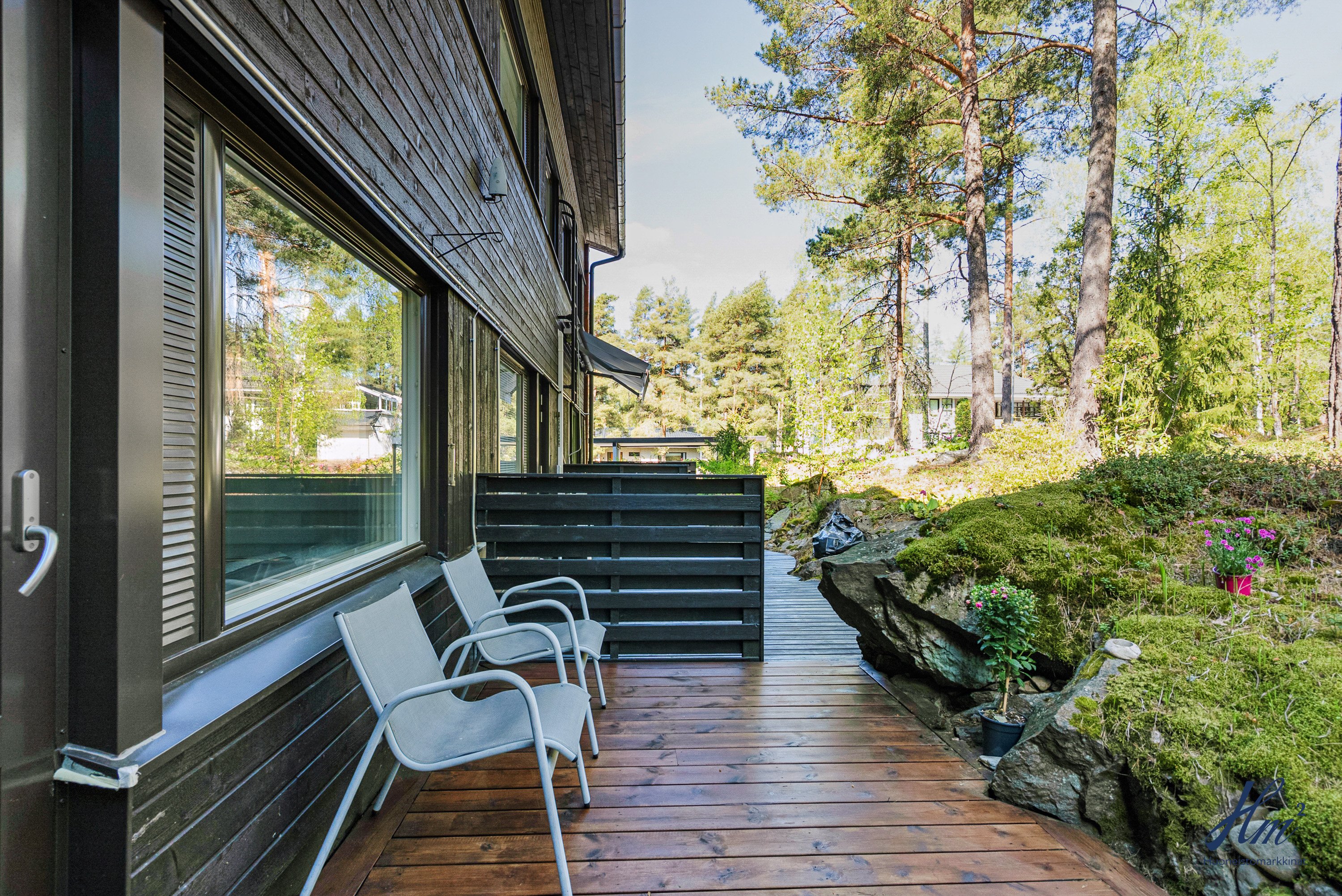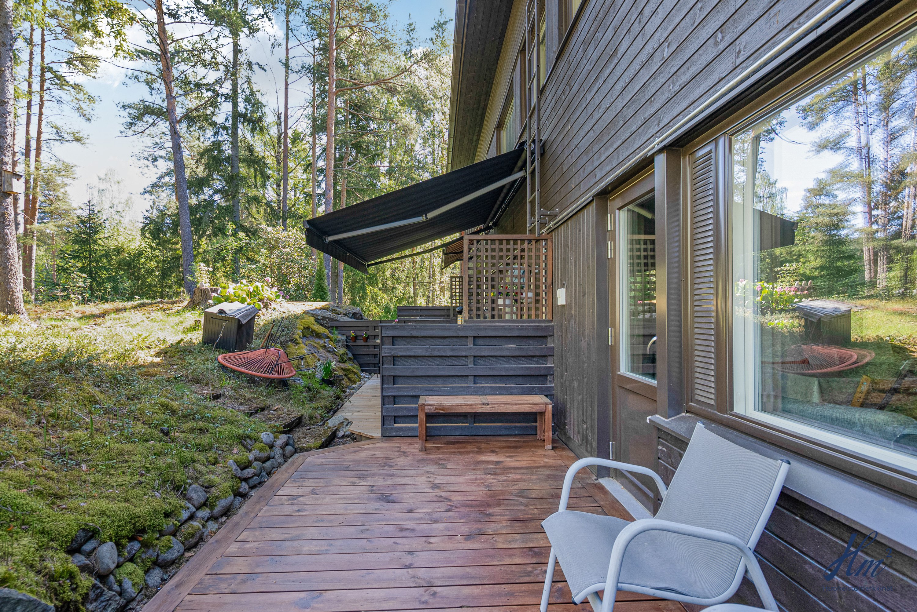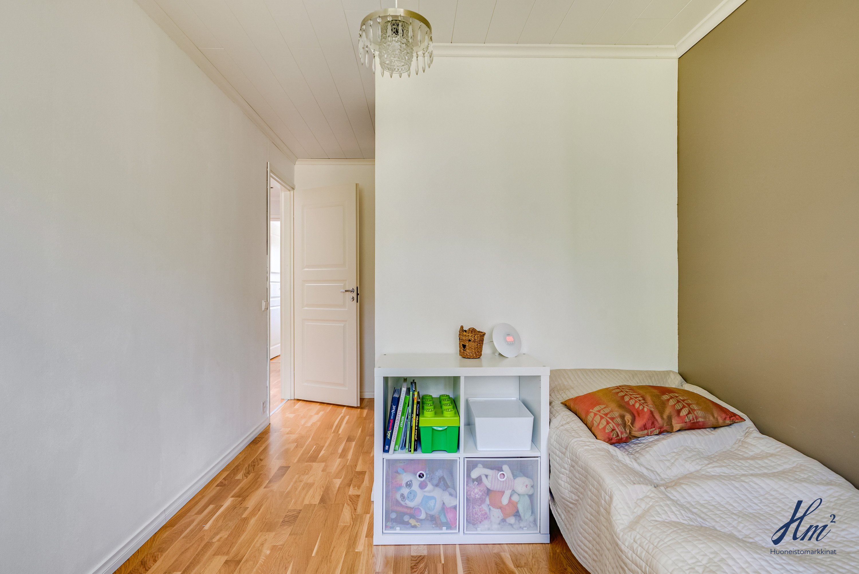 Alakerrasta löytyvät keittiö, kylpyhuone, wc ja sauna sekä viihtyisä olohuone, josta on käynti suojaisalle takapihan terassille. Yläkerrassa sijaitsevat kolme makuuhuonetta, toinen wc sekä runsaasti säilytystilaa käytännöllisissä vaatehuoneissa.