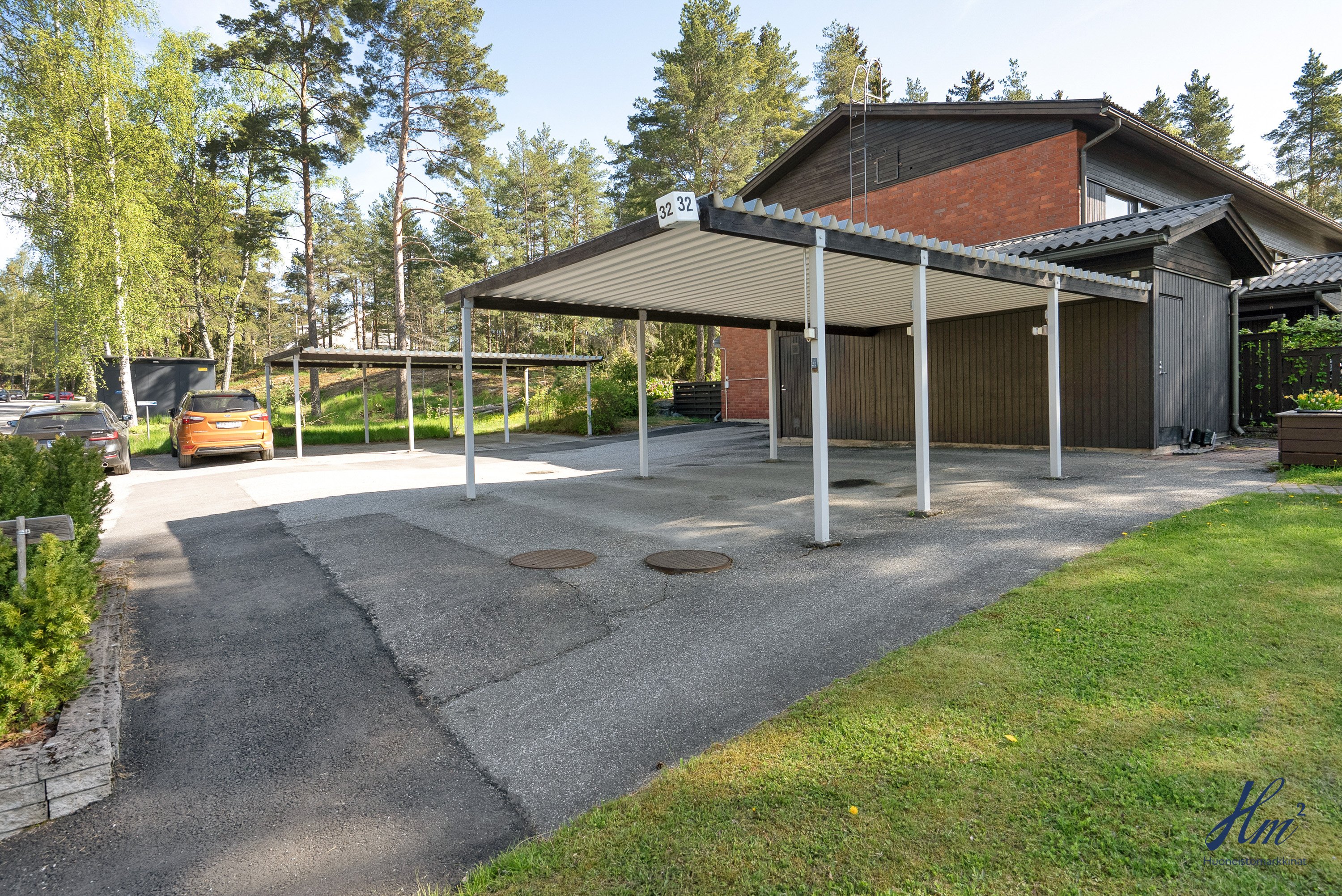 Asuntoon kuuluu sekä autokatospaikka että toinen pihapaikka – arki sujuu ilman pysäköintihuolia. Etupihalla on lisäksi oma ulkovarasto.