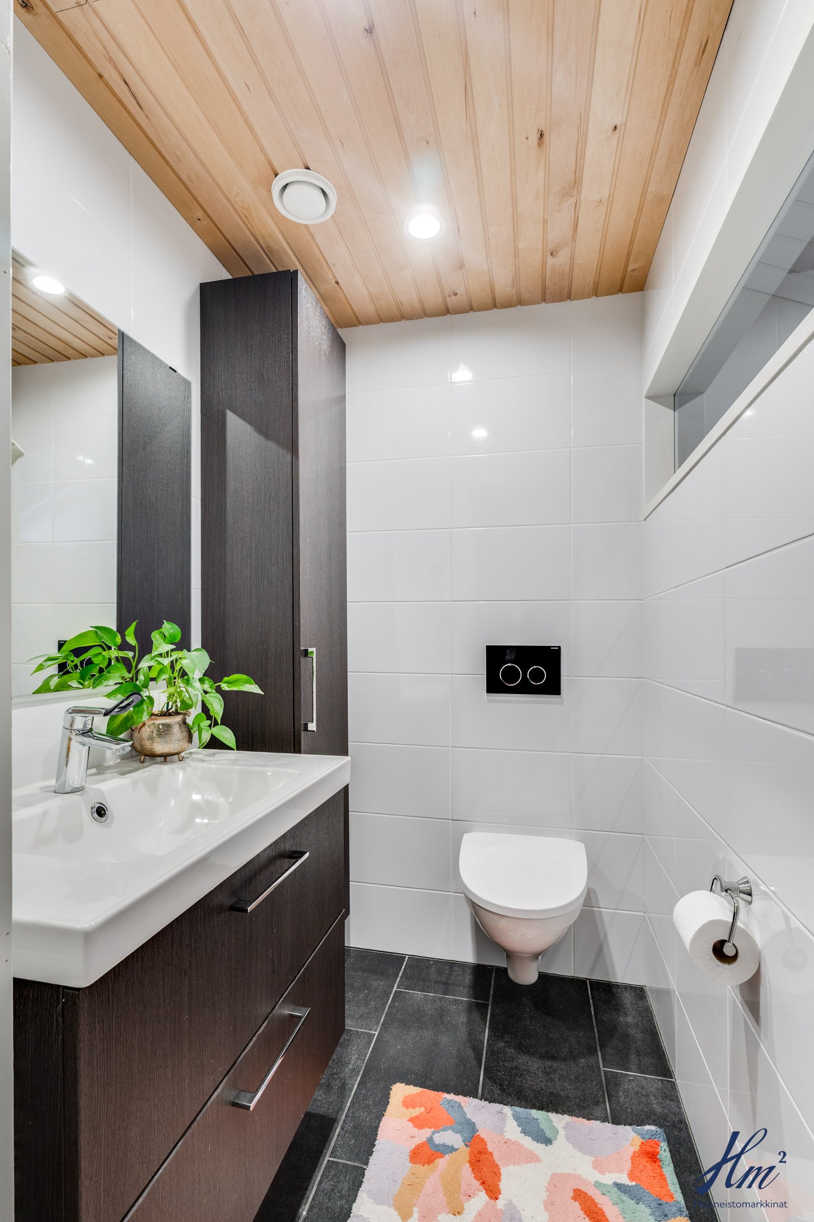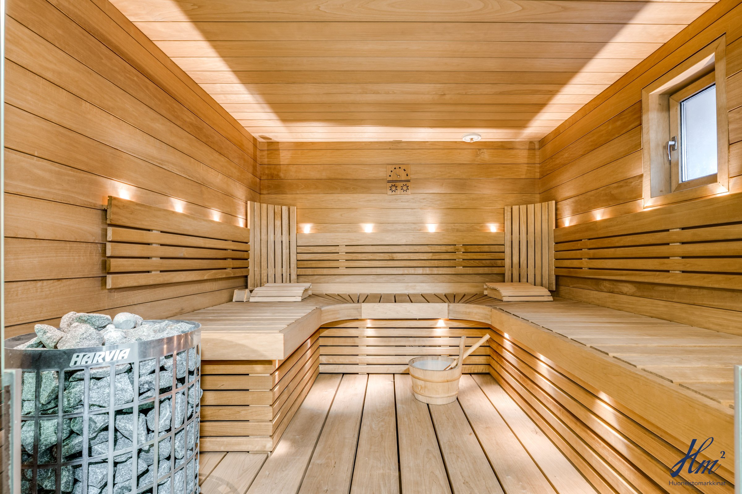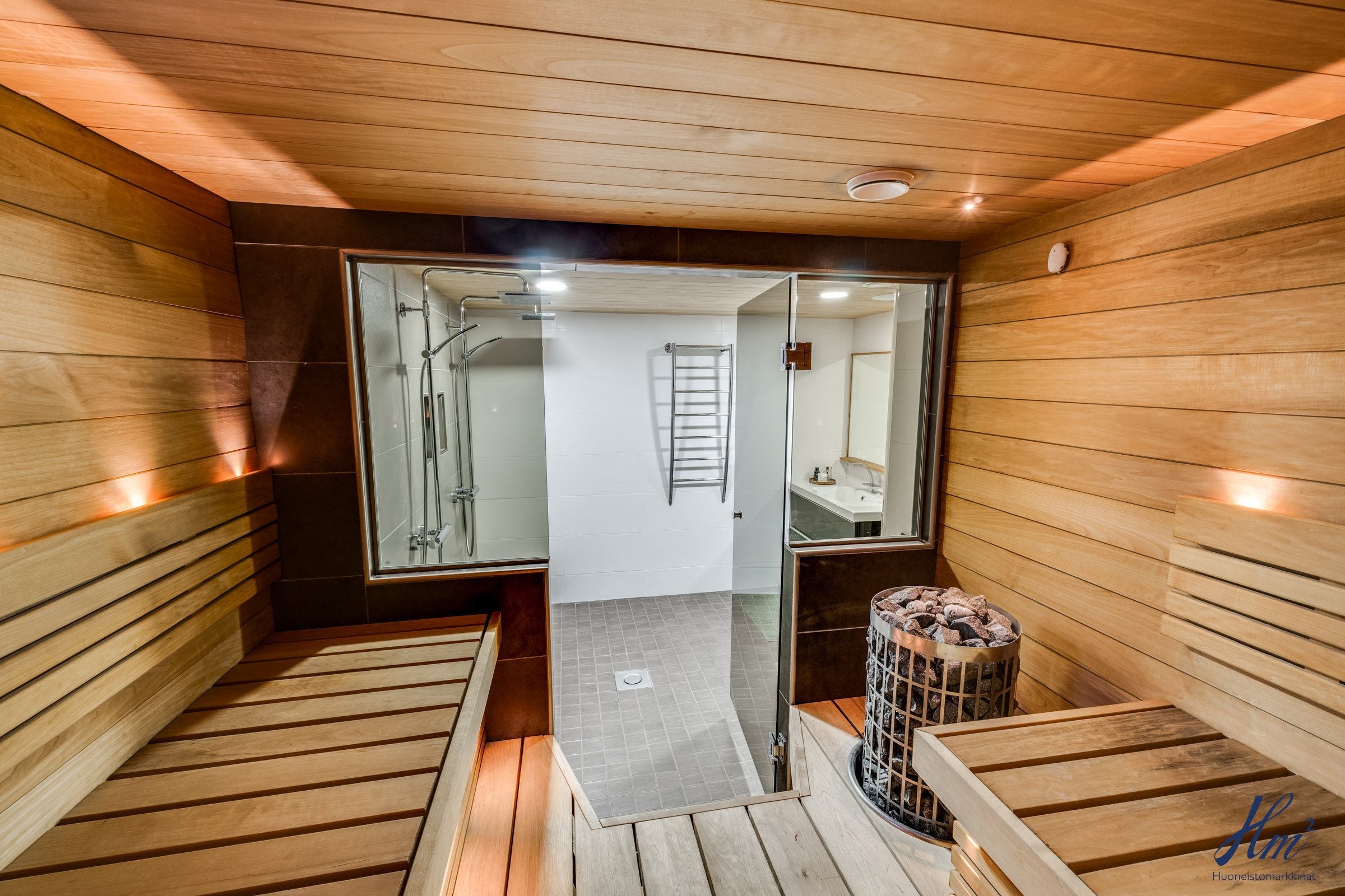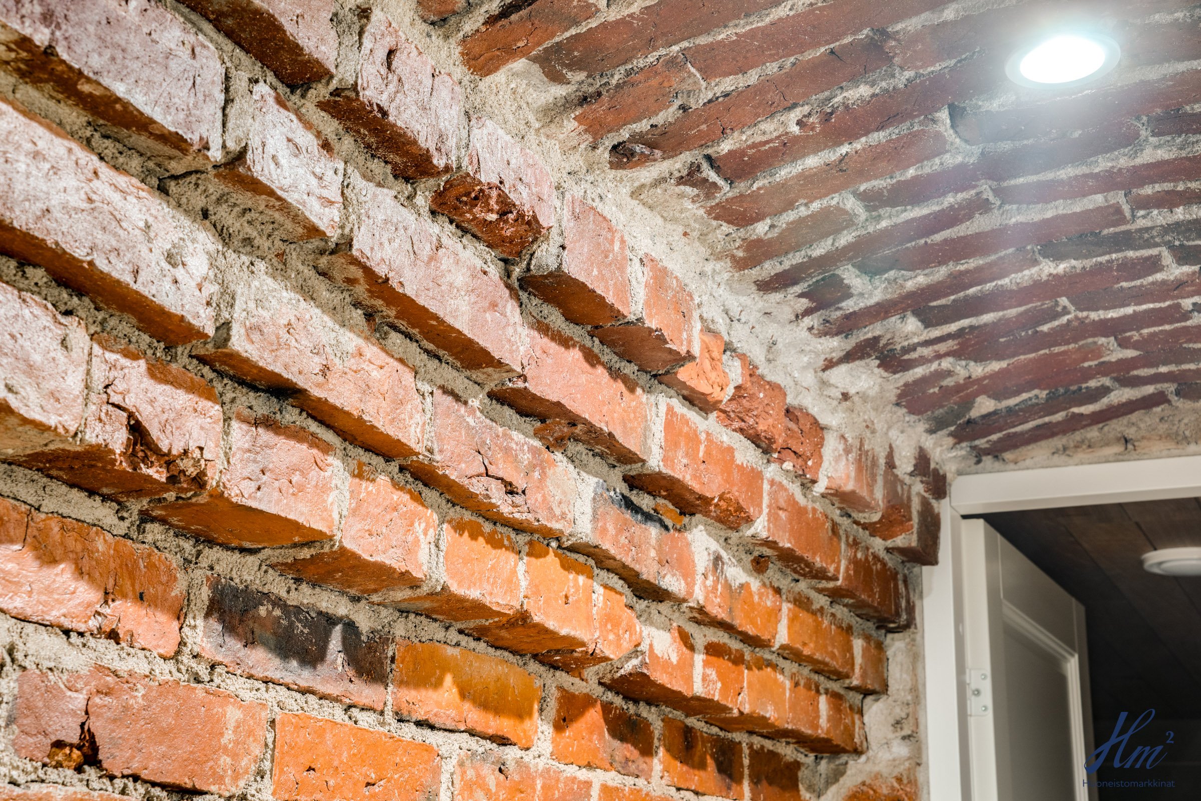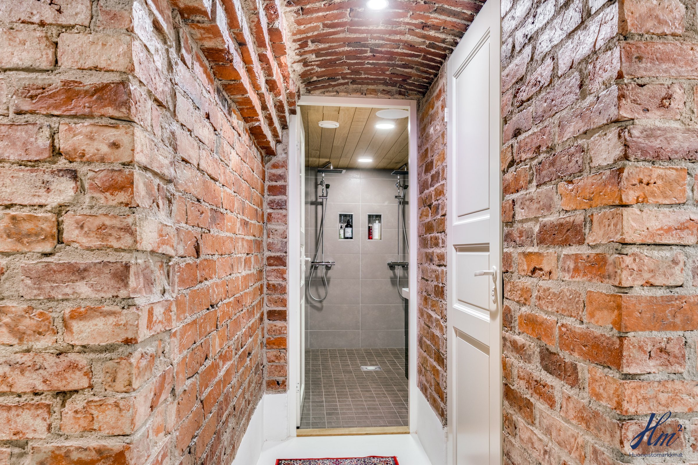 Alakerrasta löytyy yksi makuuhuone, pesutilat, wc ja upea tiiliverhoiltu holvikattoinen huone. Pesuhuoneen yhteydessä on myös tilava sauna, jossa voi rentoutua pitkän päivän päätteeksi. Alakerrassa on maalattu betonilattia, sekä lattialämmitys.