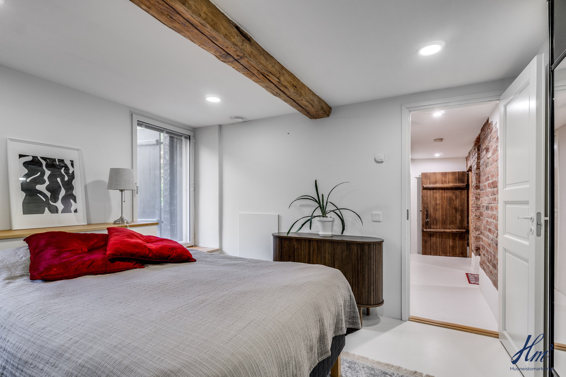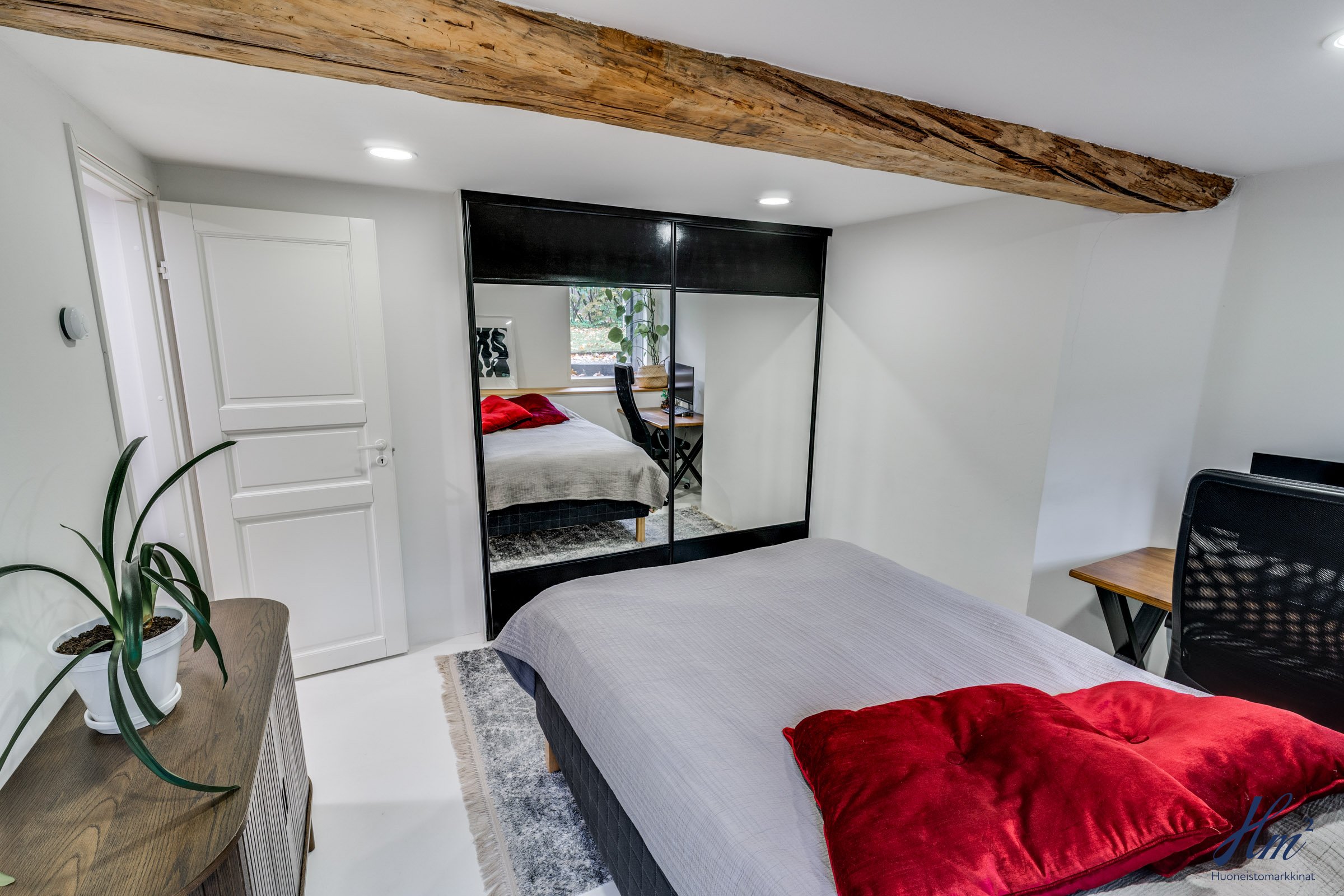 Yläkerrassa sijaitsee asunnon toinen makuuhuone ja wc. Myös työpisteelle löytyy oma tilansa valoa tulvivan kattoikkunan alla.