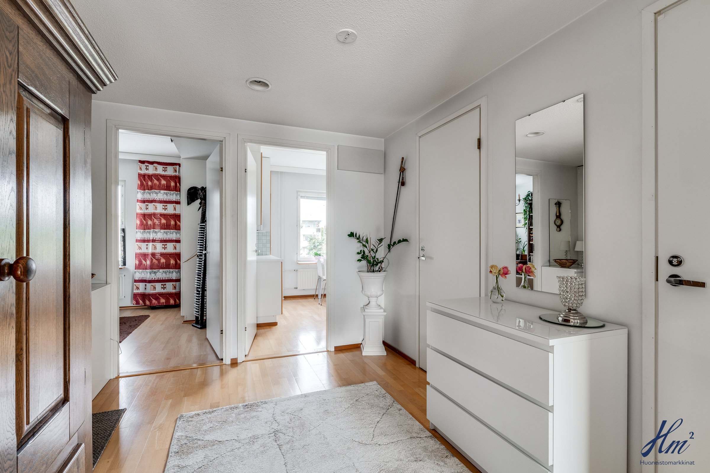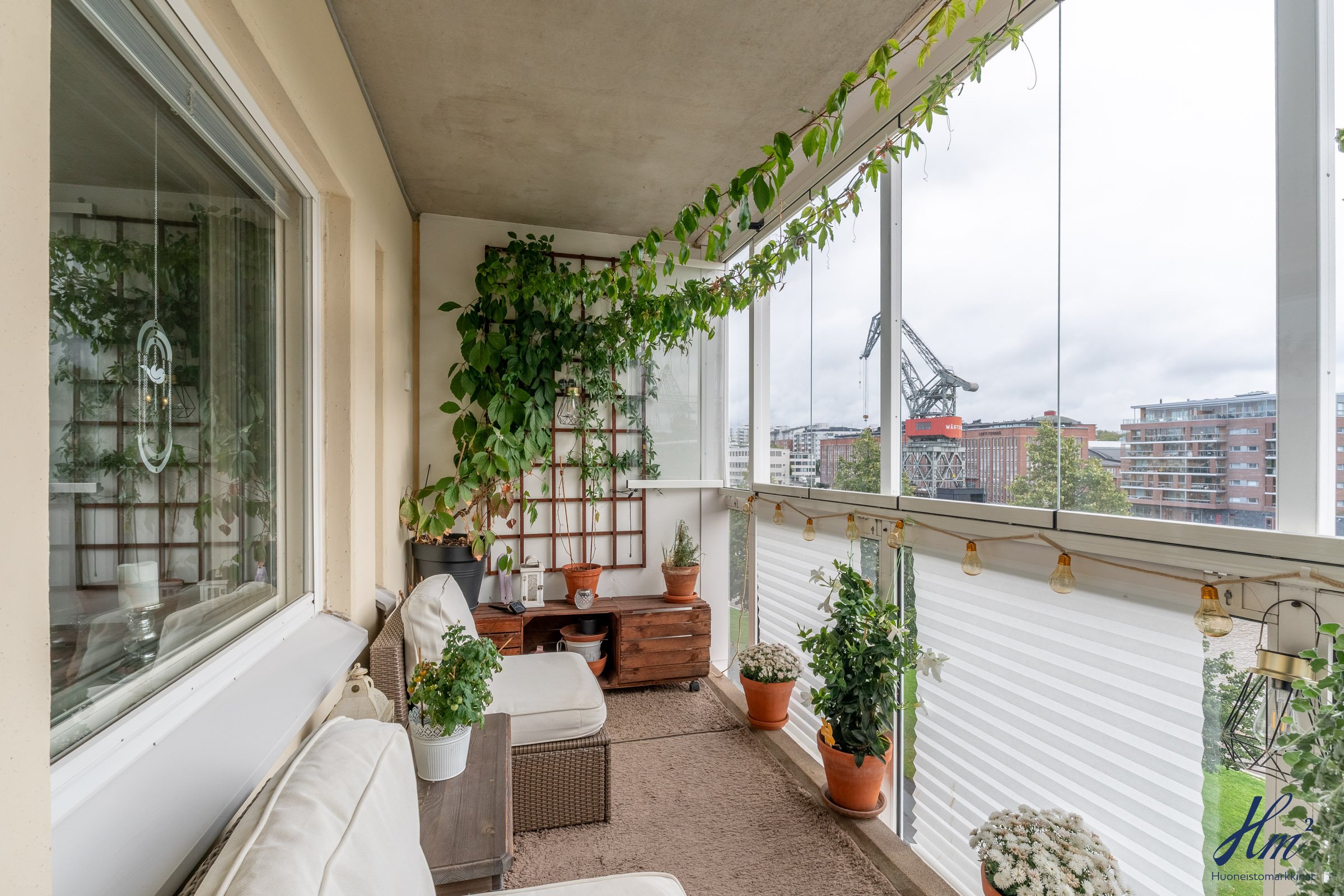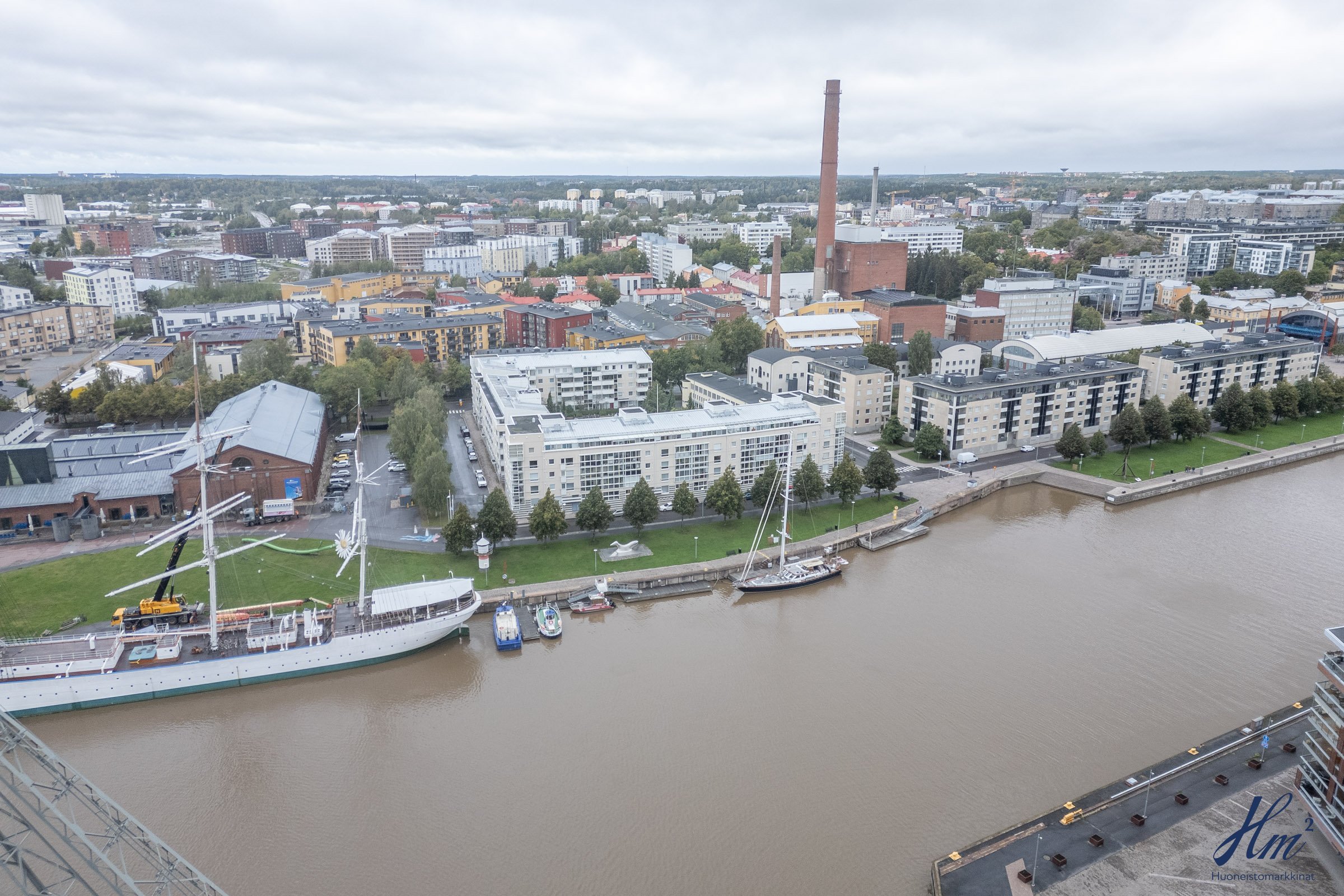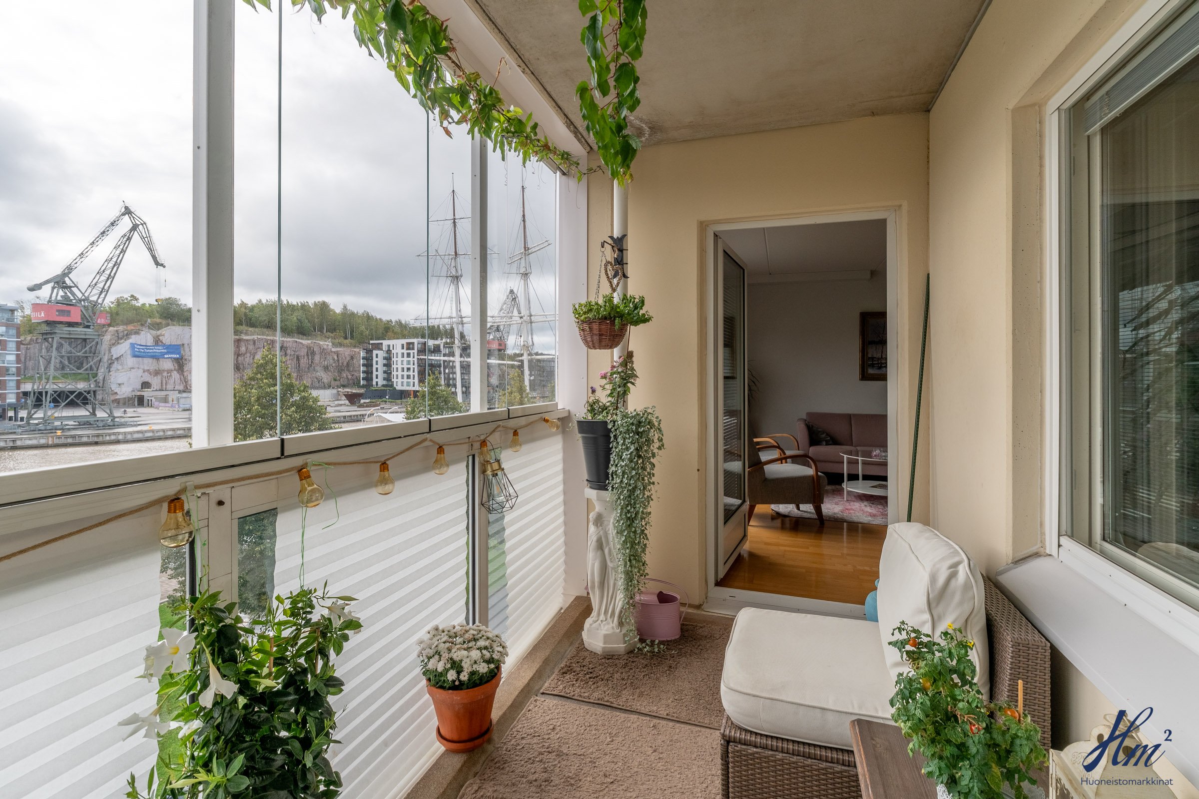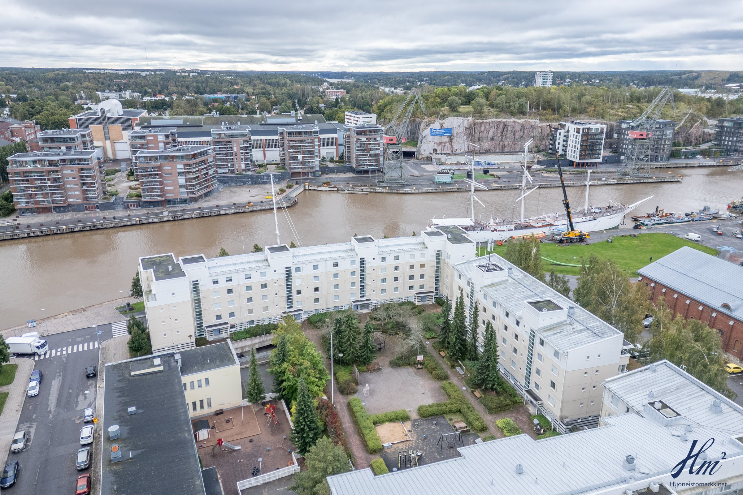 Tämä 84,5 m²:n kokoinen koti tarjoaa kaksi makuuhuonetta, olohuoneen, erillisen keittiön, kylpyhuoneen, saunan sekä lasitetun parvekkeen, jolta avautuvat suorat maisemat Aurajoelle. Parveke on kuin toinen olohuone. Paikka, jossa voi rauhoittua, seurata jokiliikennettä tai katsella auringonlaskun maalaamaa taivasta. Vuonna 1991 rakennetun talon neljännessä kerroksessa sijaitseva huoneisto on hyvässä peruskunnossa, ja pohjaratkaisu on käytännöllinen ja selkeä, ja säilytystilaa löytyy muun muassa vaatehuoneesta.