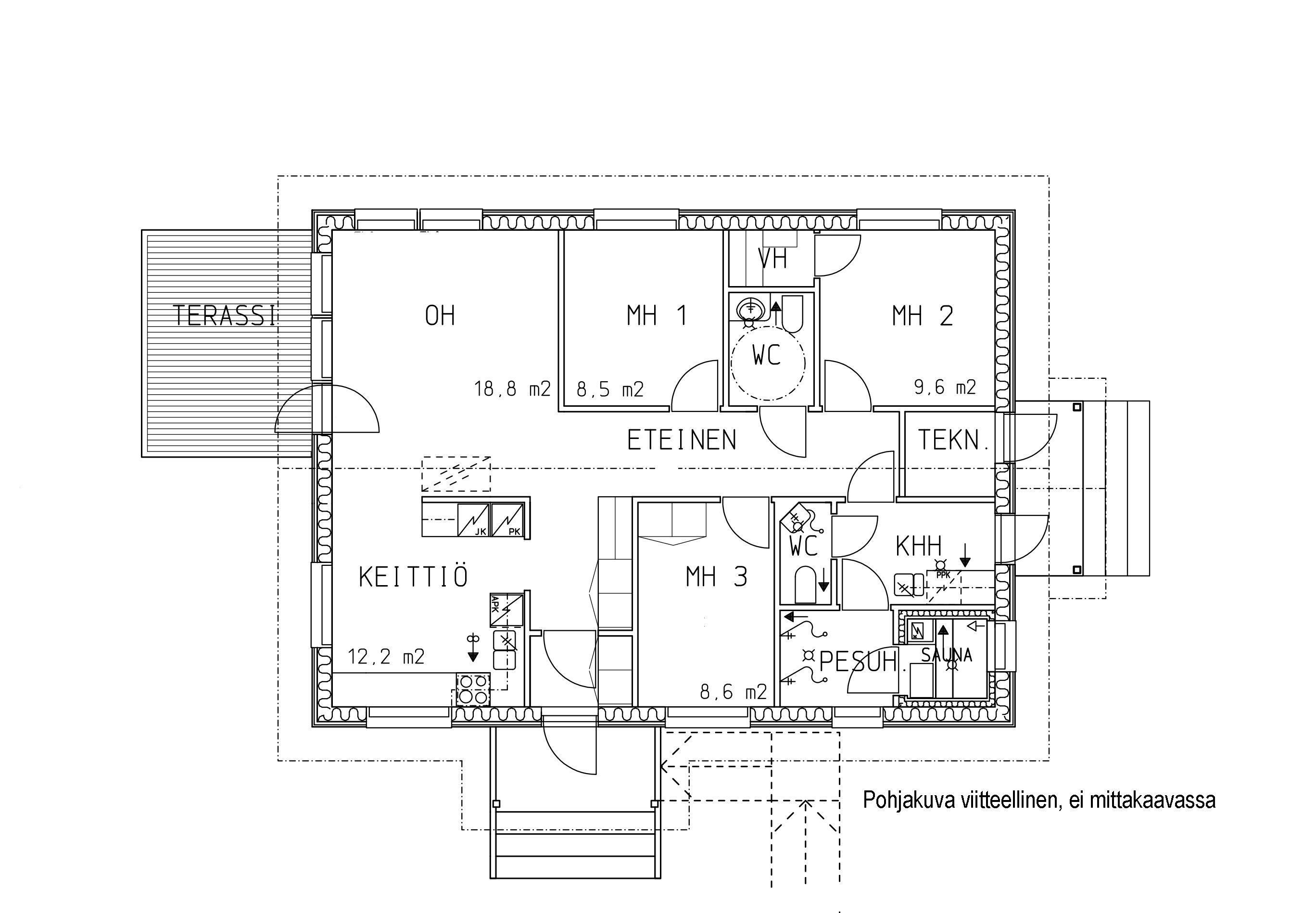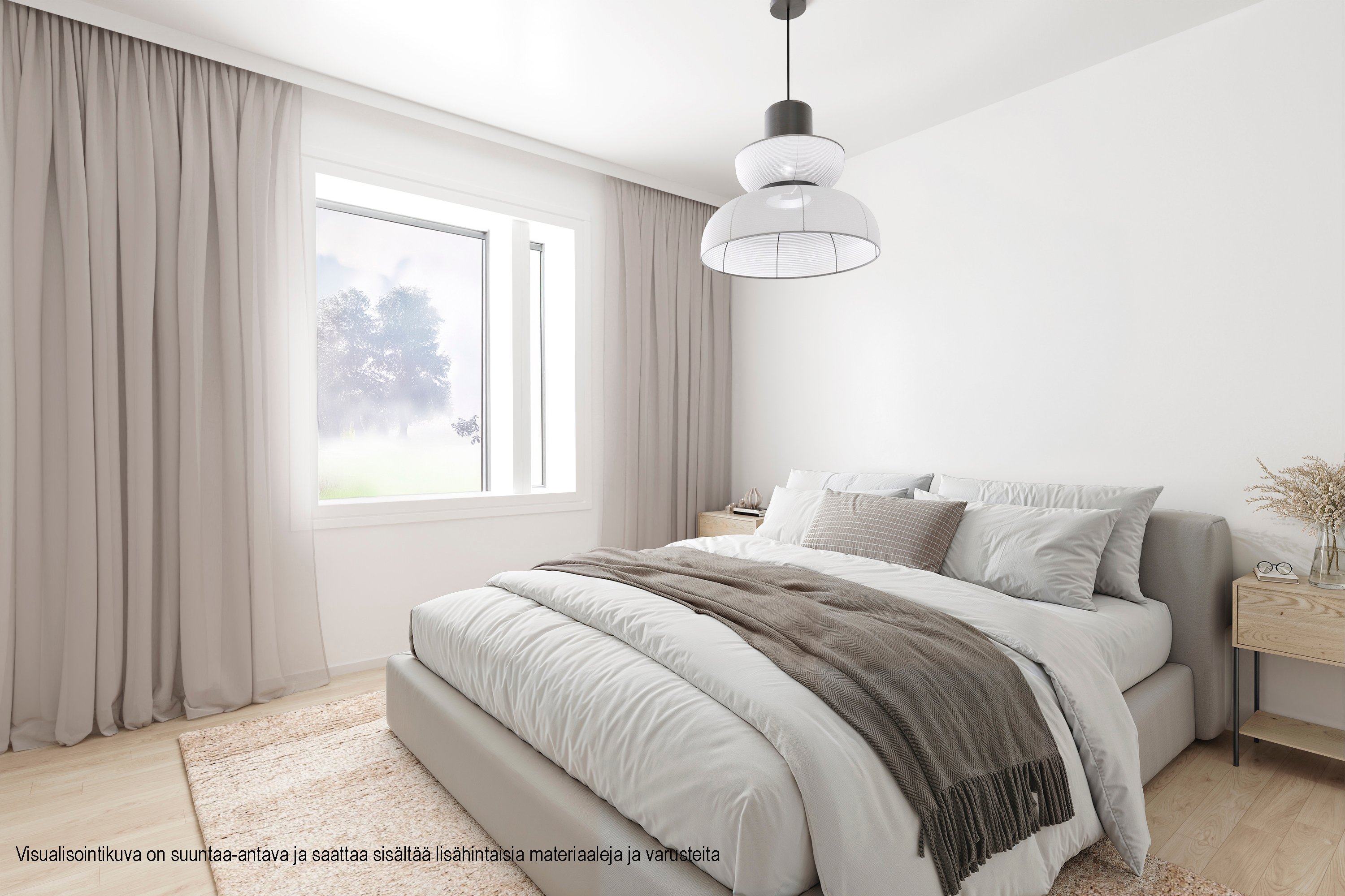 Kodin huolellisesti suunniteltu pohjaratkaisu käsittää neljä huonetta, keittiön, erillisen wc:n, kodinhoitohuoneen, kylpyhuoneen, saunan sekä tilavan eteisen. Avarat ja valoisat oleskelutilat tarjoavat mukavuutta niin arkeen kuin juhlaan, ja suora kulku terassille lisää asumismukavuutta.