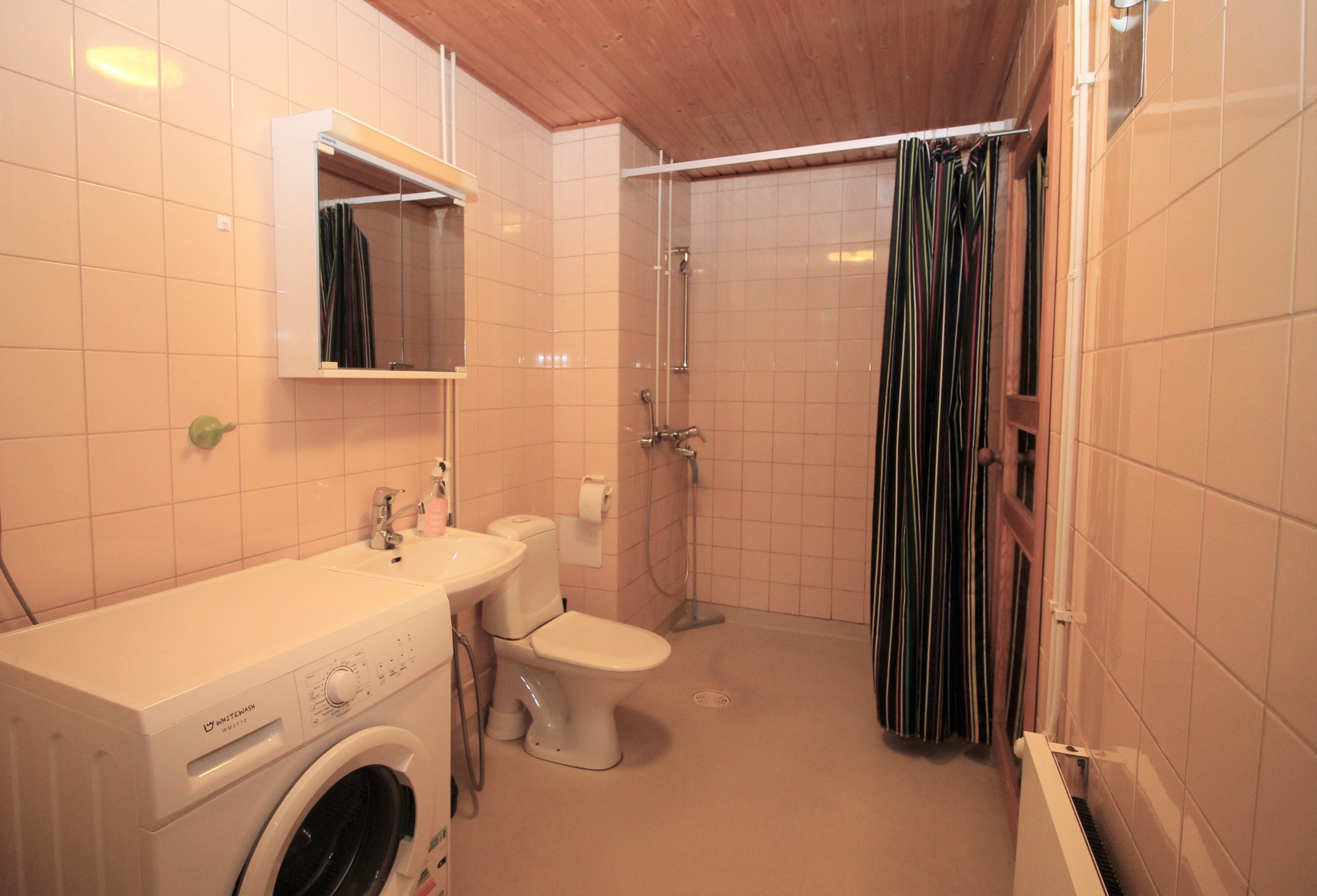 WC-istuin, suihku, pesukoneliitäntä, peilikaappi, pesuallas ja bidee-suihku