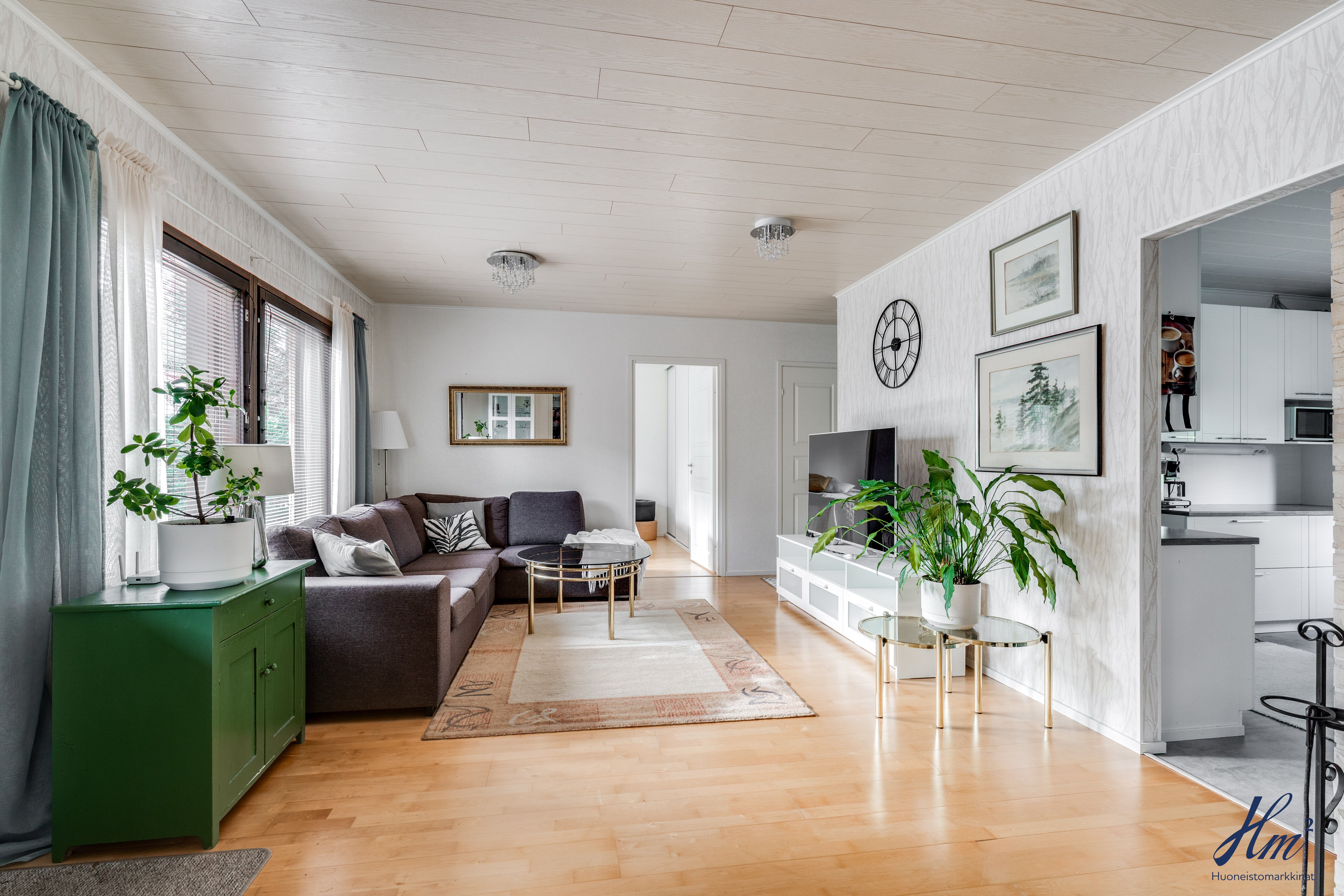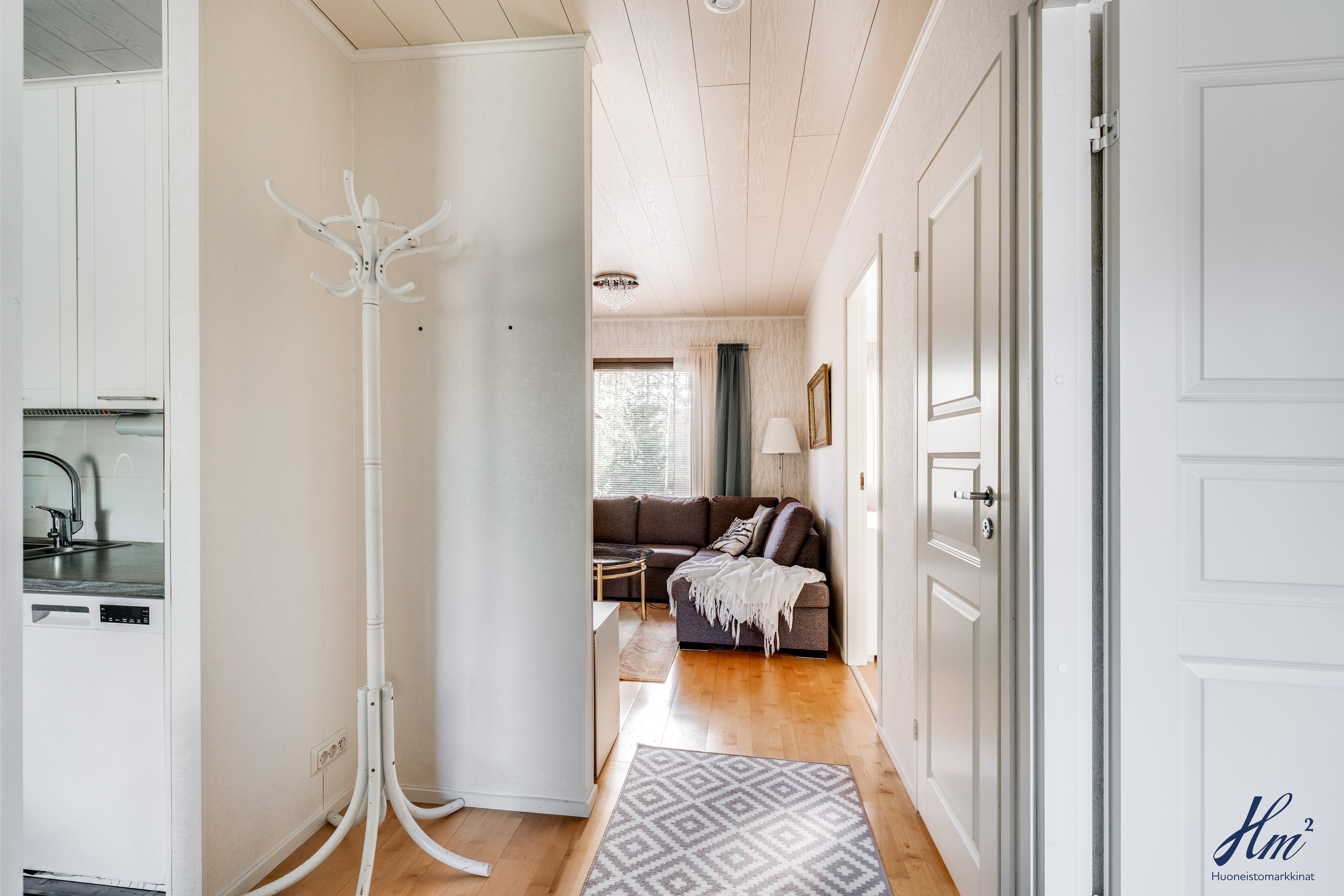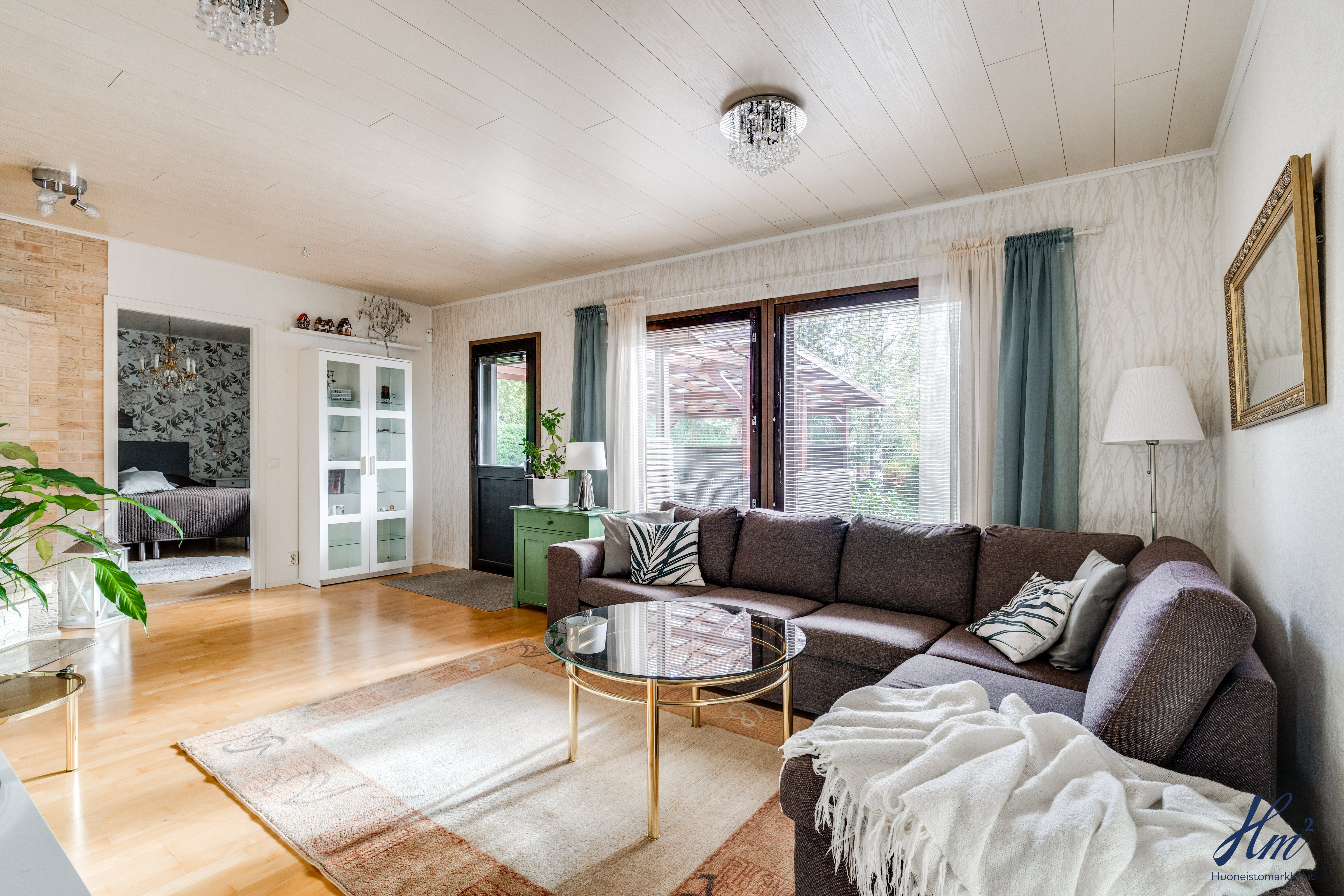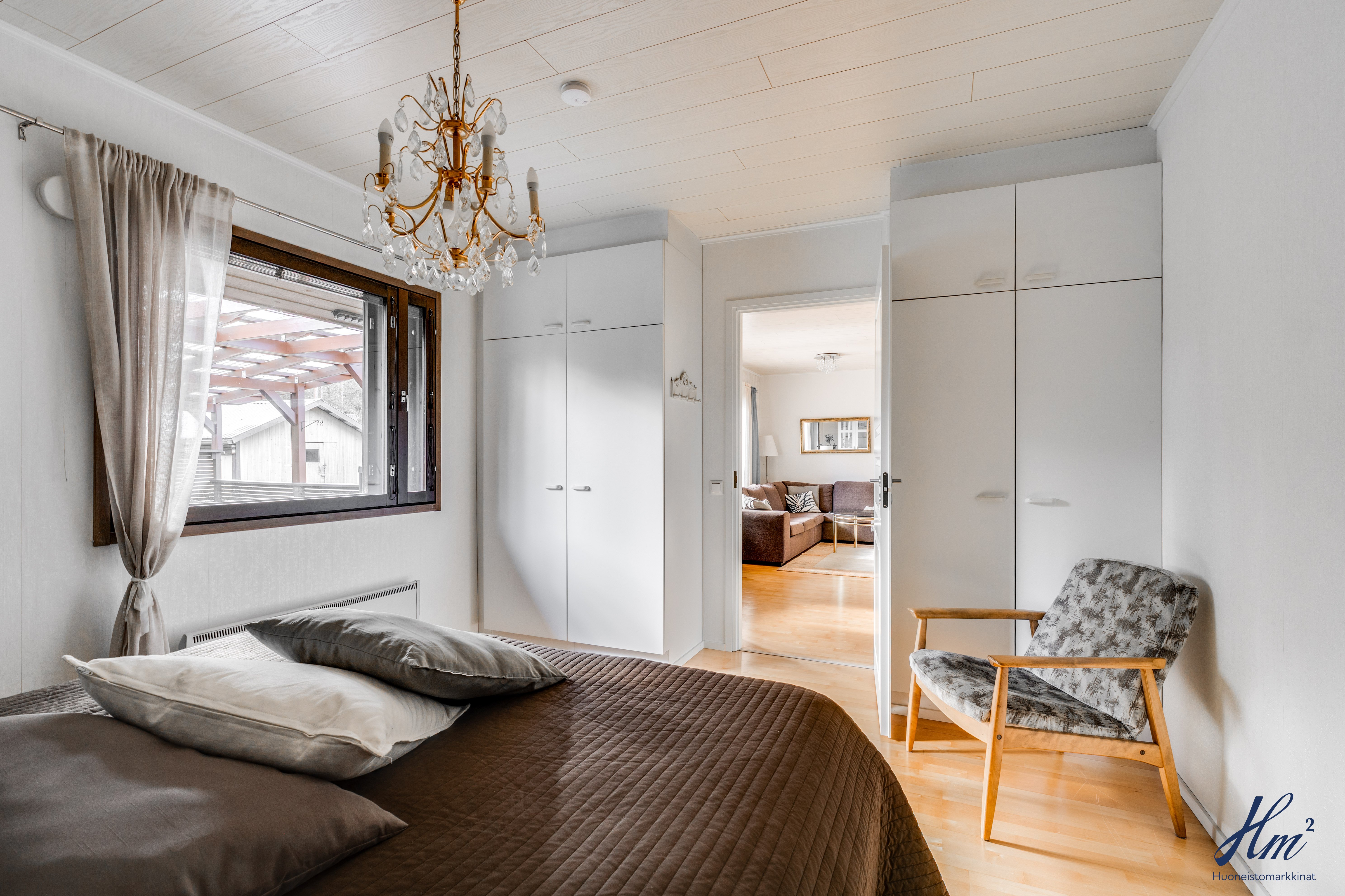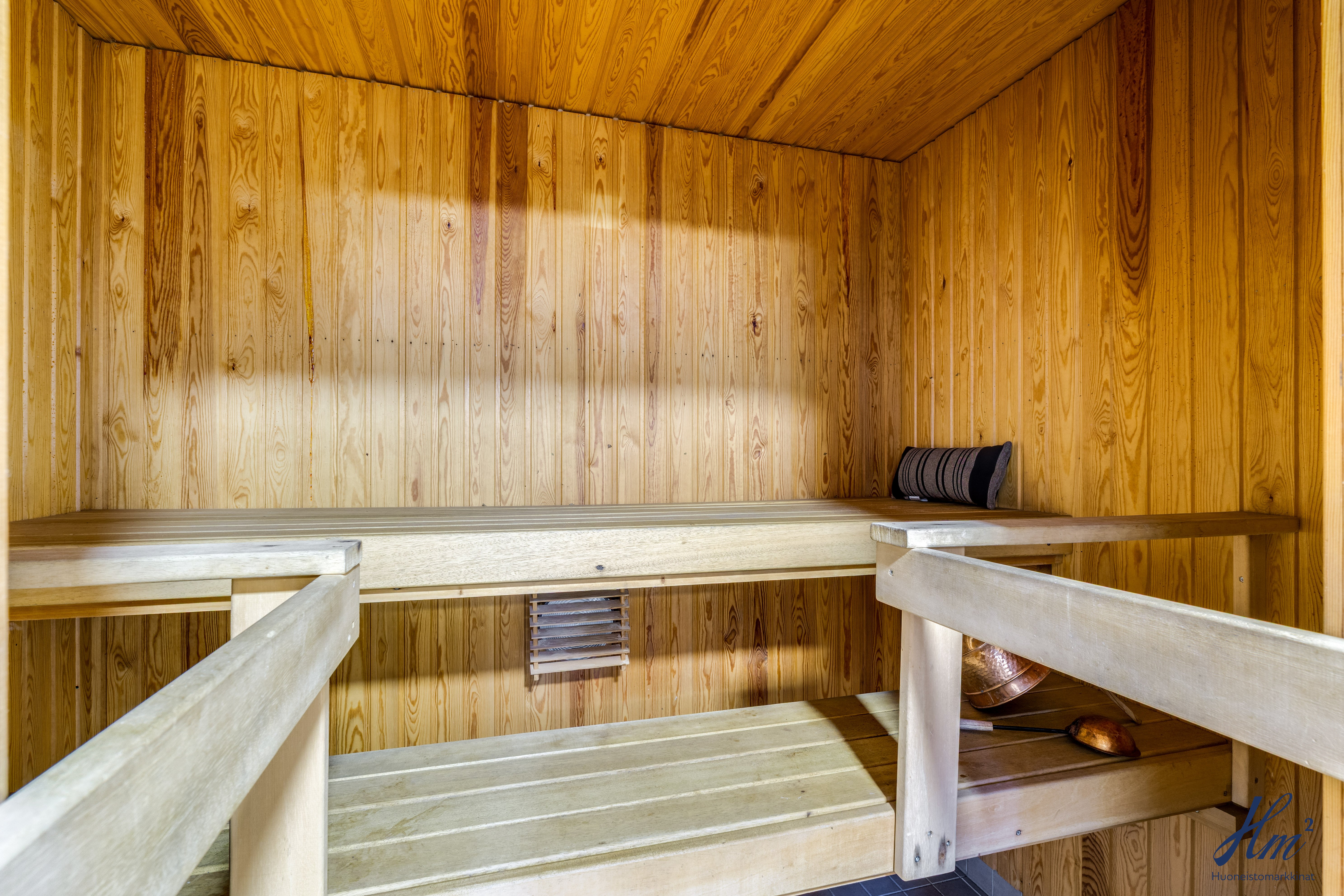 Olohuoneen lisäksi on kolme makuuhuonetta keittiö, wc ja pesuhuone, sauna.