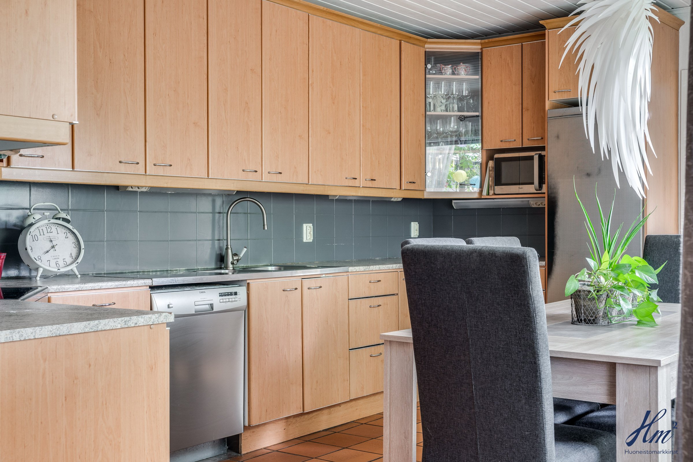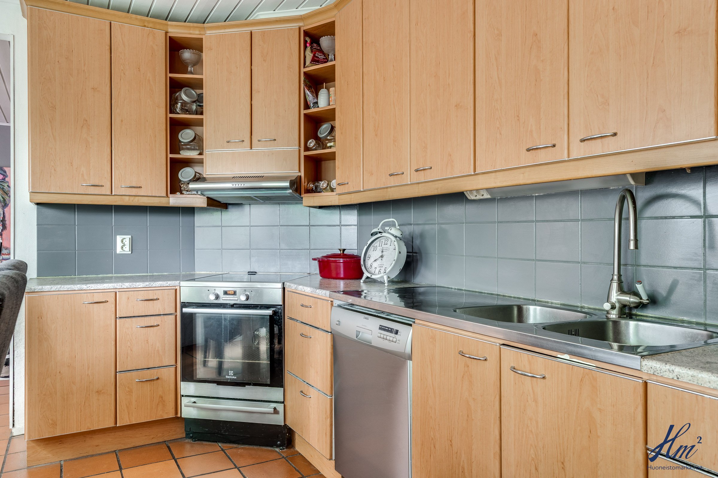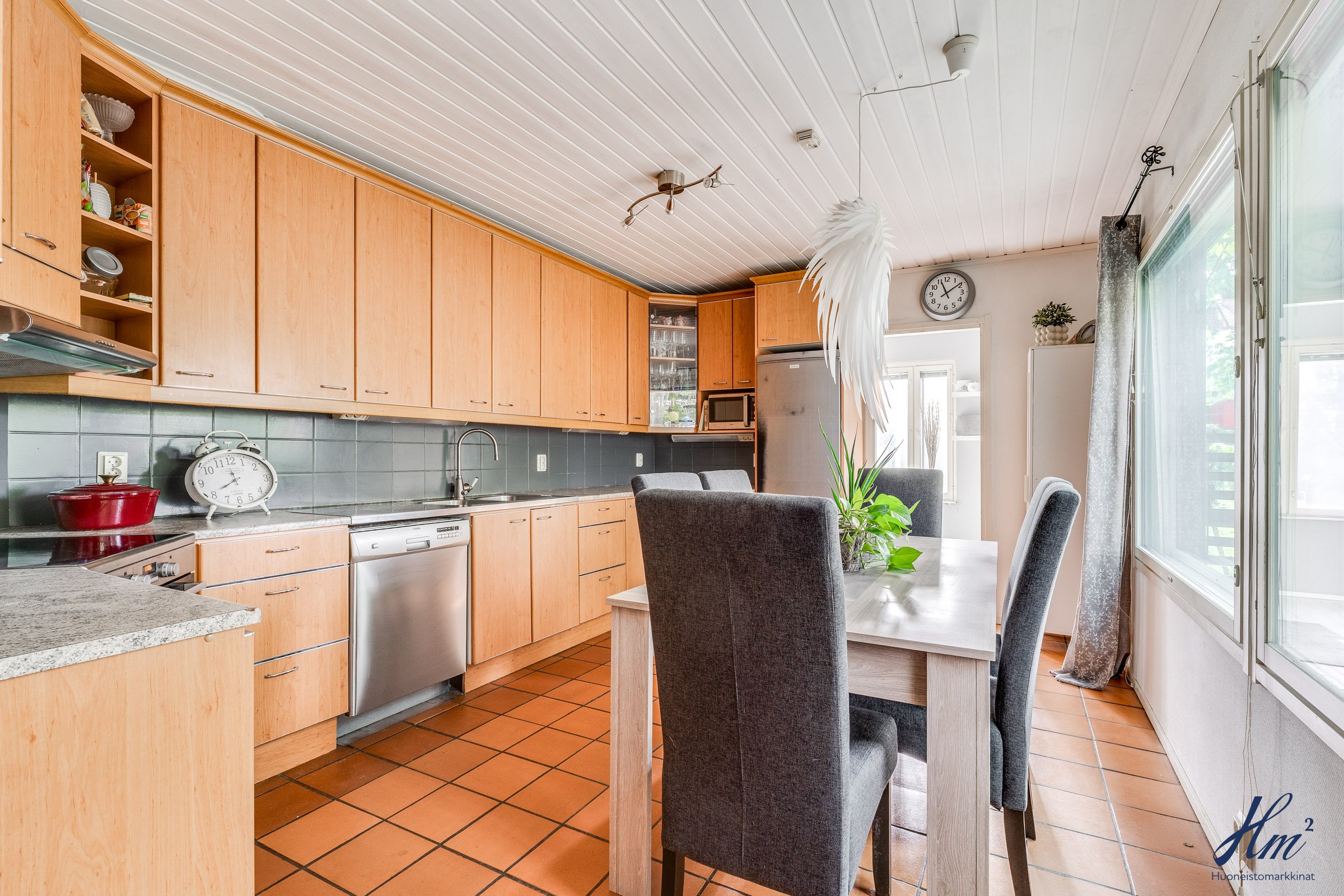 Kaapistot, jääkaappi, induktioliesi, liesituuletin, astianpesukone. Keittiön lattiapinta on laatoitettu ja seinäpinnat on maalattu. Keittiö on remontoitu 2000.