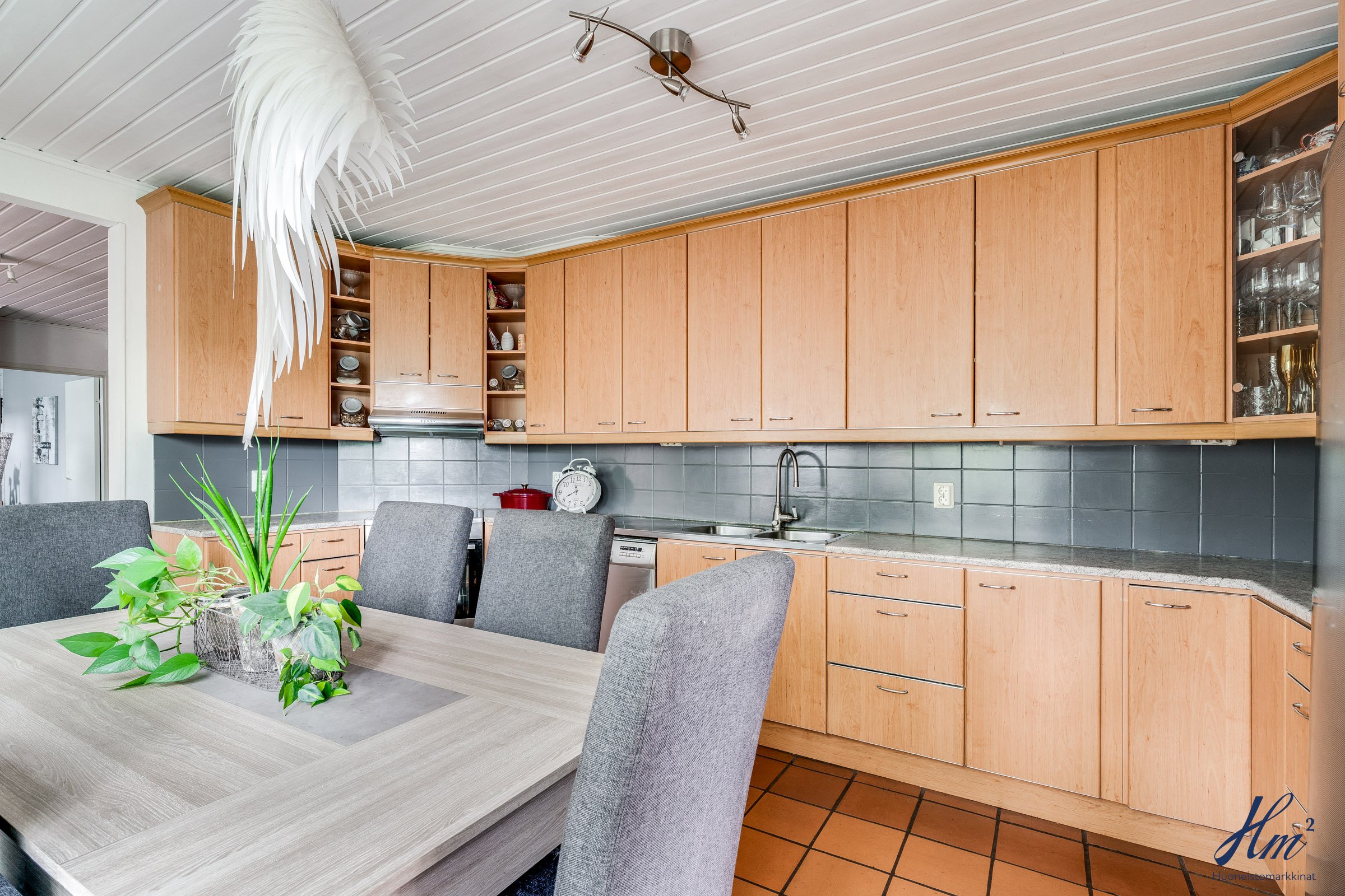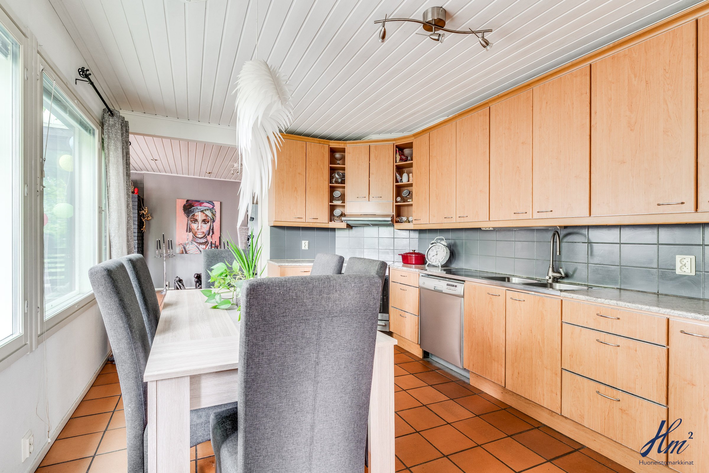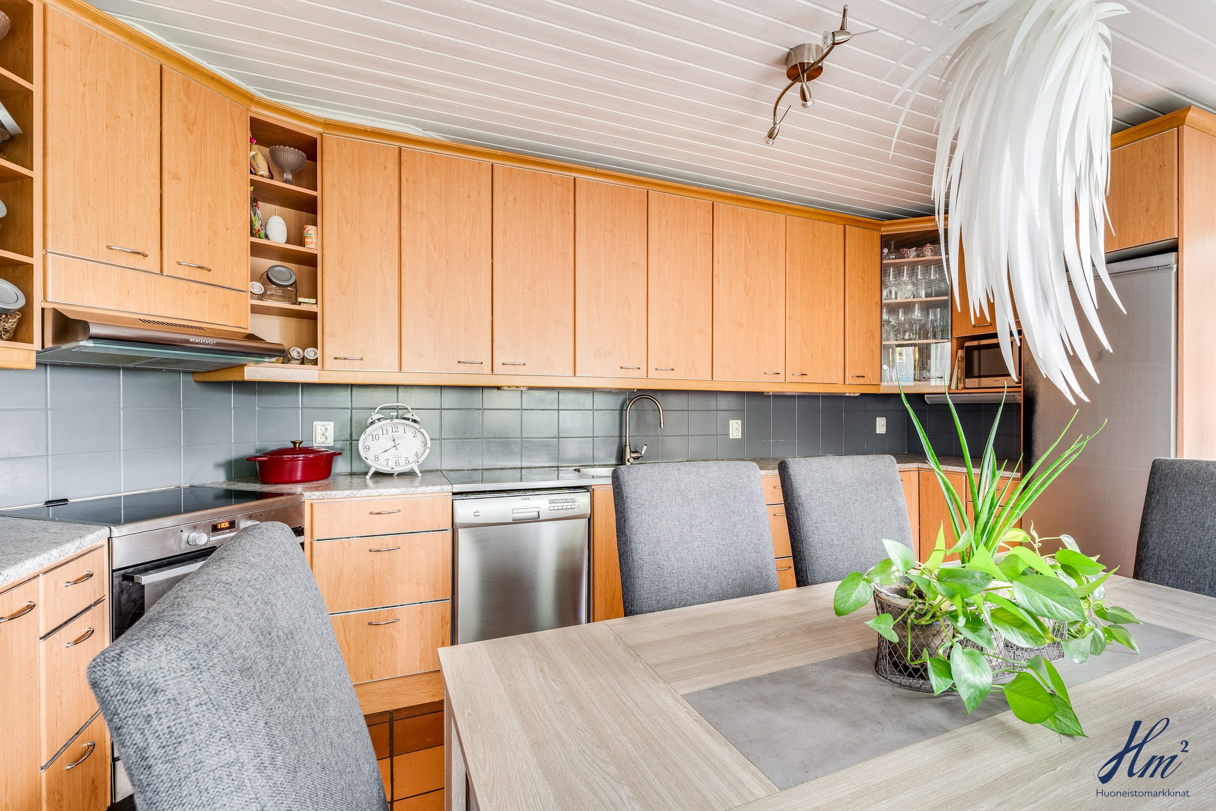 Kaapistot, jääkaappi, induktioliesi, liesituuletin, astianpesukone. Keittiön lattiapinta on laatoitettu ja seinäpinnat on maalattu. Keittiö on remontoitu 2000.