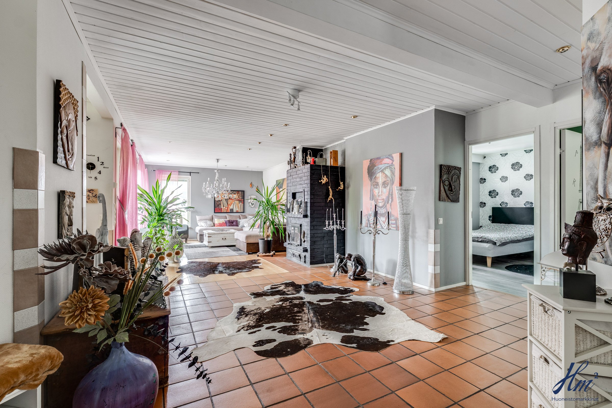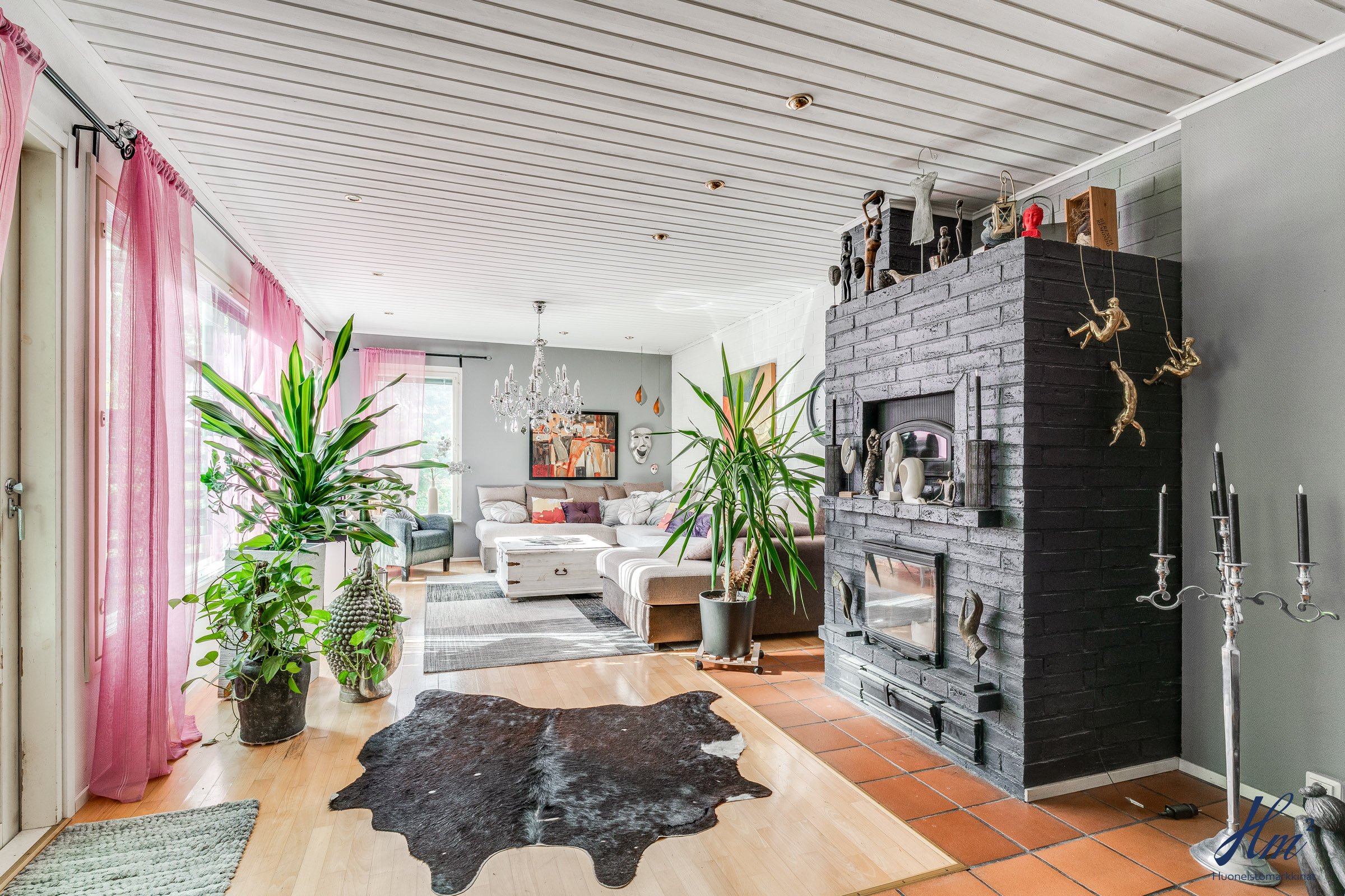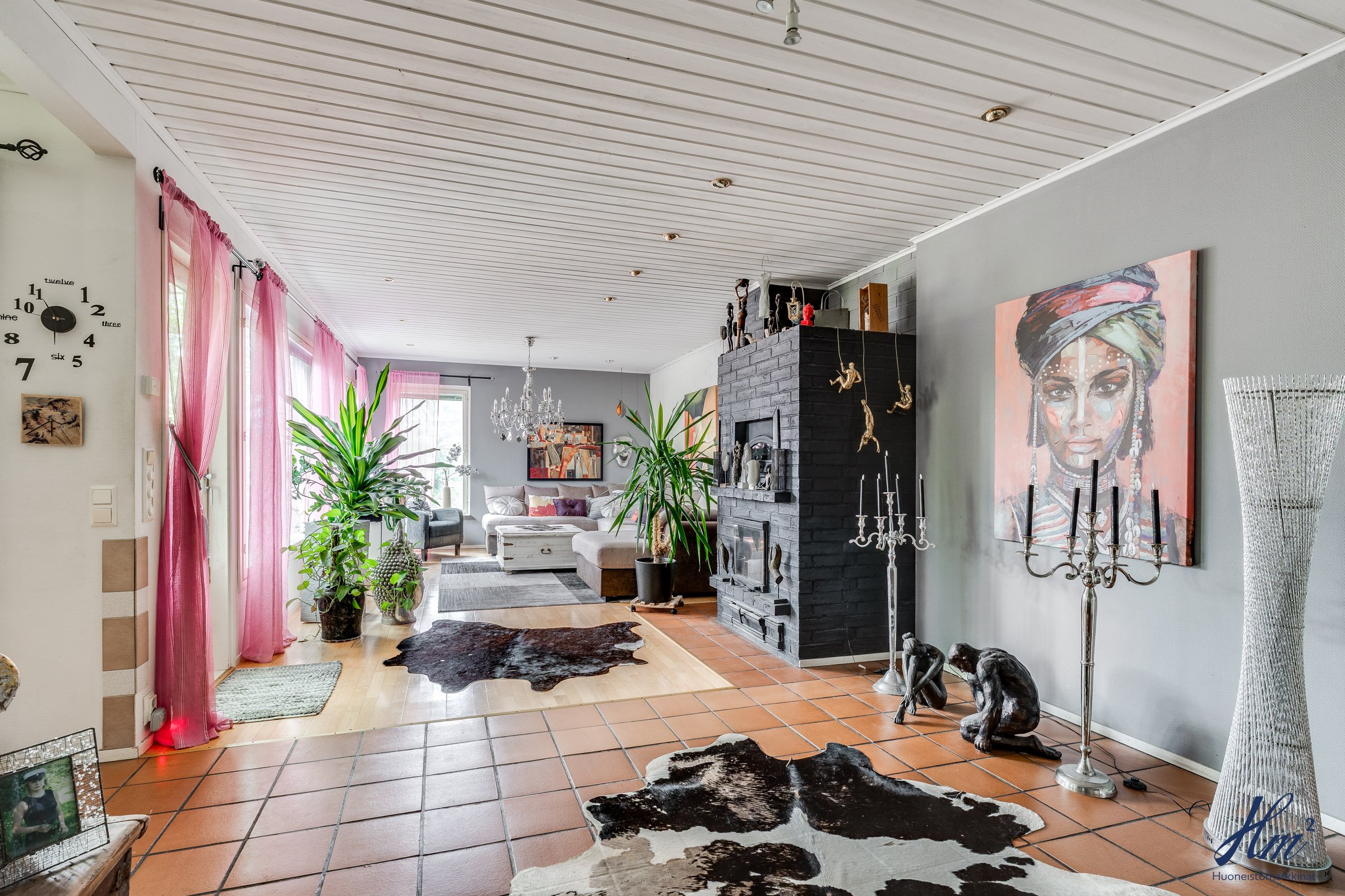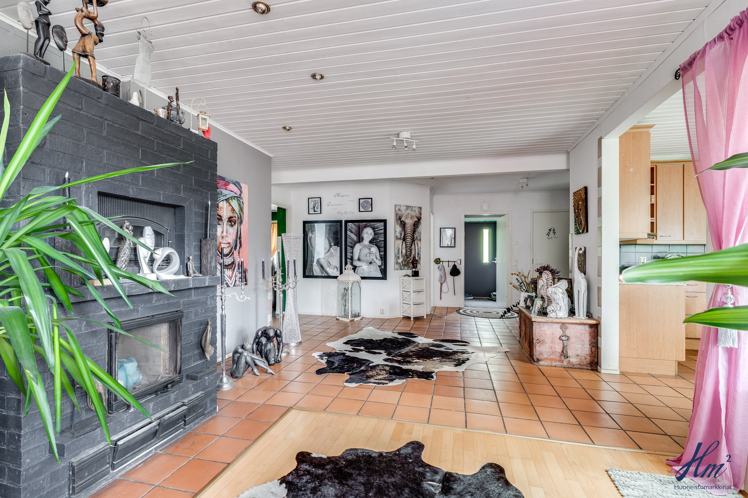 Olohuoneen lattiapinta on osin laattaa ja osin parkettia. Seinäpinnat osin tiiltä ja osin tapetoitu, tai maalattu. Olohuoneessa massiivinen takka sekä kulku katetulle terassille.