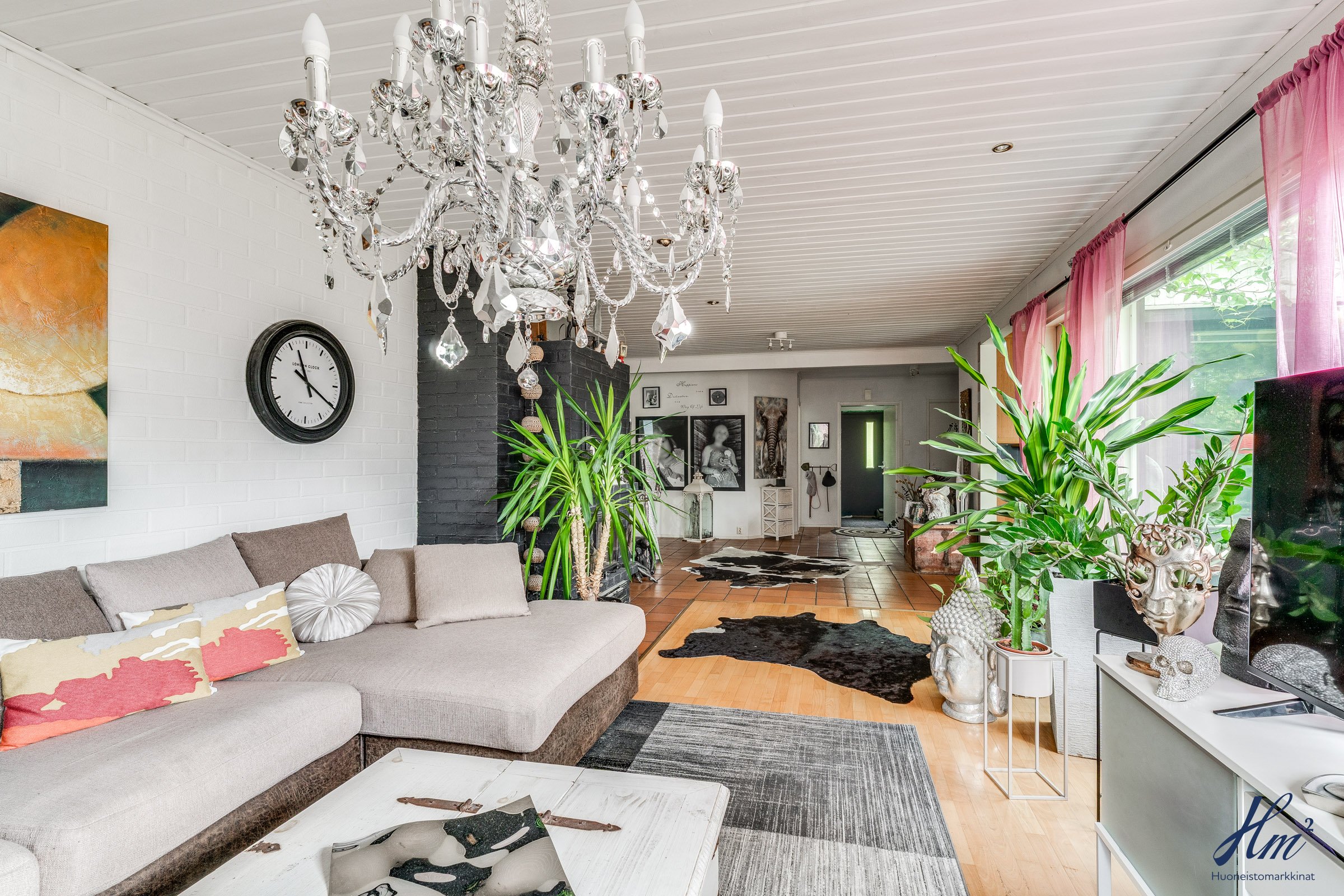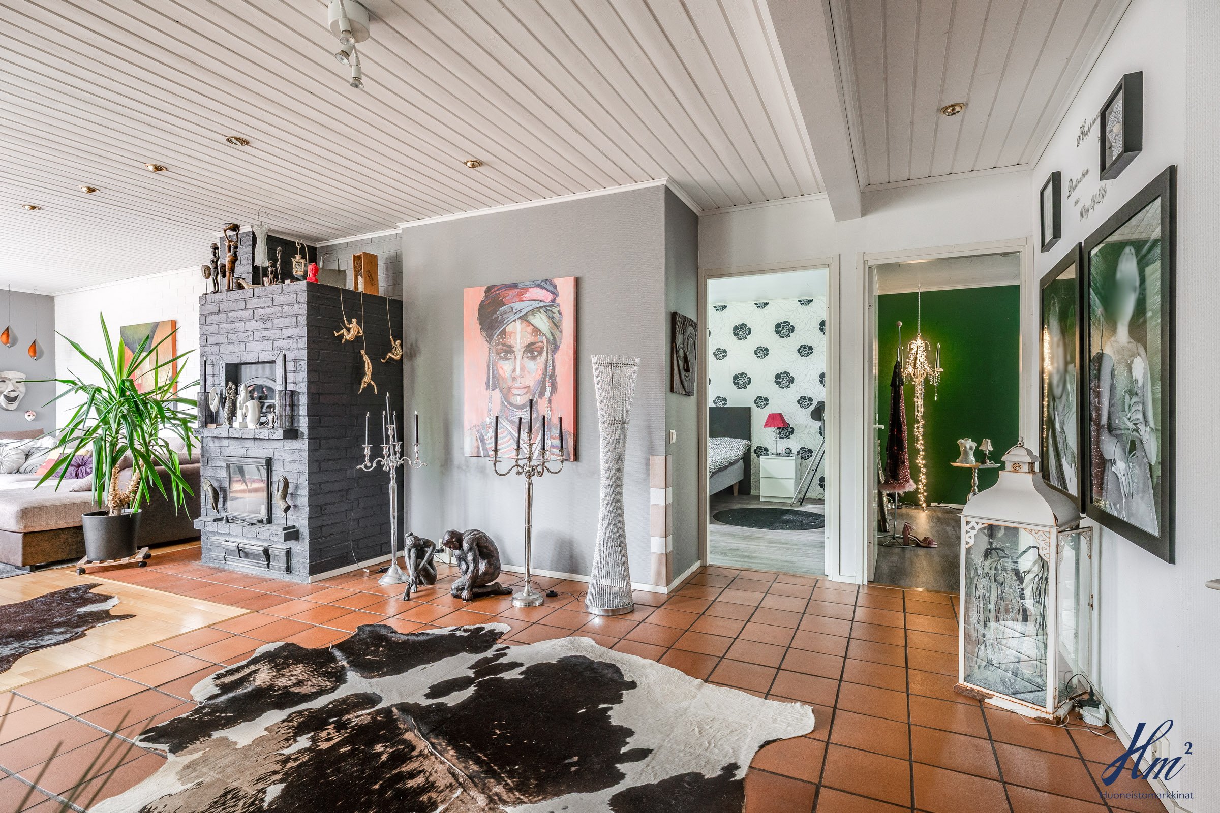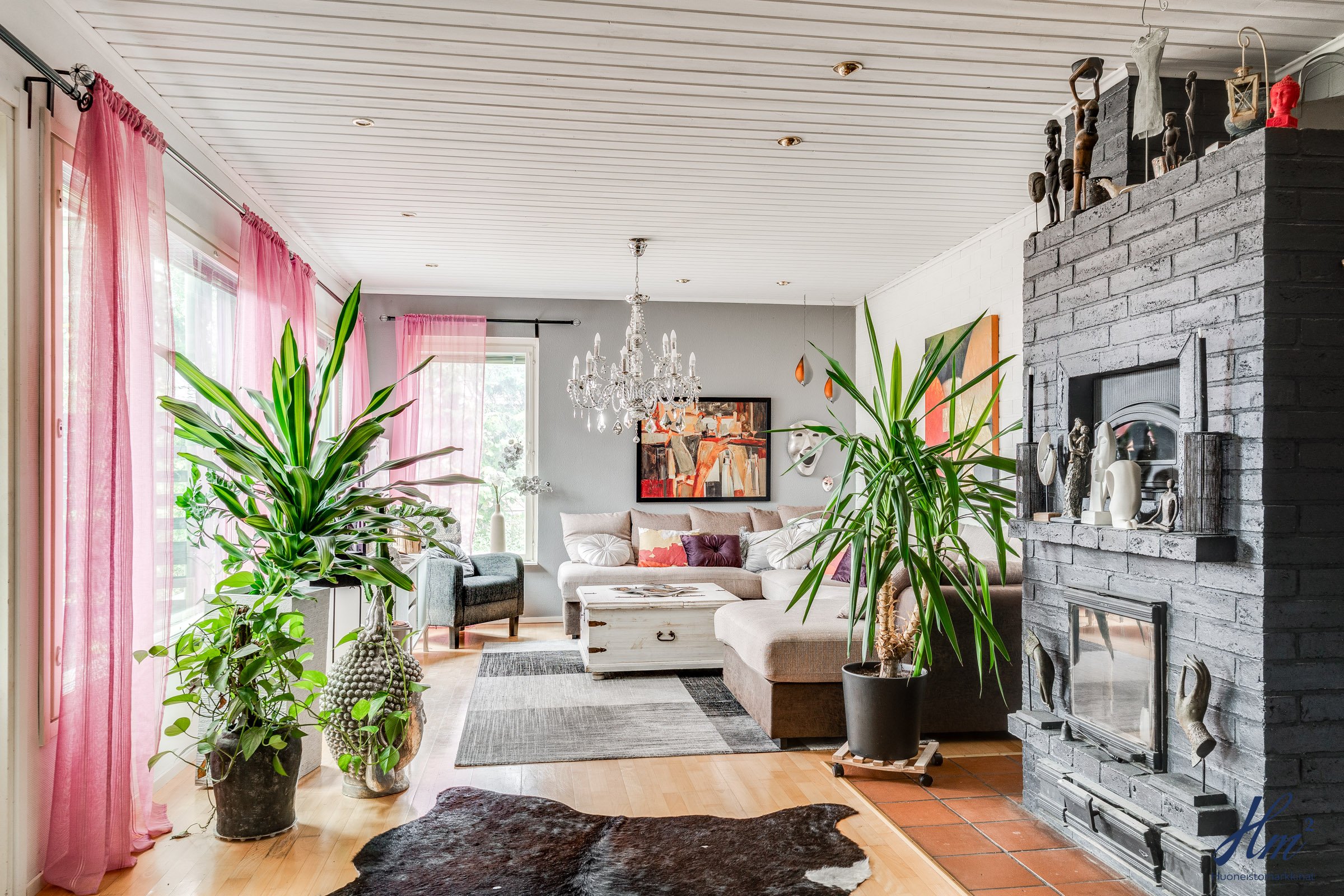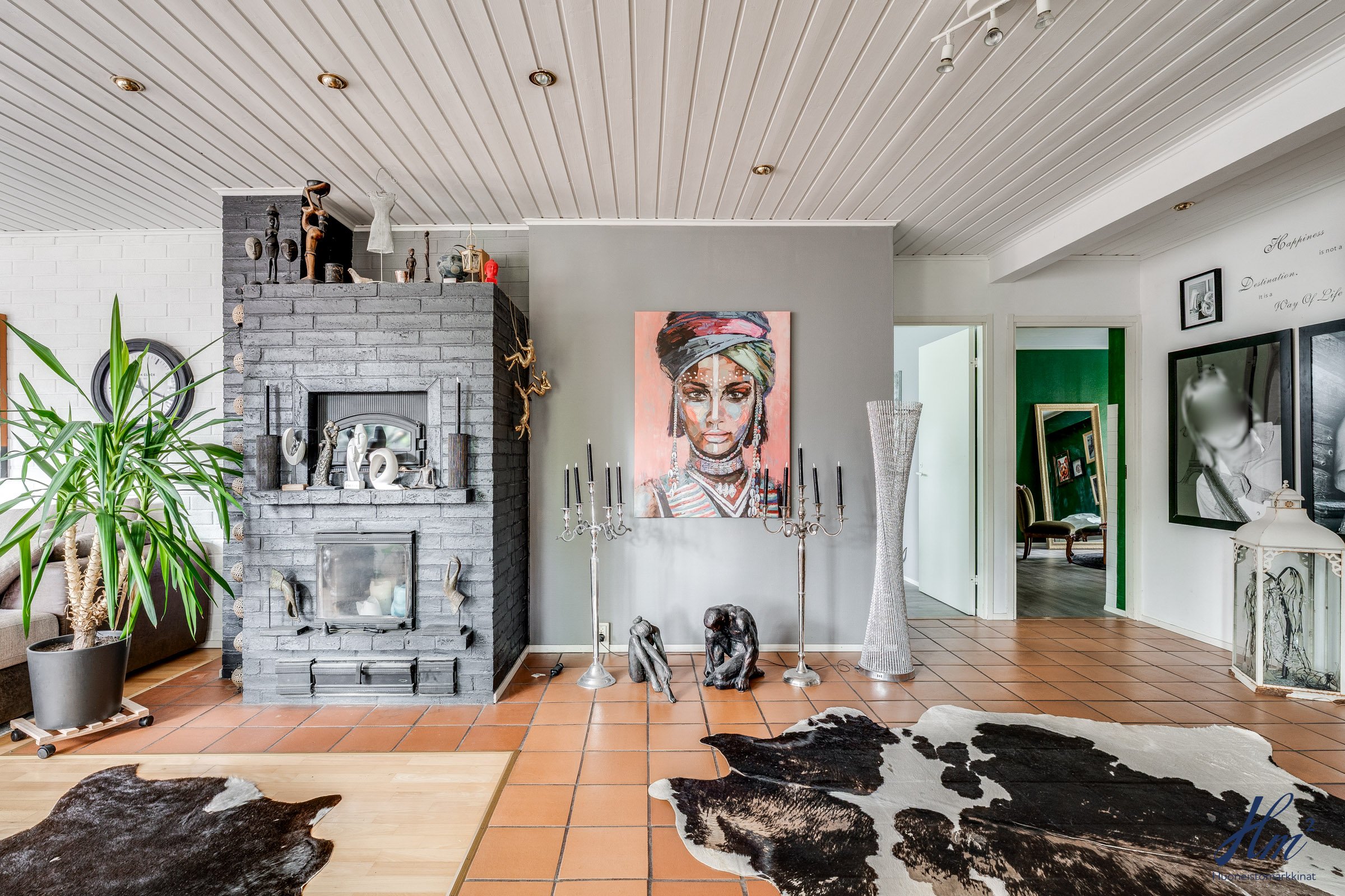 Olohuoneen lattiapinta on osin laattaa ja osin parkettia. Seinäpinnat osin tiiltä ja osin tapetoitu, tai maalattu. Olohuoneessa massiivinen takka sekä kulku katetulle terassille.