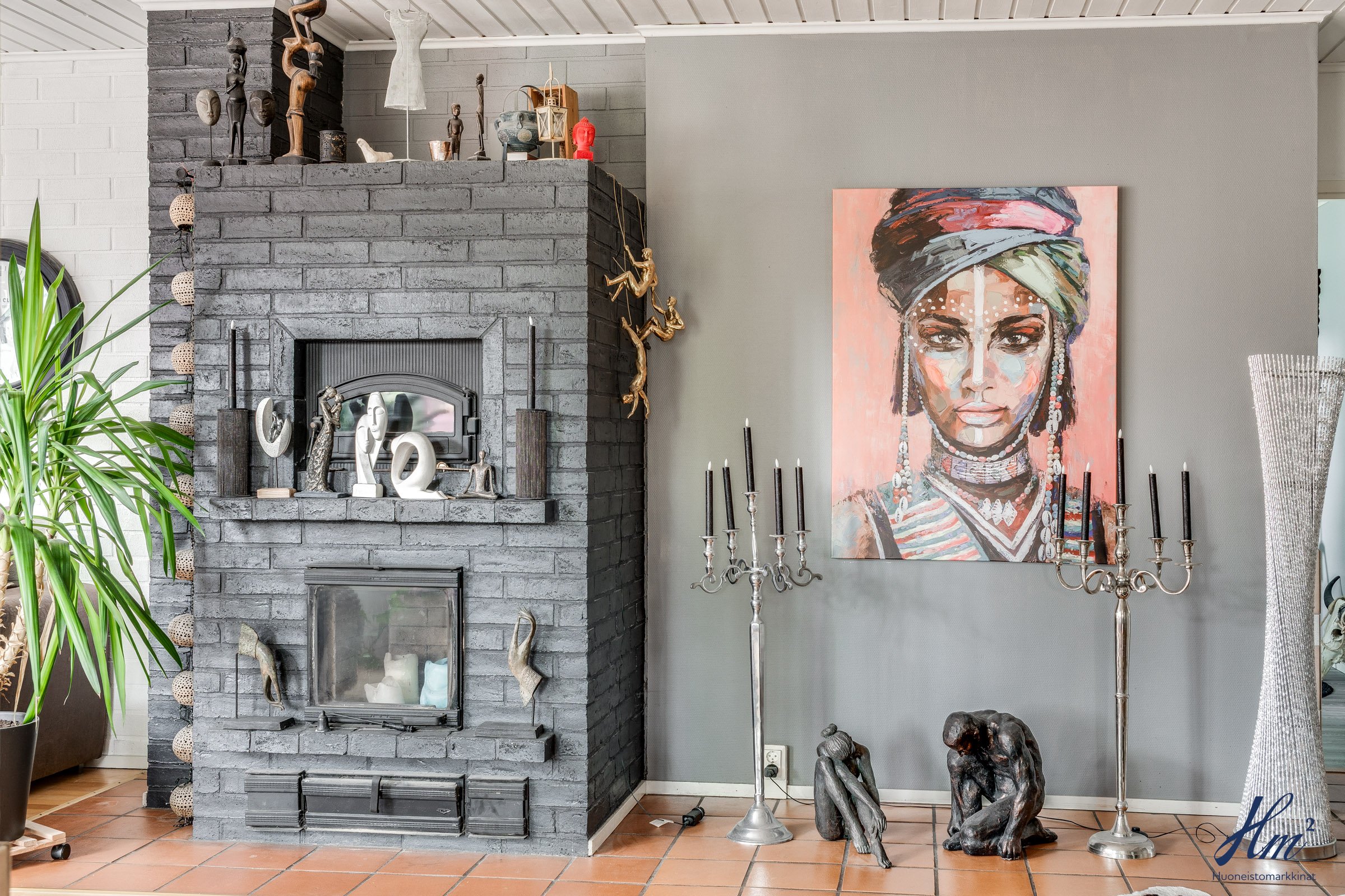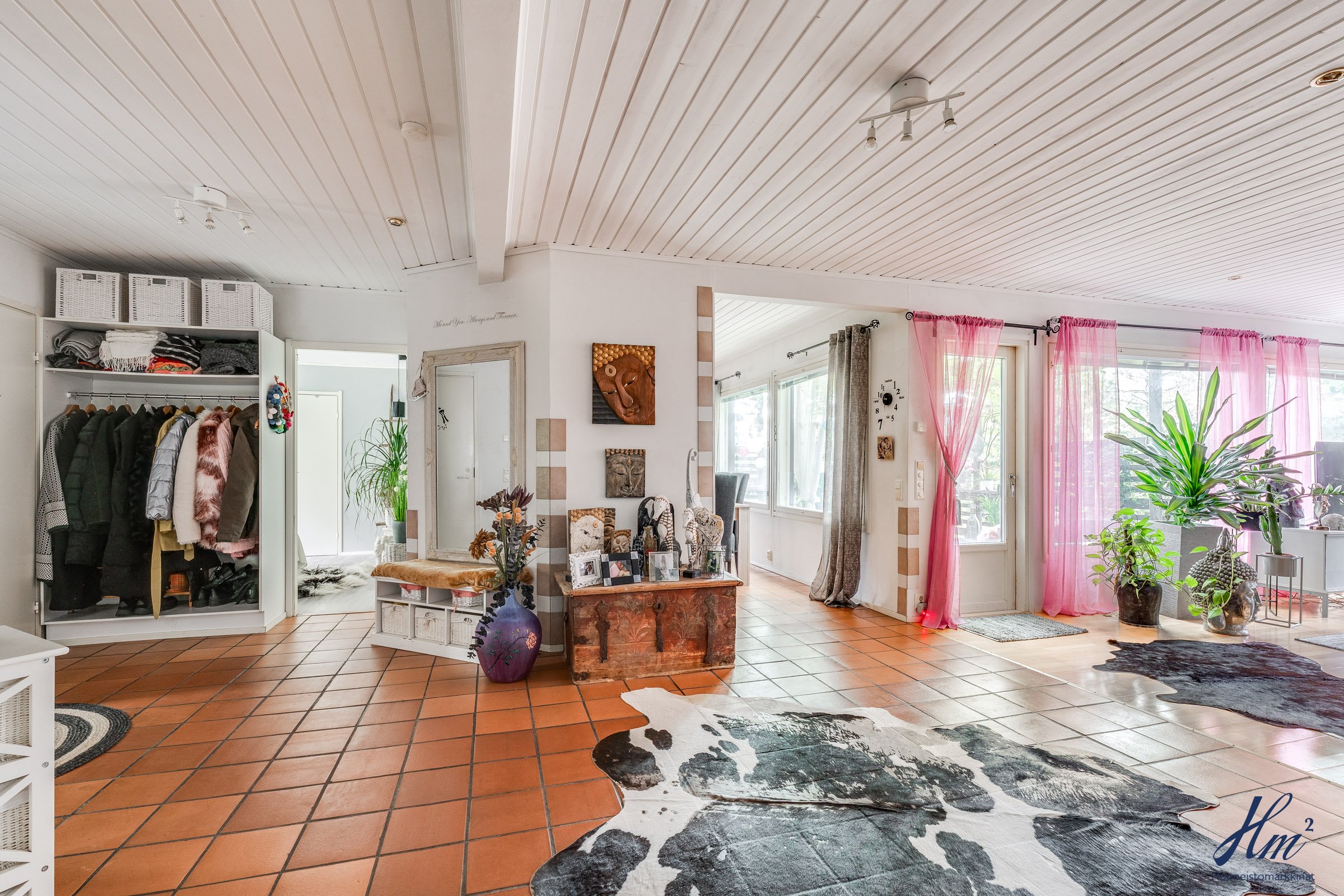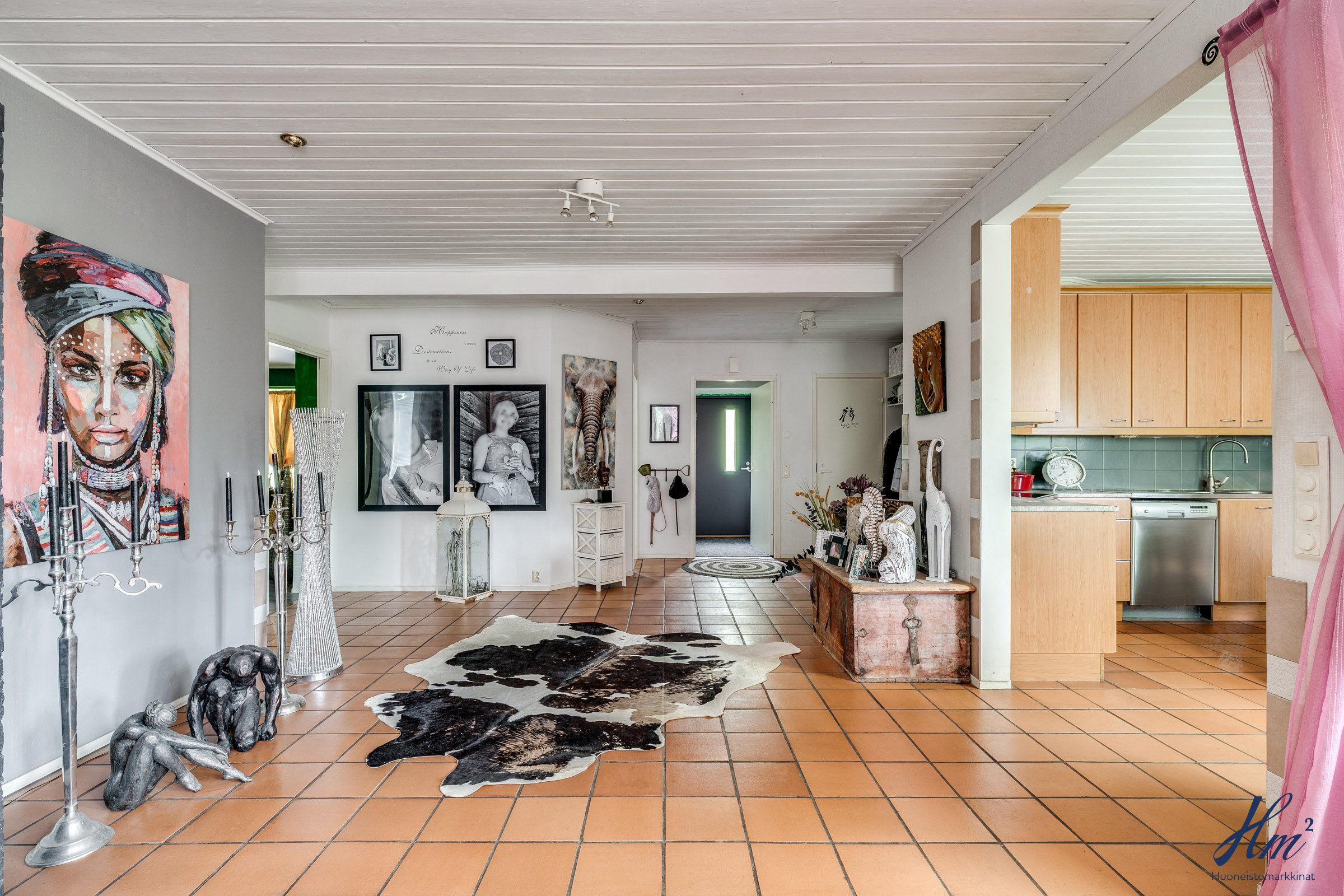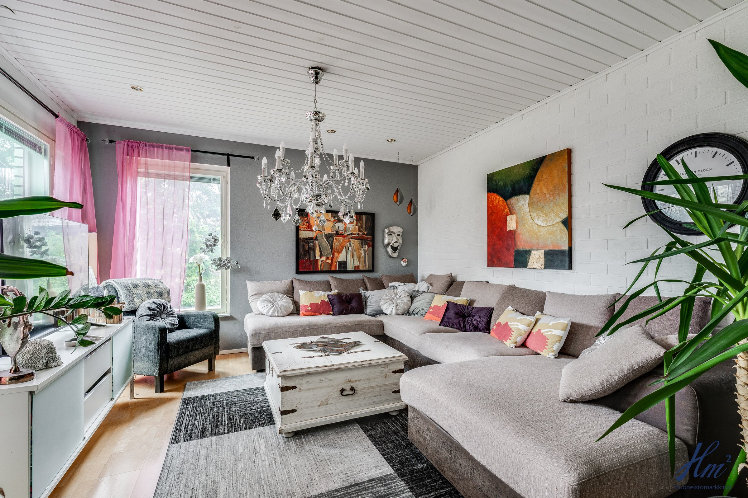 Olohuoneen lattiapinta on osin laattaa ja osin parkettia. Seinäpinnat osin tiiltä ja osin tapetoitu, tai maalattu. Olohuoneessa massiivinen takka sekä kulku katetulle terassille.