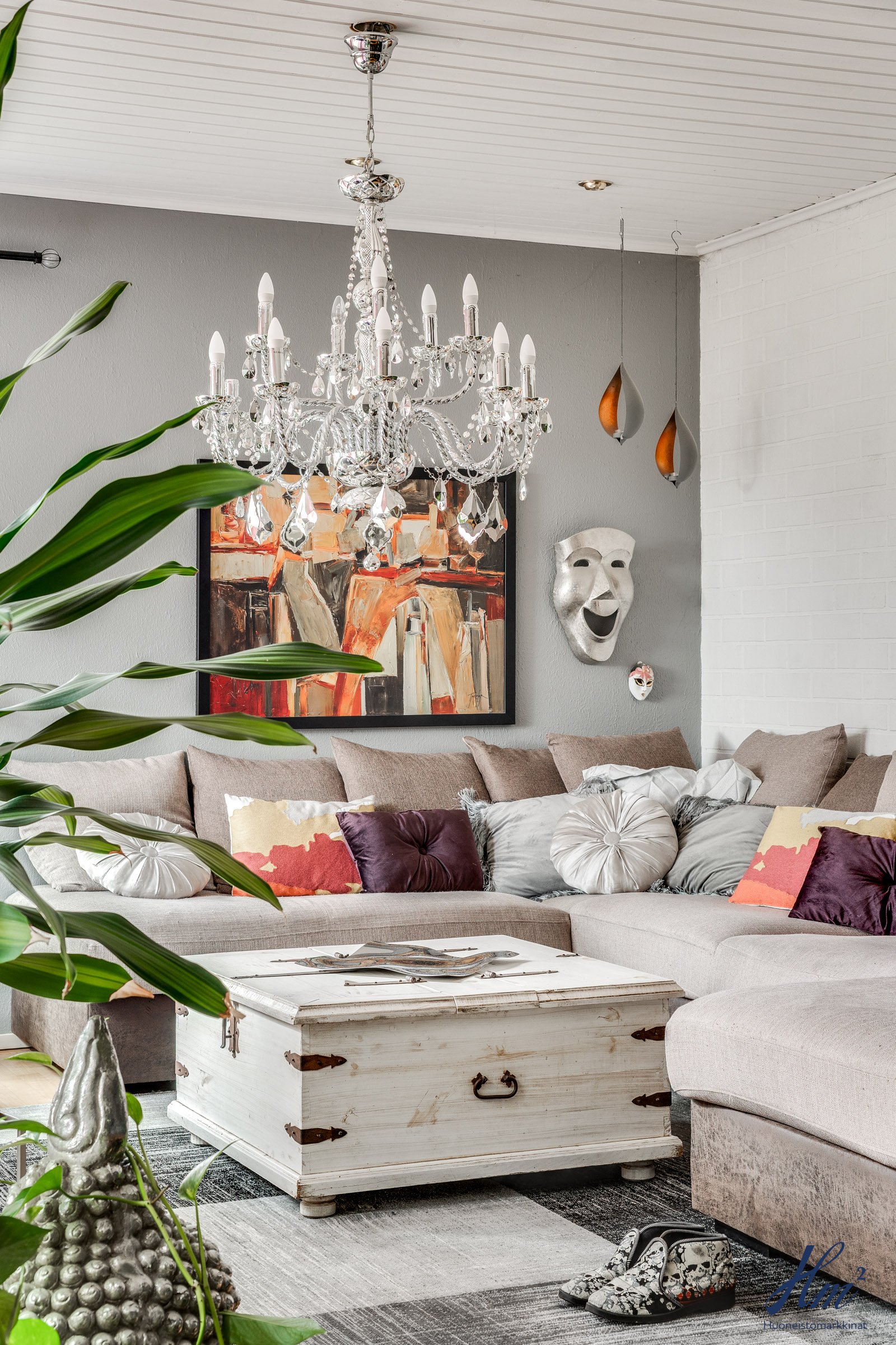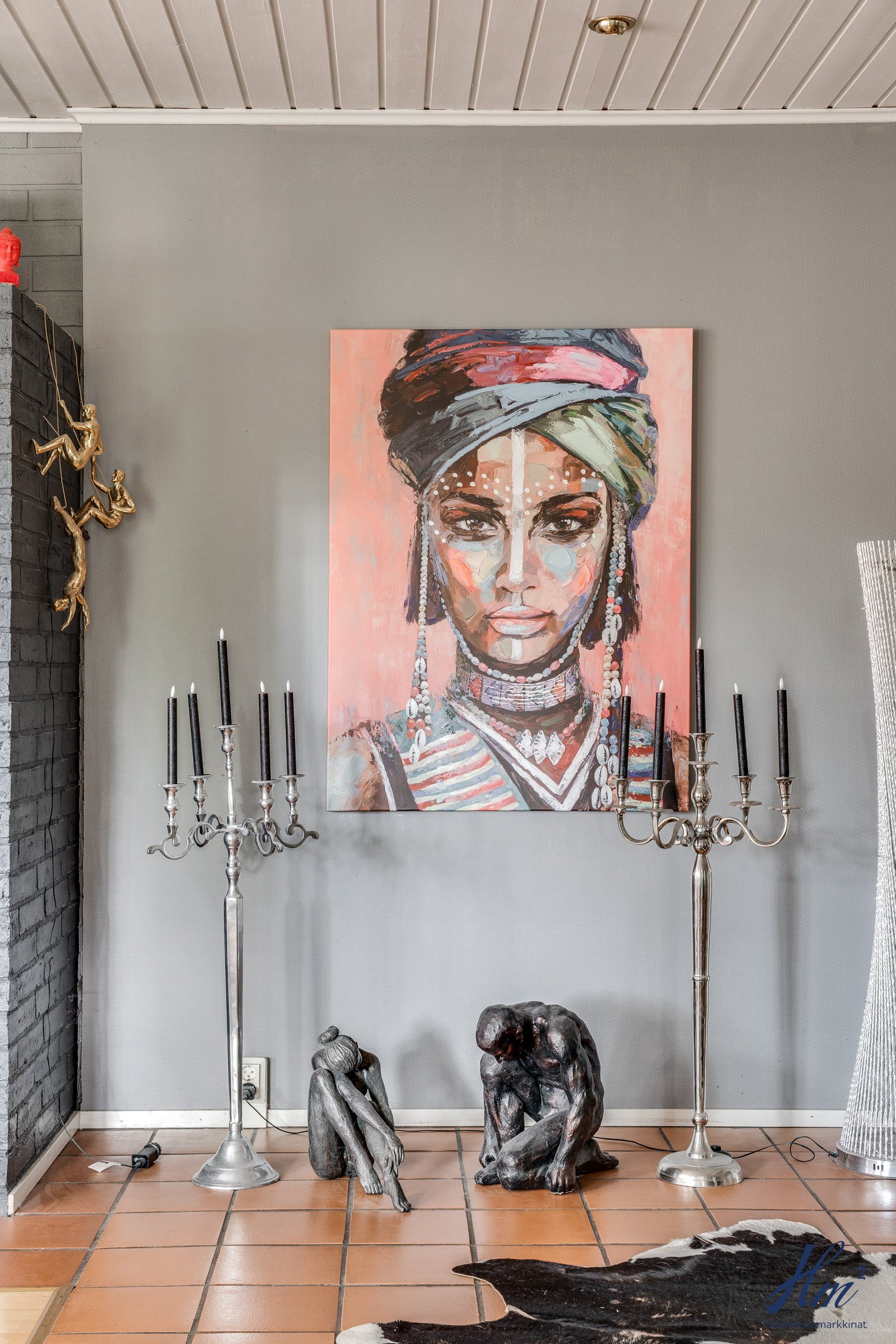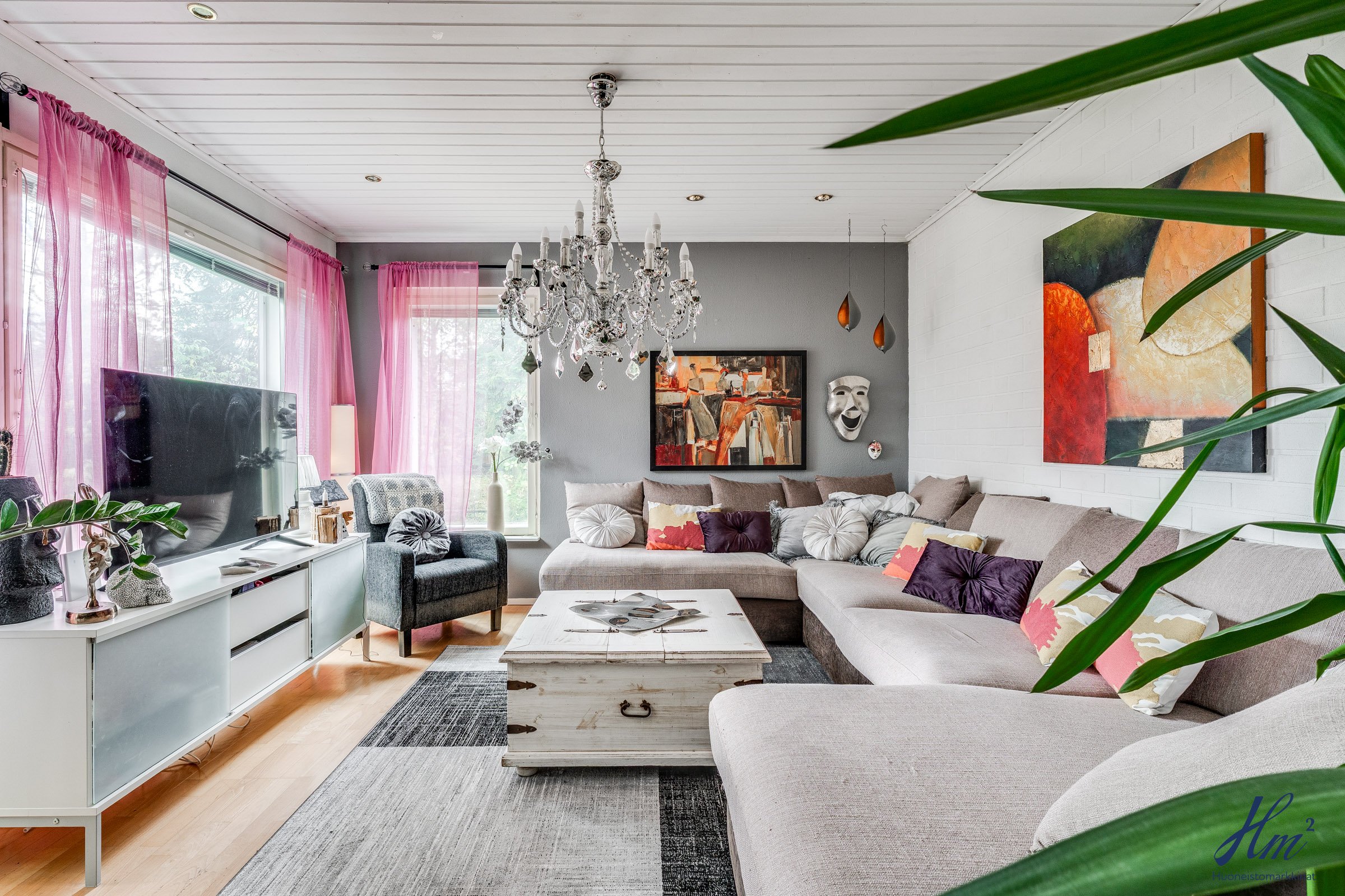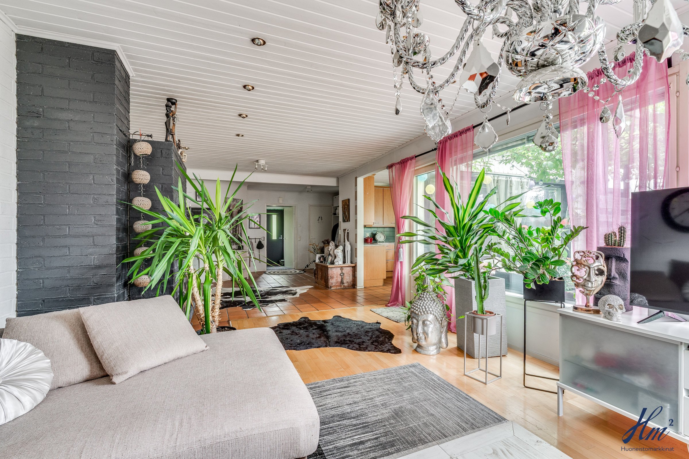 Olohuoneen lattiapinta on osin laattaa ja osin parkettia. Seinäpinnat osin tiiltä ja osin tapetoitu, tai maalattu. Olohuoneessa massiivinen takka sekä kulku katetulle terassille.