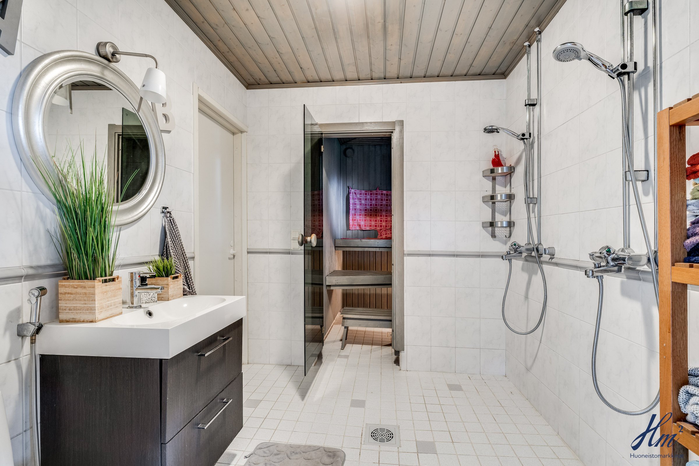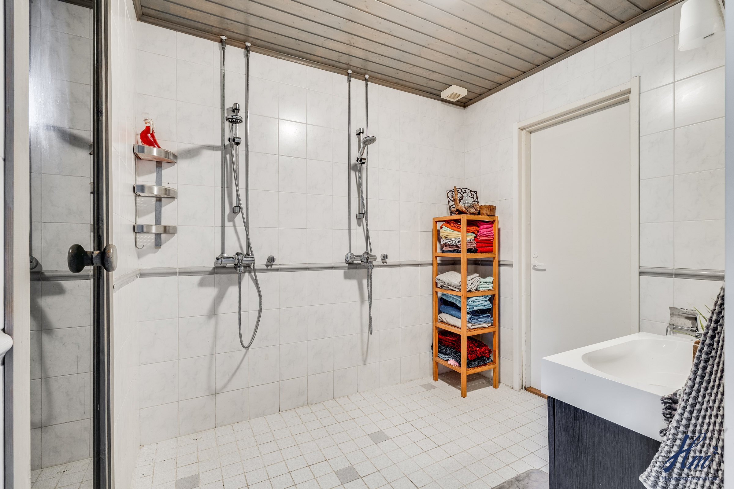kph/wc. Kokonaan laatoitettu, kaksi suihkua ja lattialämmitys.
