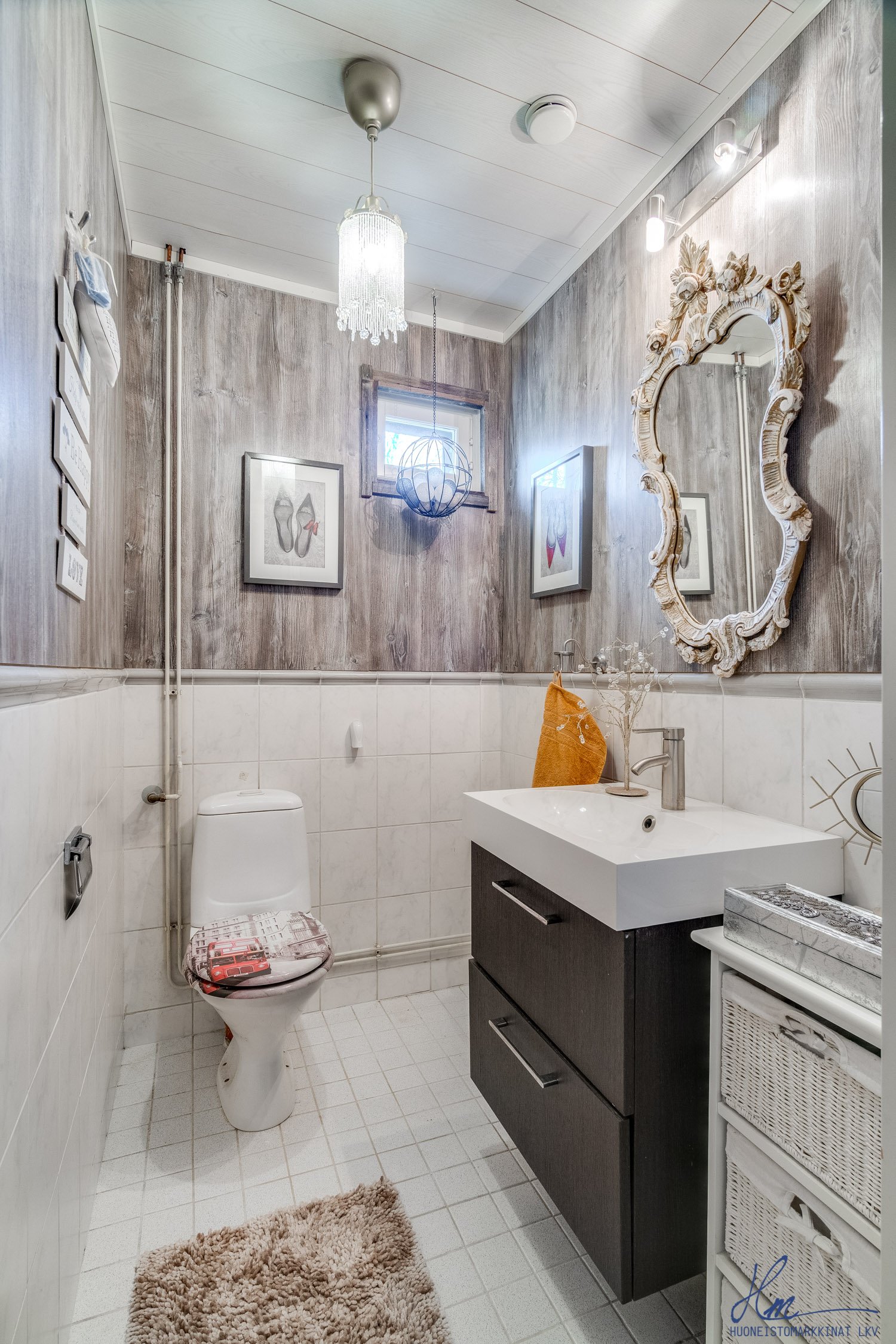 Erillinen wc. Lattia on laatoitettu ja seinäpinnat 1/2 osaa laatoitettu ja yläosa laminaattia.