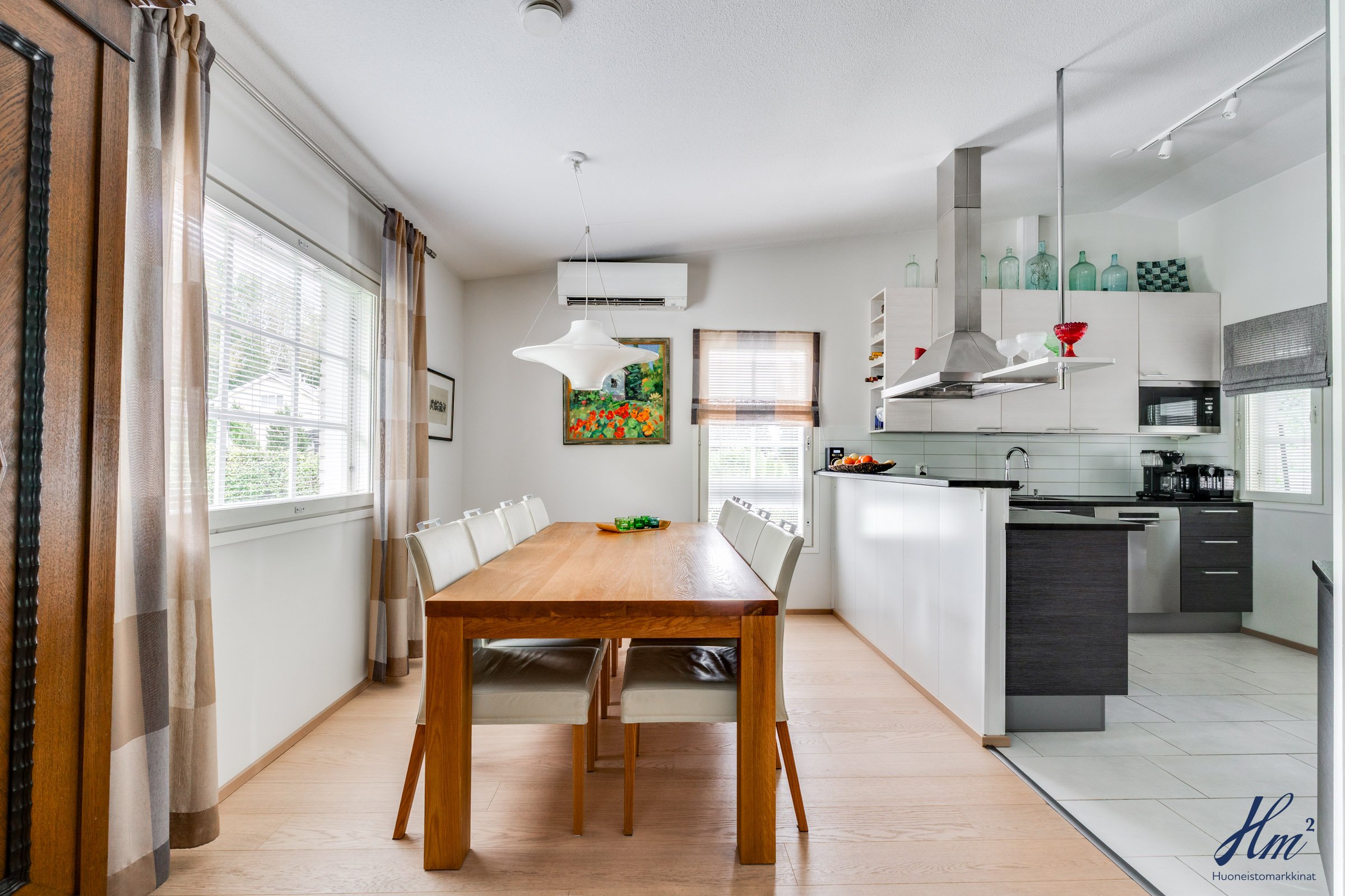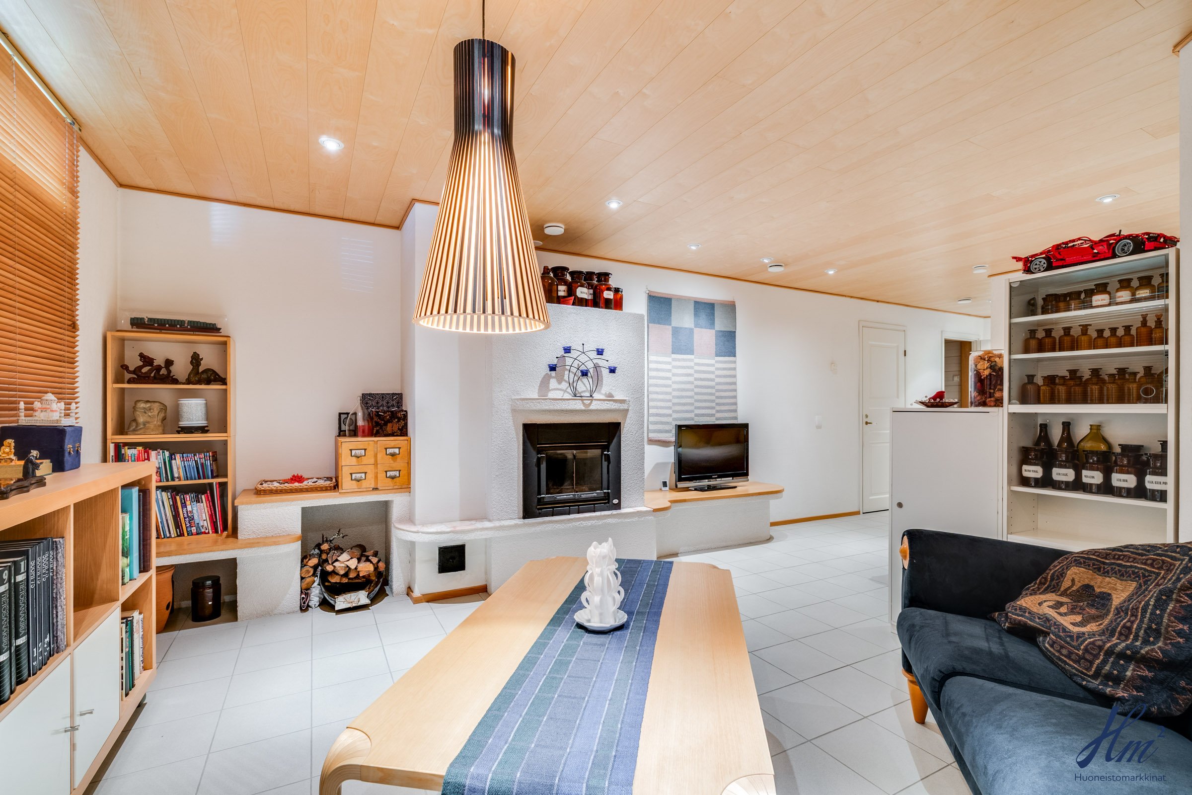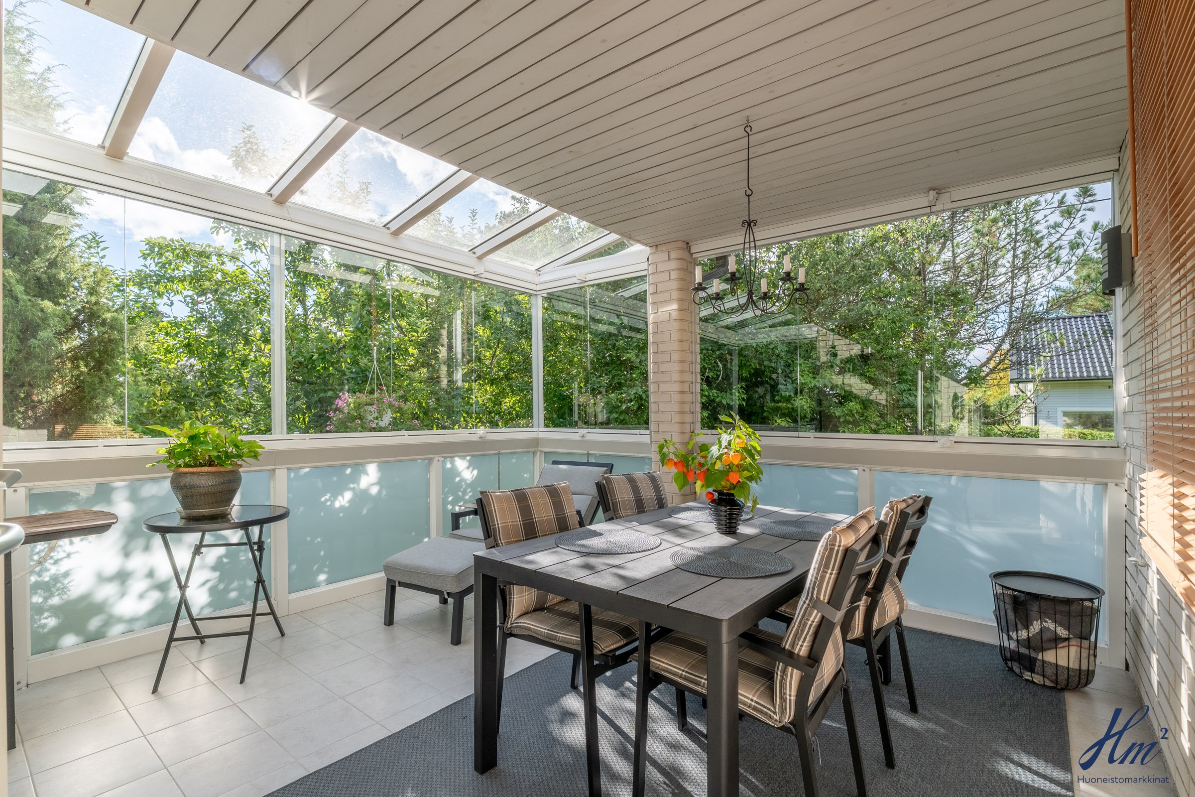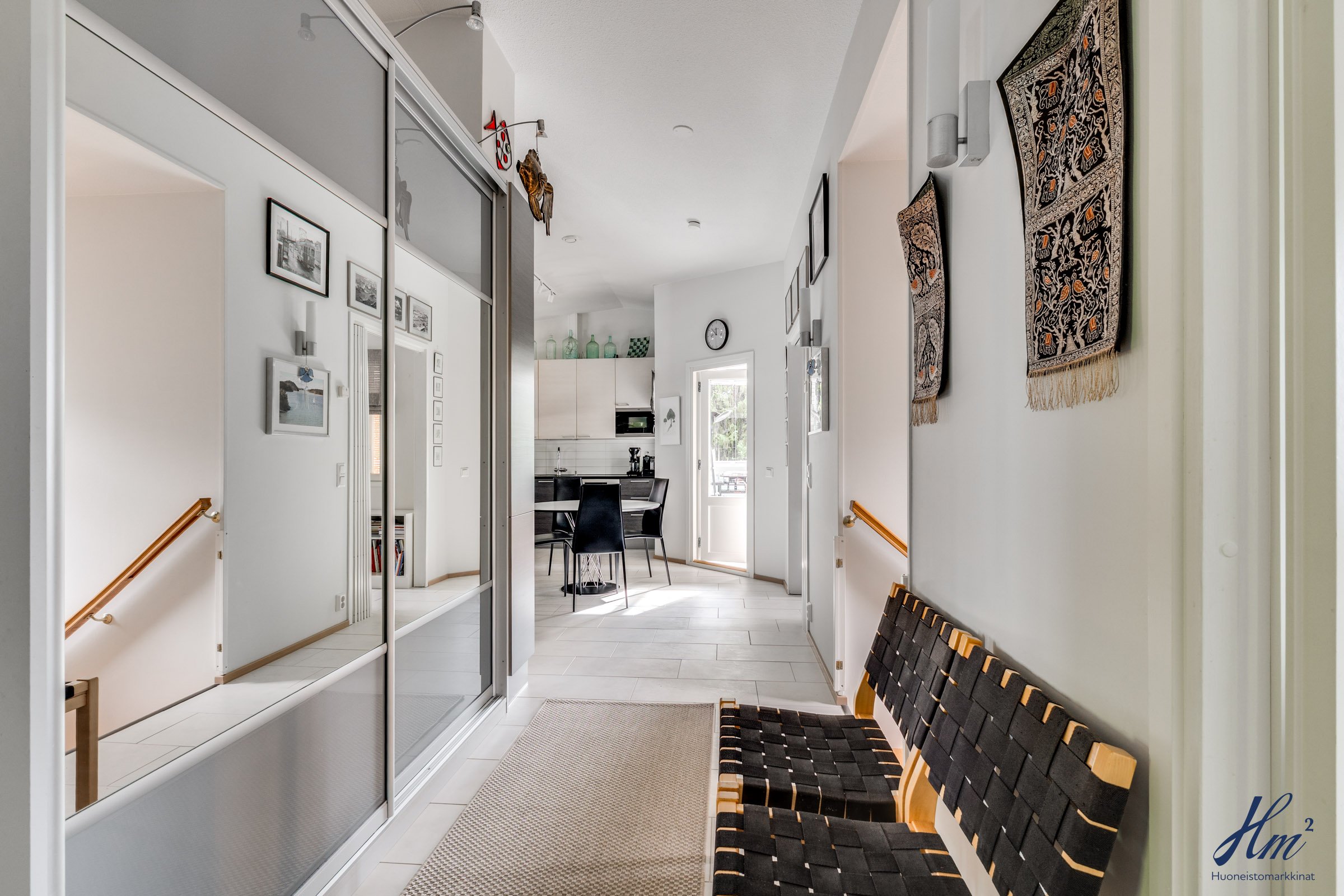 Yläkerran (n. 130 m² kerrosala) avara ja valoisa oleskelutila kutsuu viihtymään. Öljyvahattu tammiparketti luo lämpimän tunnelman, ja tilan sydän on vuonna 2009 päivitetty Puustellin tyylikäs avokeittiö. Tämä moderni keittiö yhdistyy saumattomasti ruokailutilaan ja olohuoneeseen, muodostaen kodikkaan ja toimivan kokonaisuuden niin arkeen kuin juhlaan. Suoraan keittiöstä on käynti katetulle ja lasitetulle terassille, jossa voit nauttia ulkoilmasta sateisenakin päivinä ja viilentyvinä syysiltoina.