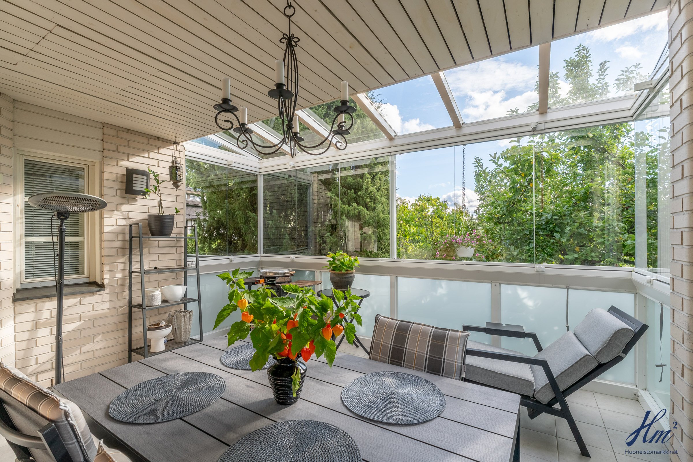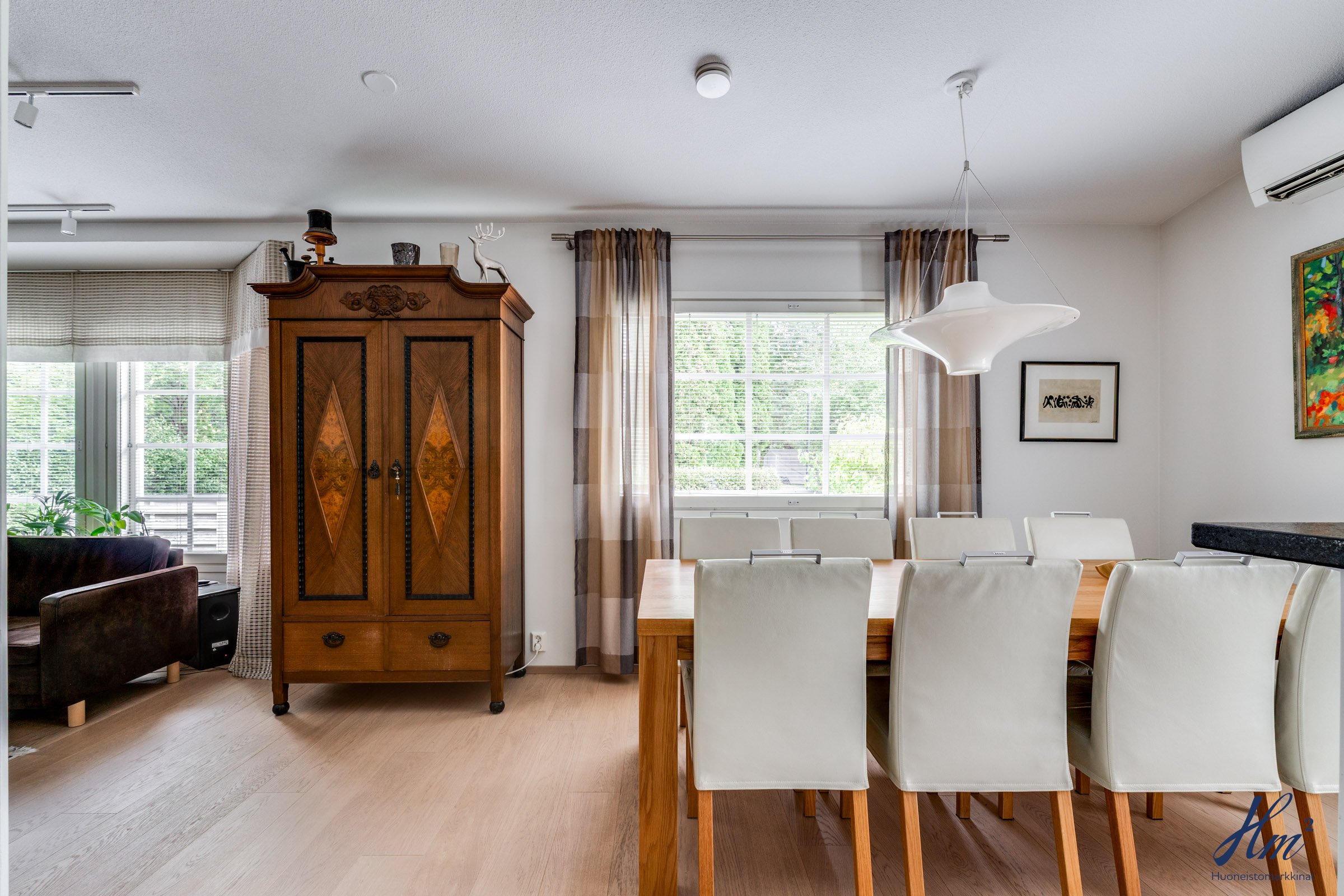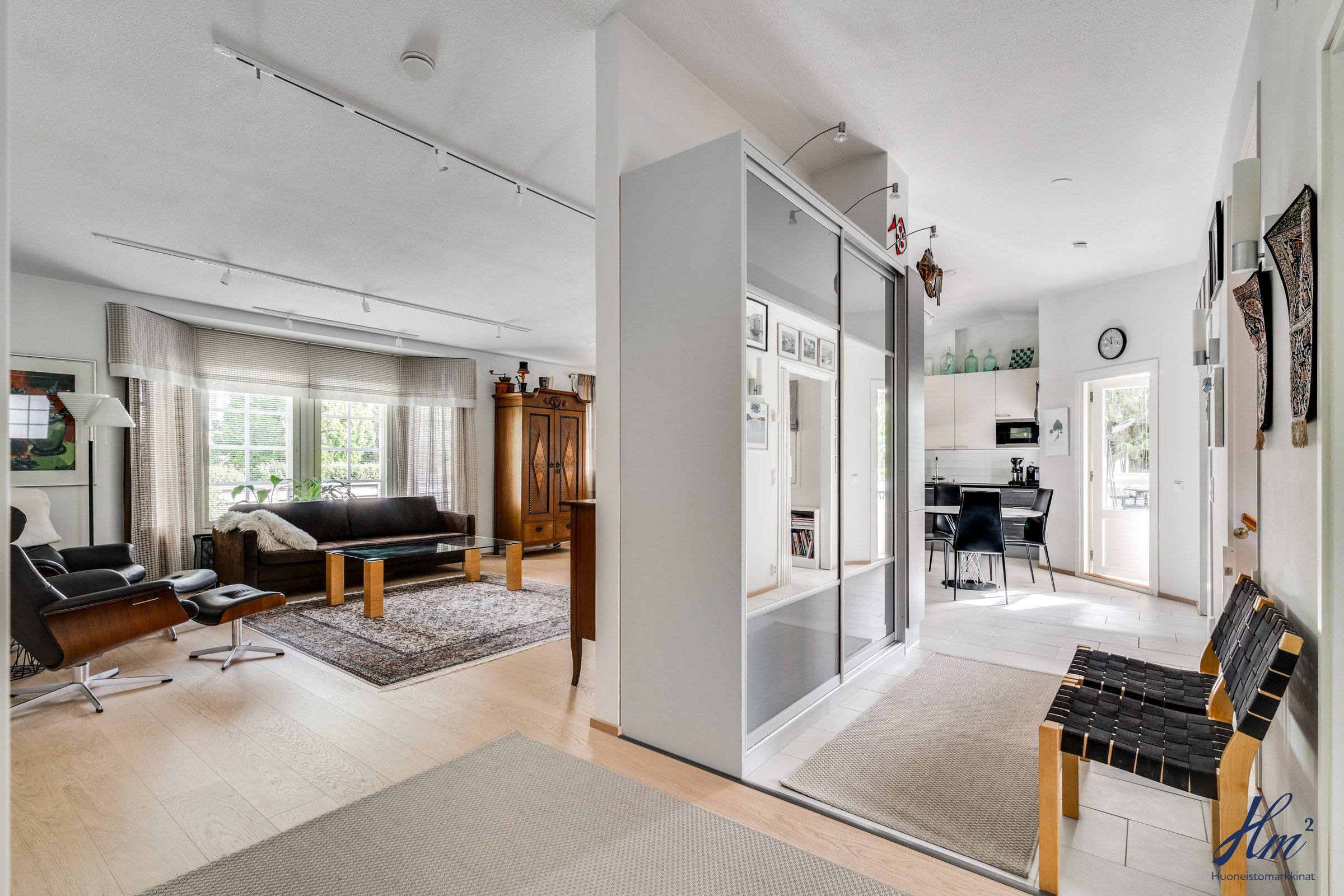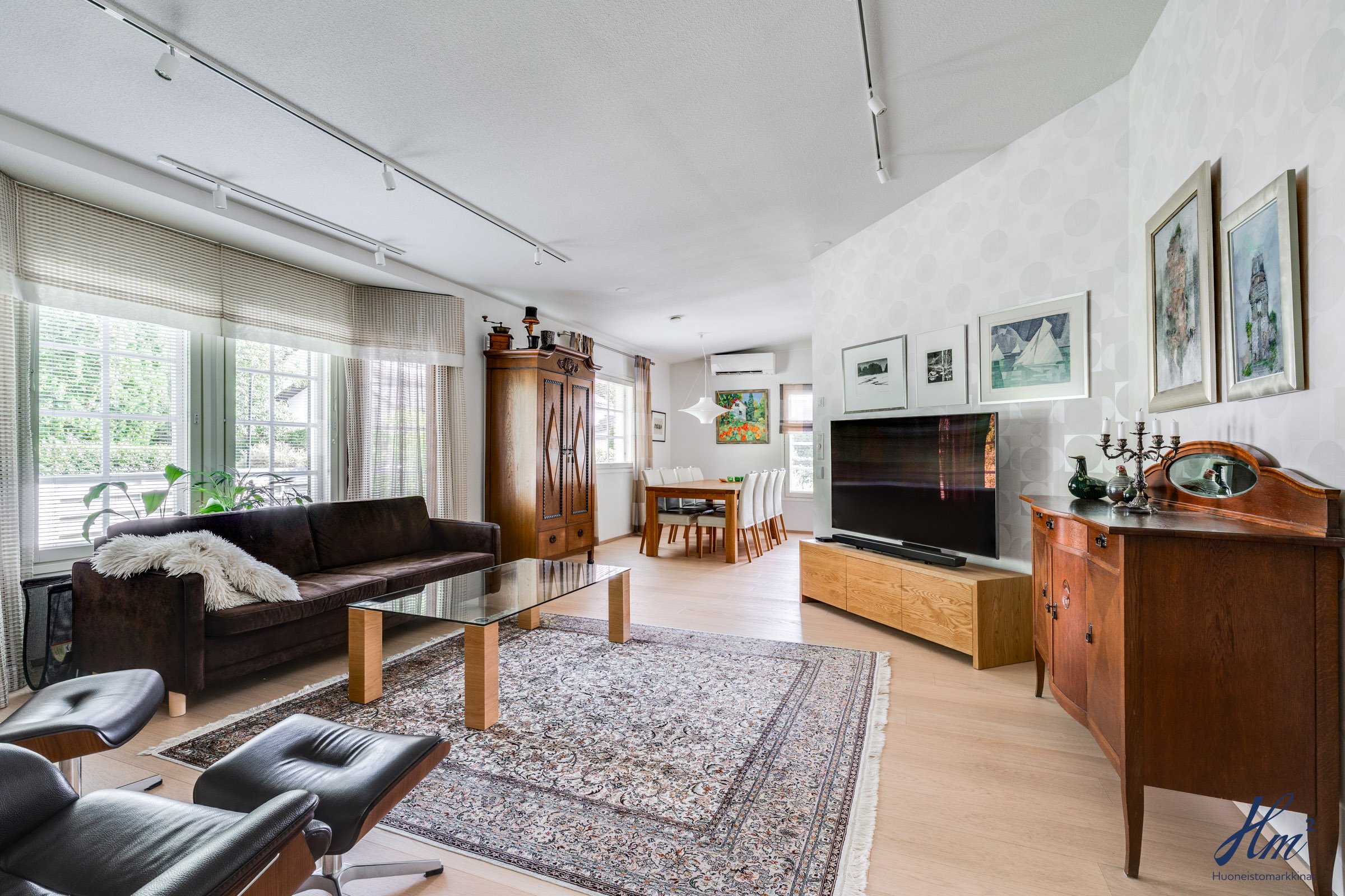 Yläkerran (n. 130 m² kerrosala) avara ja valoisa oleskelutila kutsuu viihtymään. Öljyvahattu tammiparketti luo lämpimän tunnelman, ja tilan sydän on vuonna 2009 päivitetty Puustellin tyylikäs avokeittiö. Tämä moderni keittiö yhdistyy saumattomasti ruokailutilaan ja olohuoneeseen, muodostaen kodikkaan ja toimivan kokonaisuuden niin arkeen kuin juhlaan. Suoraan keittiöstä on käynti katetulle ja lasitetulle terassille, jossa voit nauttia ulkoilmasta sateisenakin päivinä ja viilentyvinä syysiltoina.