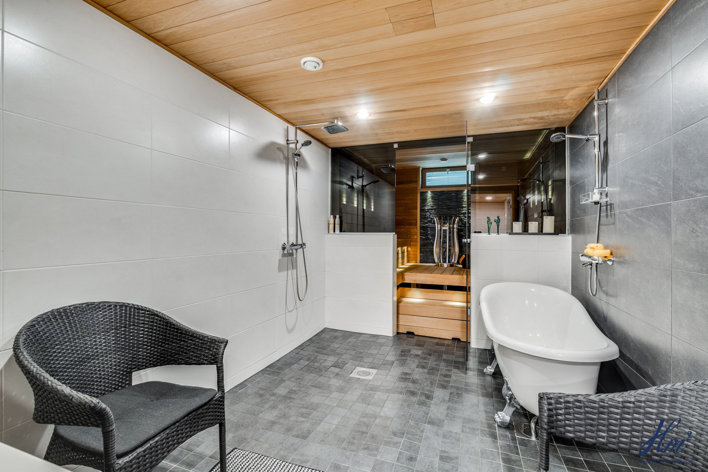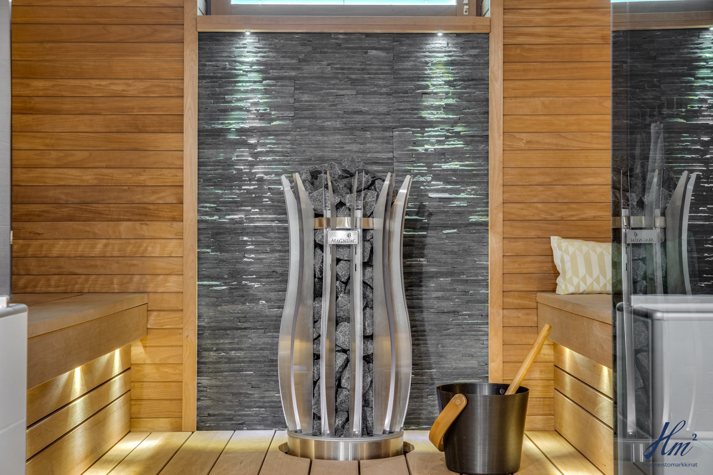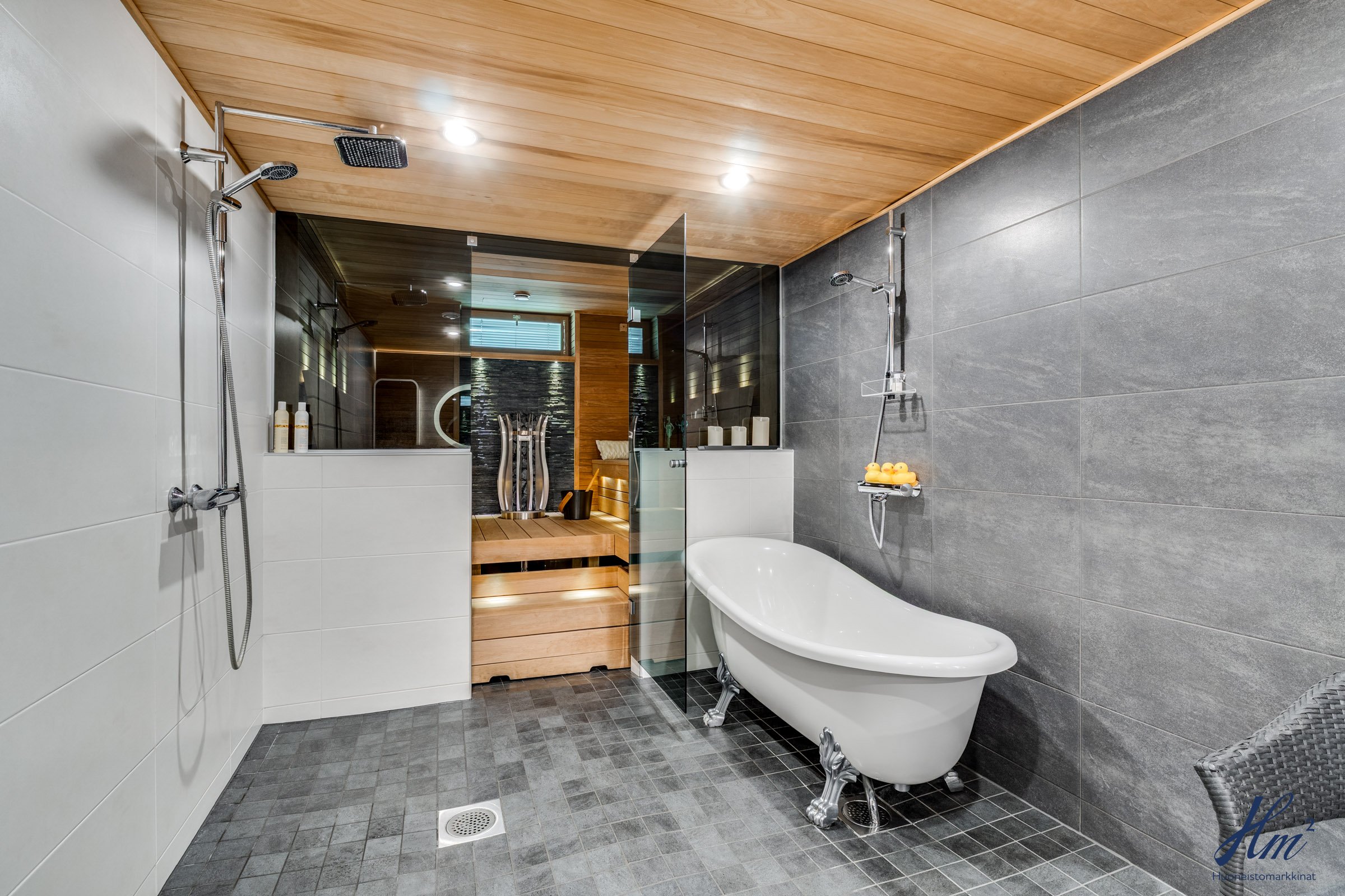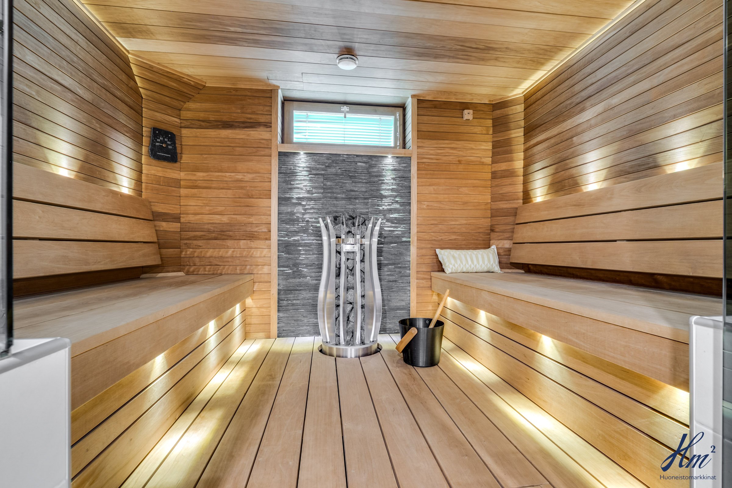 Kodin kellarikerros (n. 98 m² kerrosala) tarjoaa monipuolista lisätilaa arkeen ja vapaa-aikaan. Vuonna 2015 uusittu kylpyhuone ja saunaosasto muodostavat ylellisen spa-osaston, jossa rentoudut kauniissa tassuammeessa ja nautit upean saunan lämpimistä löylyistä. Kellarista löydät myös takkahuoneen tunnelmallisiin iltoihin, pukuhuoneen sekä runsaasti säilytystilaa.