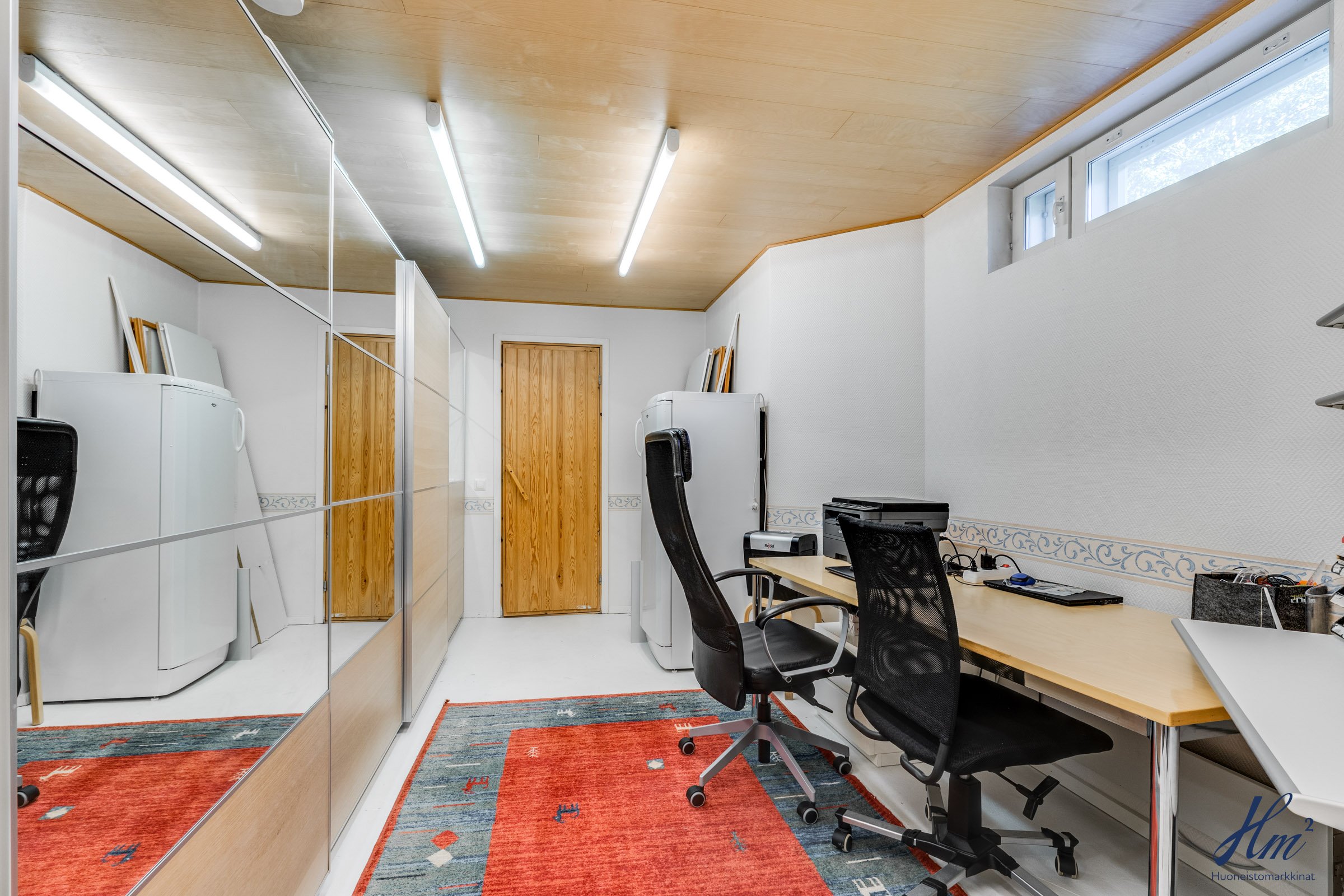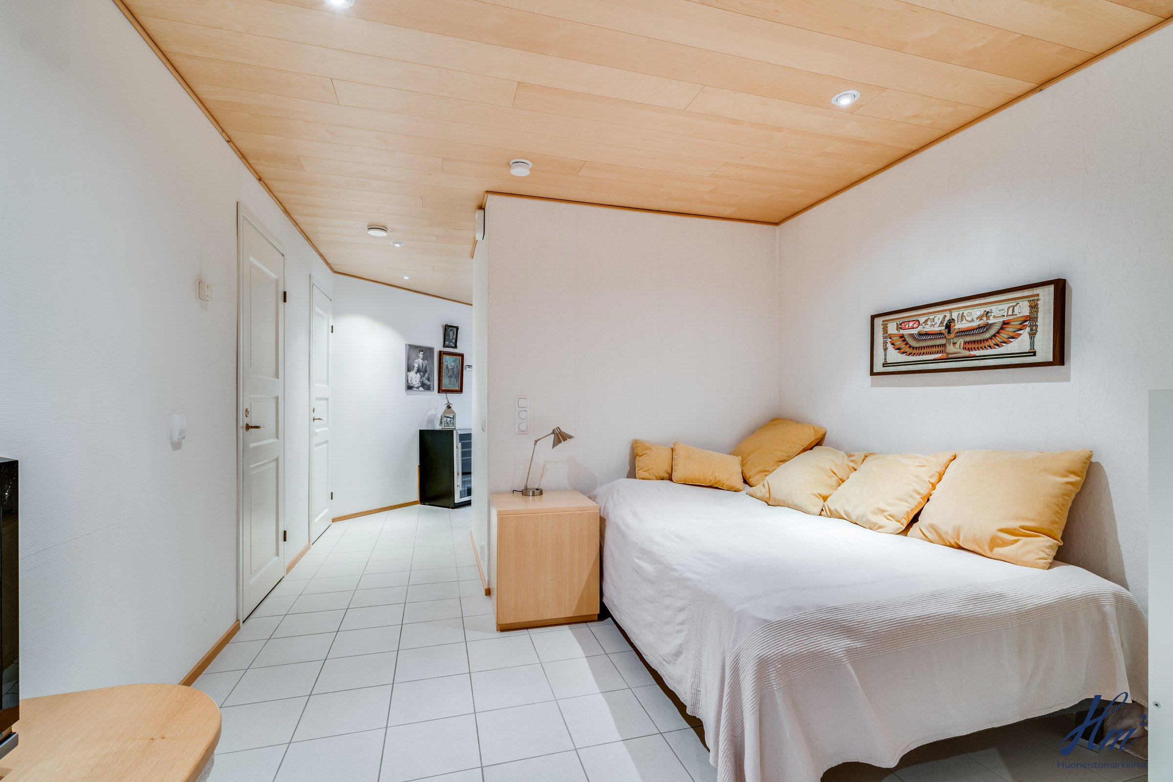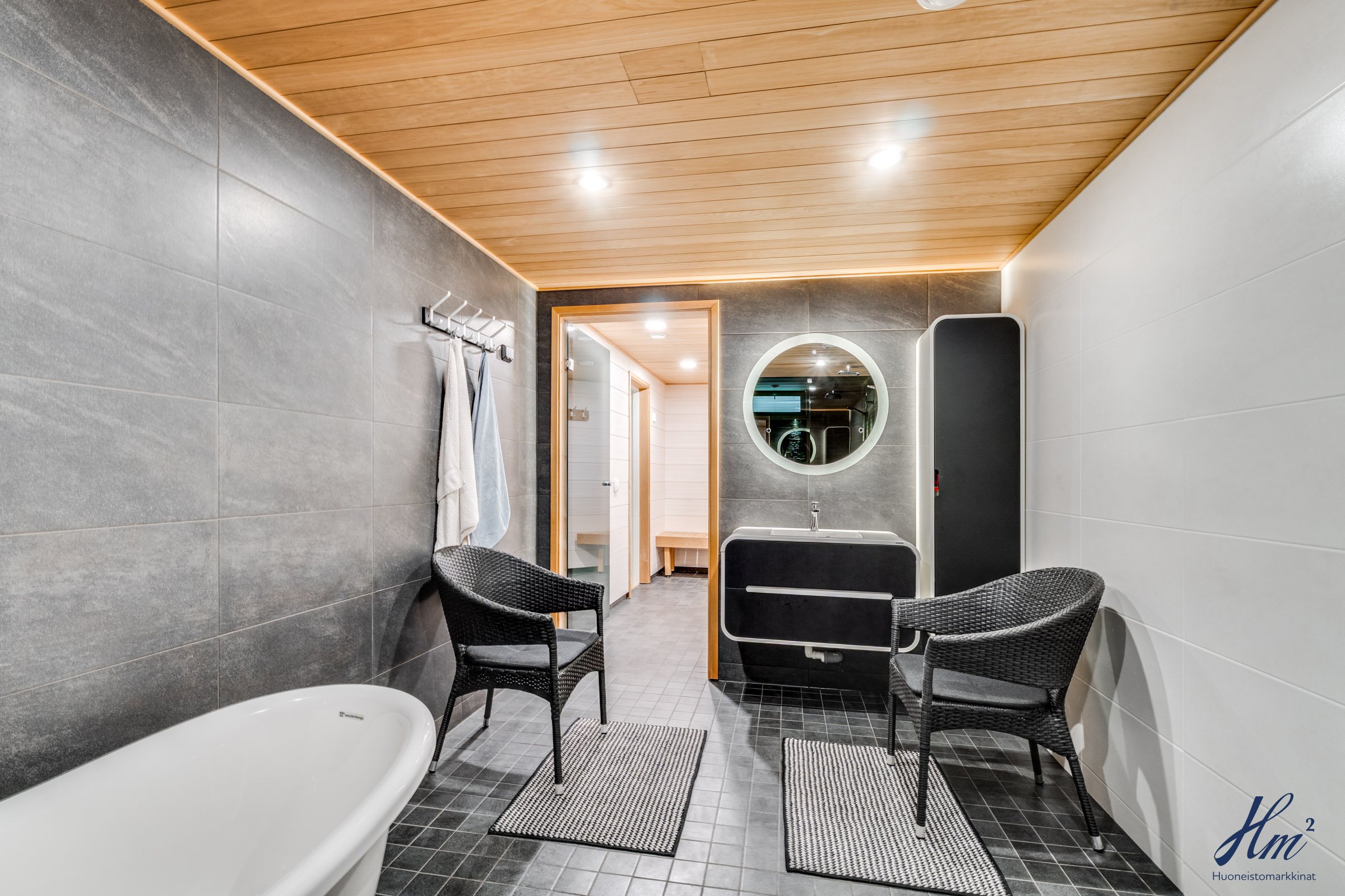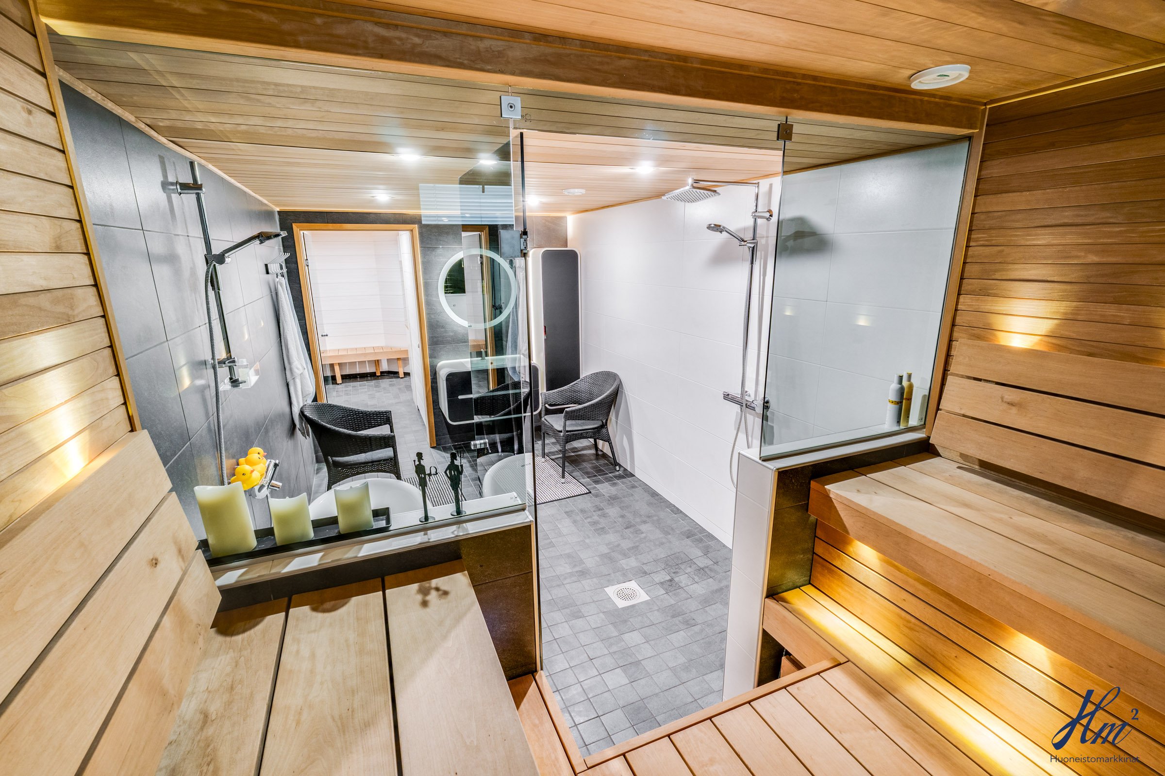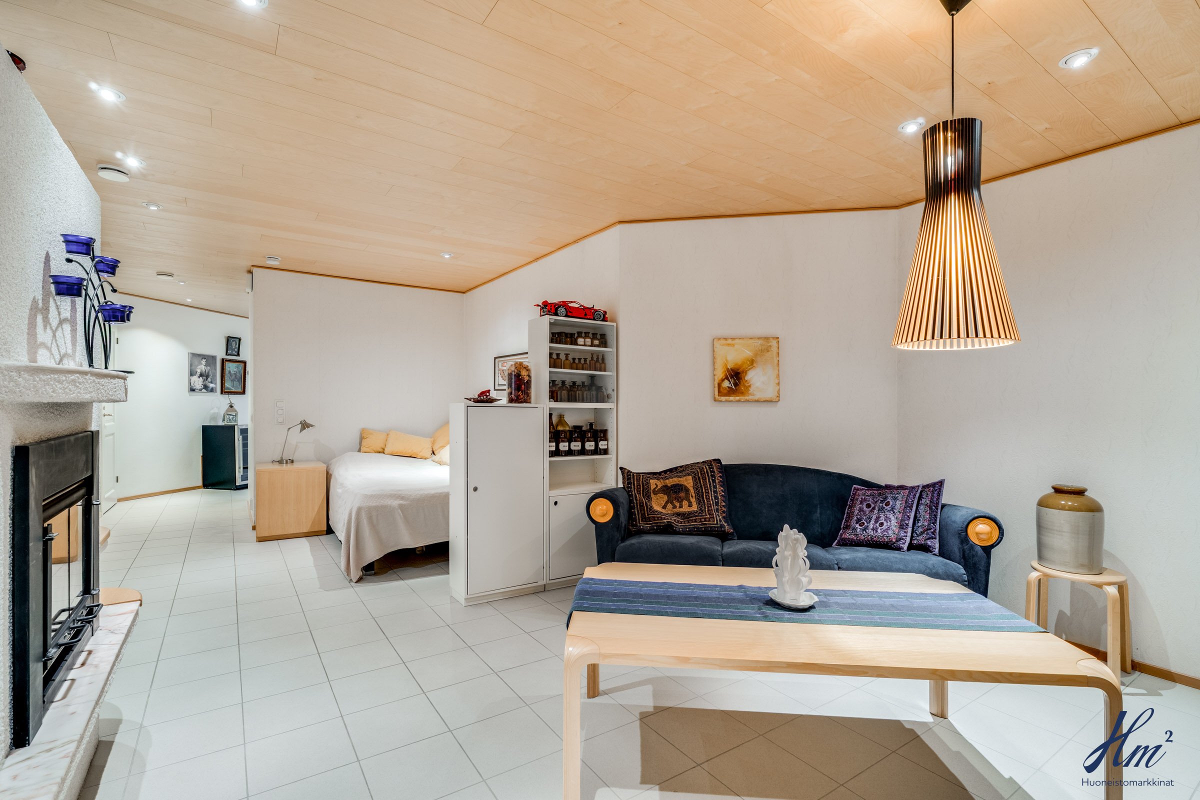 Kodin kellarikerros (n. 98 m² kerrosala) tarjoaa monipuolista lisätilaa arkeen ja vapaa-aikaan. Vuonna 2015 uusittu kylpyhuone ja saunaosasto muodostavat ylellisen spa-osaston, jossa rentoudut kauniissa tassuammeessa ja nautit upean saunan lämpimistä löylyistä. Kellarista löydät myös takkahuoneen tunnelmallisiin iltoihin, pukuhuoneen sekä runsaasti säilytystilaa.