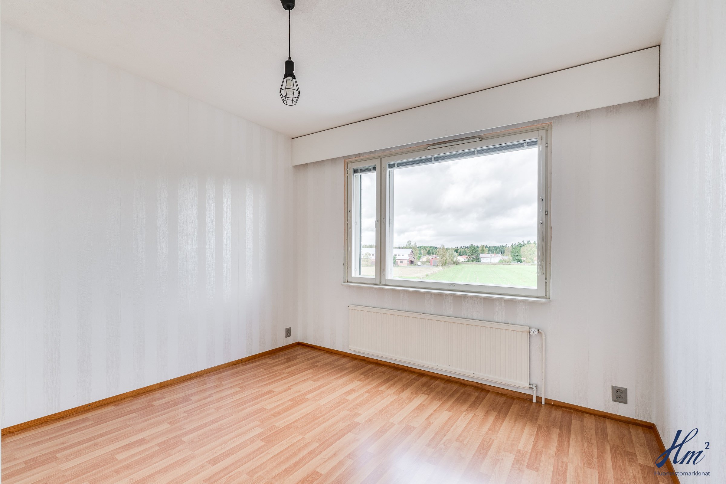 Makuuhuoneen lattiapinta on laminaattia ja seinäpinnat on tapetoitu.