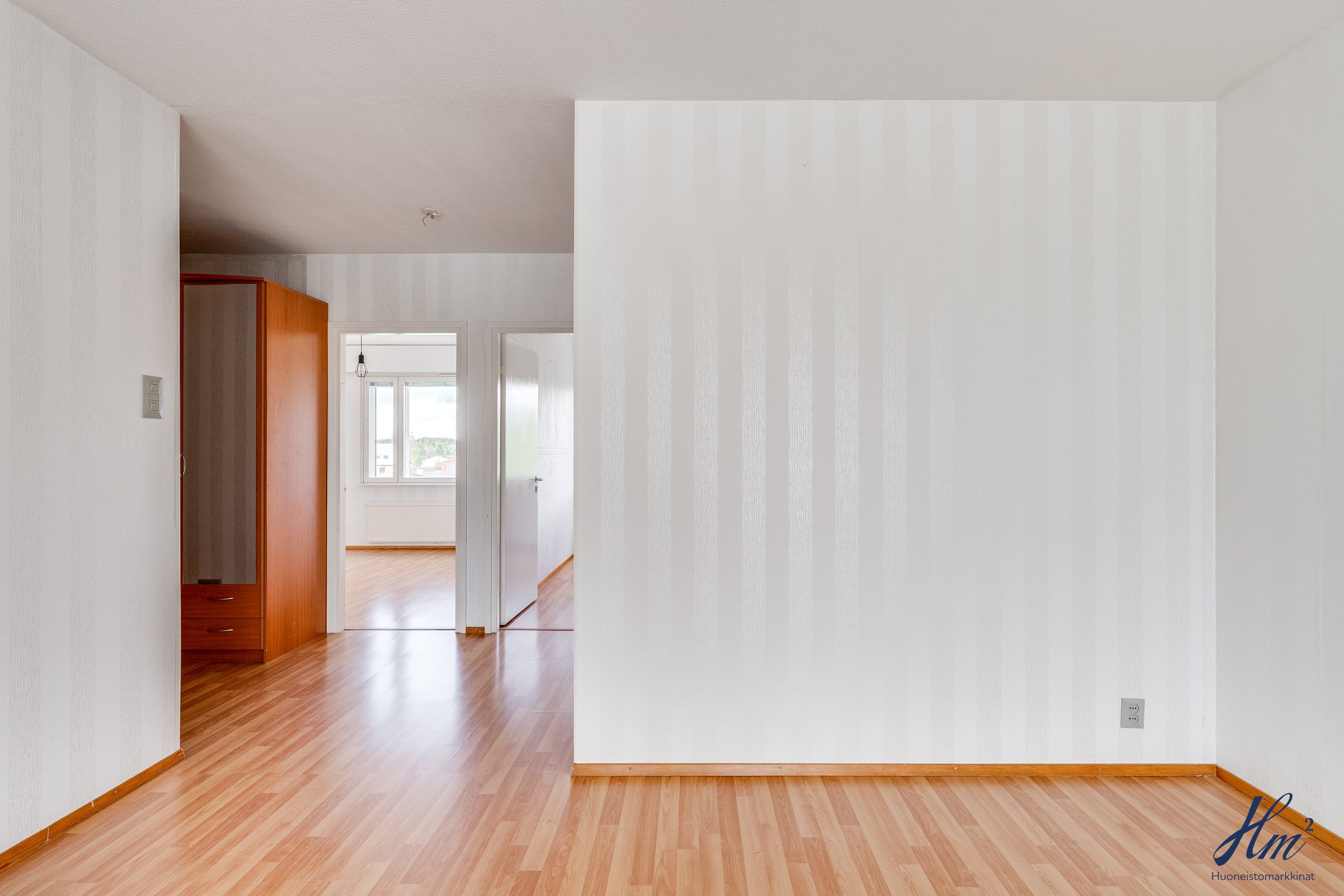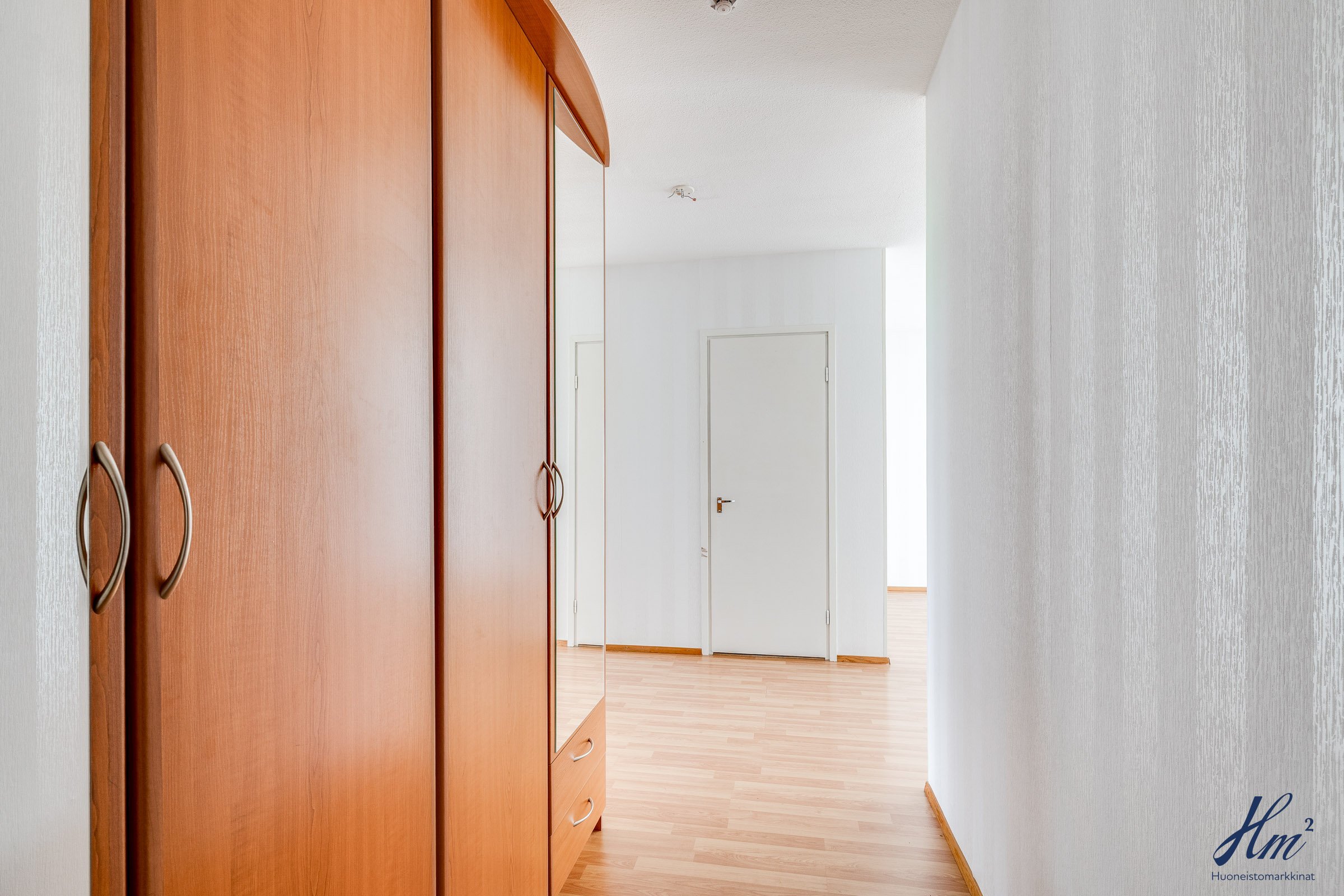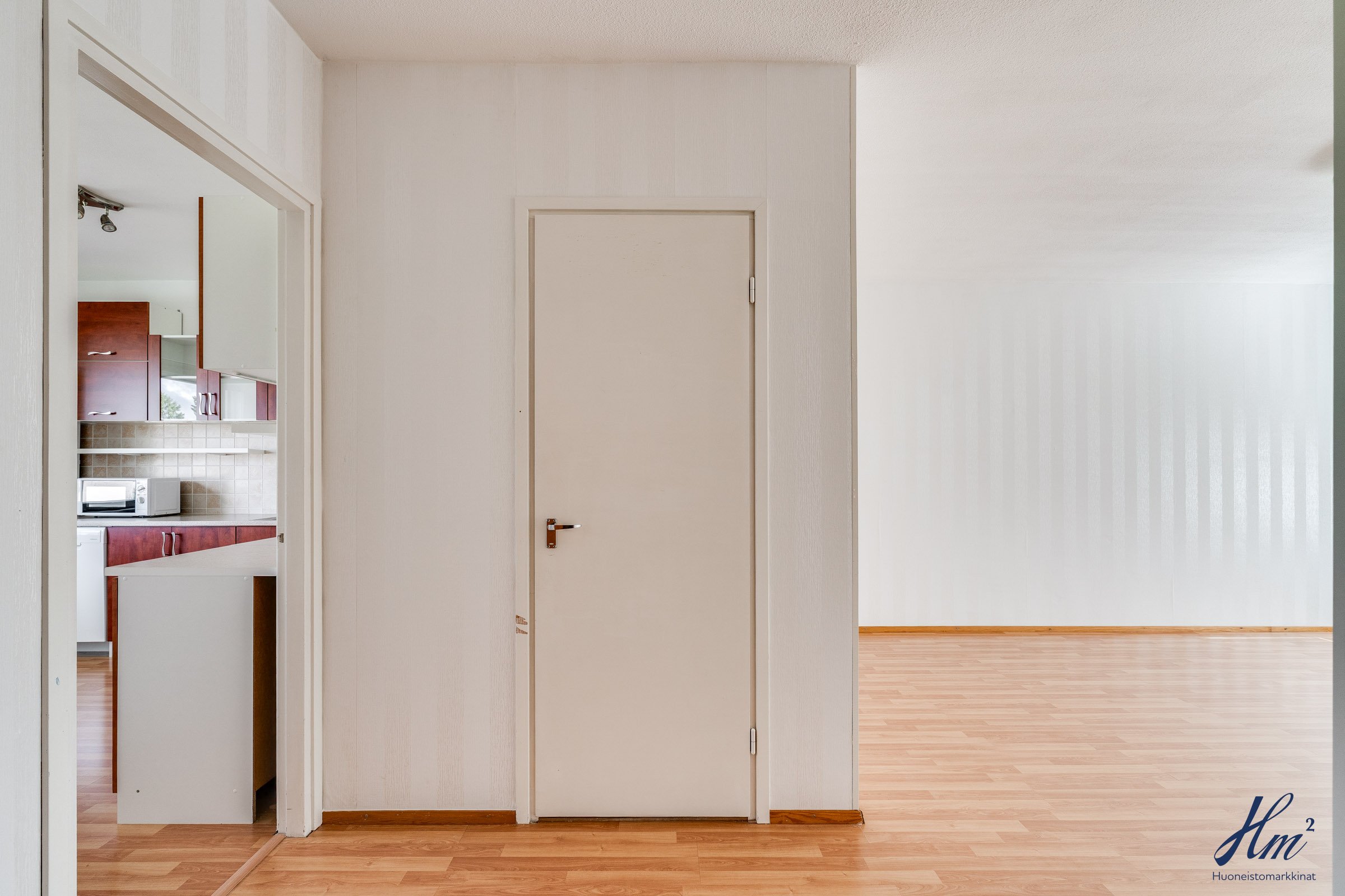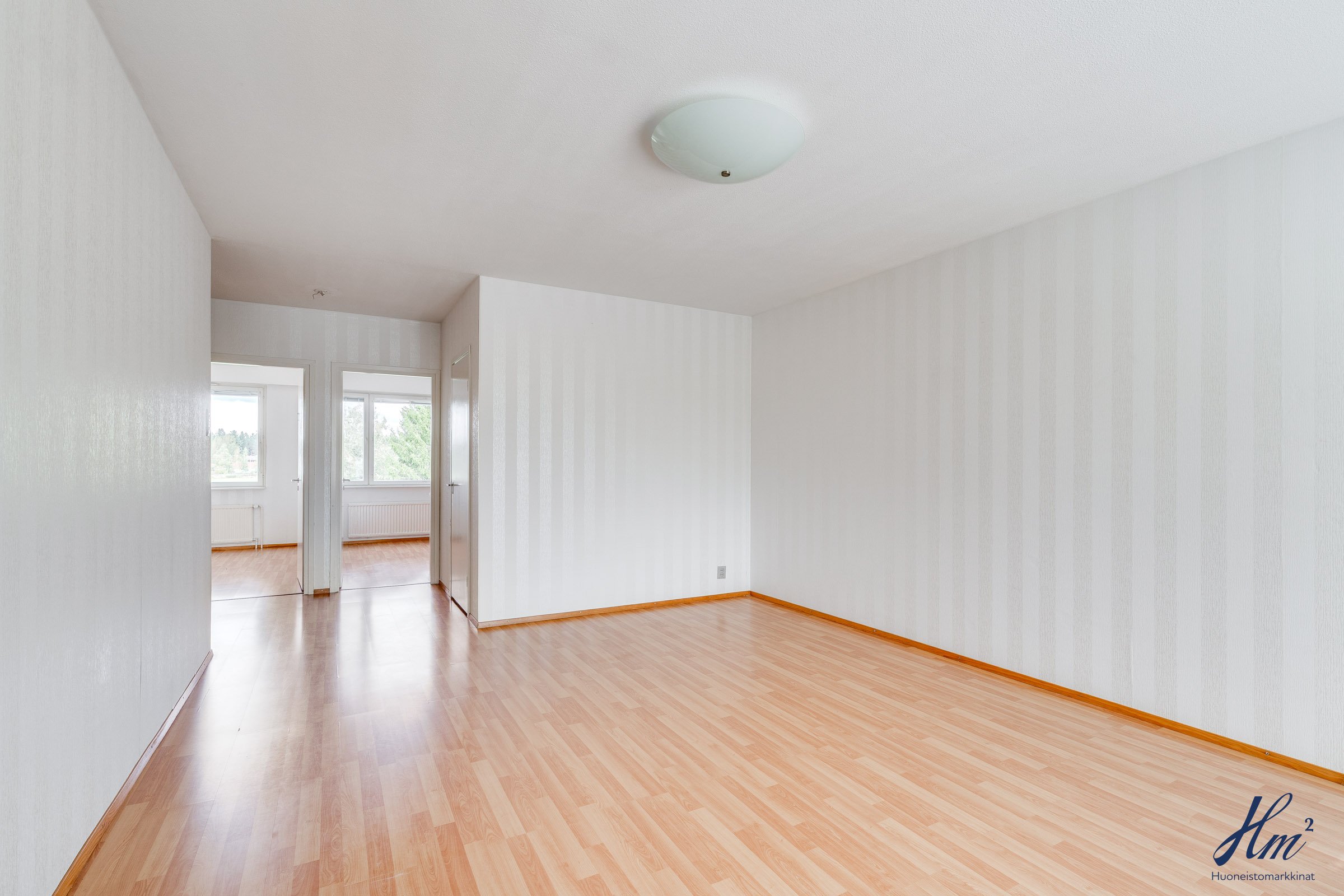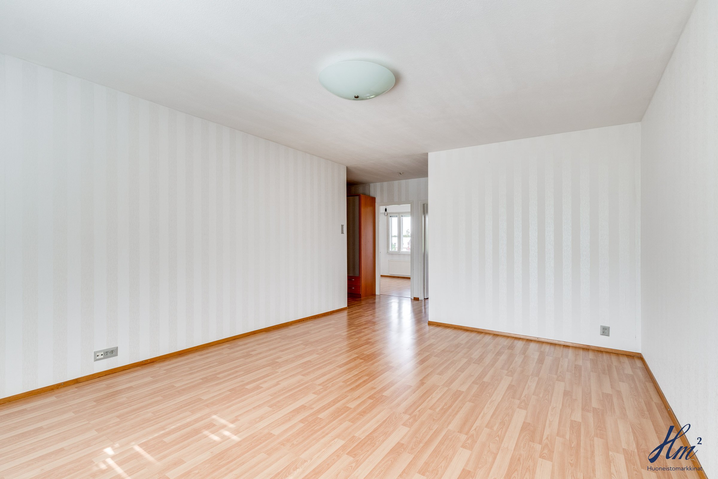 Olohuoneen lattiapinta on laminaattia ja seinäpinnat on tapetoitu. Olohuoneesta on kulku lasitetulle parvekkeelle.