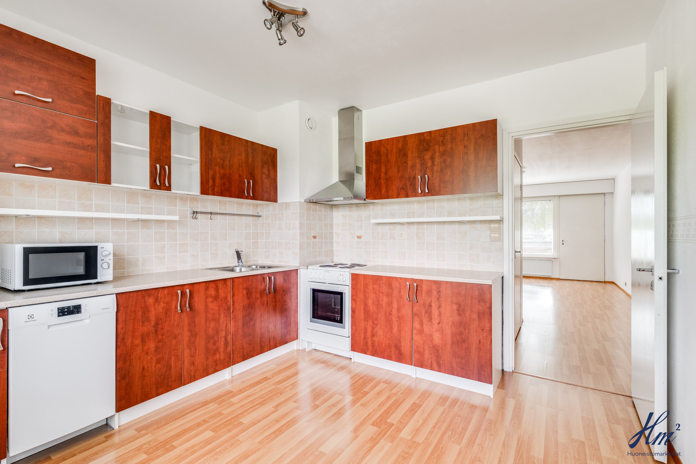 Kaapistot, sähköliesi, liesituuletin, jää-/pakastekaappi ja astianpesukone.