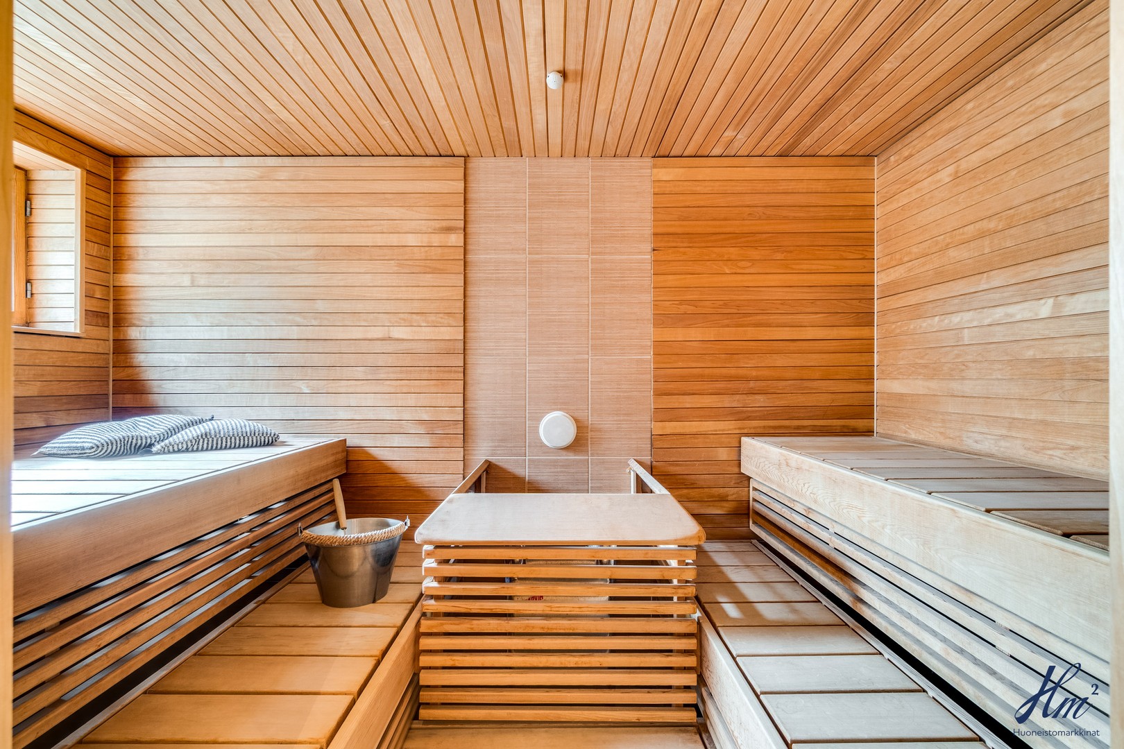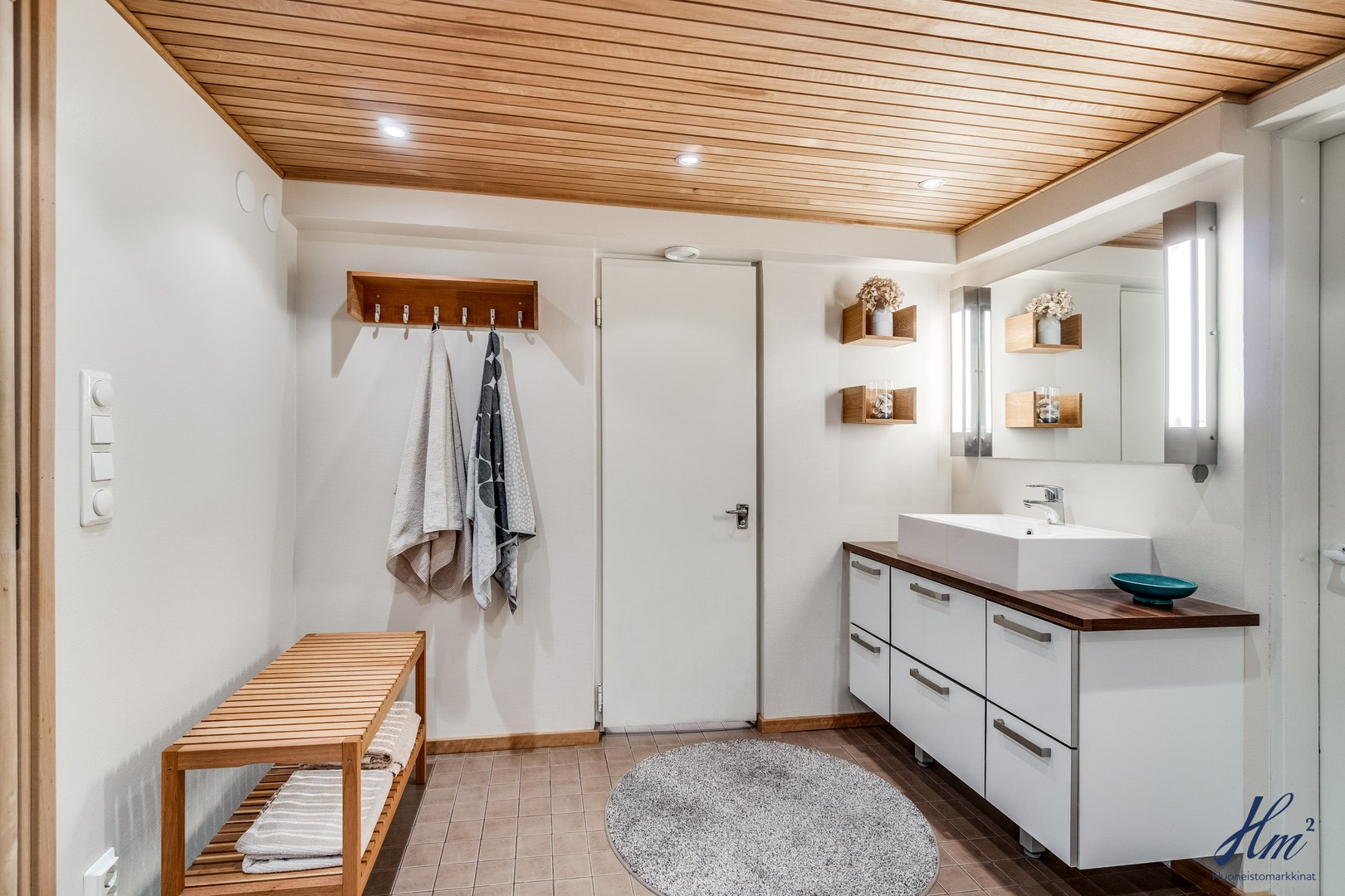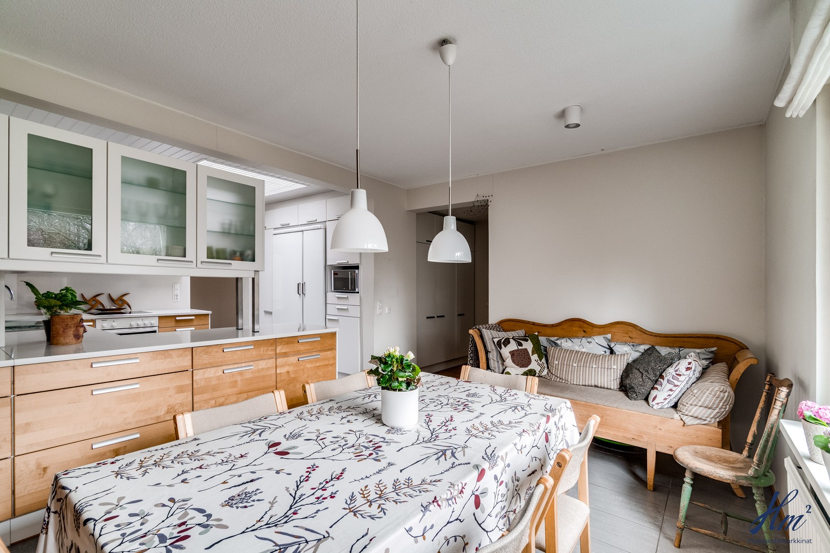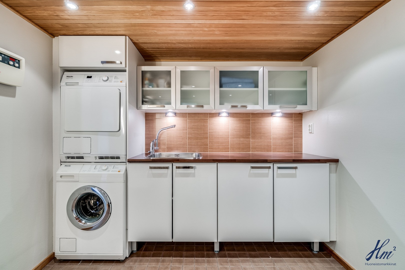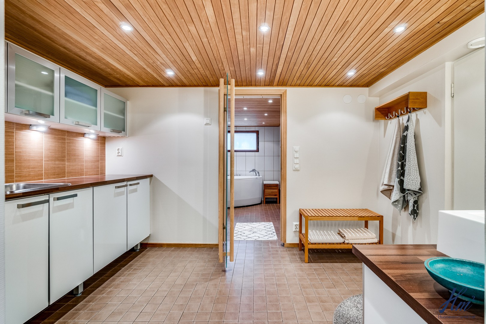 Keittiö on kodin sydän, ja tässä keittiössä se näkyy: tilaa riittää niin kokkailuun kuin pitkille yhteisille aterioille ison ruokapöydän ääressä. Arjen toimivuutta tukevat moderni pesuhuone, viihtyisä sauna ja käytännölliset pyykkihuoltotilat.
