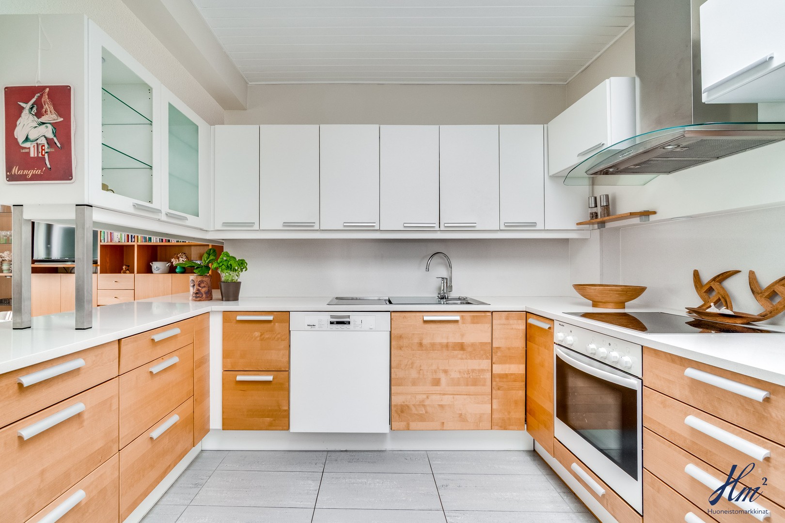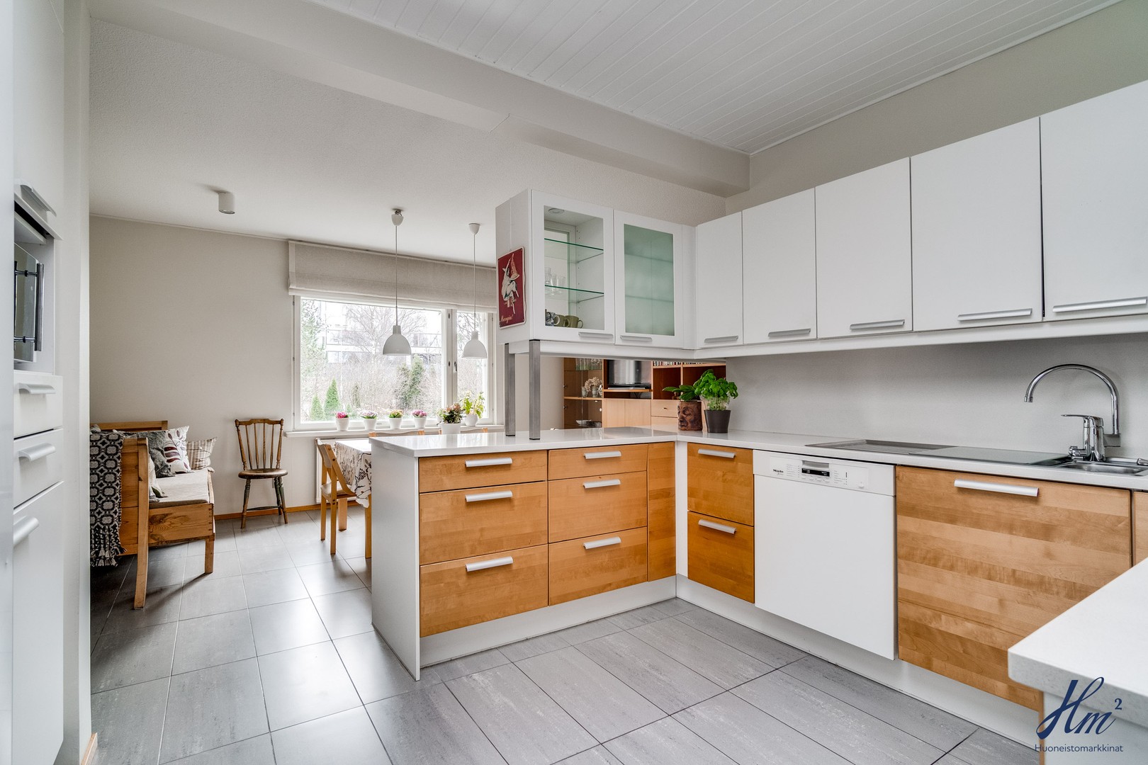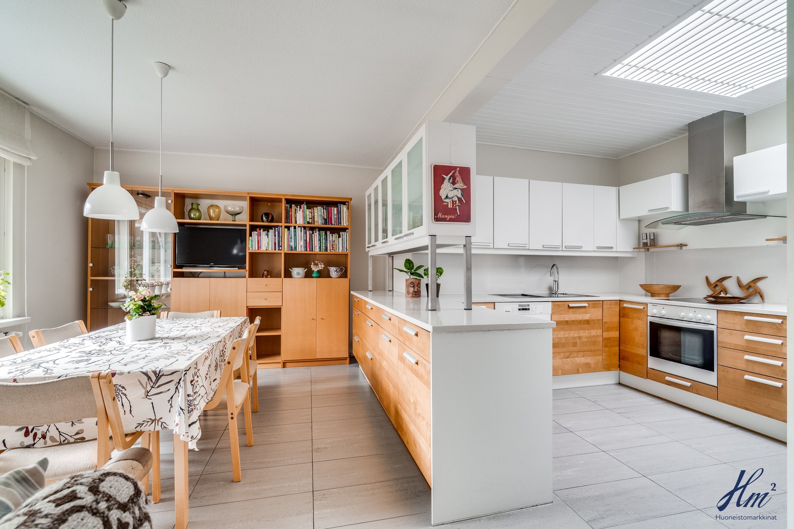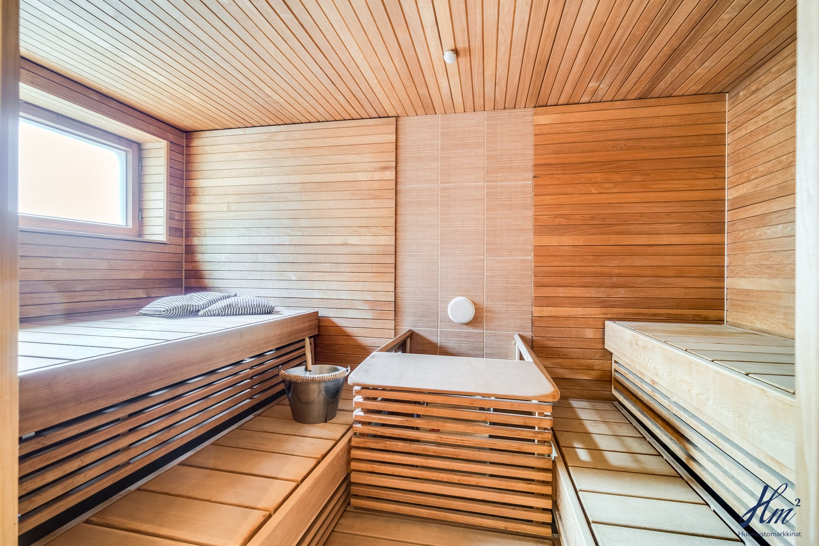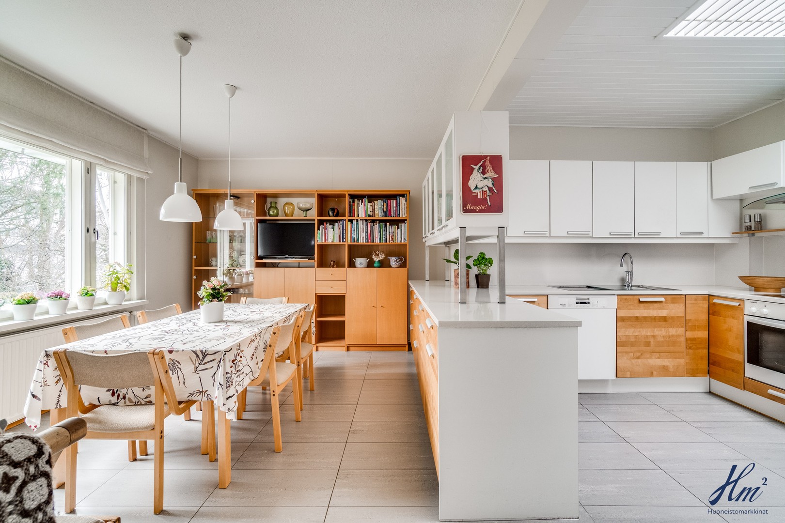 Keittiö on kodin sydän, ja tässä keittiössä se näkyy: tilaa riittää niin kokkailuun kuin pitkille yhteisille aterioille ison ruokapöydän ääressä. Arjen toimivuutta tukevat moderni pesuhuone, viihtyisä sauna ja käytännölliset pyykkihuoltotilat.