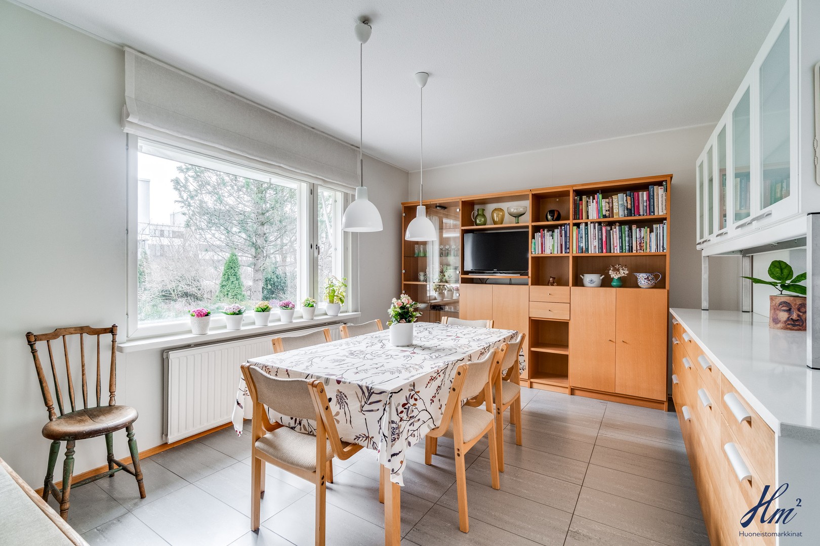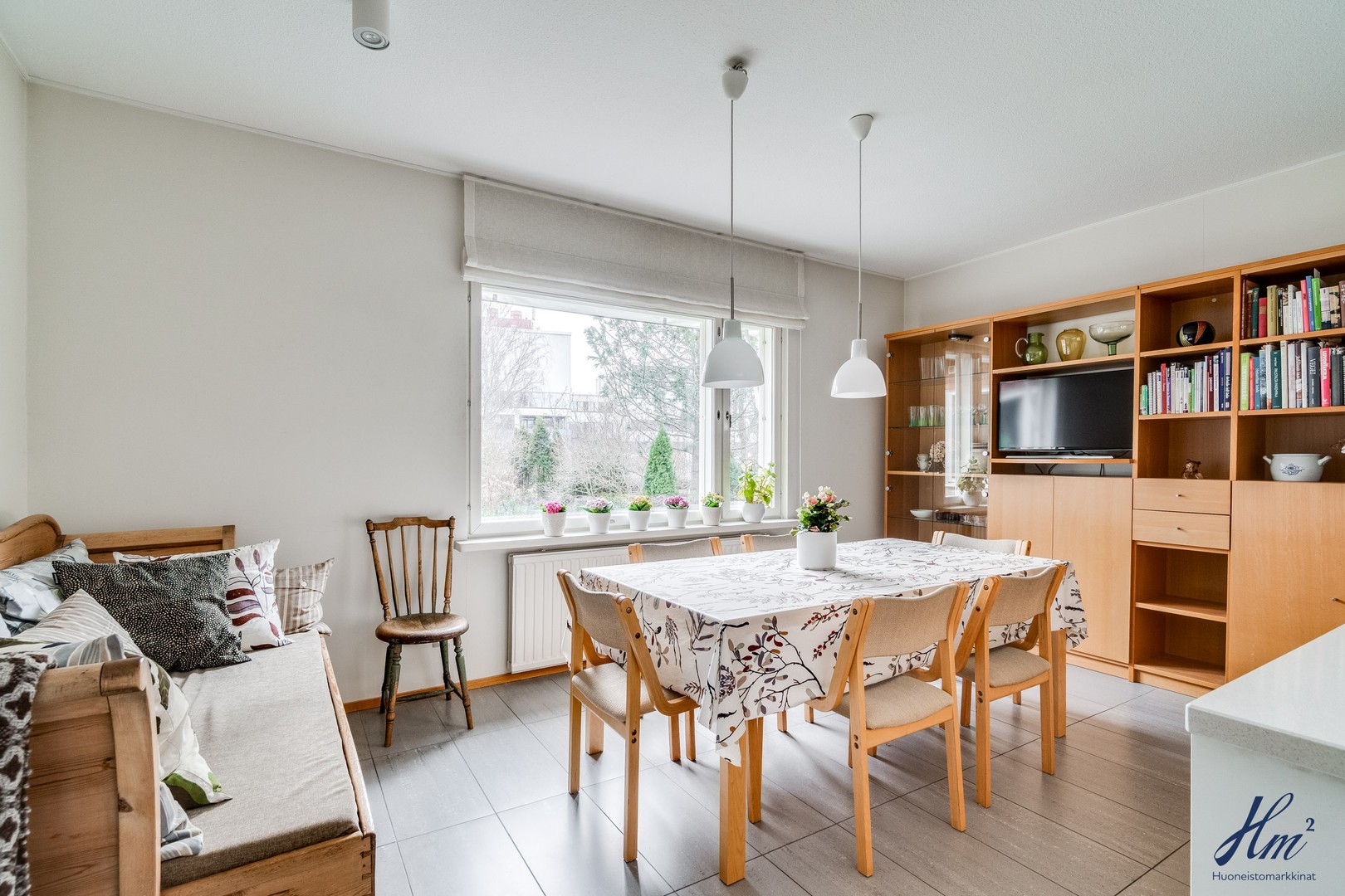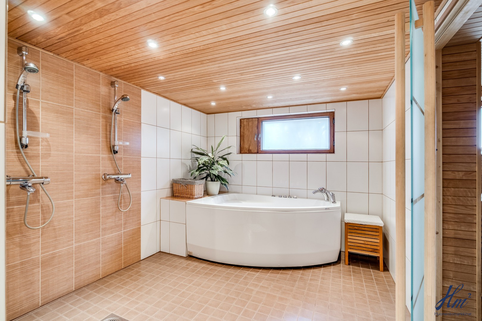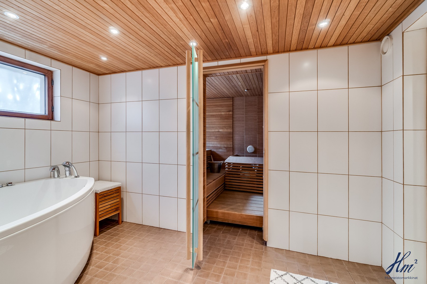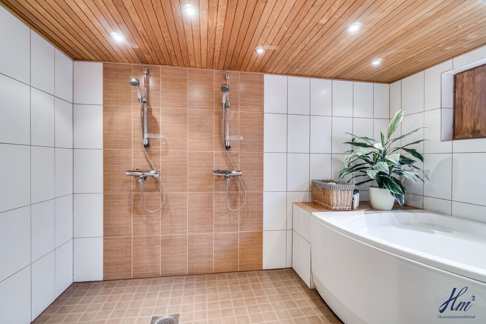 Keittiö on kodin sydän, ja tässä keittiössä se näkyy: tilaa riittää niin kokkailuun kuin pitkille yhteisille aterioille ison ruokapöydän ääressä. Arjen toimivuutta tukevat moderni pesuhuone, viihtyisä sauna ja käytännölliset pyykkihuoltotilat.