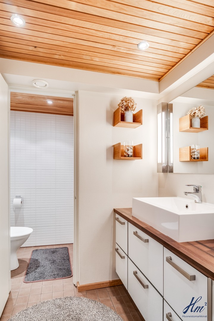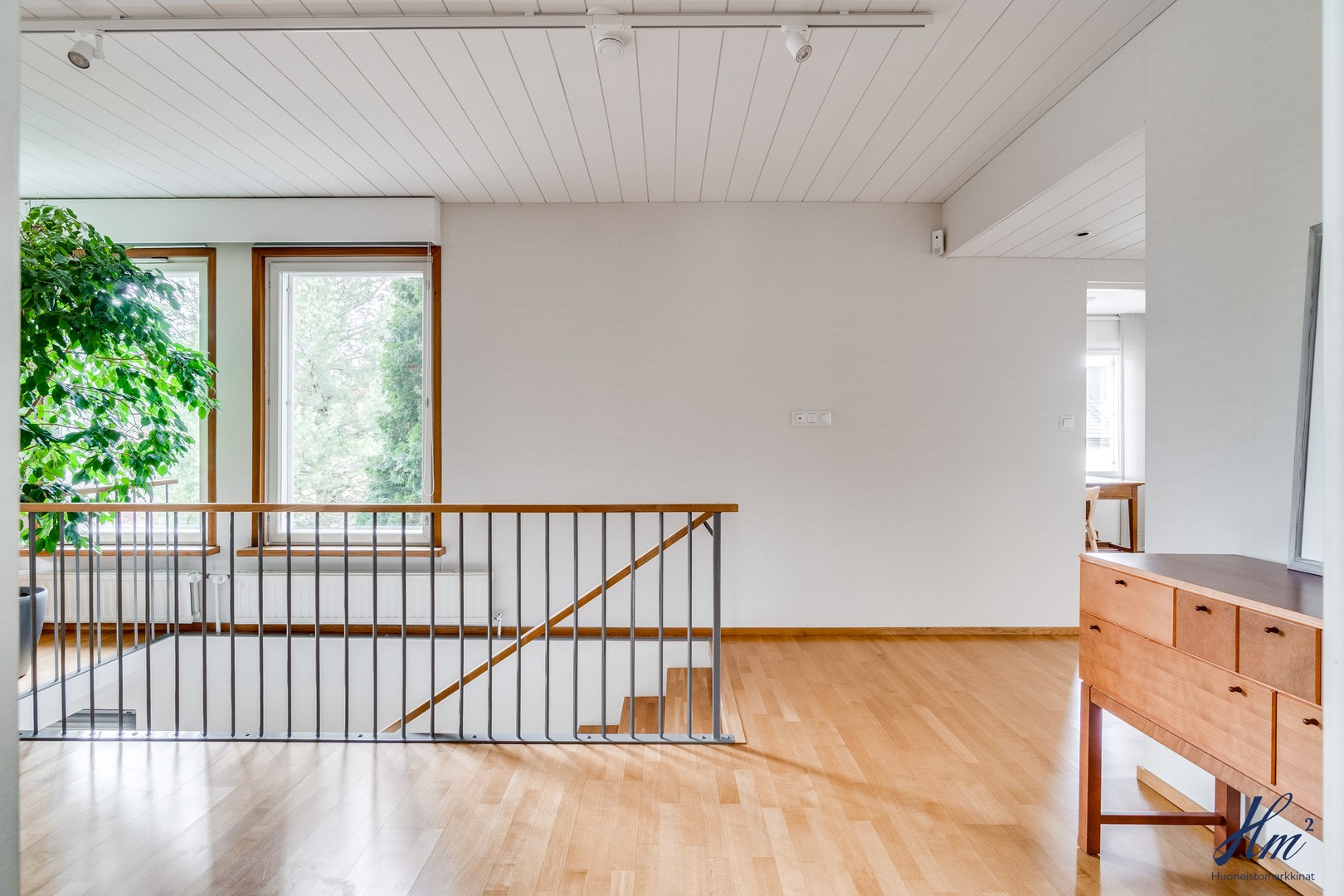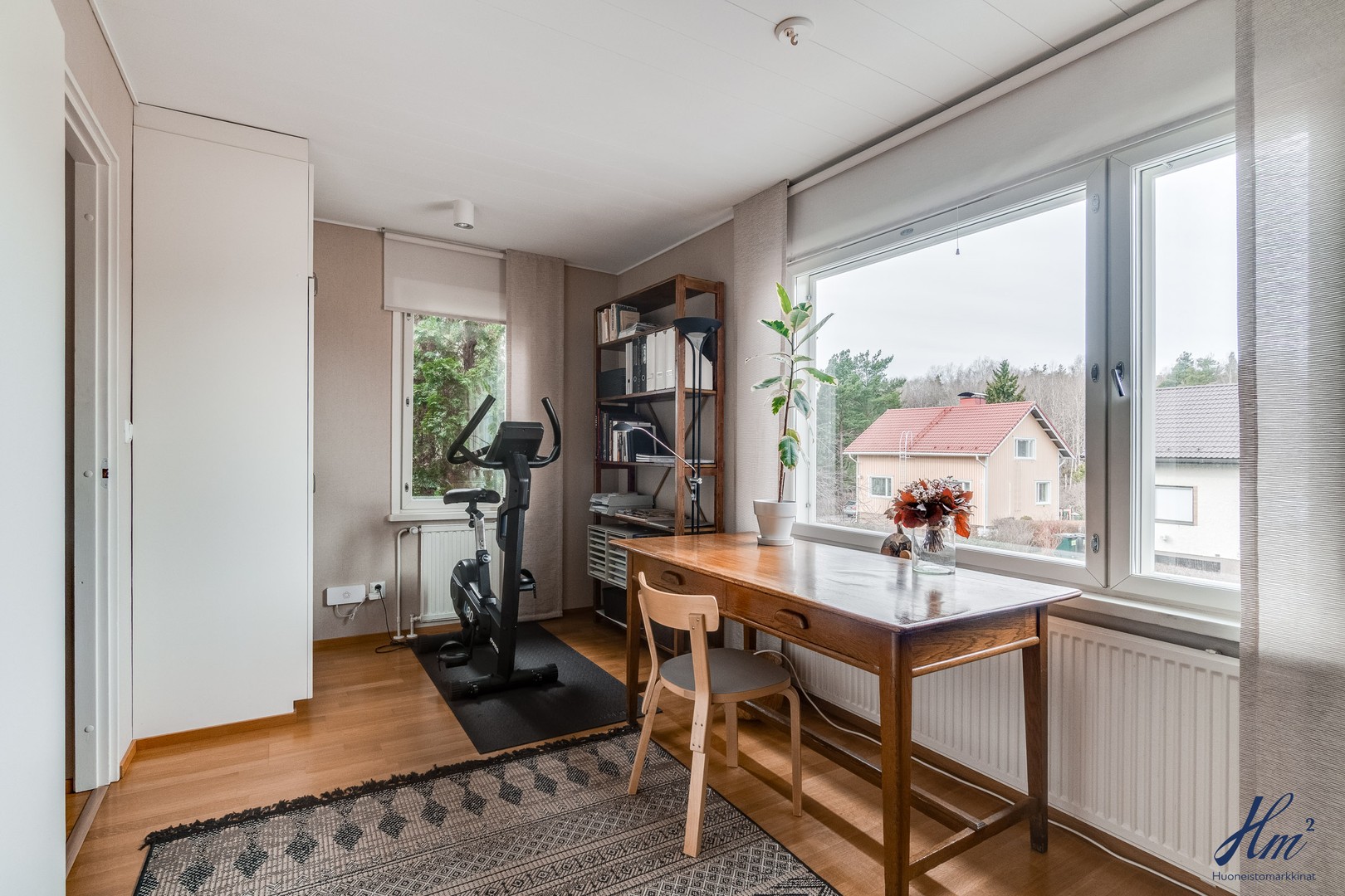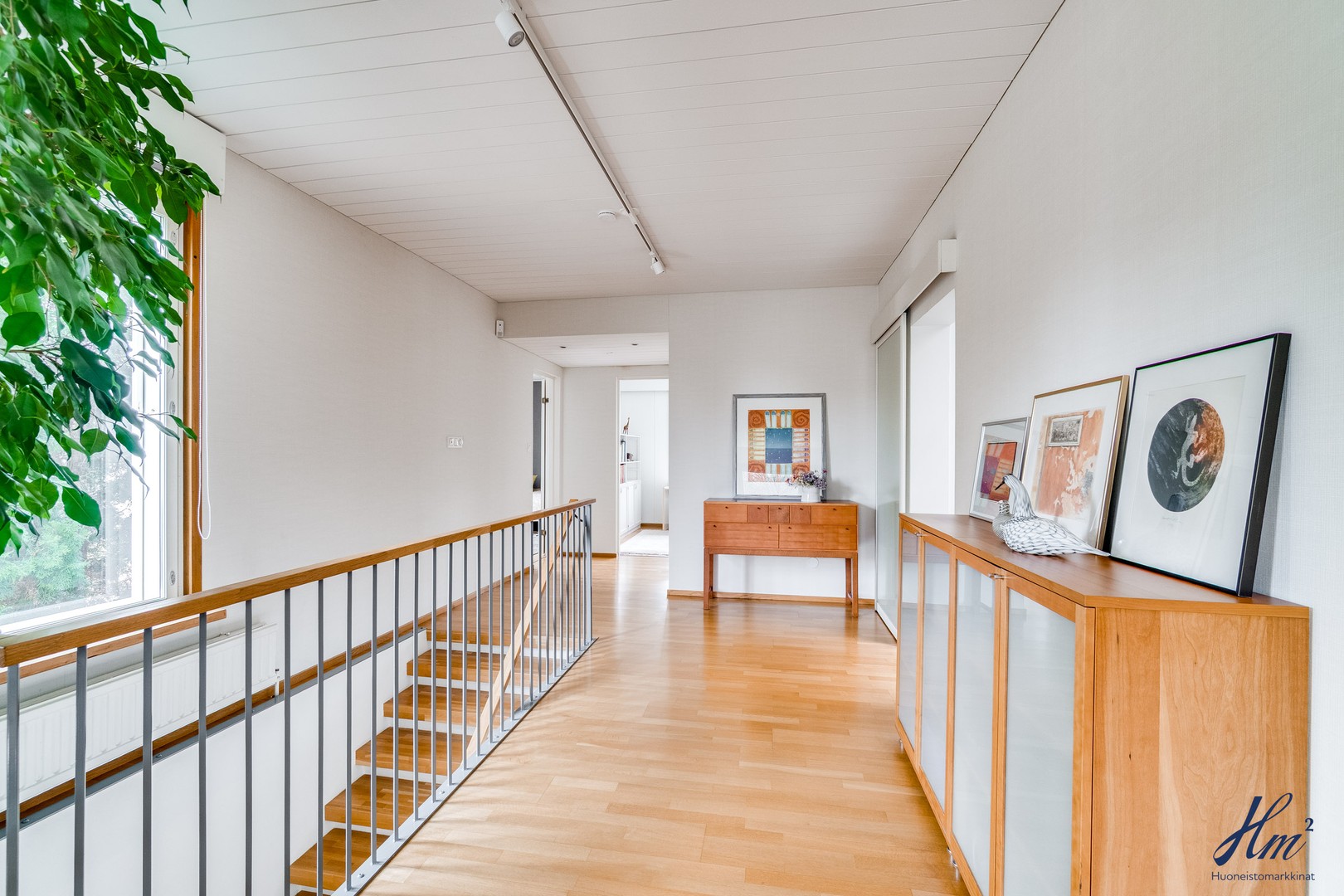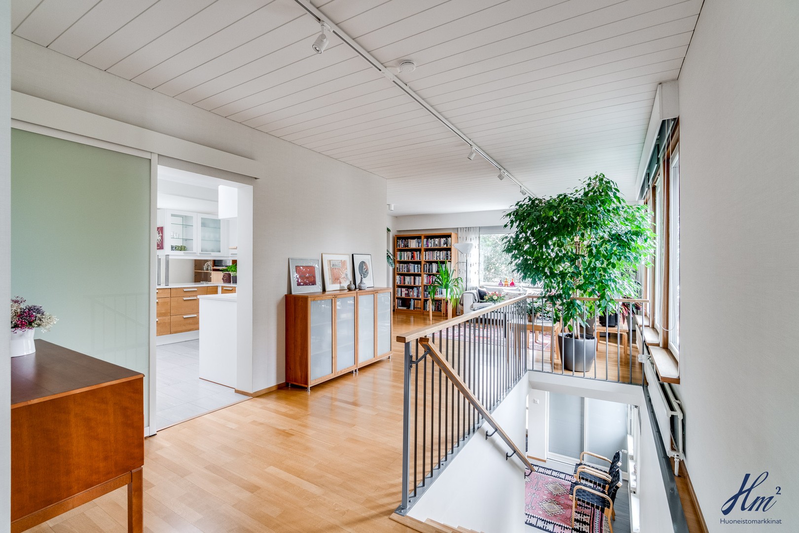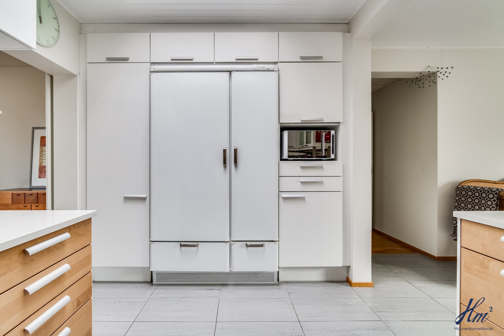 Keittiö on kodin sydän, ja tässä keittiössä se näkyy: tilaa riittää niin kokkailuun kuin pitkille yhteisille aterioille ison ruokapöydän ääressä. Arjen toimivuutta tukevat moderni pesuhuone, viihtyisä sauna ja käytännölliset pyykkihuoltotilat.