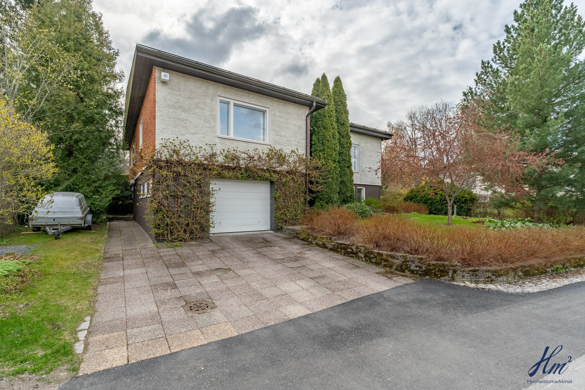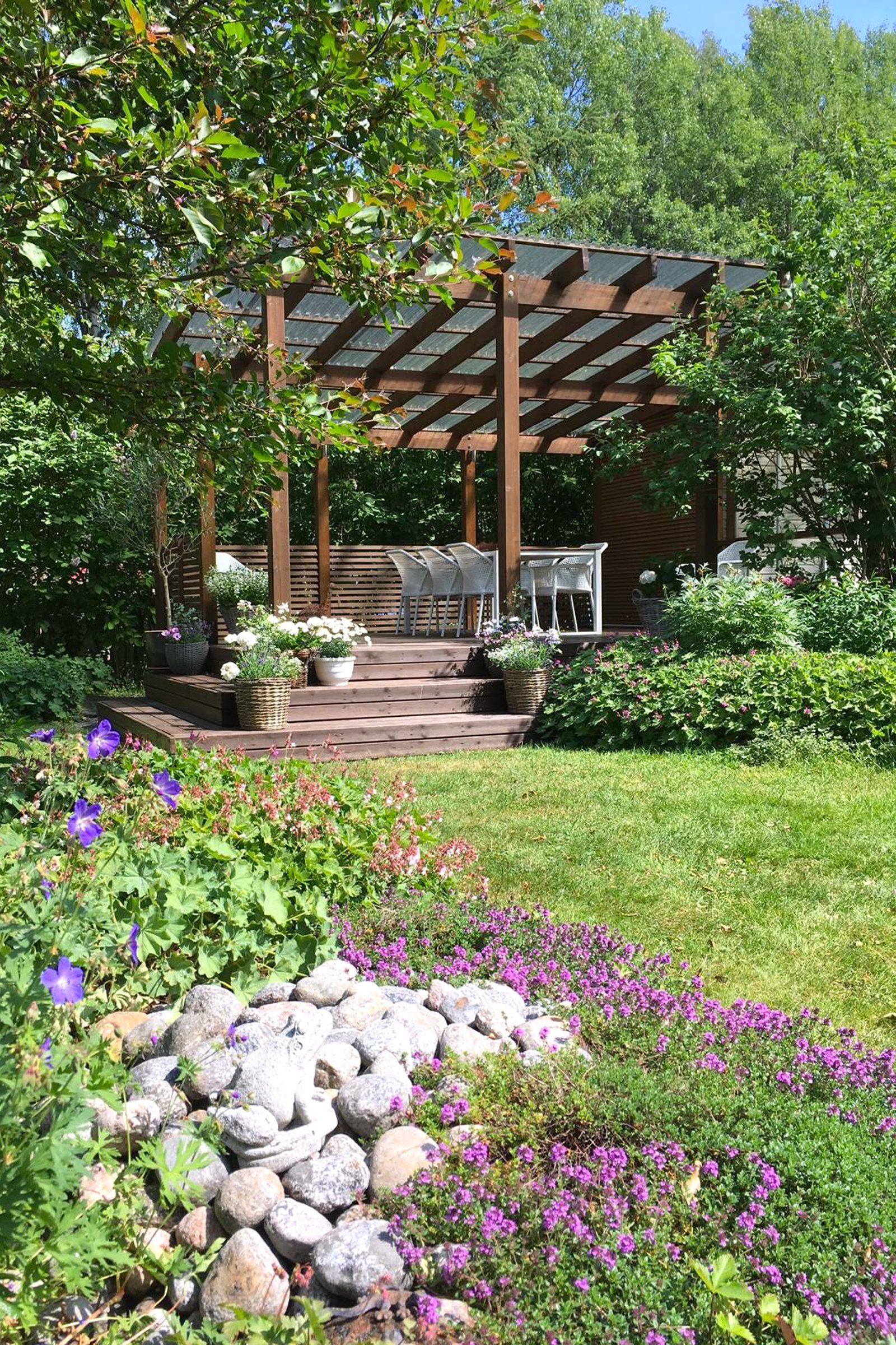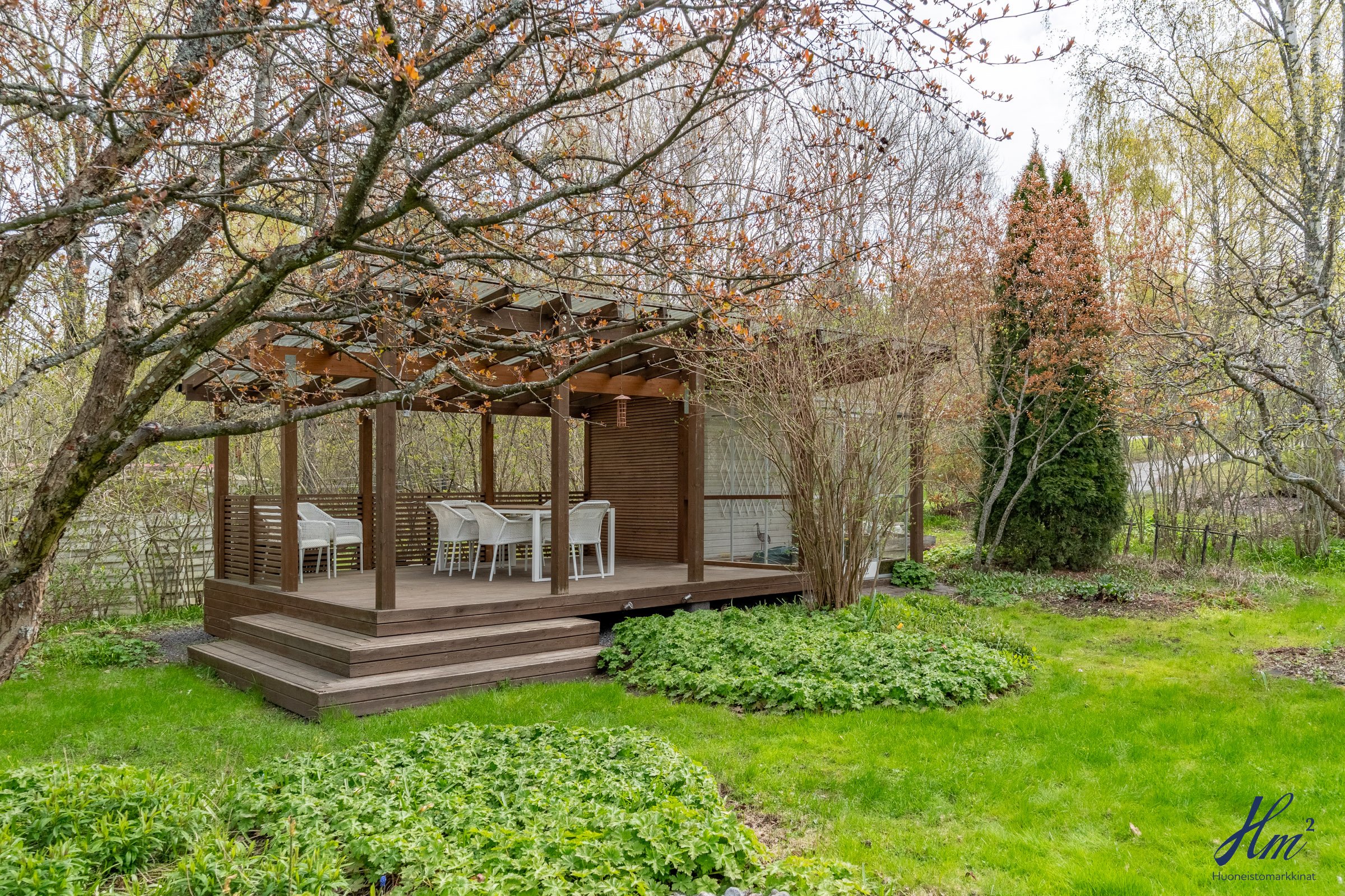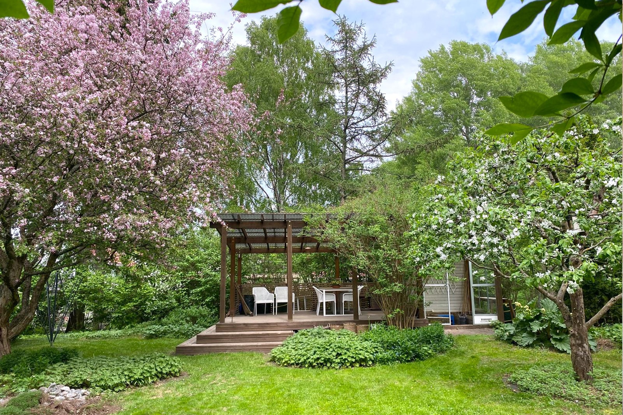 Mutta ehkä suurin ihastuksen kohde löytyy ulkoa – harvoin tulee vastaan näin upeaa ja huolella vaalittua puutarhapihaa. Osittain katettu terassi ja kesäkeittiö tekevät pihasta unelmien kesäolohuoneen, jossa grilliherkut maistuvat ja arki unohtuu.