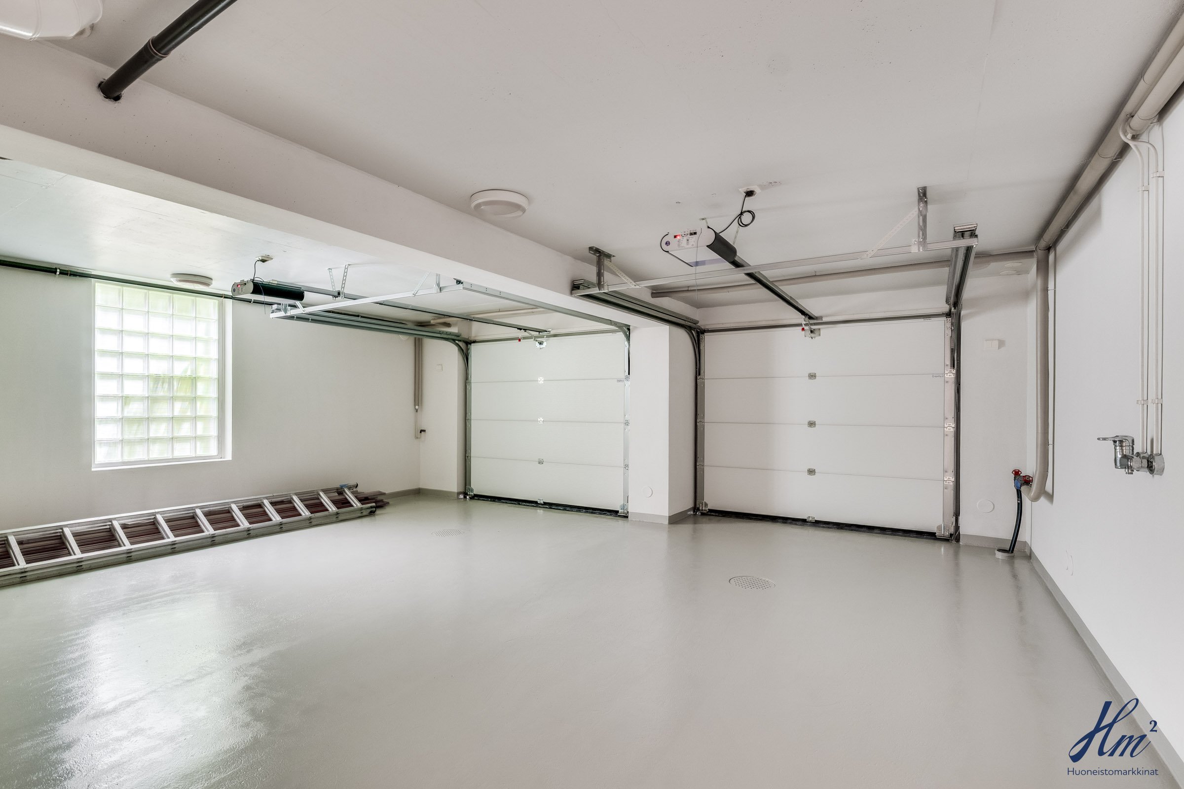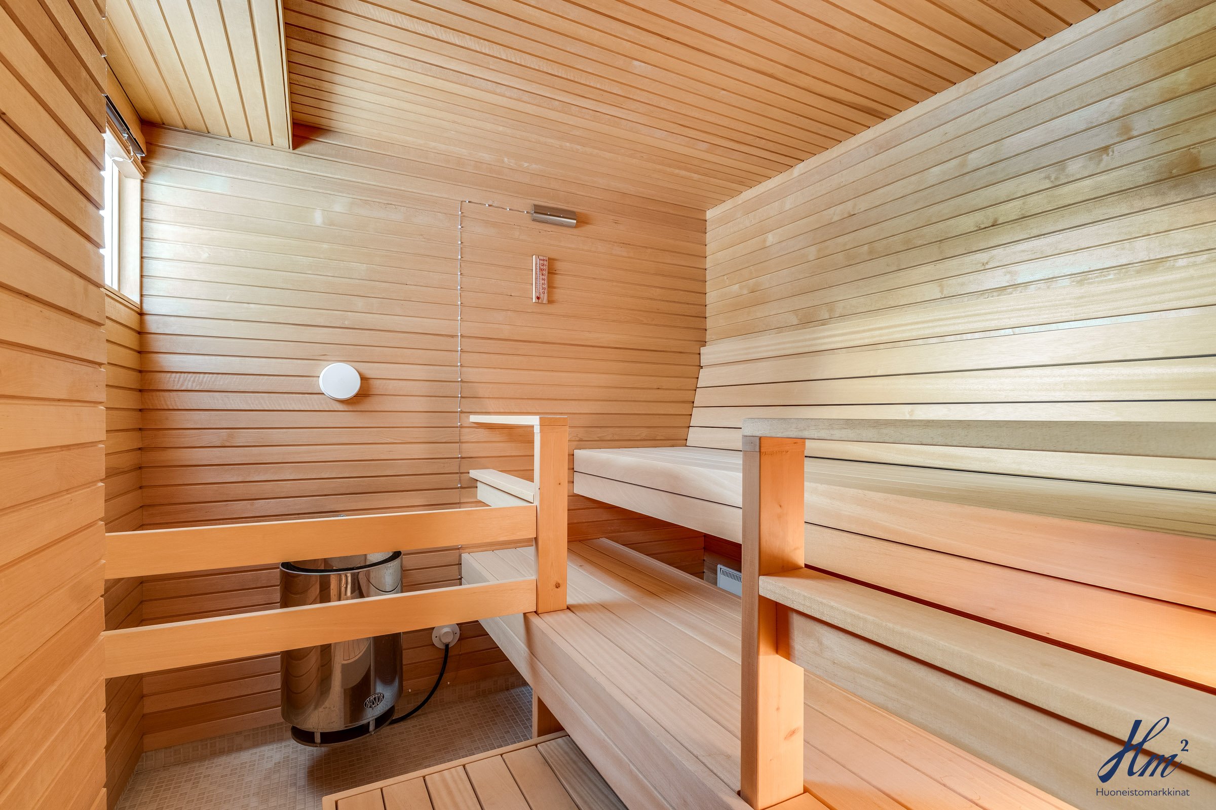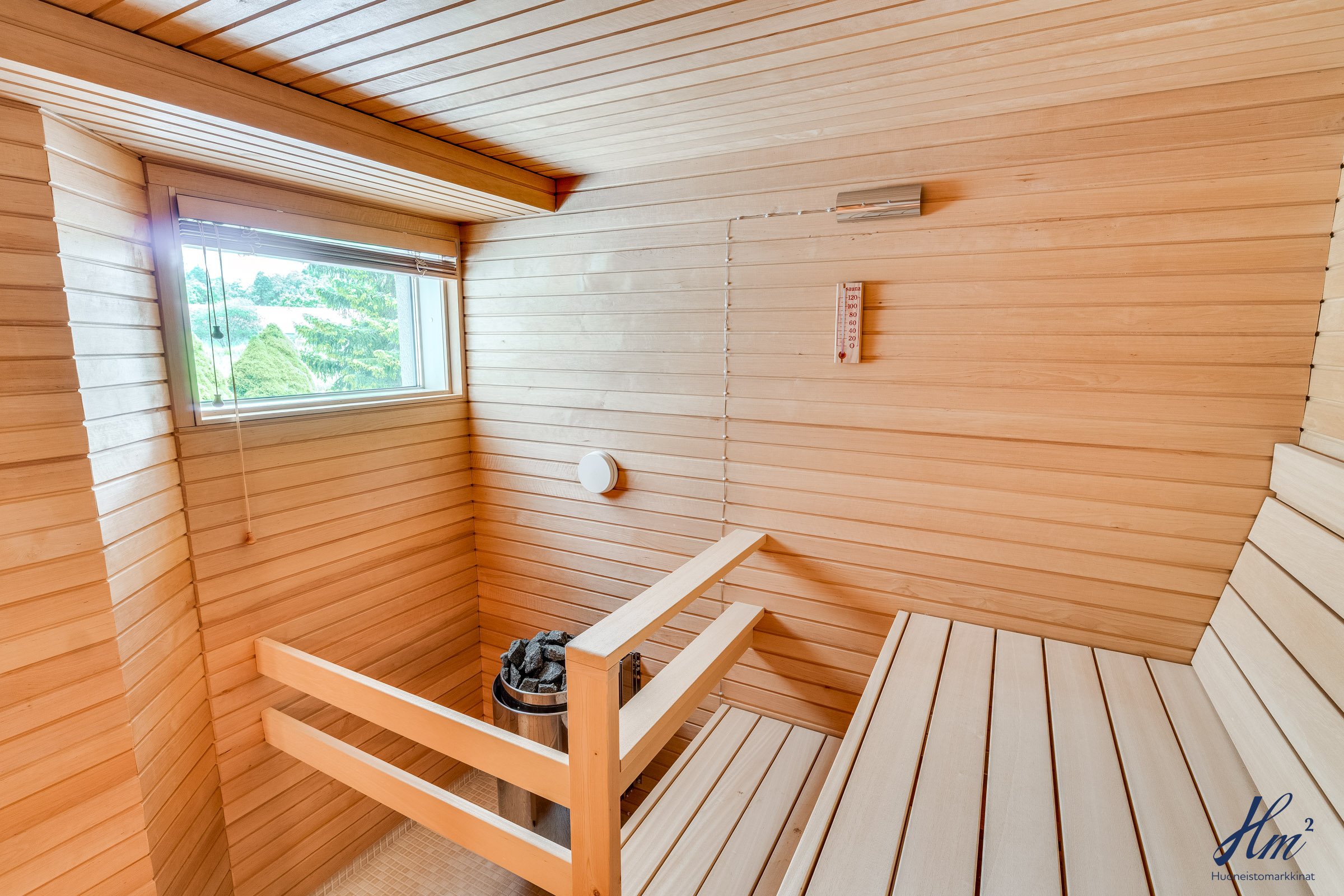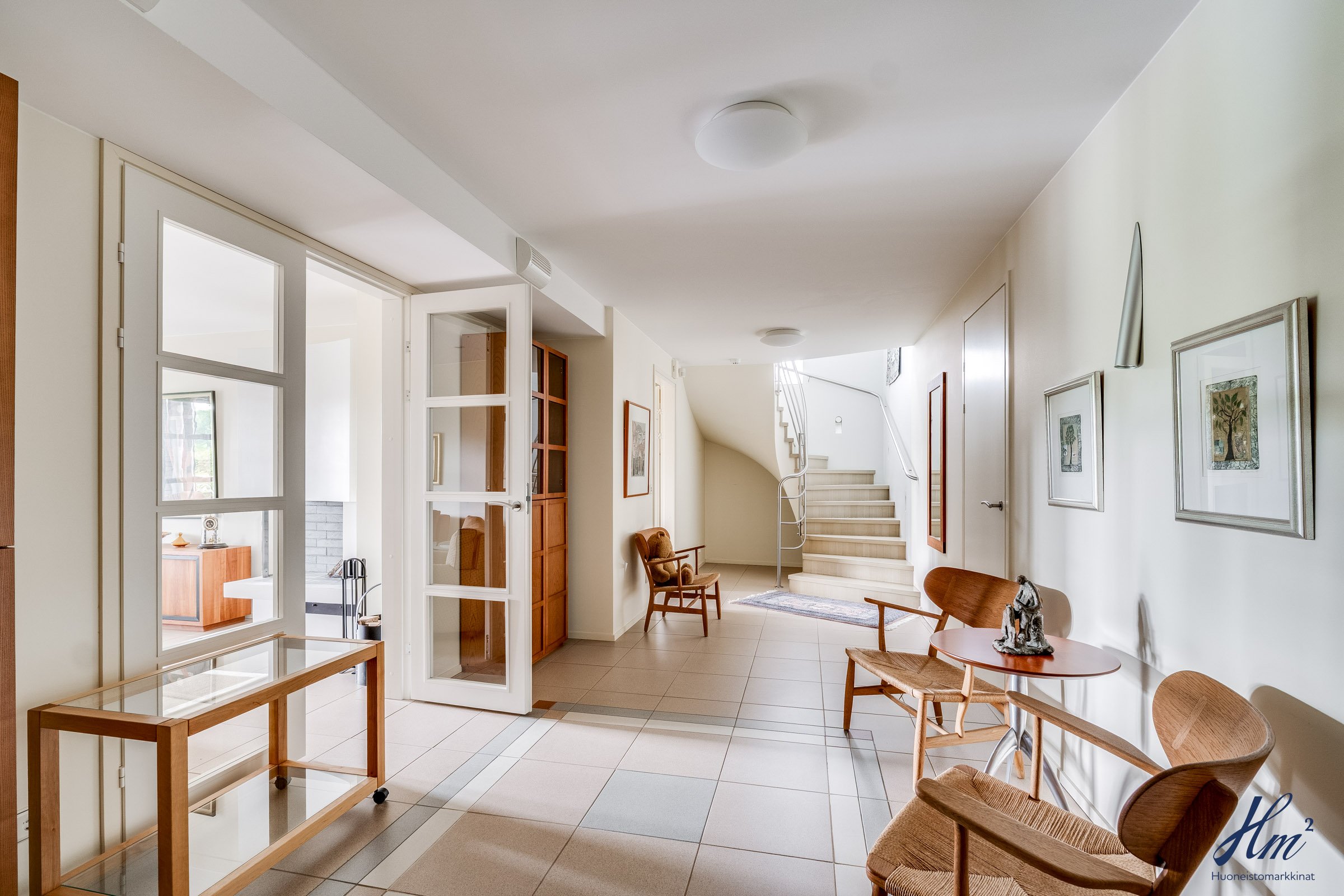Pääasialliset asuintilat levittäytyvät käytännöllisesti yhteen tasoon. Yläkertaan sijoittuvat eteishalli, 2 erillistä huonetta, tilava olohuone / ruokailutila, keittiö, vaatehuone, erillinen wc-tila sekä toisen huoneen yhteydessä oleva oma pesuhuone / wc-tila. Olohuoneesta ja keittiöstä kuljetaan parvekkeelle, josta aukeaa esteettömät näkymät etelän suuntaan. Alakerrasta löytyvät taas iso kodinhoitohuone, yksi huone tulisijalla, erittäin tilavat vaatehuone ja varastotilat sekä kahden auton lämmin talli.