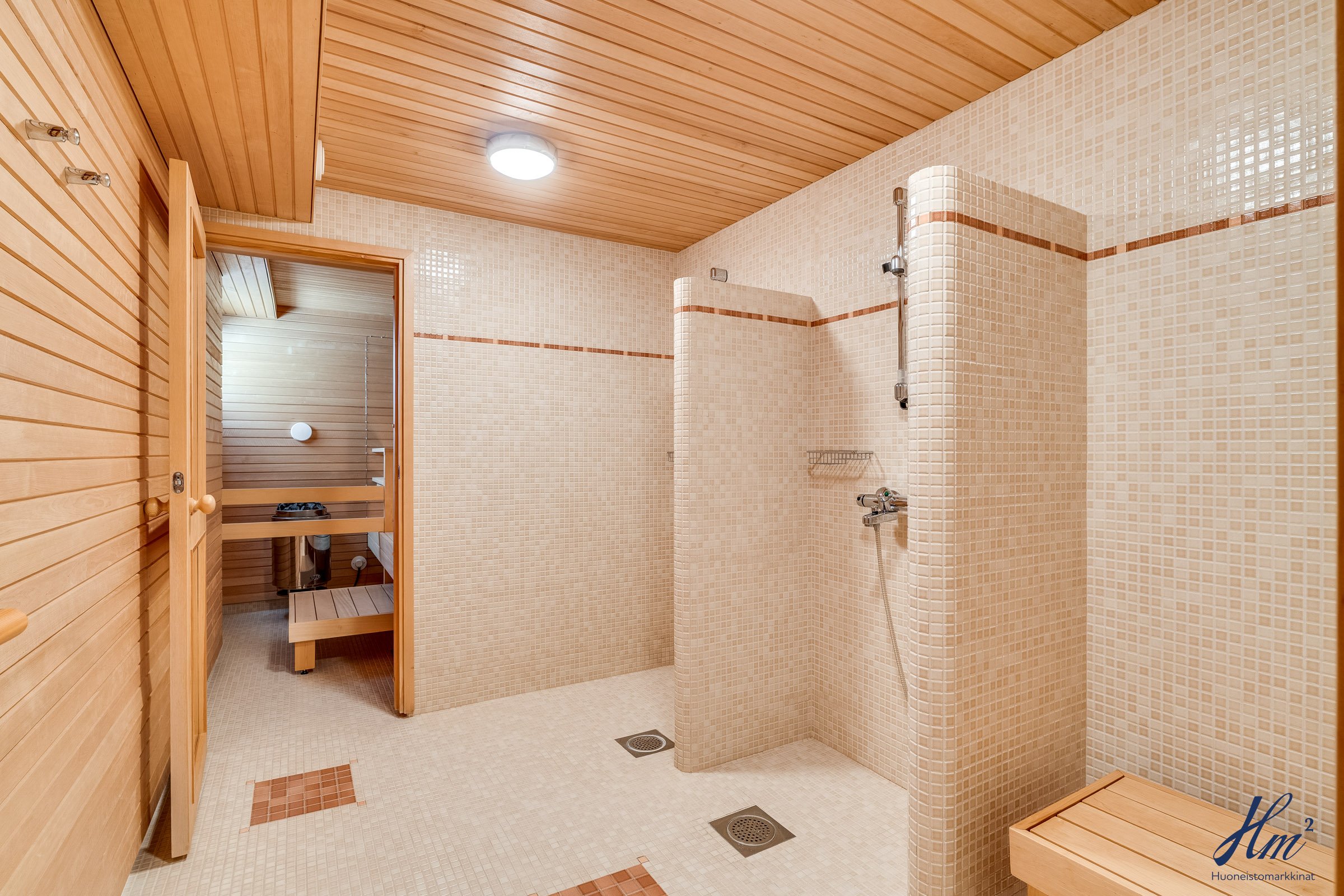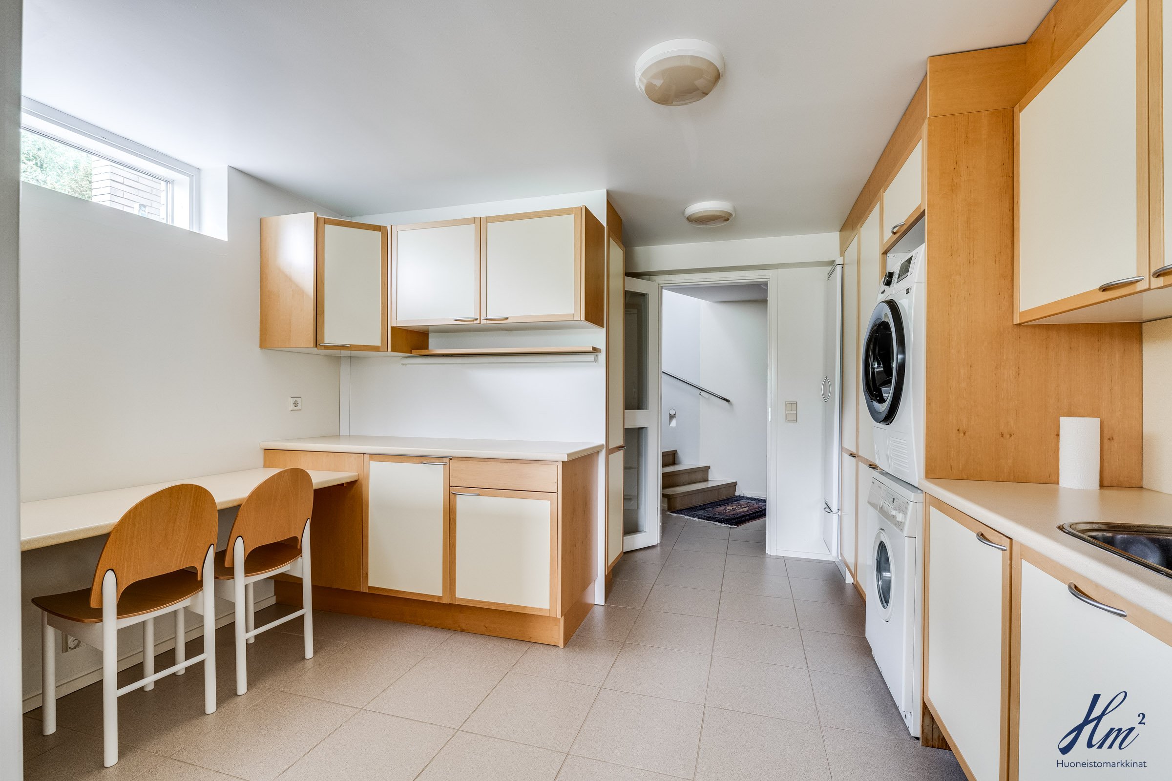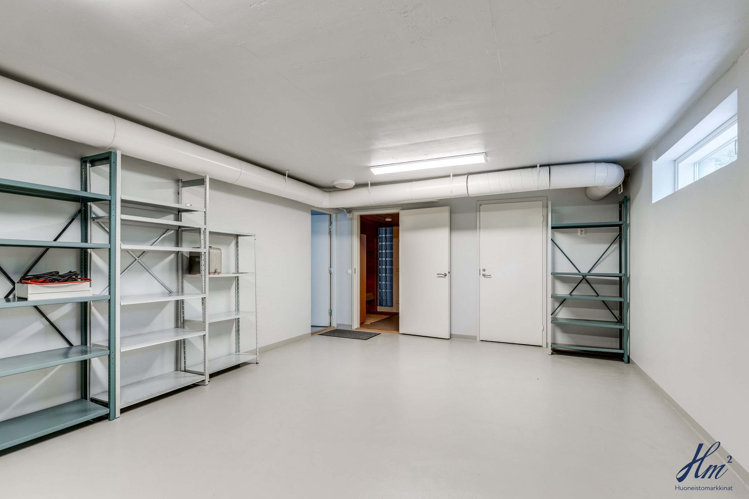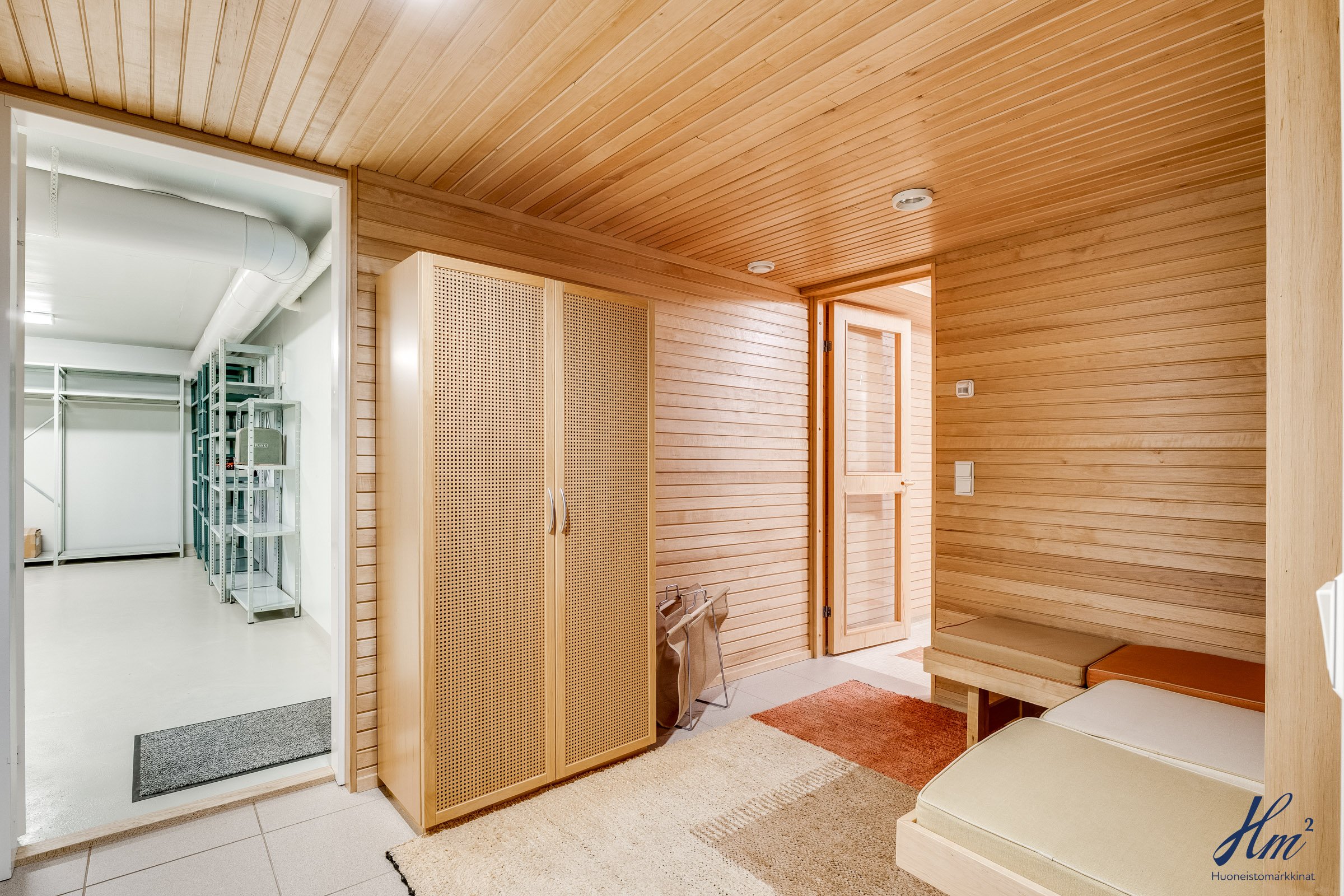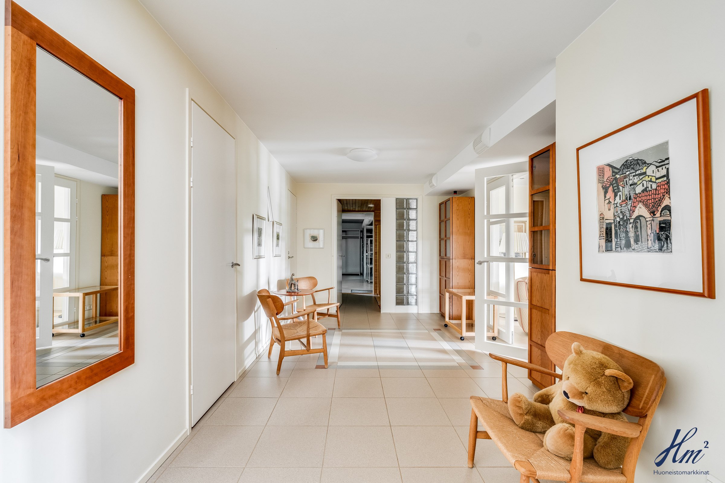 Pääasialliset asuintilat levittäytyvät käytännöllisesti yhteen tasoon. Yläkertaan sijoittuvat eteishalli, 2 erillistä huonetta, tilava olohuone / ruokailutila, keittiö, vaatehuone, erillinen wc-tila sekä toisen huoneen yhteydessä oleva oma pesuhuone / wc-tila. Olohuoneesta ja keittiöstä kuljetaan parvekkeelle, josta aukeaa esteettömät näkymät etelän suuntaan. Alakerrasta löytyvät taas iso kodinhoitohuone, yksi huone tulisijalla, erittäin tilavat vaatehuone ja varastotilat sekä kahden auton lämmin talli.